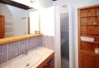 Vom Wohnzimmer gelangt man über einen Flur in das, mit blauen Mosaikfliesen und vielen Holzelementen anspruchsvoll gestaltete Bad. Selbstverständlich fehlt auch der zentral beheizte Handtuchhalter nicht.