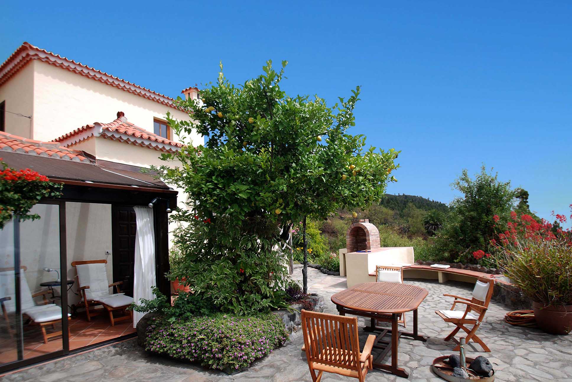 Aus dem großzügigen Wintergarten gelangt man auf die riesige Sonnenterrasse mit atemberaubendem Meerblick, gesäumt von uralten, kanarischen Kiefern. Die gesamten Terrassenflächen wurden mit sogenannten „lajas“ belegt, natürlich durch Vulkanismus entstandenen Basaltplatten, die das inseltypische Flair erhalten. Südlich schließt die Terrasse mit einer Außenküche, der „Barbacoa“ ab, die auch bei zahlreichen Gästen für ausgedehnte Fiestas oder gemütliche Abendessen im kleinen Kreis unter strahlendem Sternenhimmel dient. Ein wenig versteckt hinter der Ecke des Turmgebäudes findet sich eine Außendusche, für den angenehmen Abschluss des Sonnenbades.