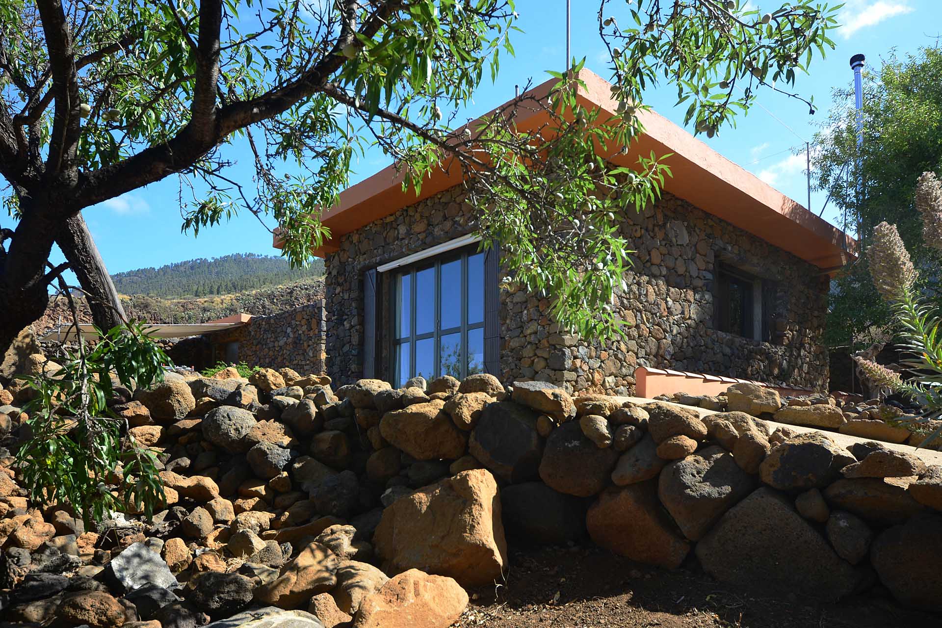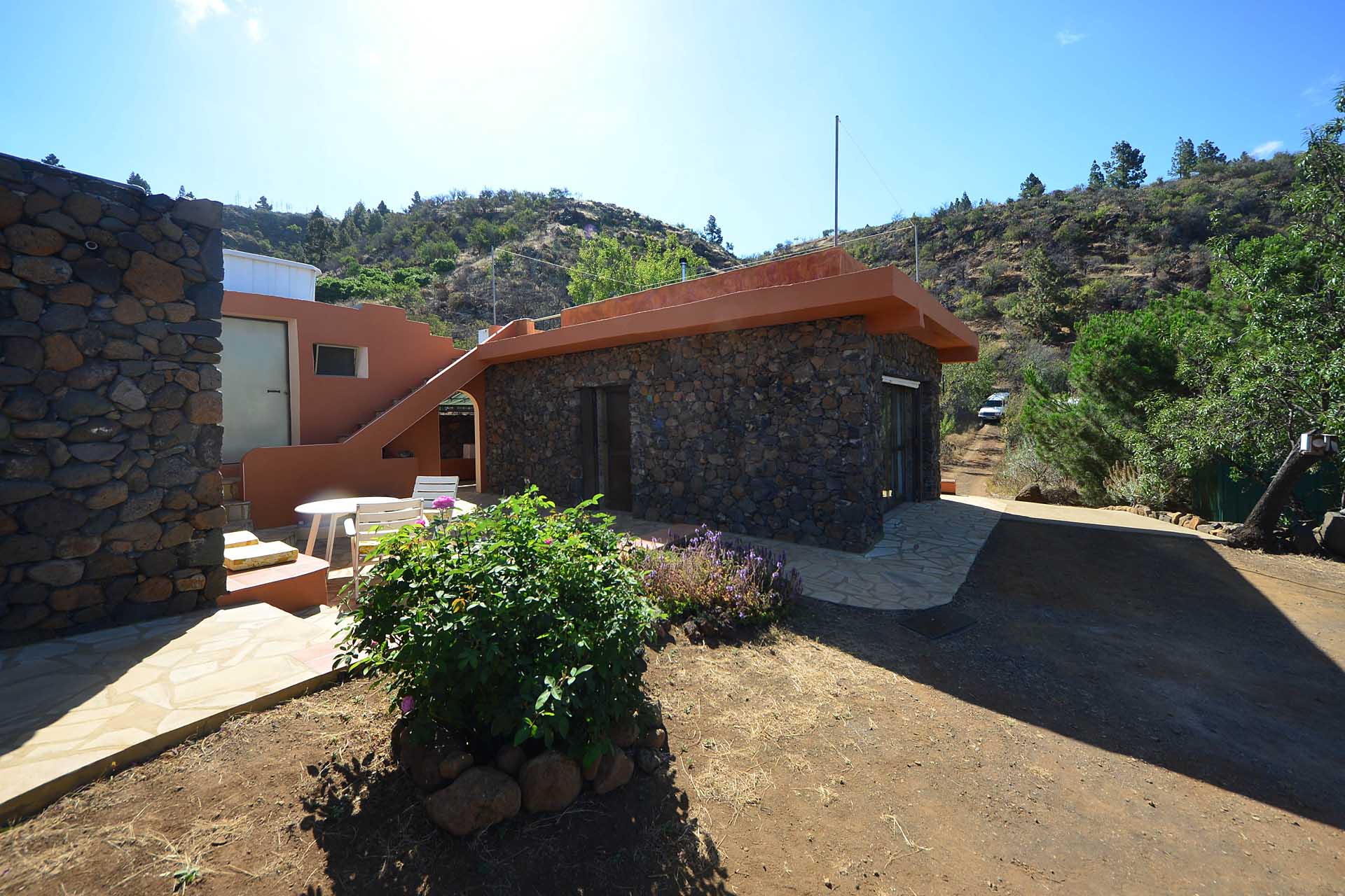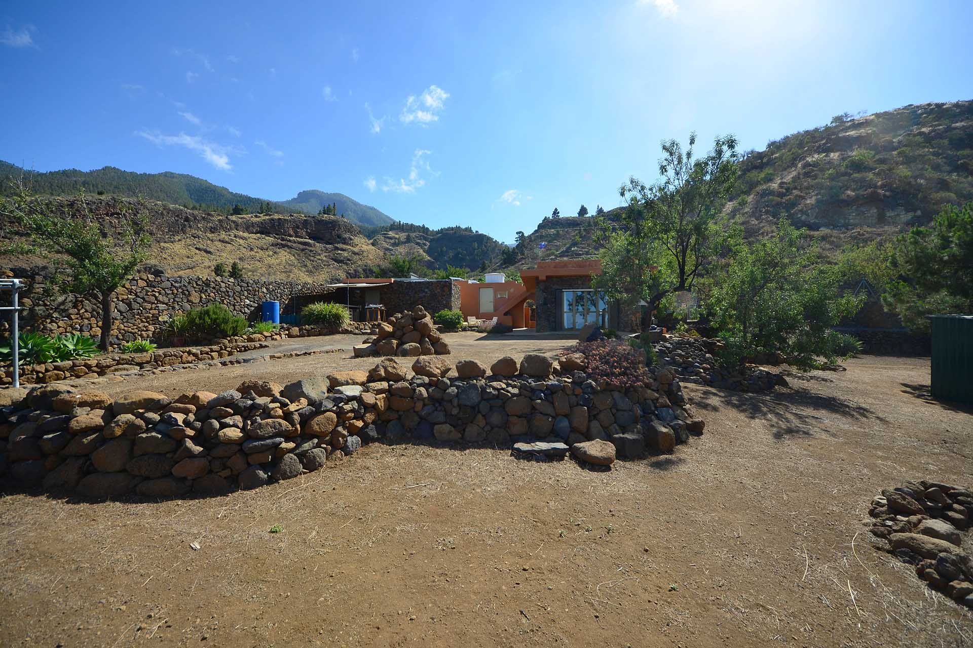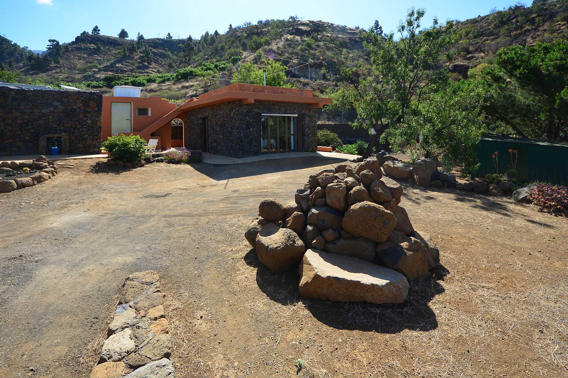 Das Grundstück wurde zum großen Teil naturbelassen und ist teilweise mit großen Mandelbäumen und einer beeindruckenden, kanarischen Kiefer eingewachsen.