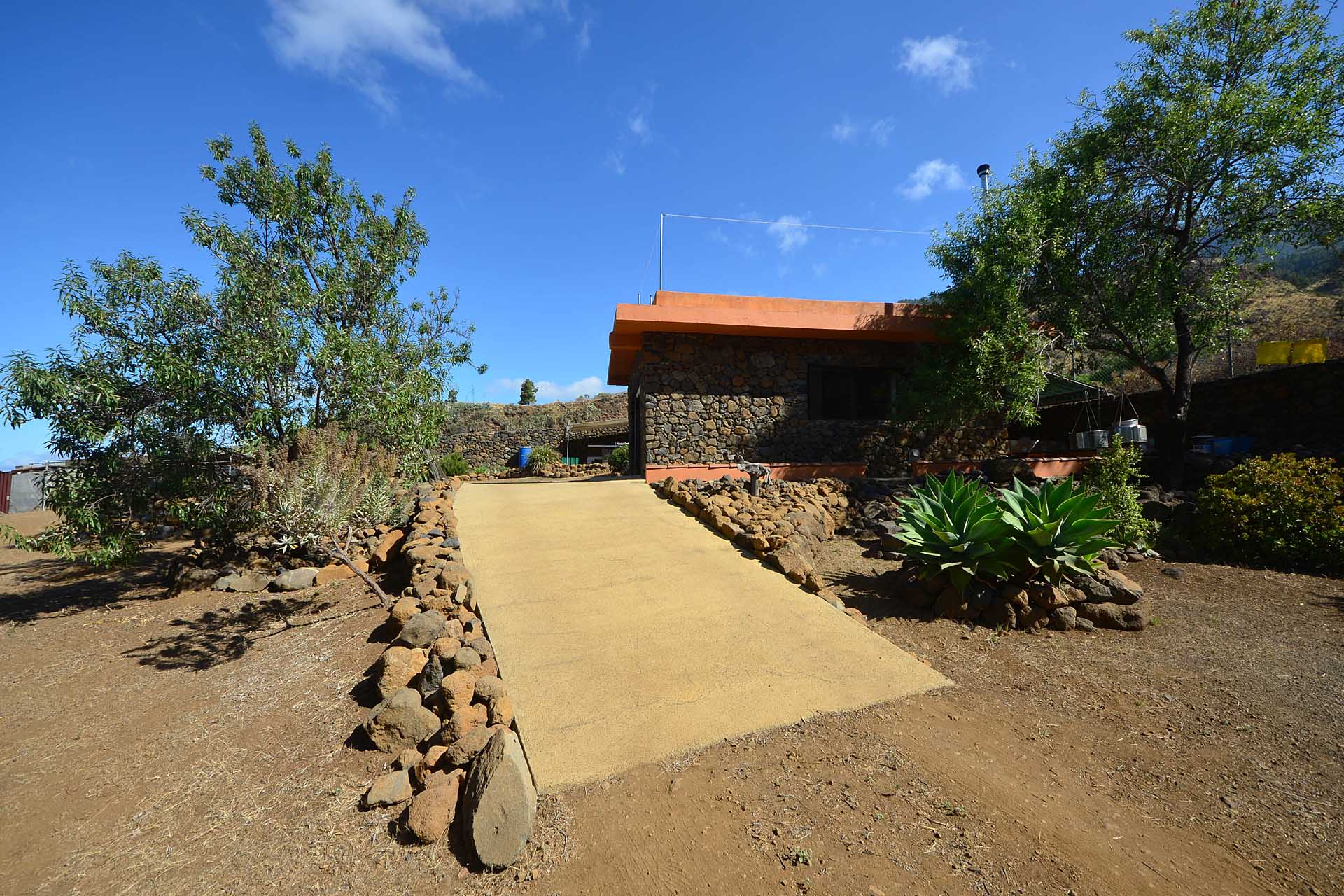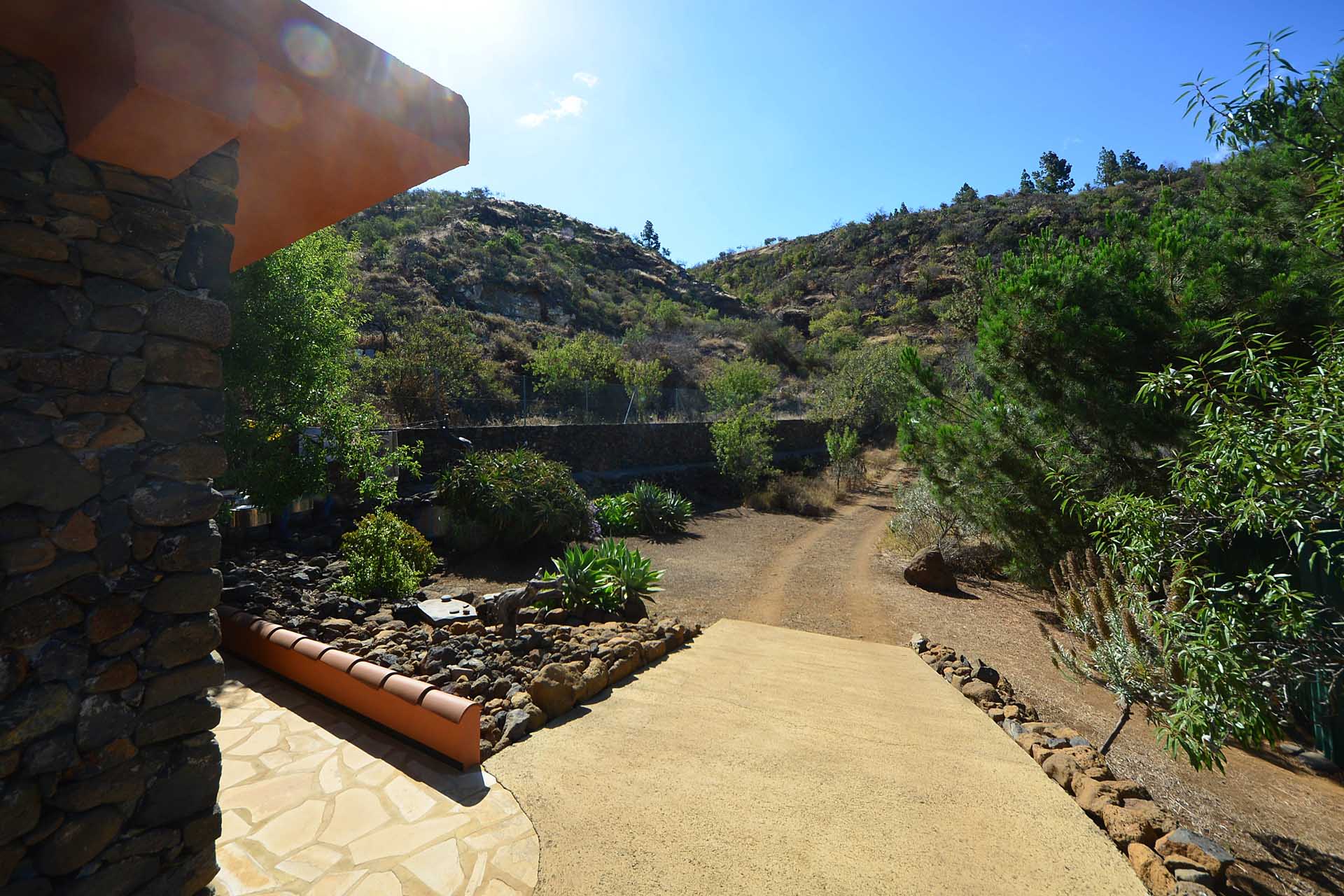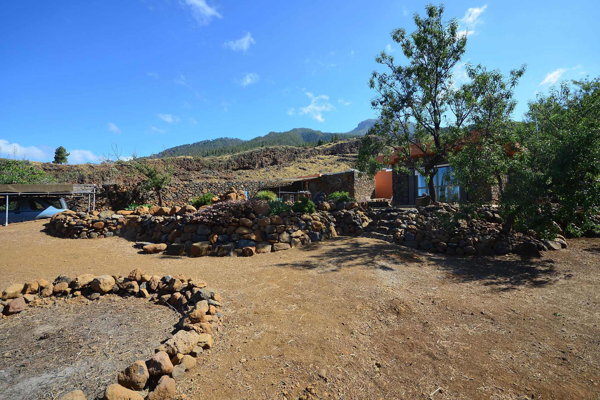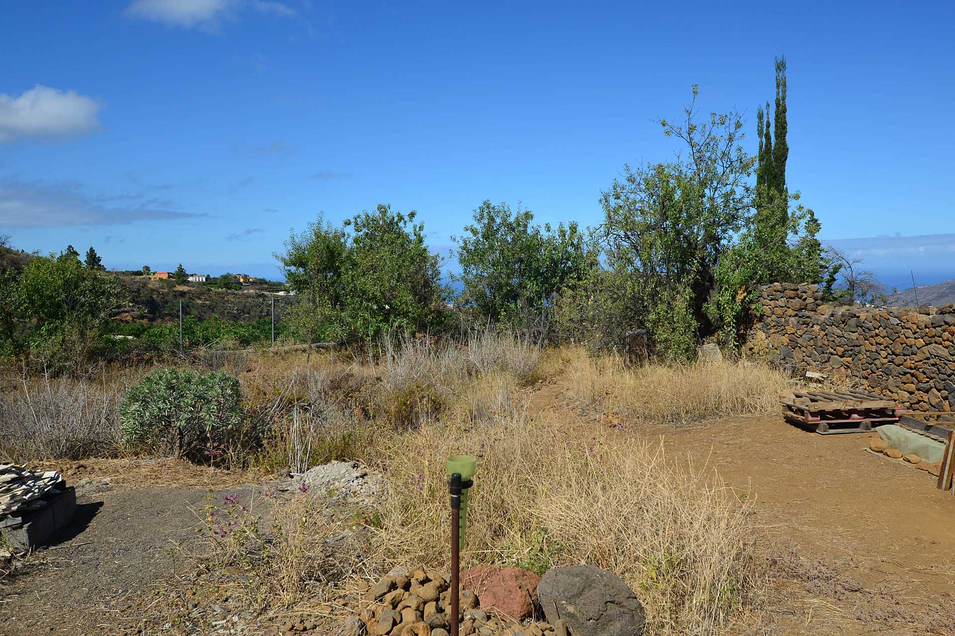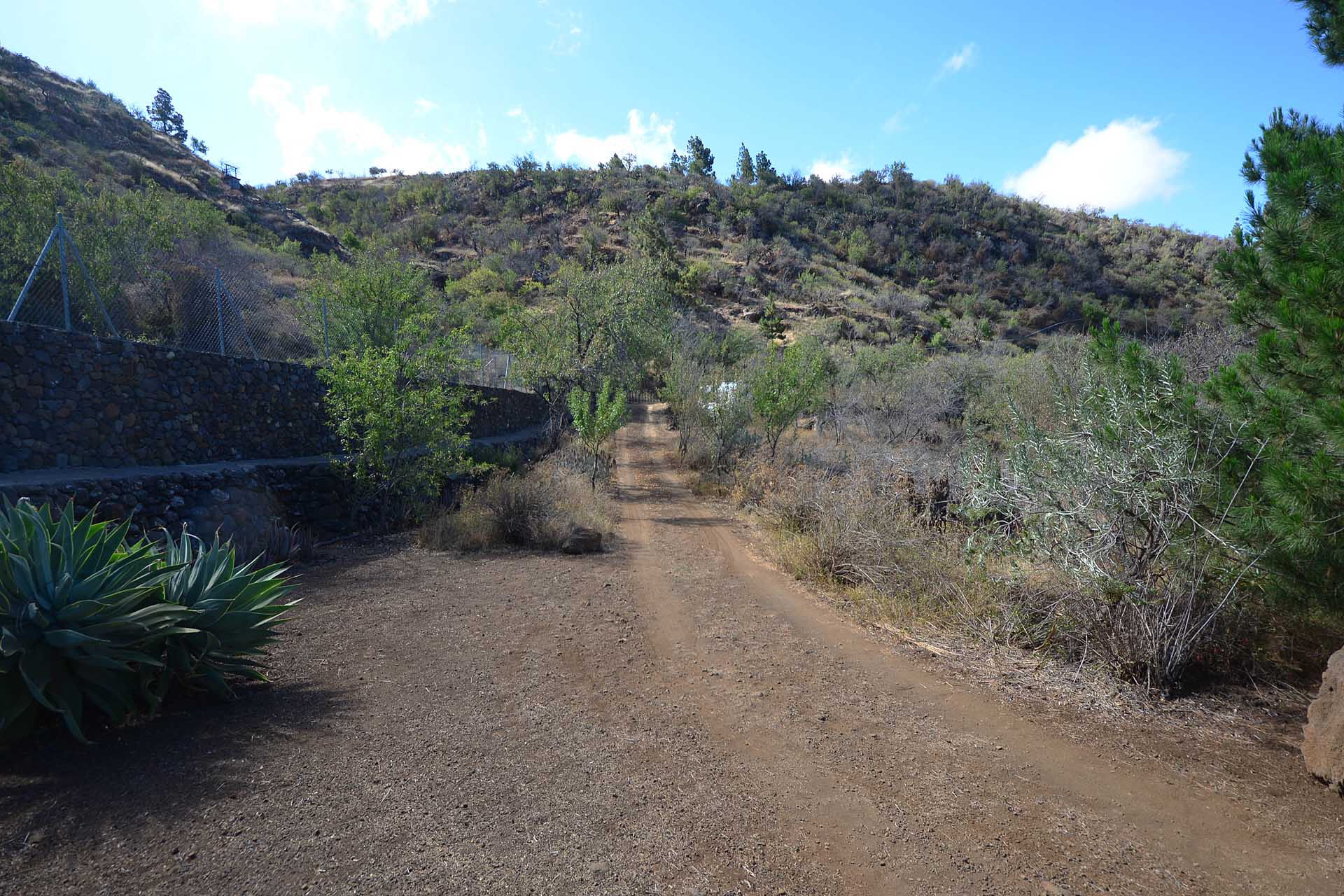 Das Grundstück wurde zum großen Teil naturbelassen und ist teilweise mit großen Mandelbäumen und einer beeindruckenden, kanarischen Kiefer eingewachsen.