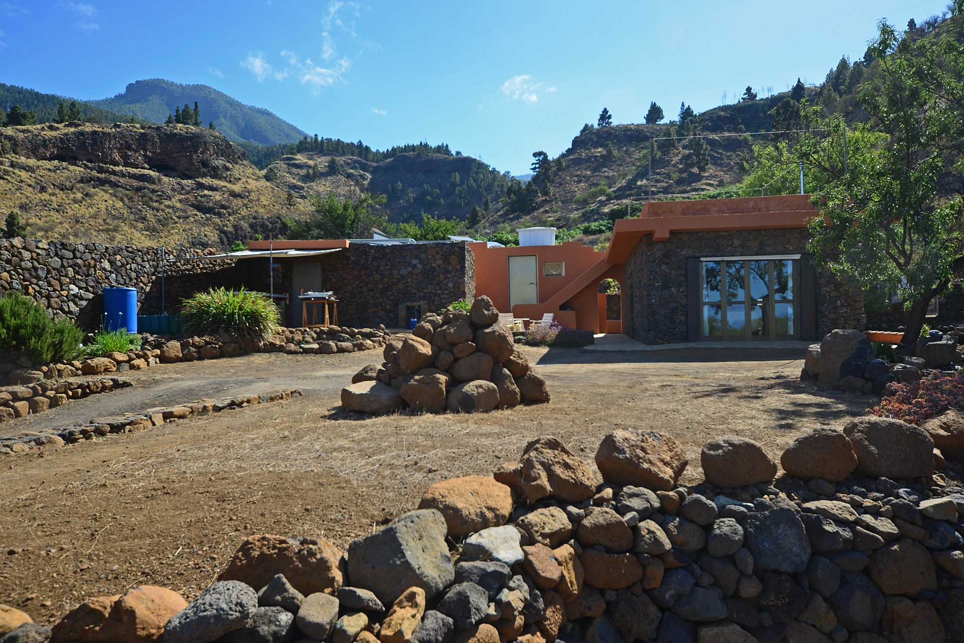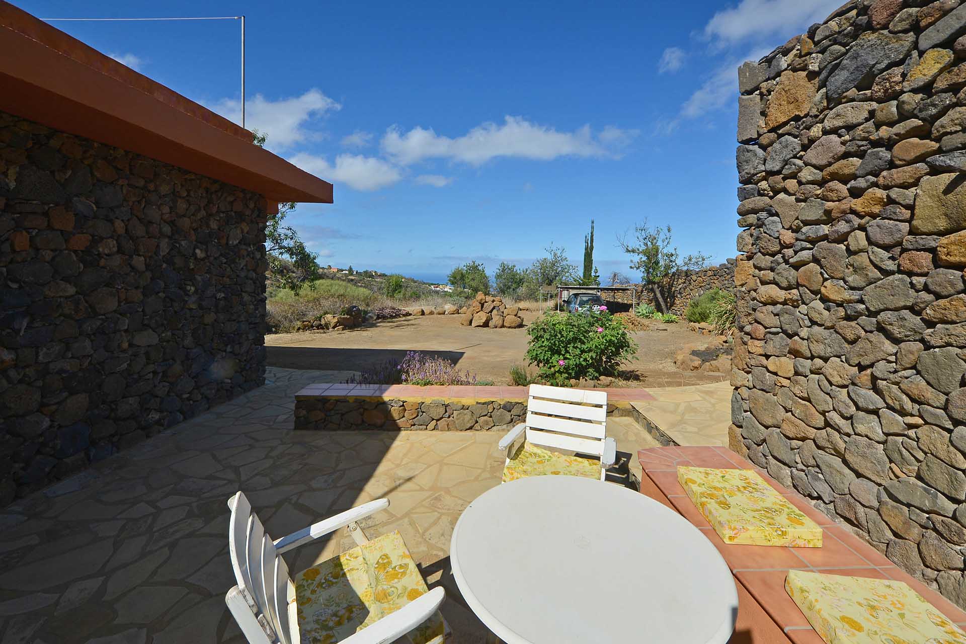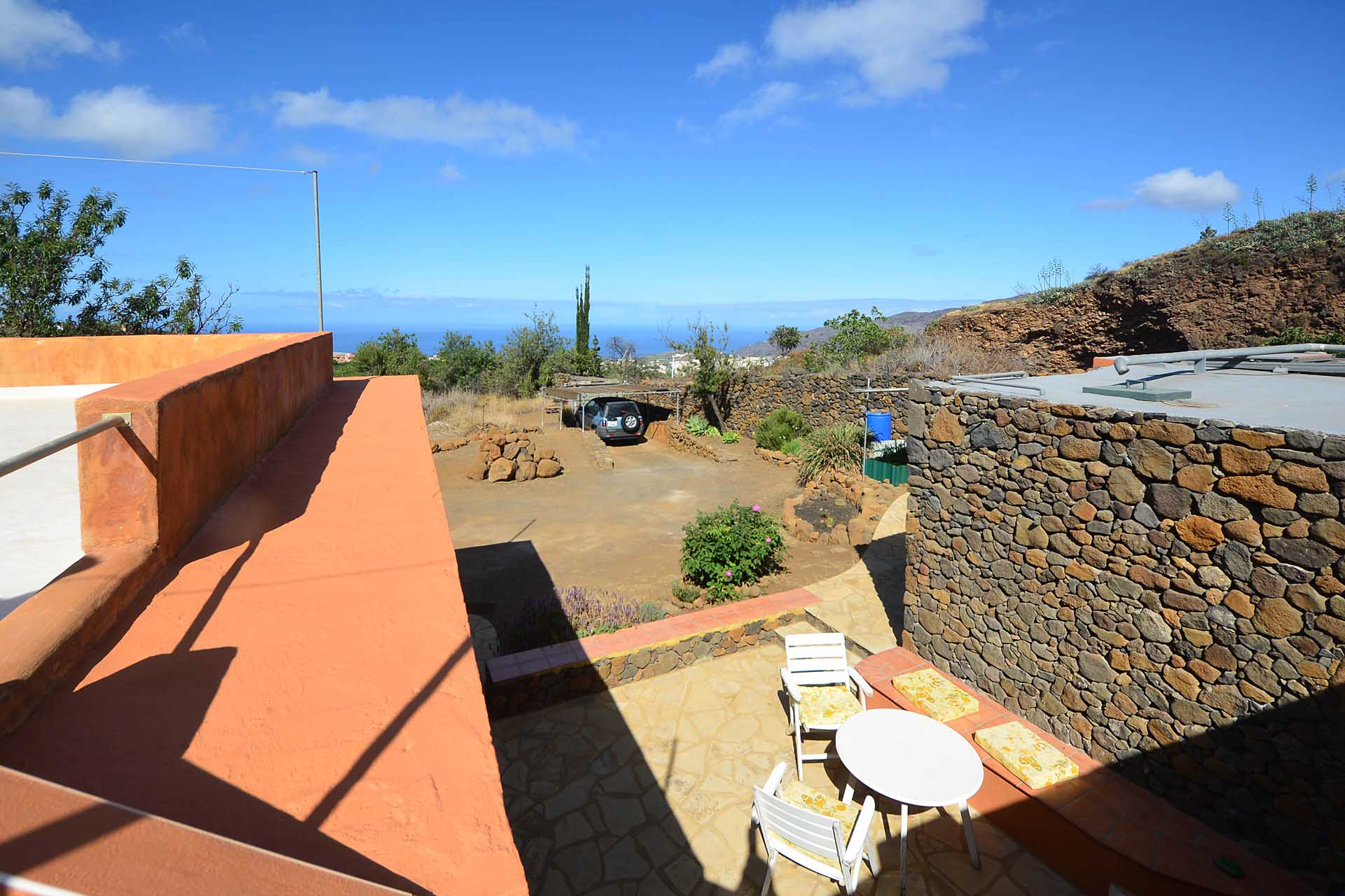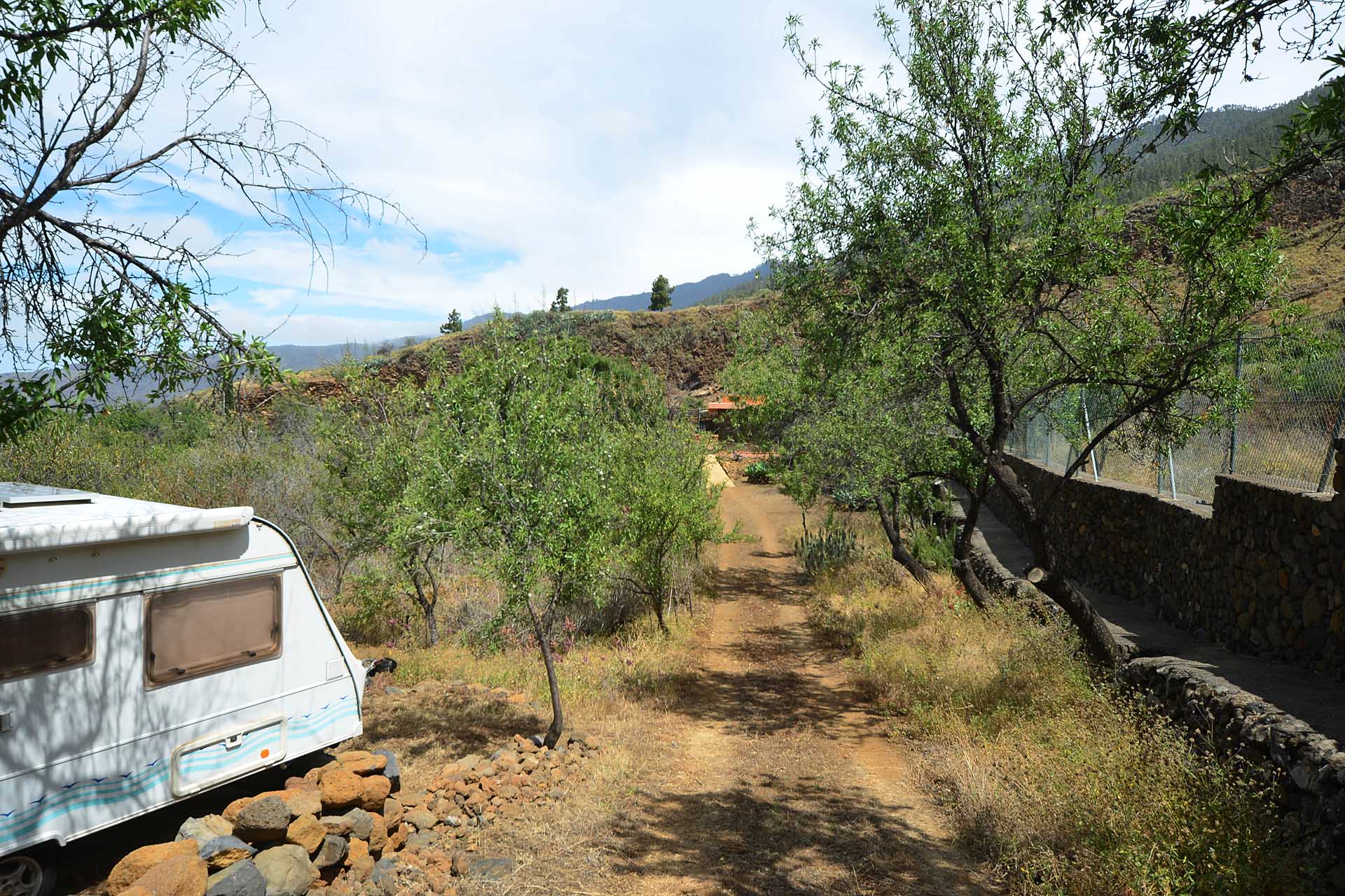 Das Grundstück wurde zum großen Teil naturbelassen und ist teilweise mit großen Mandelbäumen und einer beeindruckenden, kanarischen Kiefer eingewachsen.