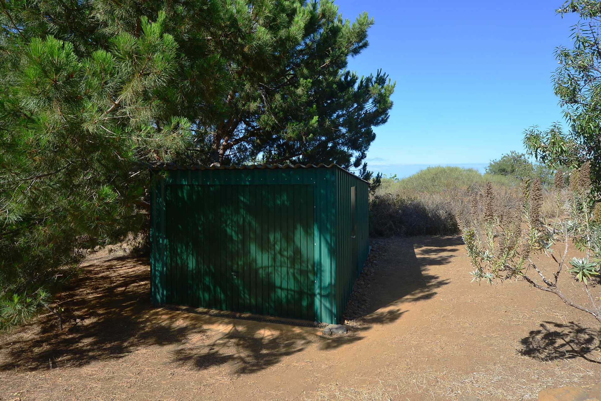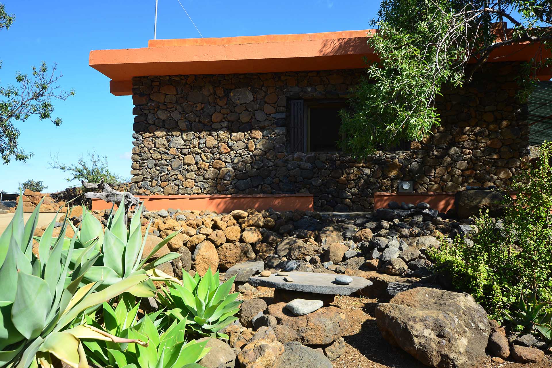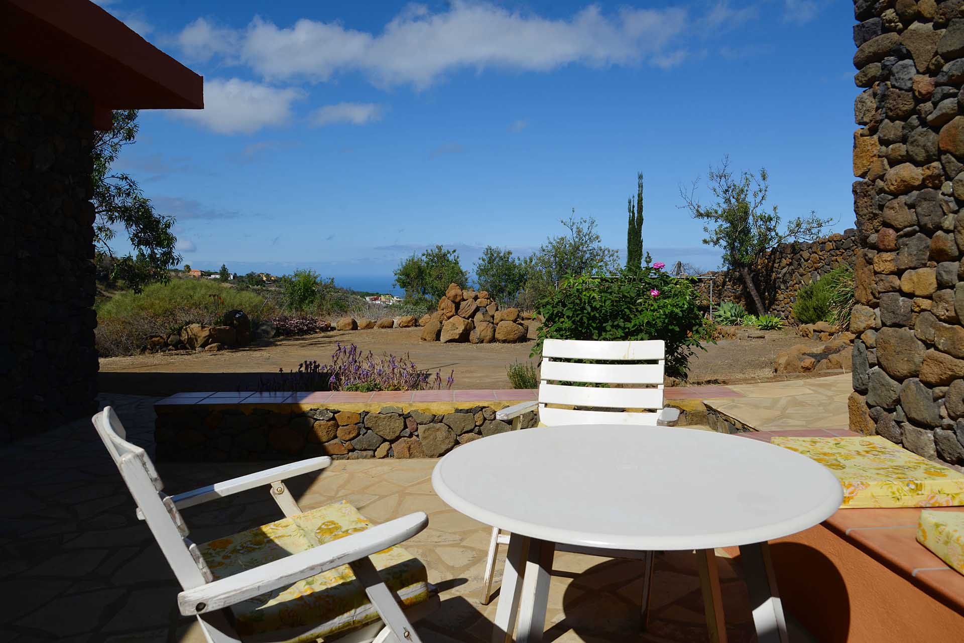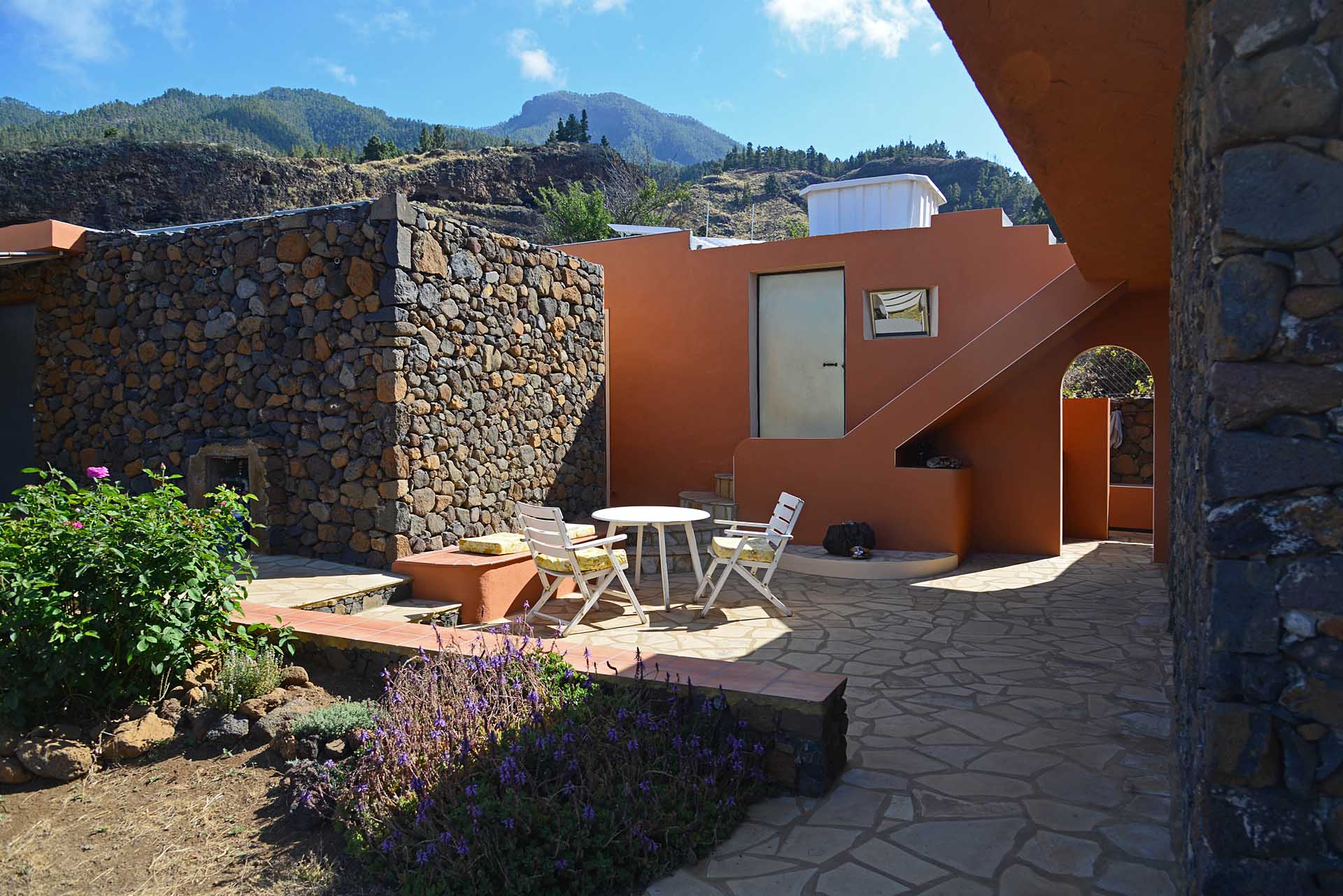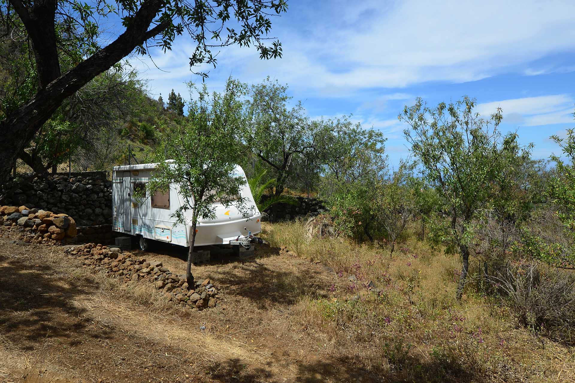 Das Grundstück wurde zum großen Teil naturbelassen und ist teilweise mit großen Mandelbäumen und einer beeindruckenden, kanarischen Kiefer eingewachsen.
