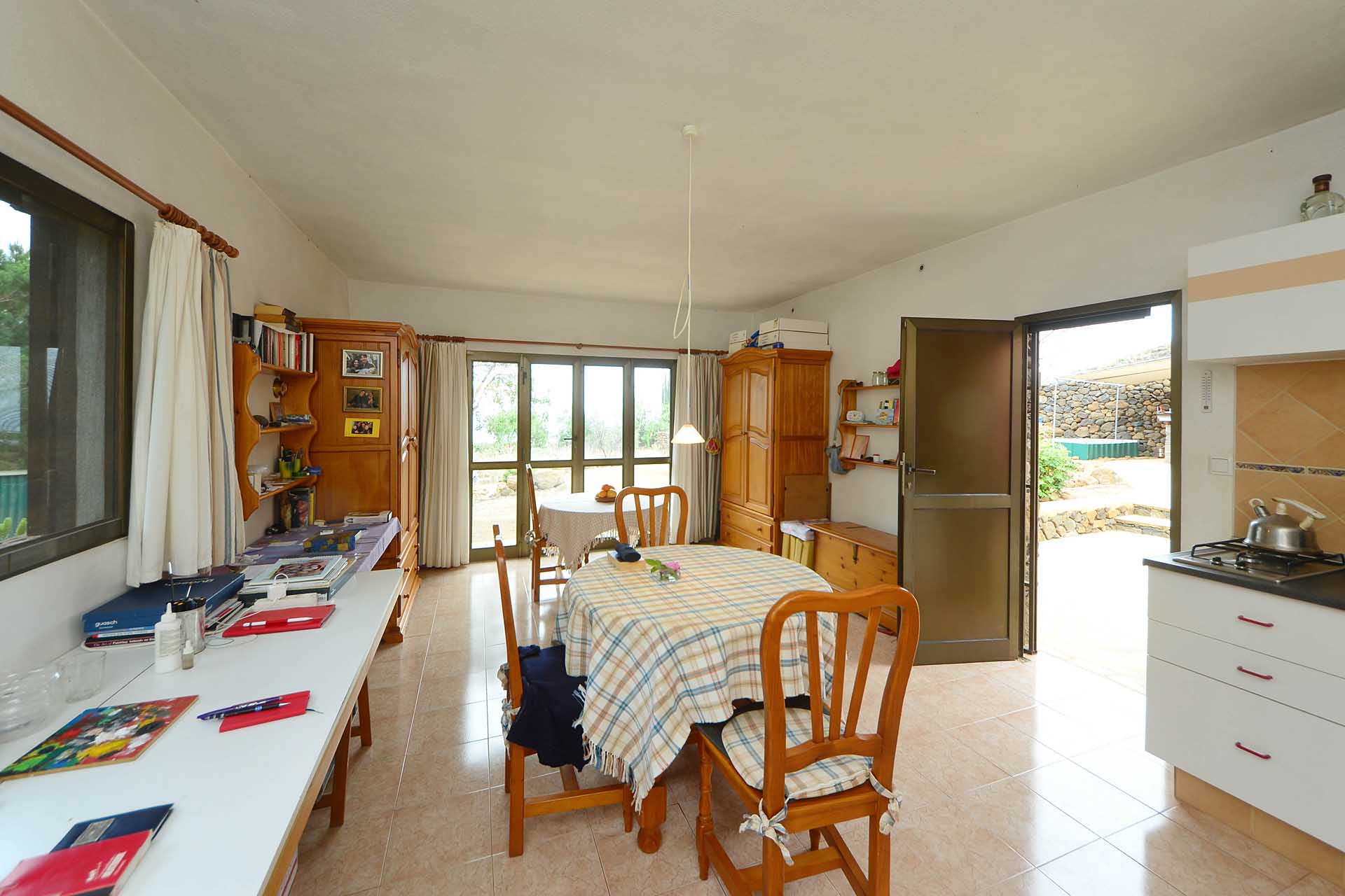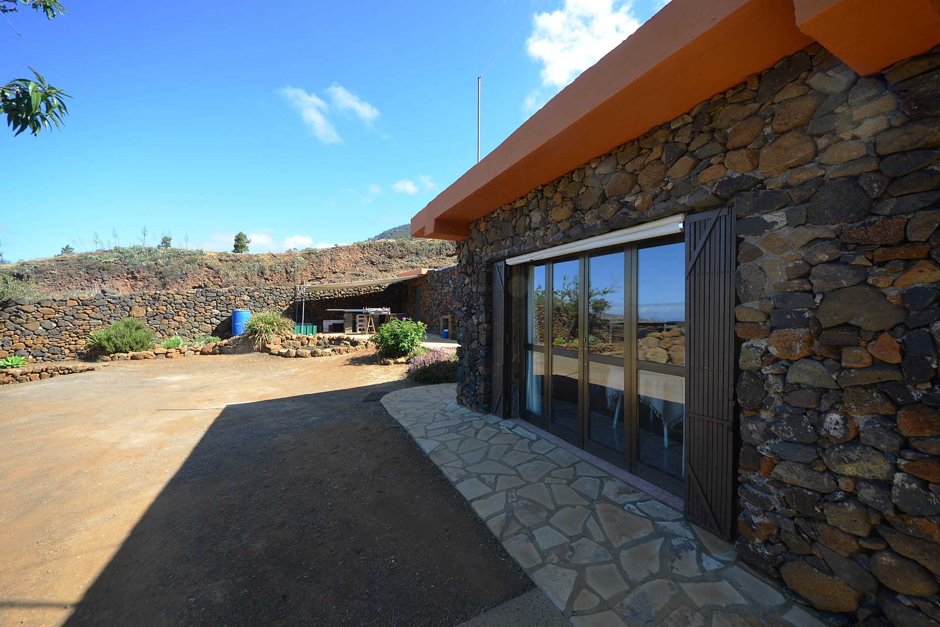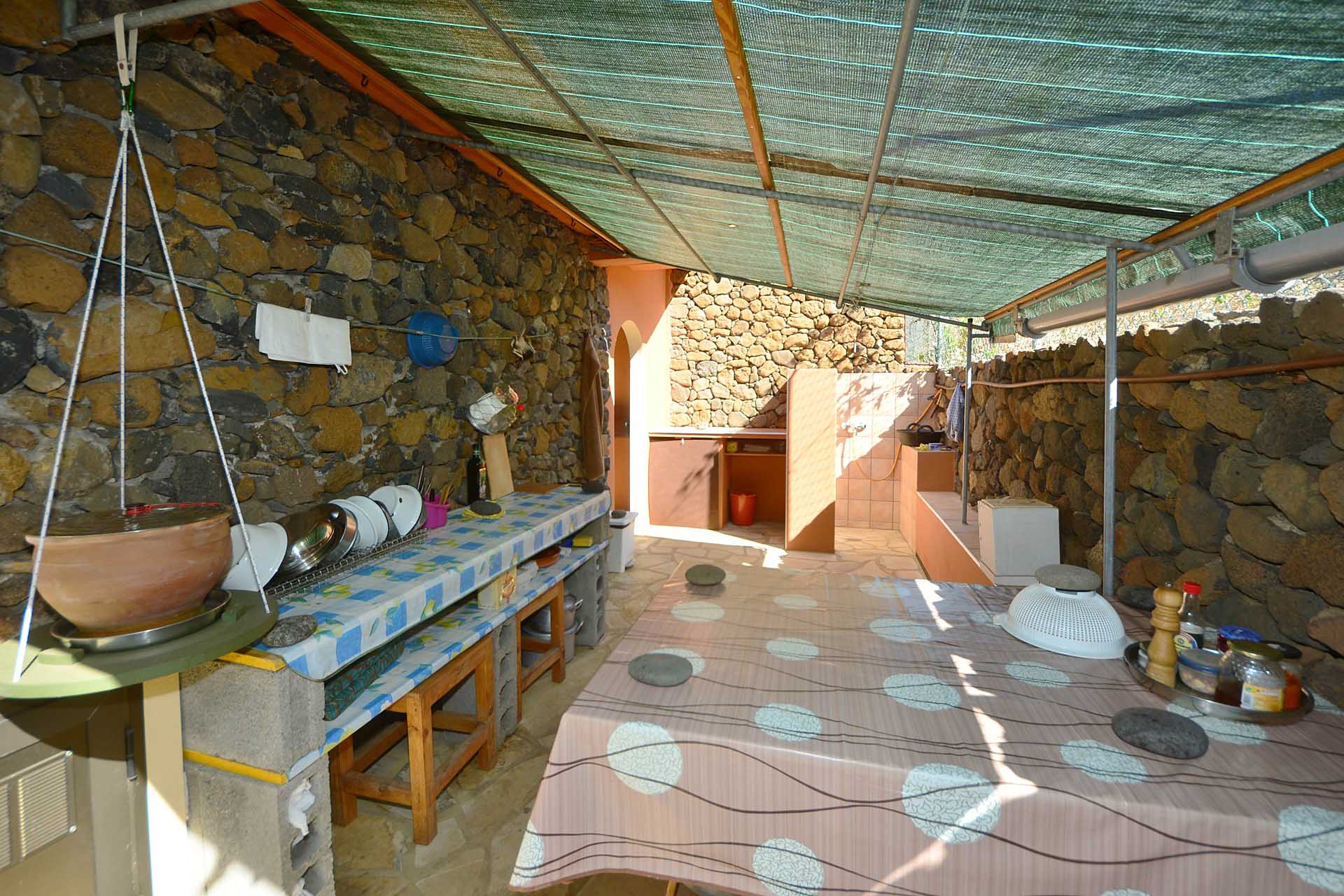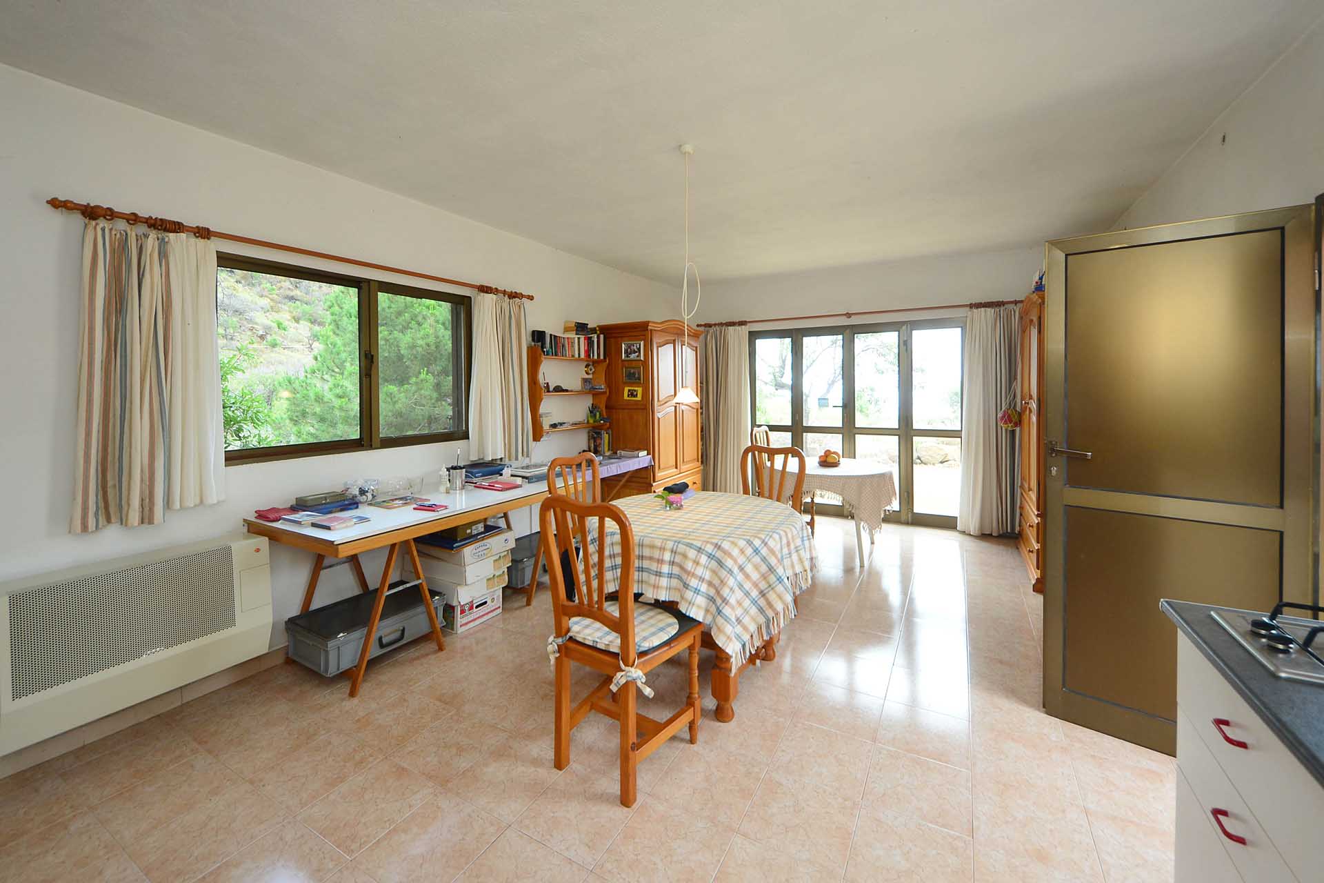 Das Wohnhaus wurde 2006 fertig gestellt und besteht aus einer geräumigen und hellen Wohnküche, einem großen und einem kleinen Schlafzimmer, einem Bad, einer Werkstatt und einer Außenküche. Die Mauern wurden mit Natursteinen verkleidet, so dass Sie das Gebäude mit ihrer Speicherwirkung ausgezeichnet klimatisieren. Alle Räume sind über den offenen Innenhof, der das Zentrum der Finca mit einem dreiseitig gut geschützten Sitzplatz mit schönem Meerblick bildet, verbunden.