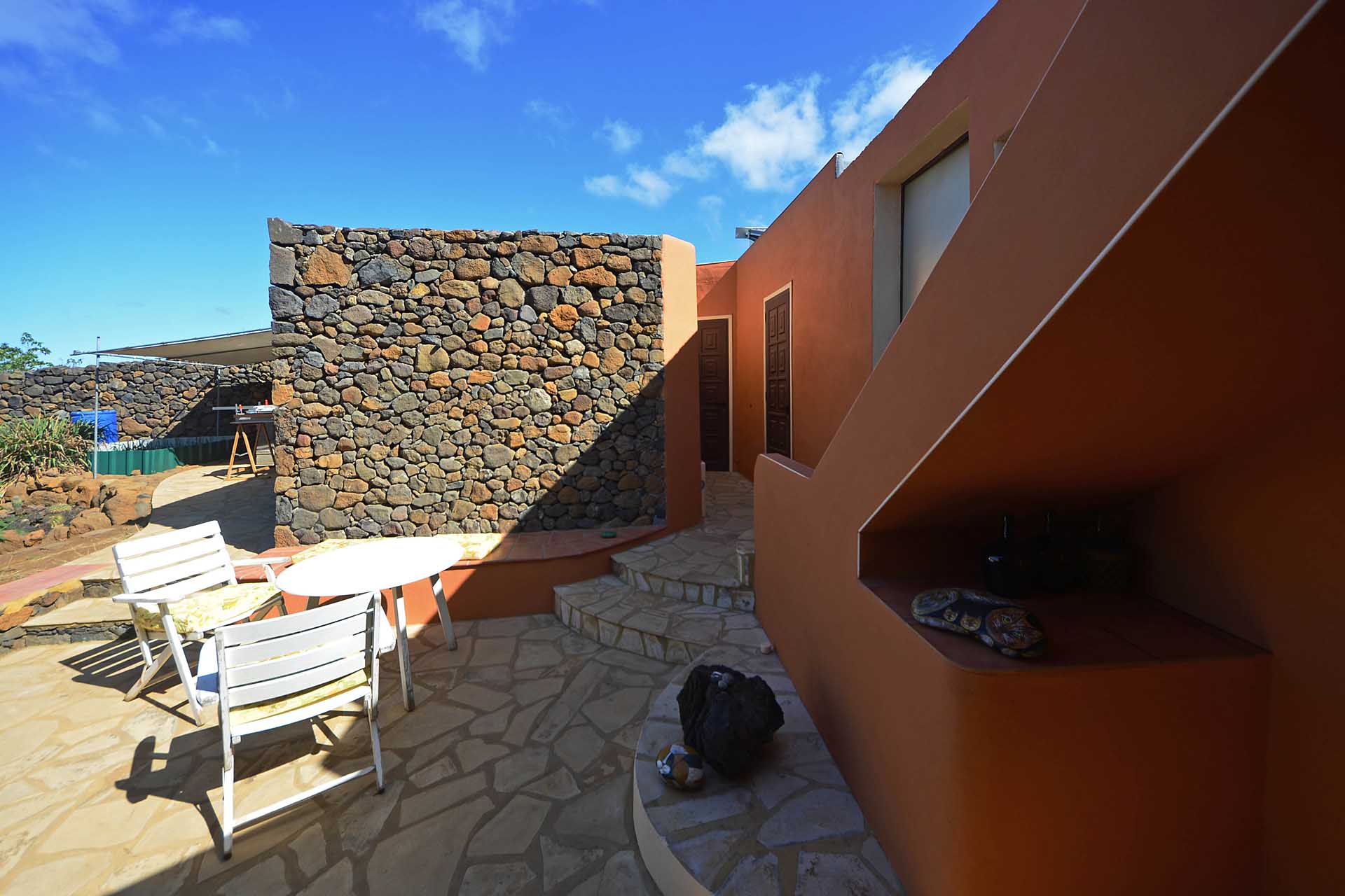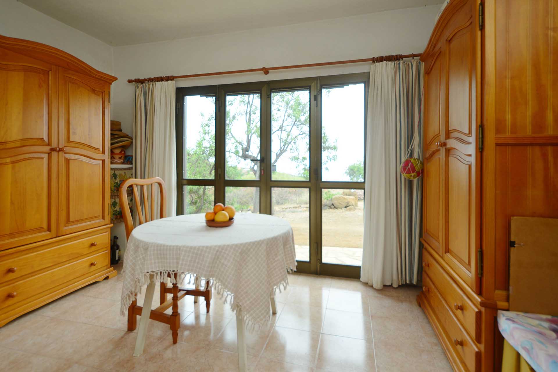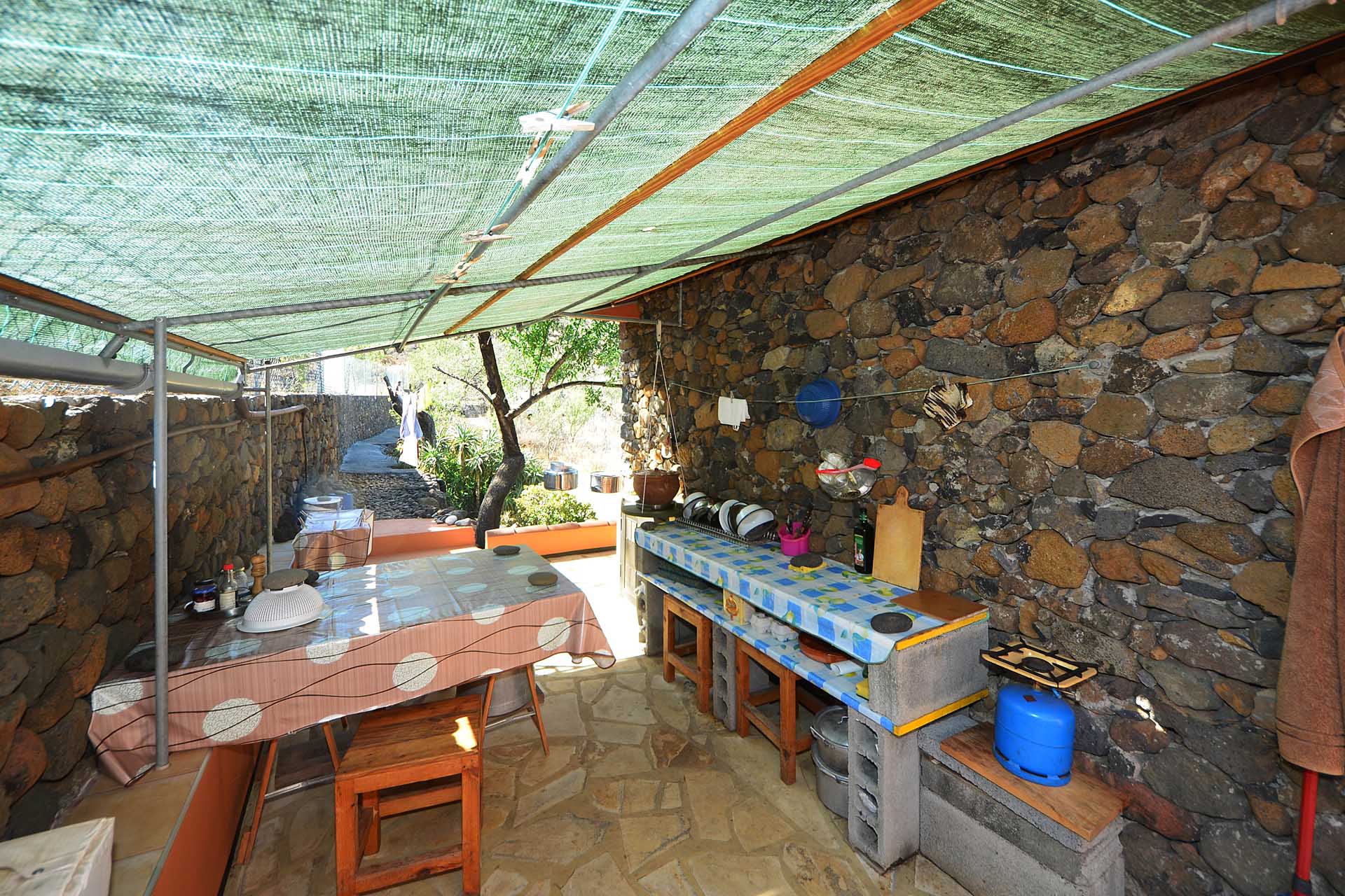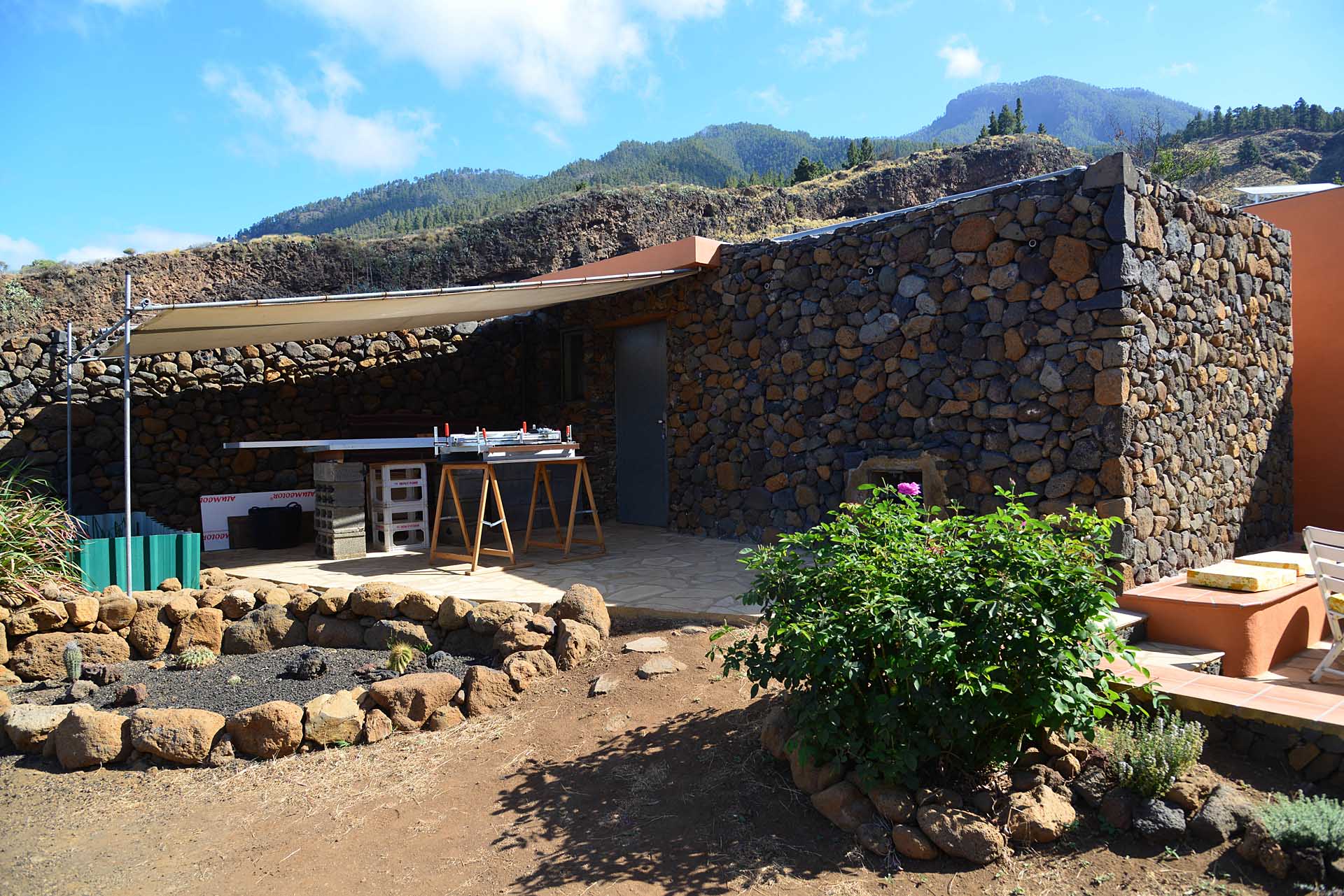 Das Wohnhaus wurde 2006 fertig gestellt und besteht aus einer geräumigen und hellen Wohnküche, einem großen und einem kleinen Schlafzimmer, einem Bad, einer Werkstatt und einer Außenküche. Die Mauern wurden mit Natursteinen verkleidet, so dass Sie das Gebäude mit ihrer Speicherwirkung ausgezeichnet klimatisieren. Alle Räume sind über den offenen Innenhof, der das Zentrum der Finca mit einem dreiseitig gut geschützten Sitzplatz mit schönem Meerblick bildet, verbunden.