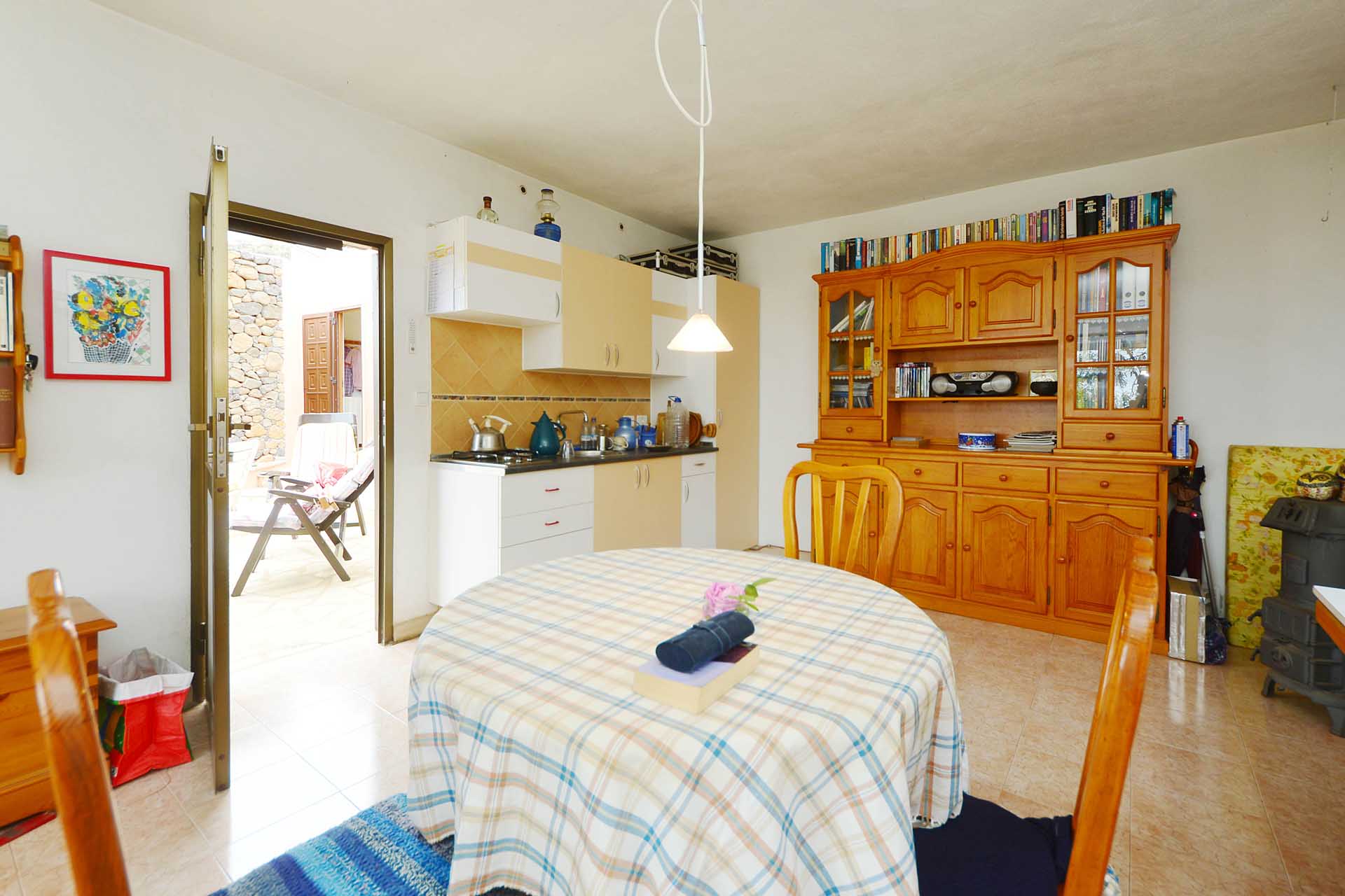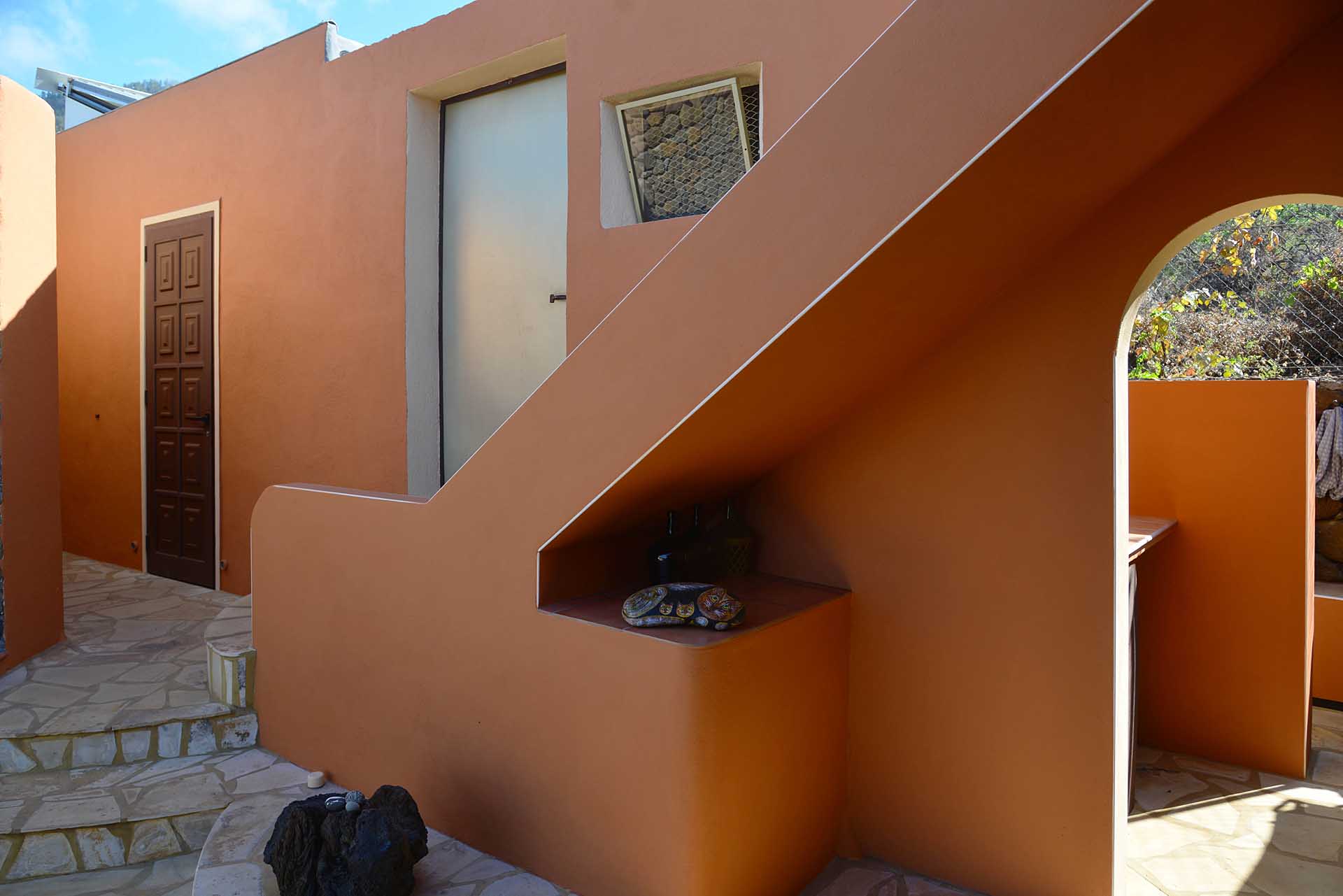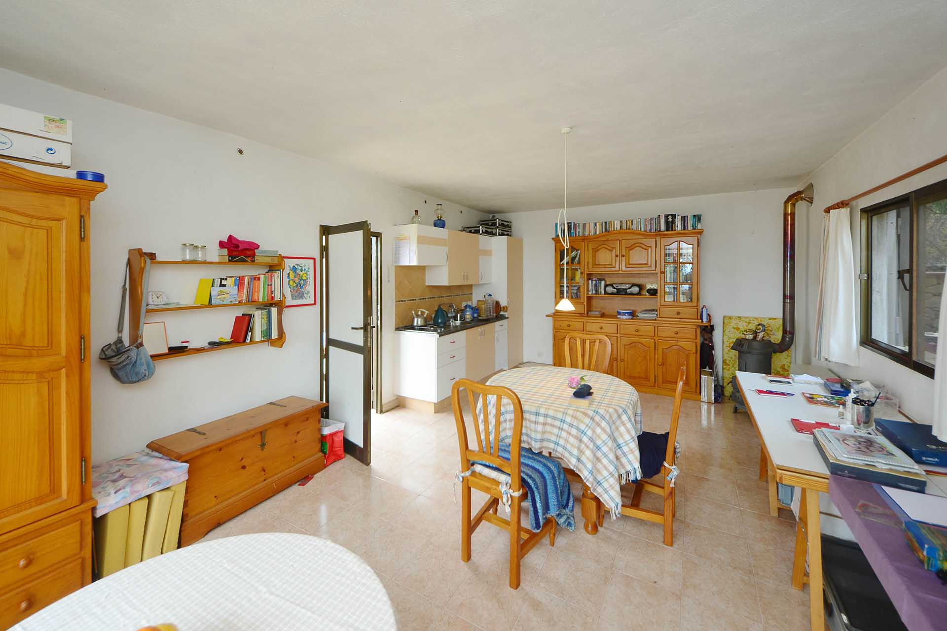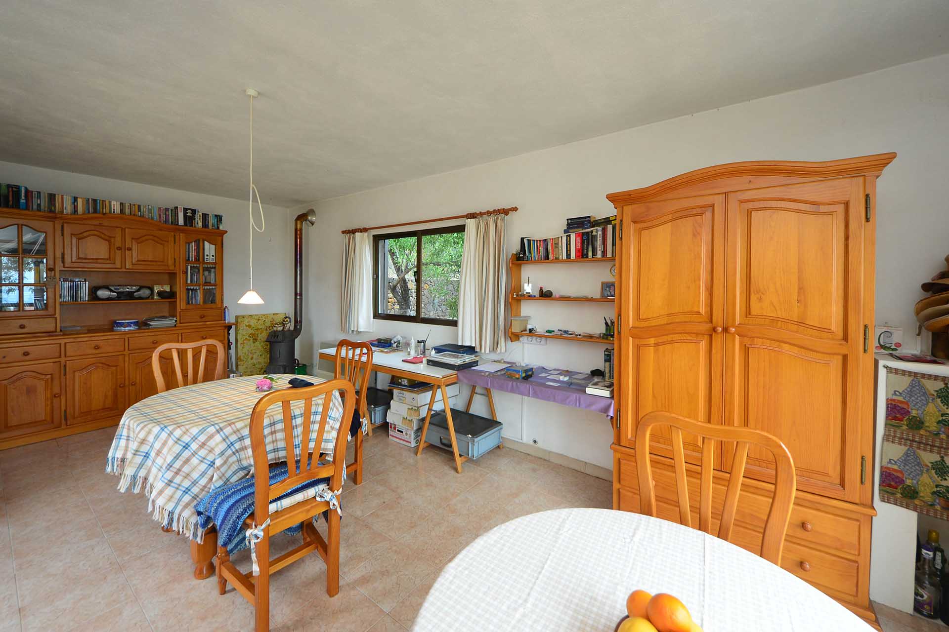 Das Wohnhaus wurde 2006 fertig gestellt und besteht aus einer geräumigen und hellen Wohnküche, einem großen und einem kleinen Schlafzimmer, einem Bad, einer Werkstatt und einer Außenküche. Die Mauern wurden mit Natursteinen verkleidet, so dass Sie das Gebäude mit ihrer Speicherwirkung ausgezeichnet klimatisieren. Alle Räume sind über den offenen Innenhof, der das Zentrum der Finca mit einem dreiseitig gut geschützten Sitzplatz mit schönem Meerblick bildet, verbunden.