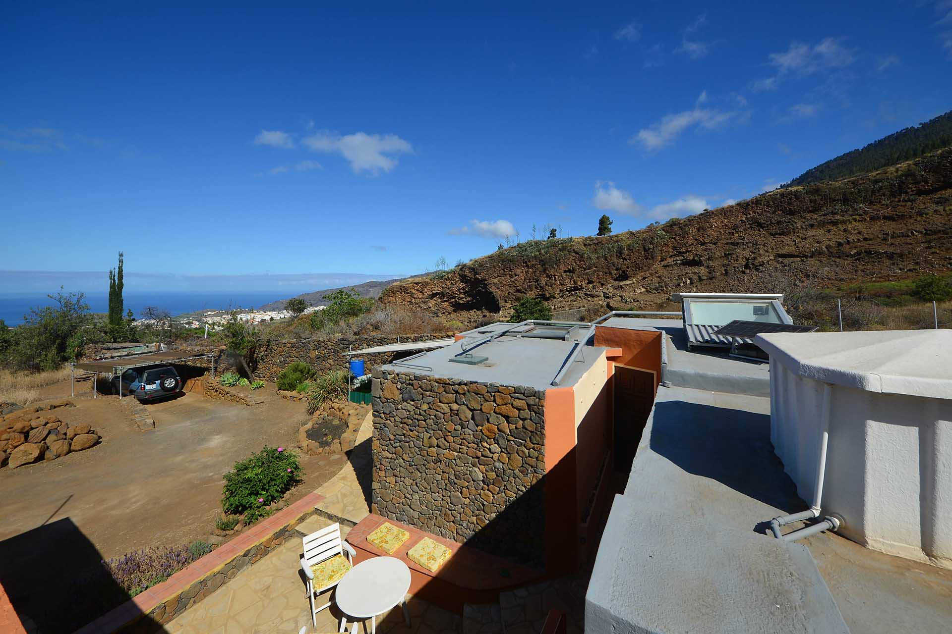 Die Finca liegt an einem Südhang östlich der Hermosilla sehr geschützt und ruhig, nahezu am Ende einer schmalen Sackgasse in unverbaubarer Umgebung. Von hier aus genießen Sie nicht nur den Meerblick, sondern vor allem die einerseits abgelegene und sehr ruhige Lage, sondern auch den Schutz des steil aufragenden Gebirges und dennoch die kurzen Entfernungen nach Los Llanos oder El Paso. Einkäufe können durchaus zu Fuß erledigt werden, dennoch hören Sie von den beiden Städten nichts.