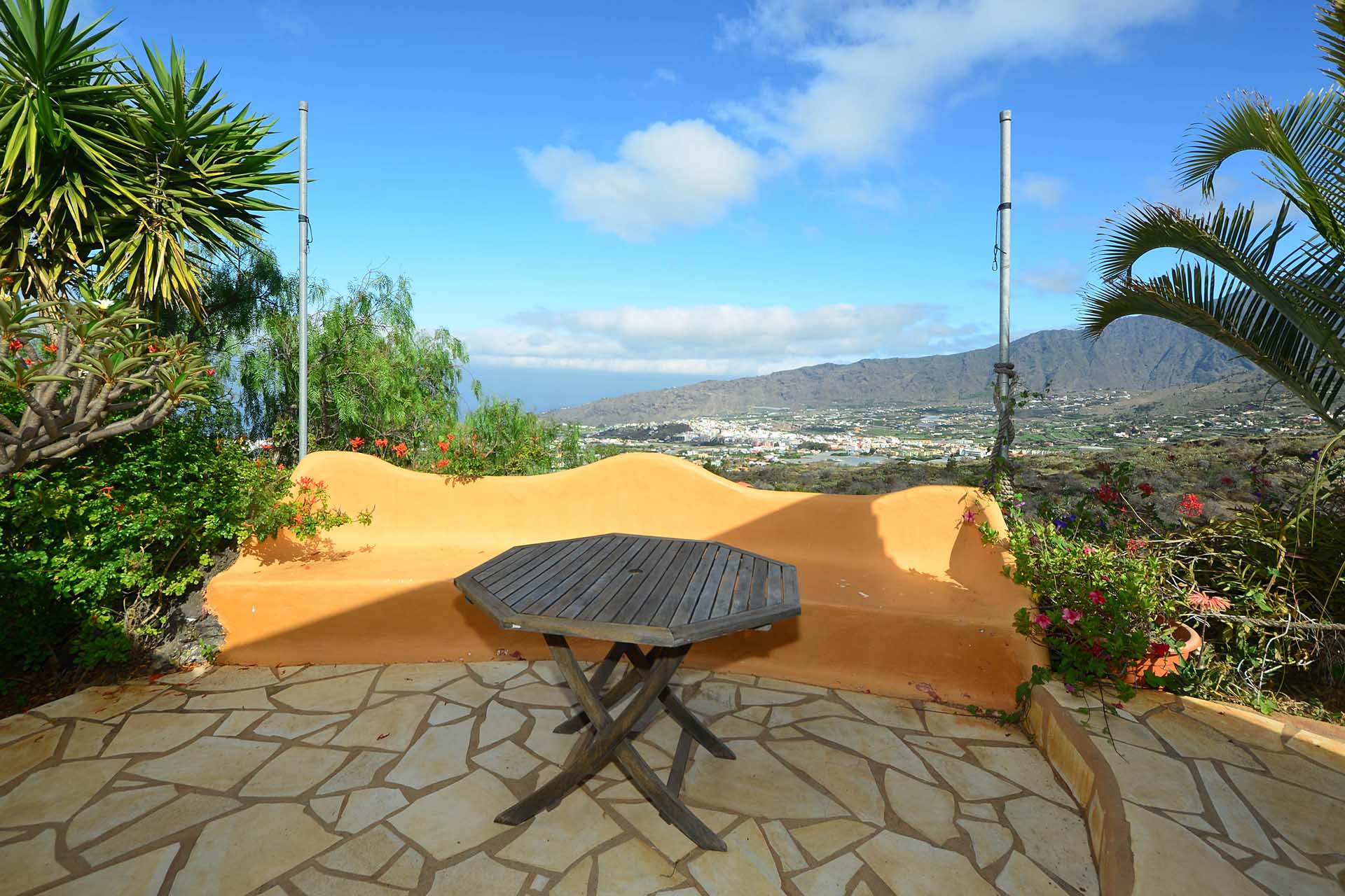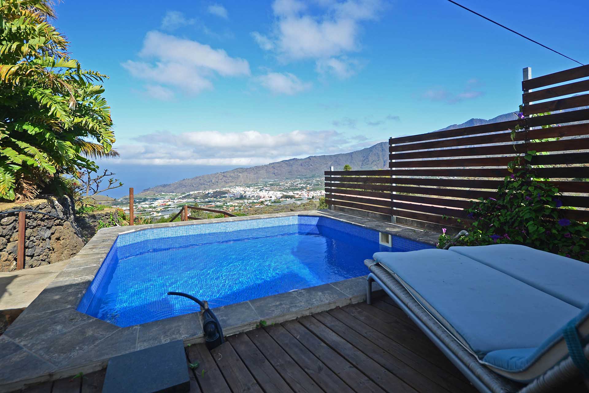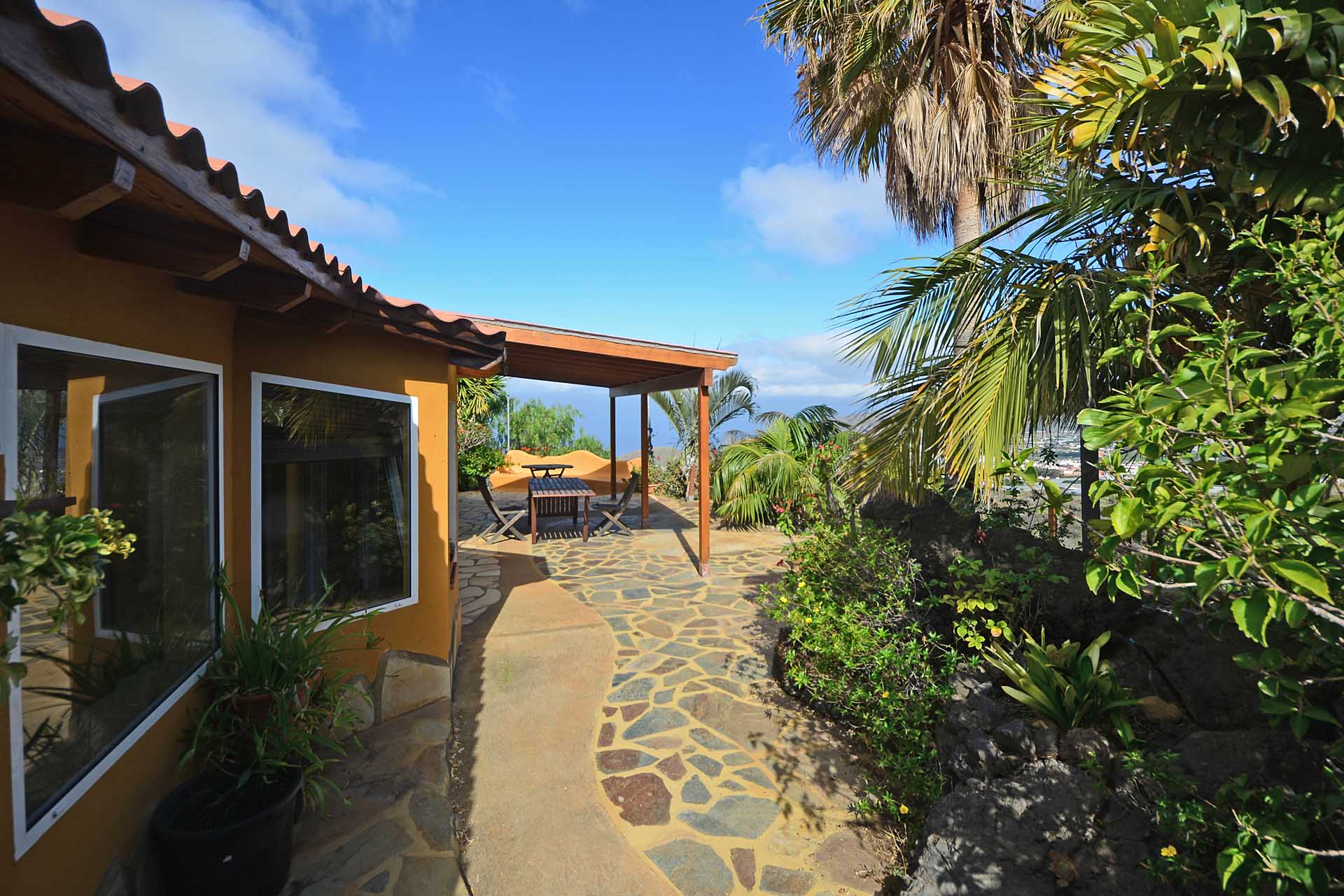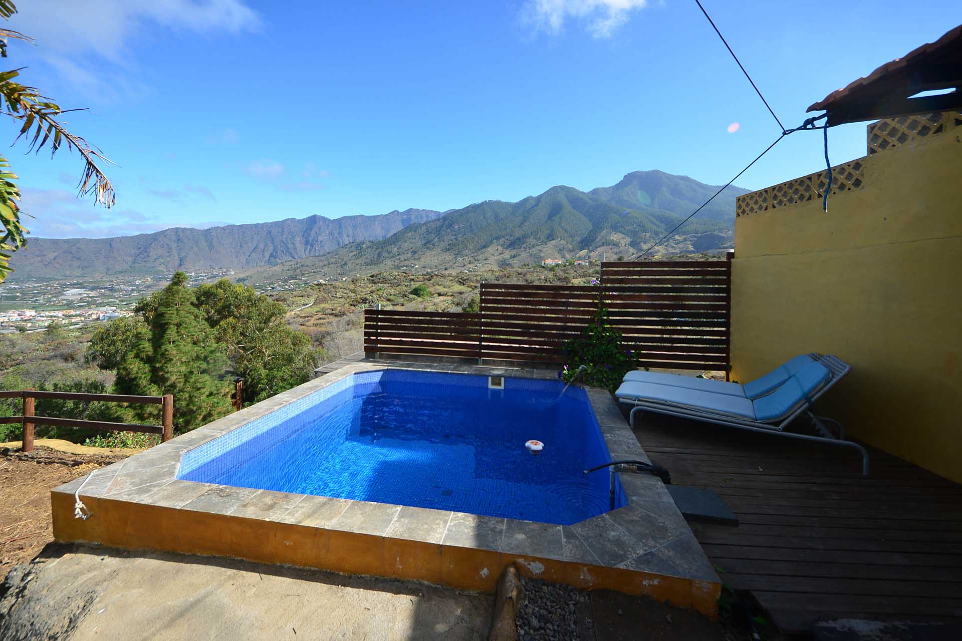 Im gesamten Außenbereich wurde viel mit Natursteinen gearbeitet, so dass Sie rund um das Haus auch gut barfuß gehen können. Ein kleiner Pool (ca. 3x3 m) bietet auch beim Schwimmen herrlichen Meerblick, wie die angrenzende Sonnenterrasse. Gleich anschließend befindet sich die auf den Kanaren obligatorische Außenküche (Barbacoa), hier sogar mit Pizzaofen und ein halboffener Hauswirtschaftsraum.