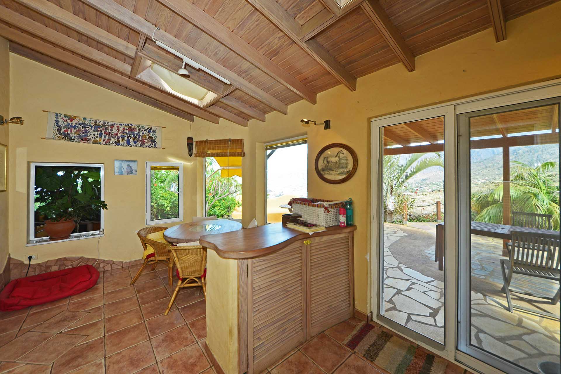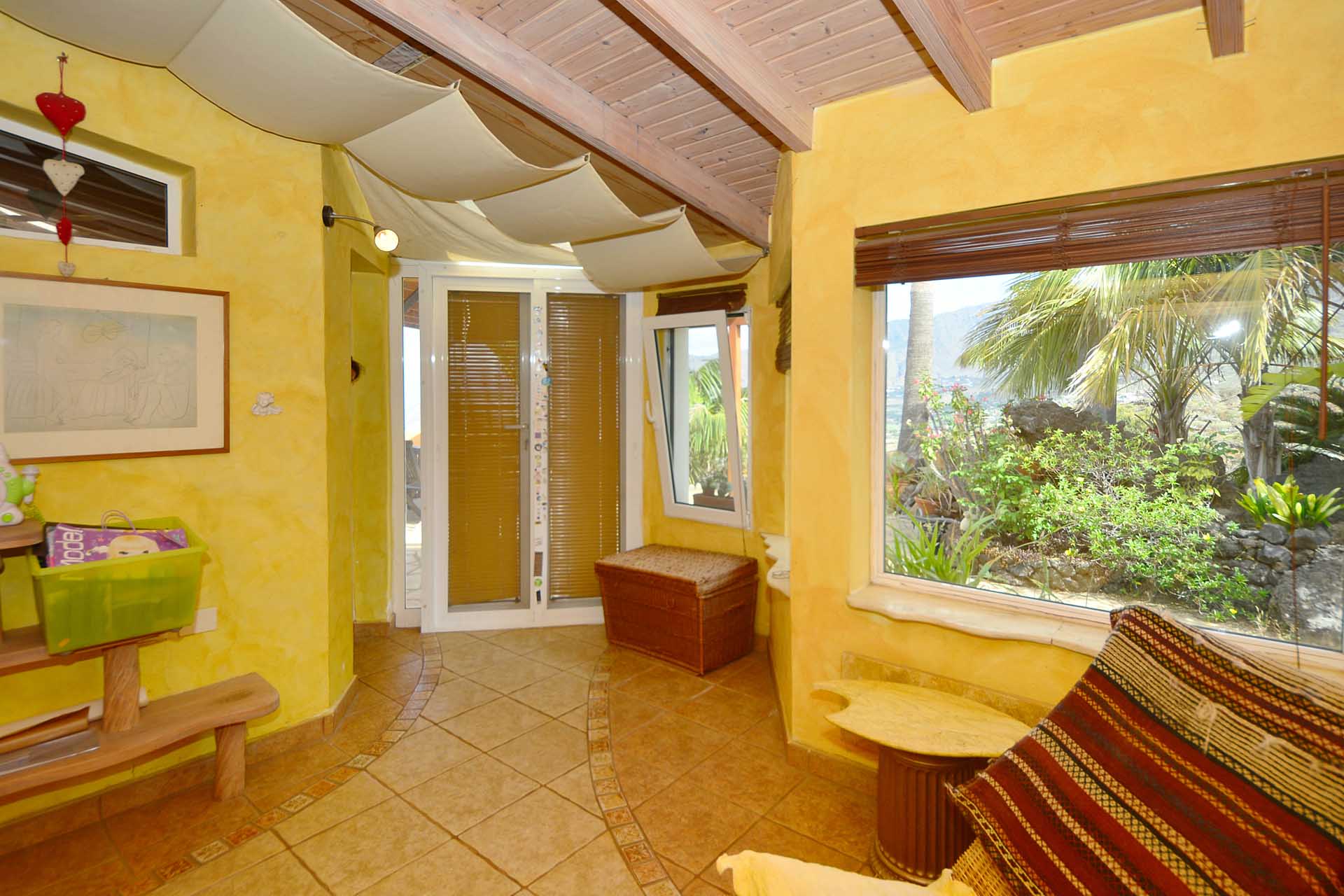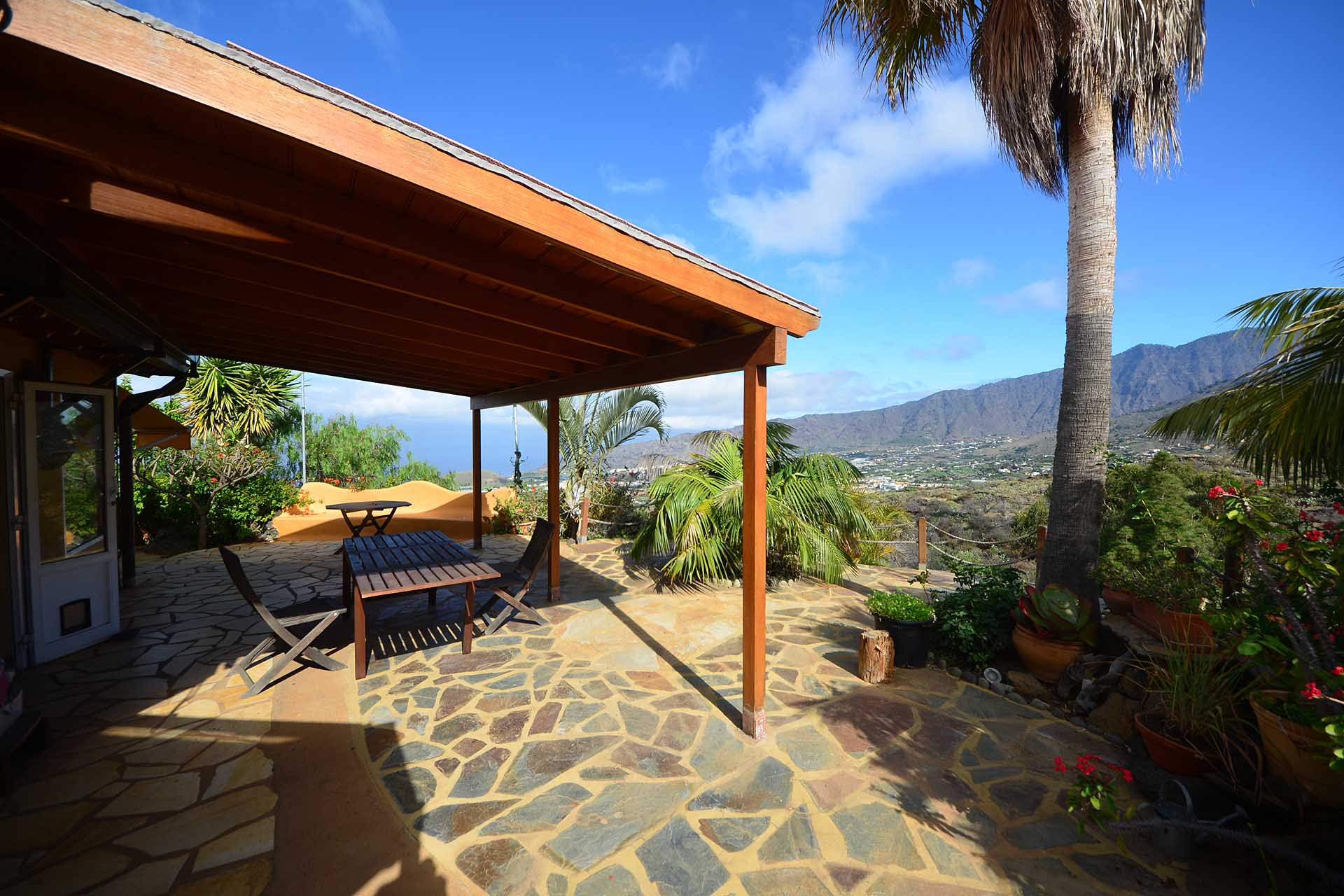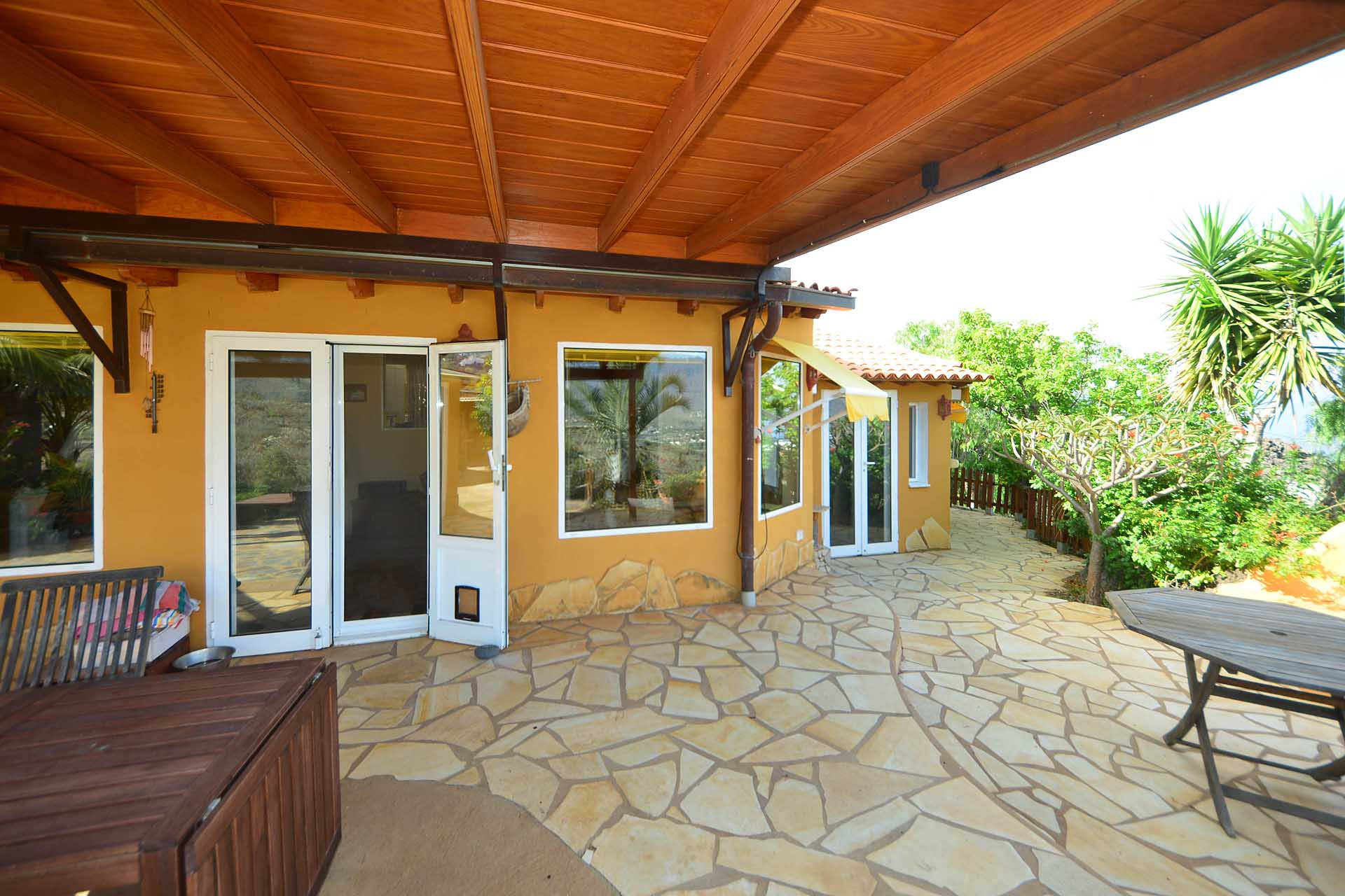 Im gesamten Außenbereich wurde viel mit Natursteinen gearbeitet, so dass Sie rund um das Haus auch gut barfuß gehen können. Ein kleiner Pool (ca. 3x3 m) bietet auch beim Schwimmen herrlichen Meerblick, wie die angrenzende Sonnenterrasse. Gleich anschließend befindet sich die auf den Kanaren obligatorische Außenküche (Barbacoa), hier sogar mit Pizzaofen und ein halboffener Hauswirtschaftsraum.