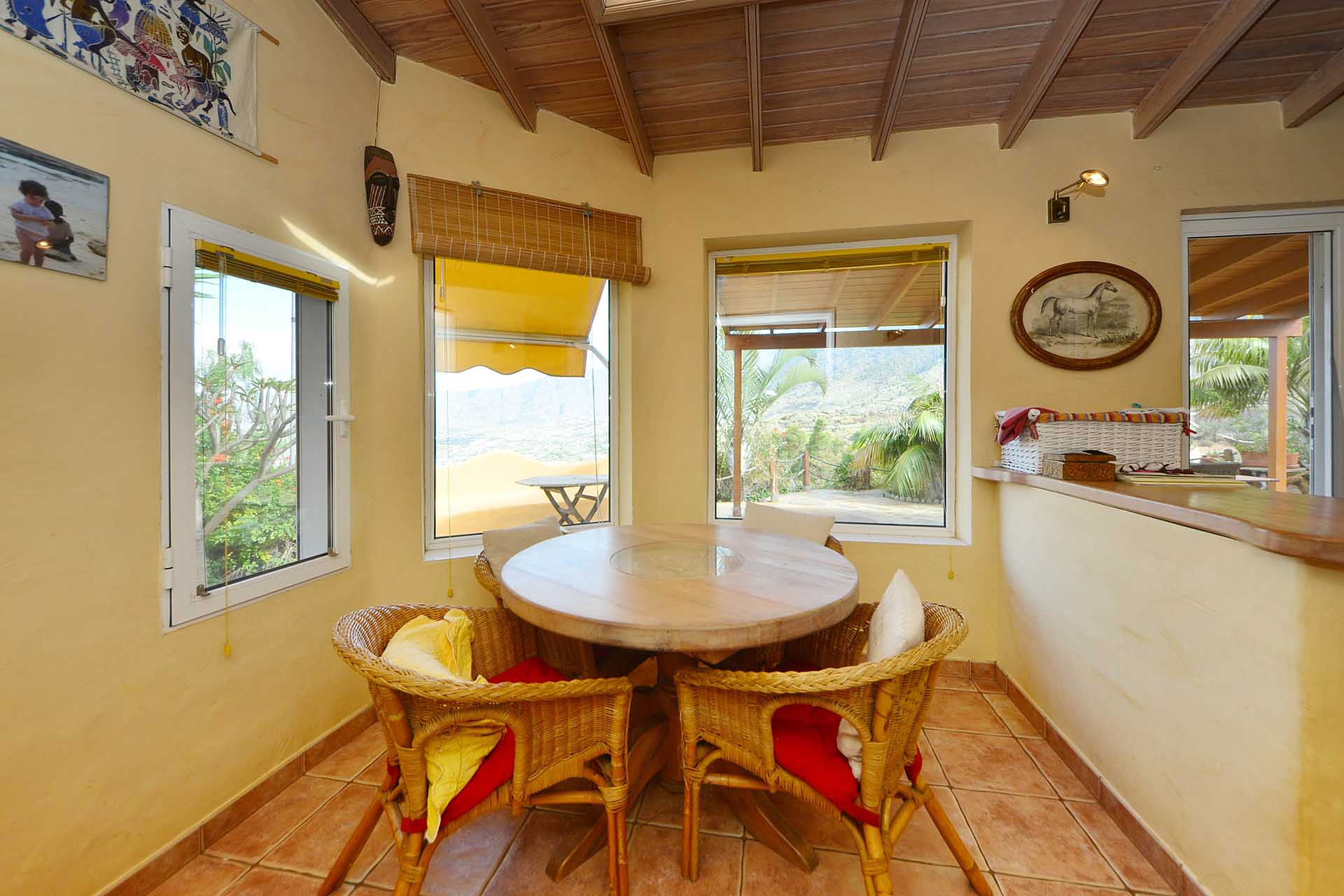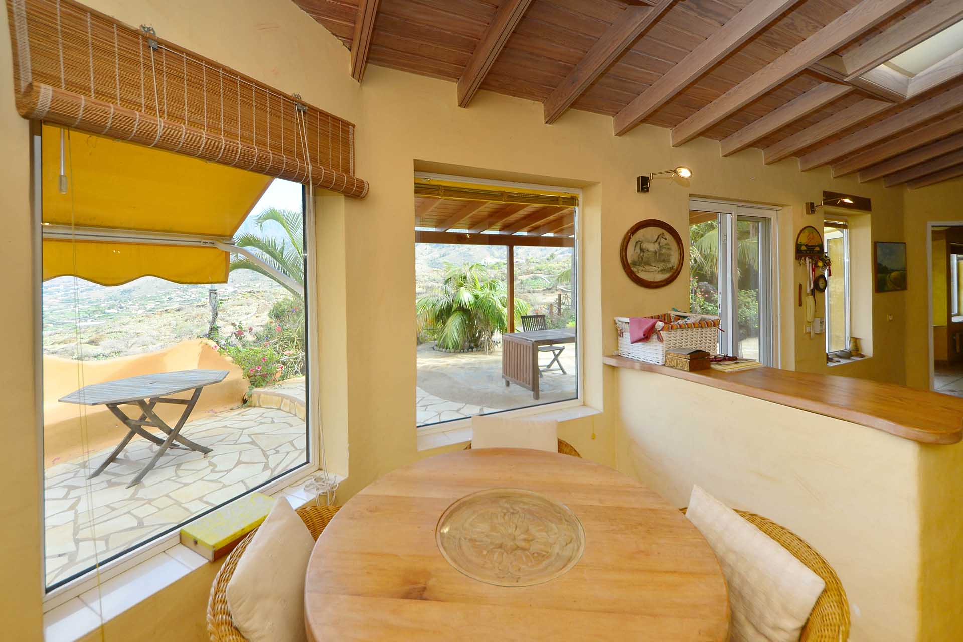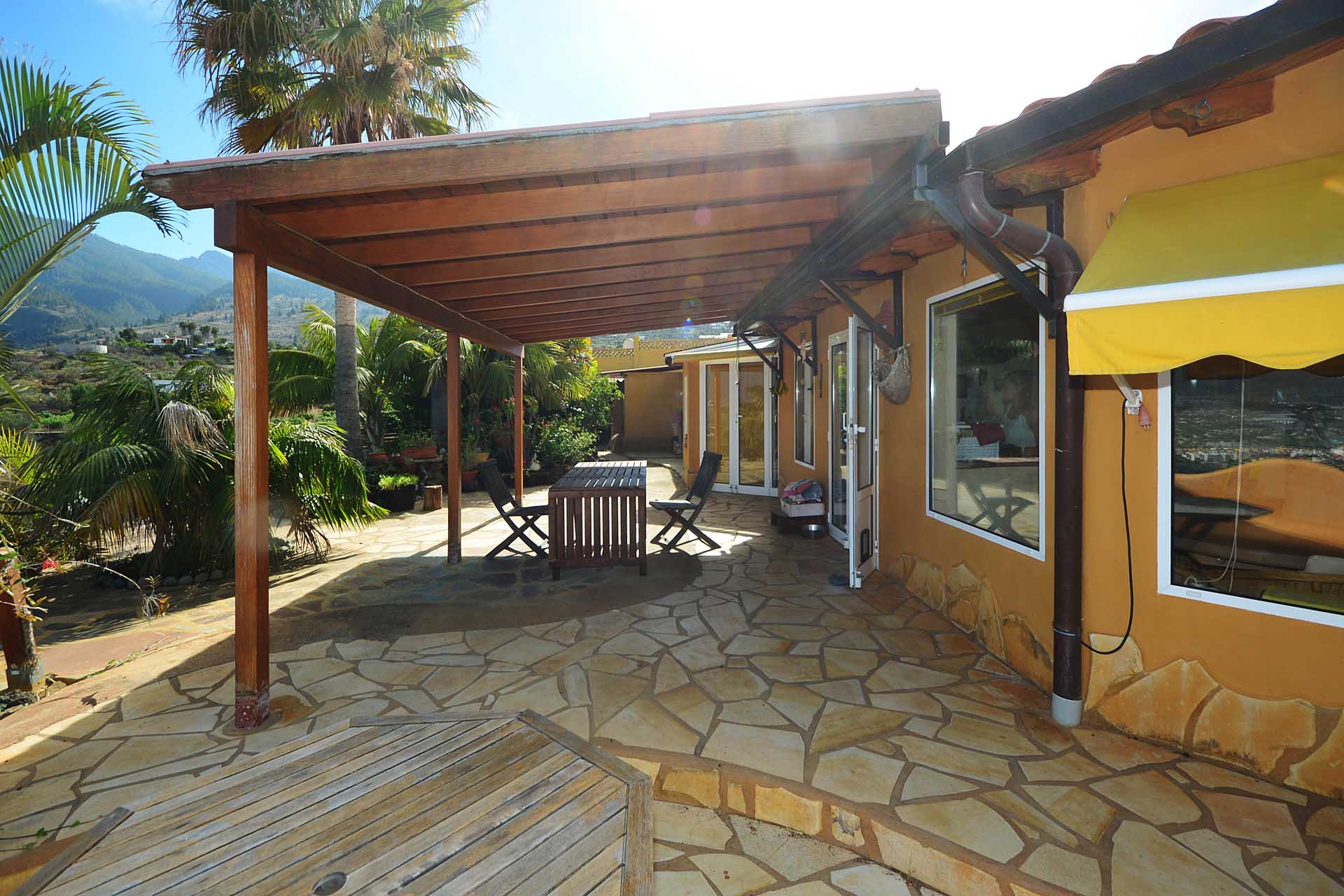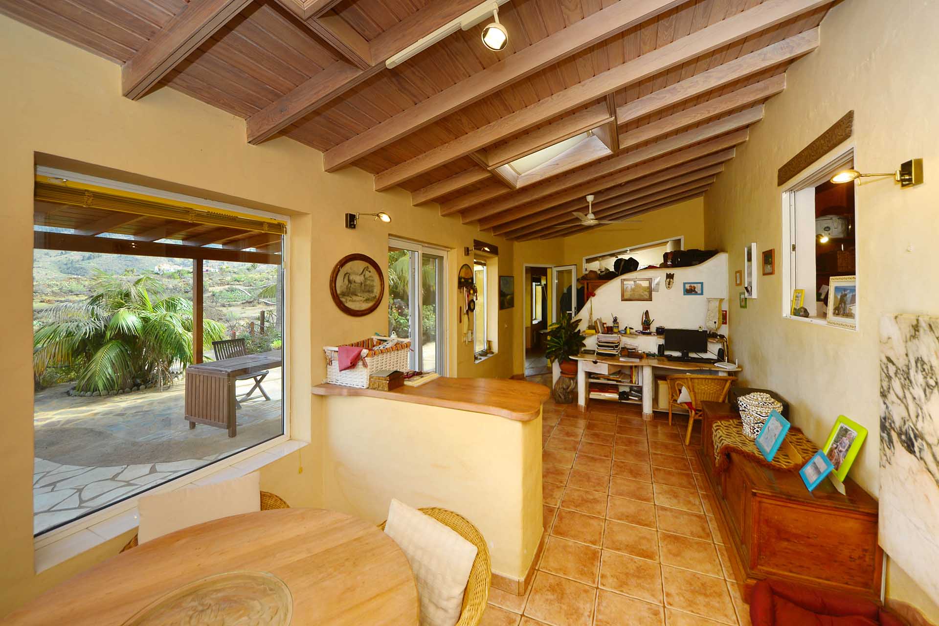 Im gesamten Außenbereich wurde viel mit Natursteinen gearbeitet, so dass Sie rund um das Haus auch gut barfuß gehen können. Ein kleiner Pool (ca. 3x3 m) bietet auch beim Schwimmen herrlichen Meerblick, wie die angrenzende Sonnenterrasse. Gleich anschließend befindet sich die auf den Kanaren obligatorische Außenküche (Barbacoa), hier sogar mit Pizzaofen und ein halboffener Hauswirtschaftsraum.