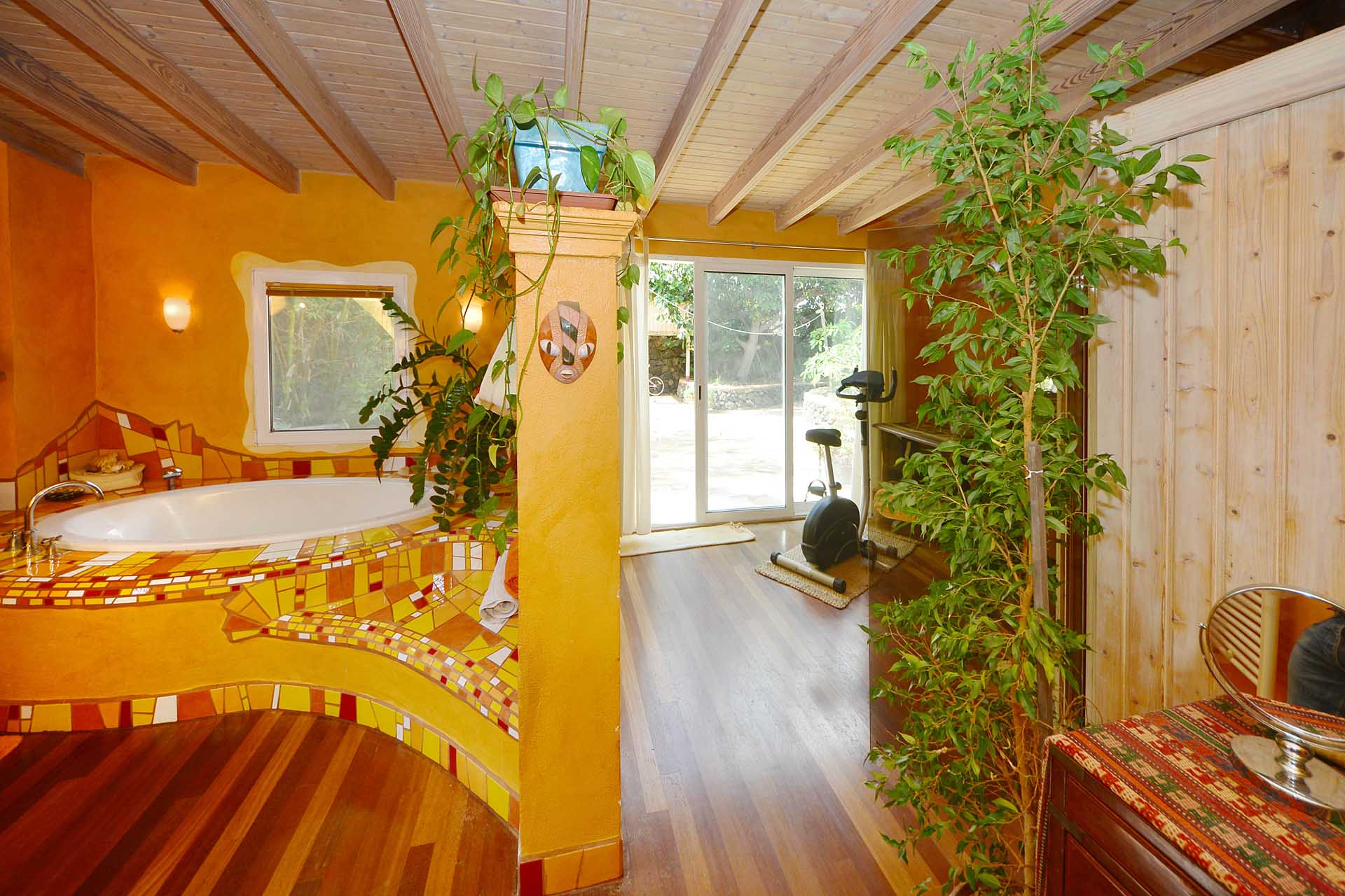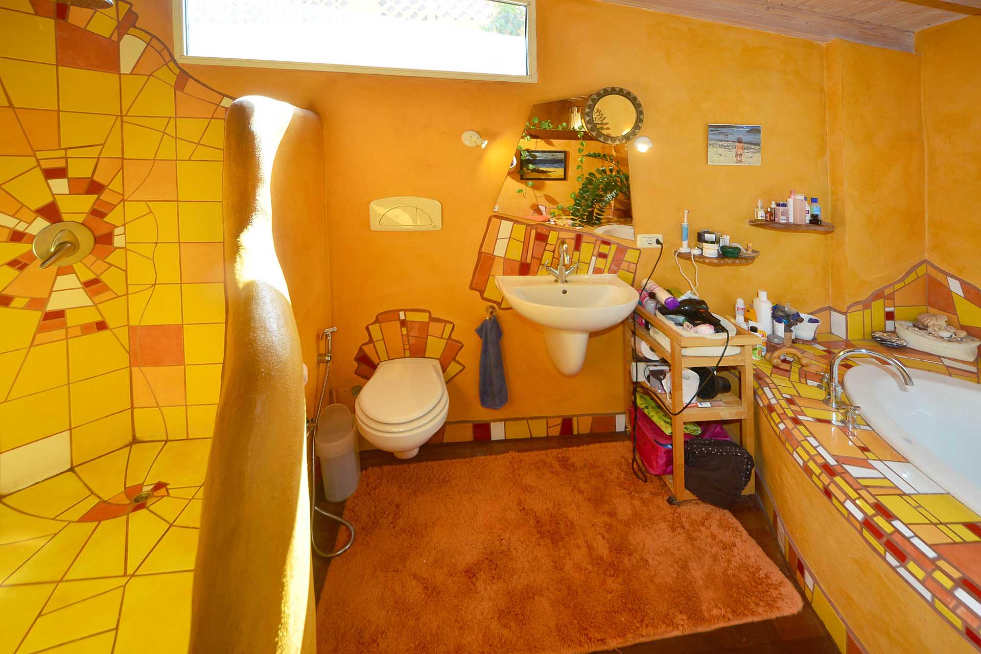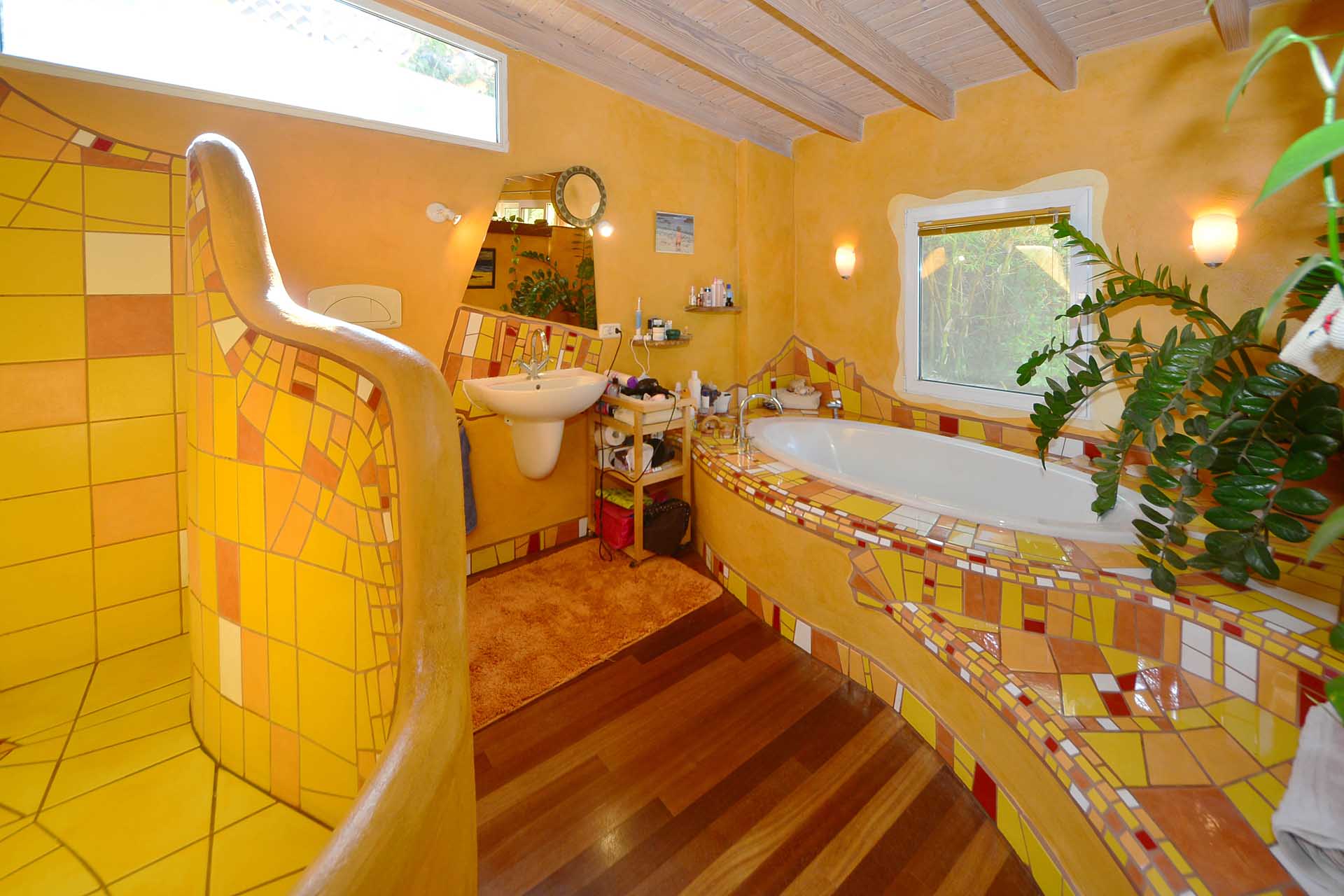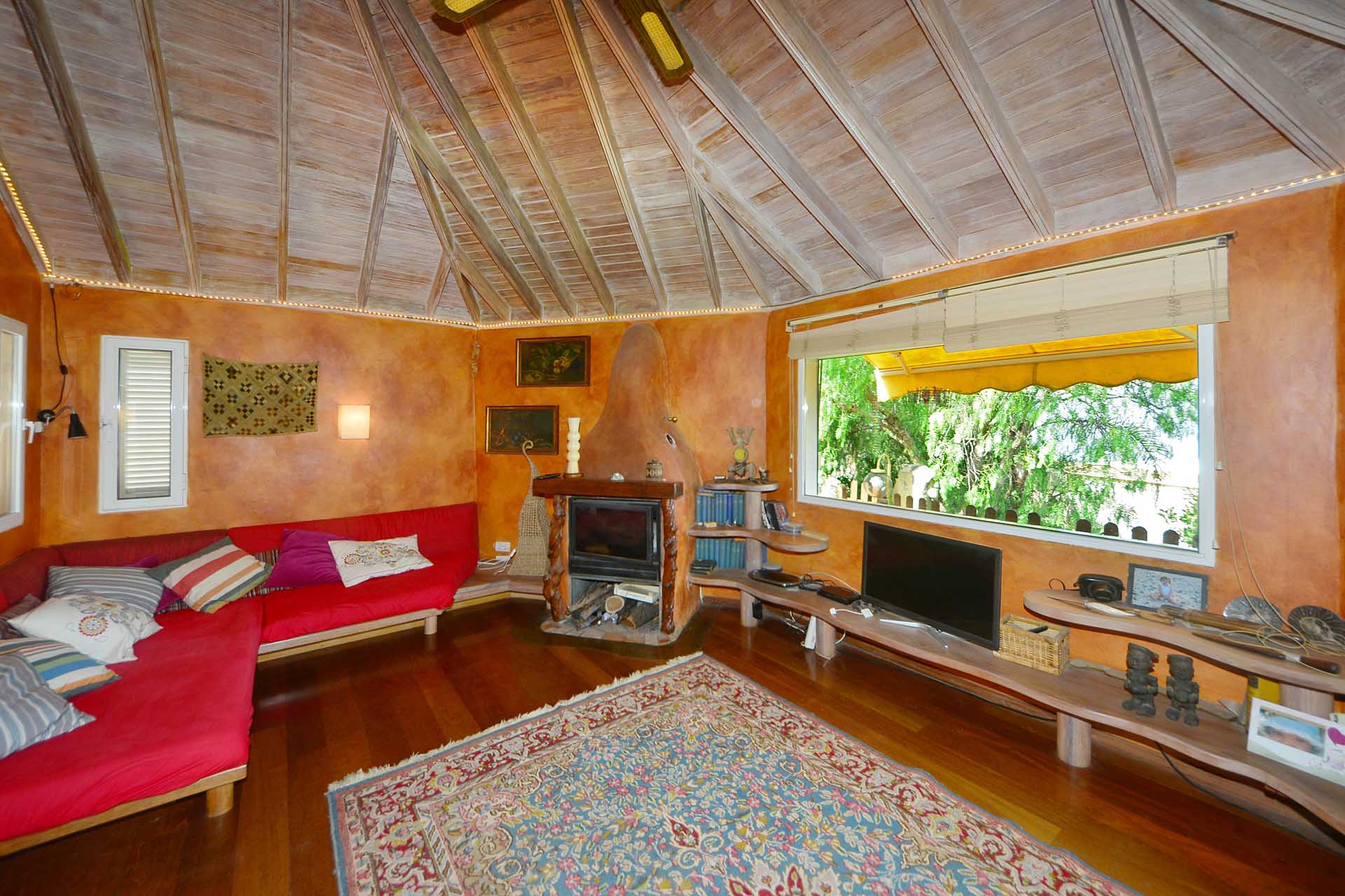 Sie betreten es über eine große, überdachte Terrasse und einen hellen Eingangsbereich, der zu einer Seite als Esszimmer und zur anderen Seite als kleines Büro genutzt wird. An das Esszimmer schließt die gut ausgestattete Küche, die zu einer Seite das große, halbrunde und mit vielen Panoramafenstern versehene Wohnzimmer mit gemütlichem Glastüren-Kamin und zu anderen Seite den Schlaf- und SPA-Bereich erschließt, an. Es folgt das kleinere Schlaf- oder Jugendzimmer mit Hochbett und ein kleines Bad, sowie das Hauptschlafzimmer, das an den teilweise mit Mosaiken sehr schön gestalteten SPA-Bereich anschließt, der mit großer Badewanne, rund gestalteter Dusche und einem kleinen Fitness Bereich mit Sauna gesundheitsbewußten Menschen viel Freude bereiten wird. Vom SPA-Bereich gelangen Sie in einen mit Natursteinplatten belegten Innenhof, der vollständig vor neugierigen Blicken geschützt ist.