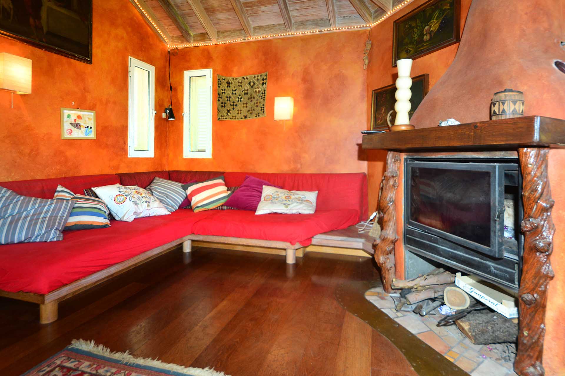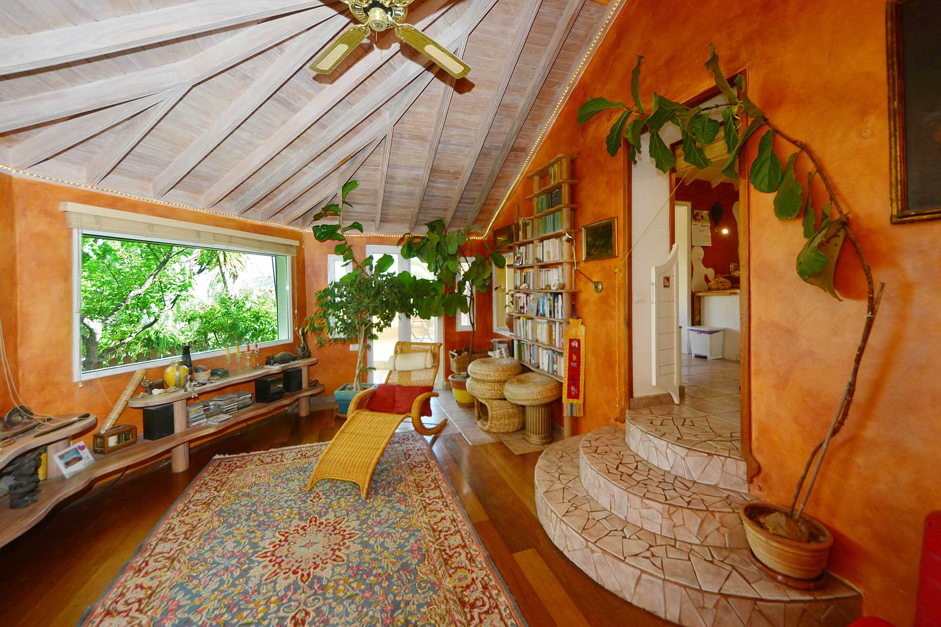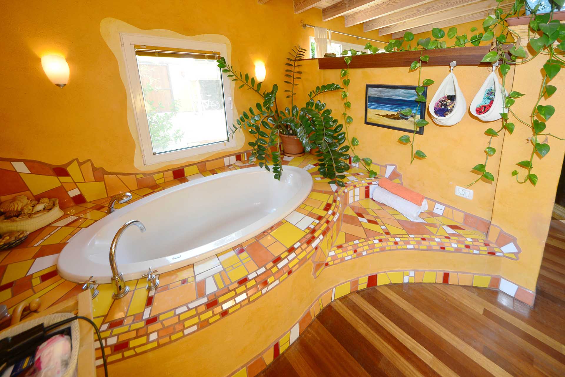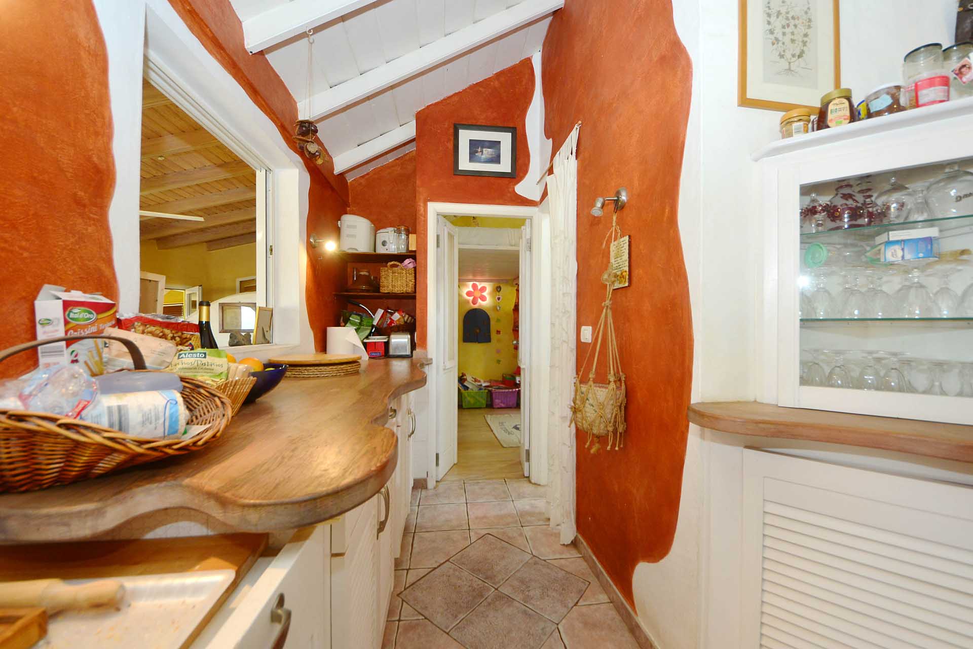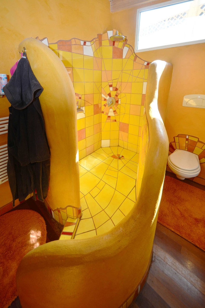 Sie betreten es über eine große, überdachte Terrasse und einen hellen Eingangsbereich, der zu einer Seite als Esszimmer und zur anderen Seite als kleines Büro genutzt wird. An das Esszimmer schließt die gut ausgestattete Küche, die zu einer Seite das große, halbrunde und mit vielen Panoramafenstern versehene Wohnzimmer mit gemütlichem Glastüren-Kamin und zu anderen Seite den Schlaf- und SPA-Bereich erschließt, an. Es folgt das kleinere Schlaf- oder Jugendzimmer mit Hochbett und ein kleines Bad, sowie das Hauptschlafzimmer, das an den teilweise mit Mosaiken sehr schön gestalteten SPA-Bereich anschließt, der mit großer Badewanne, rund gestalteter Dusche und einem kleinen Fitness Bereich mit Sauna gesundheitsbewußten Menschen viel Freude bereiten wird. Vom SPA-Bereich gelangen Sie in einen mit Natursteinplatten belegten Innenhof, der vollständig vor neugierigen Blicken geschützt ist.