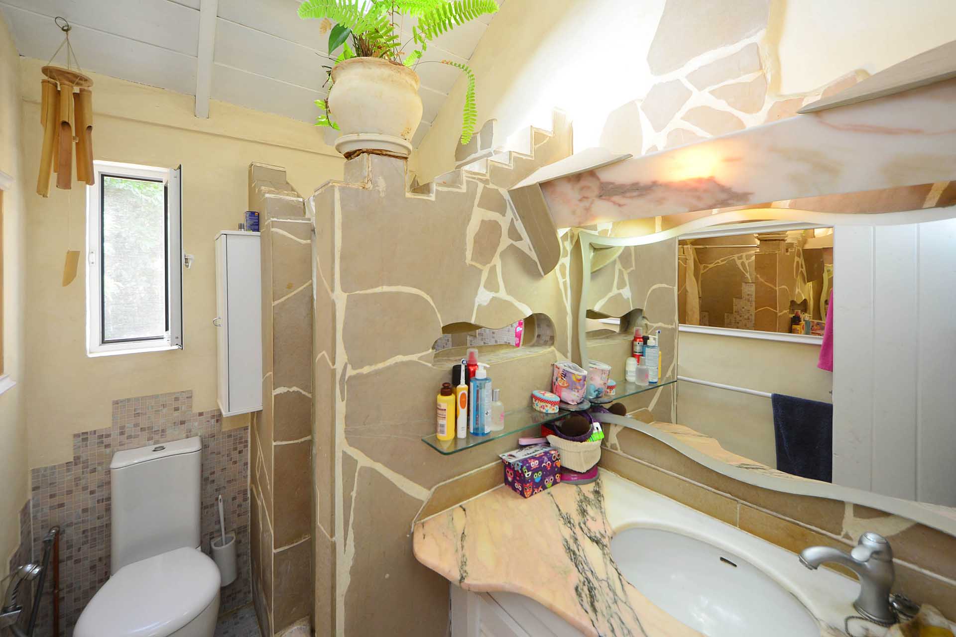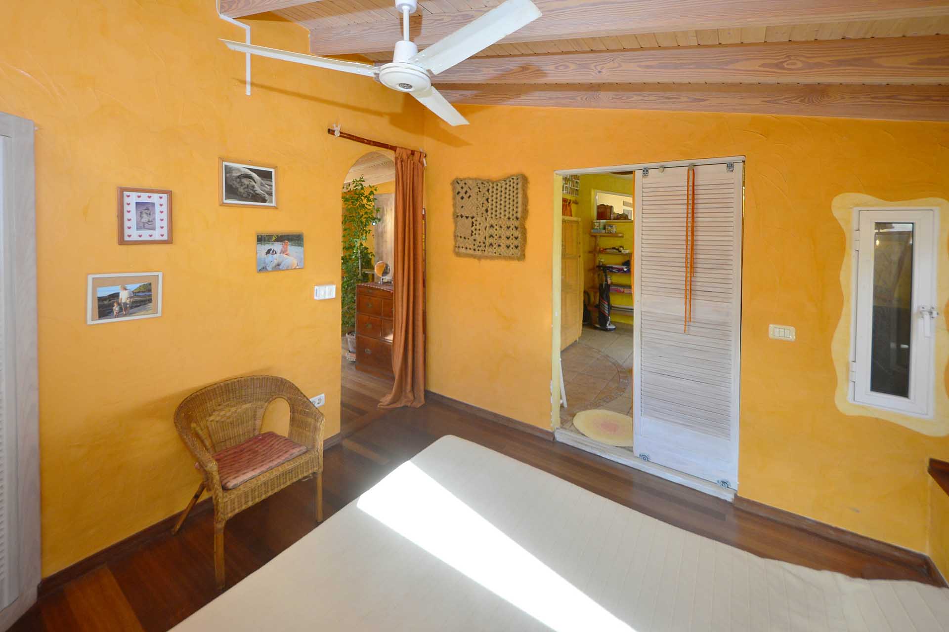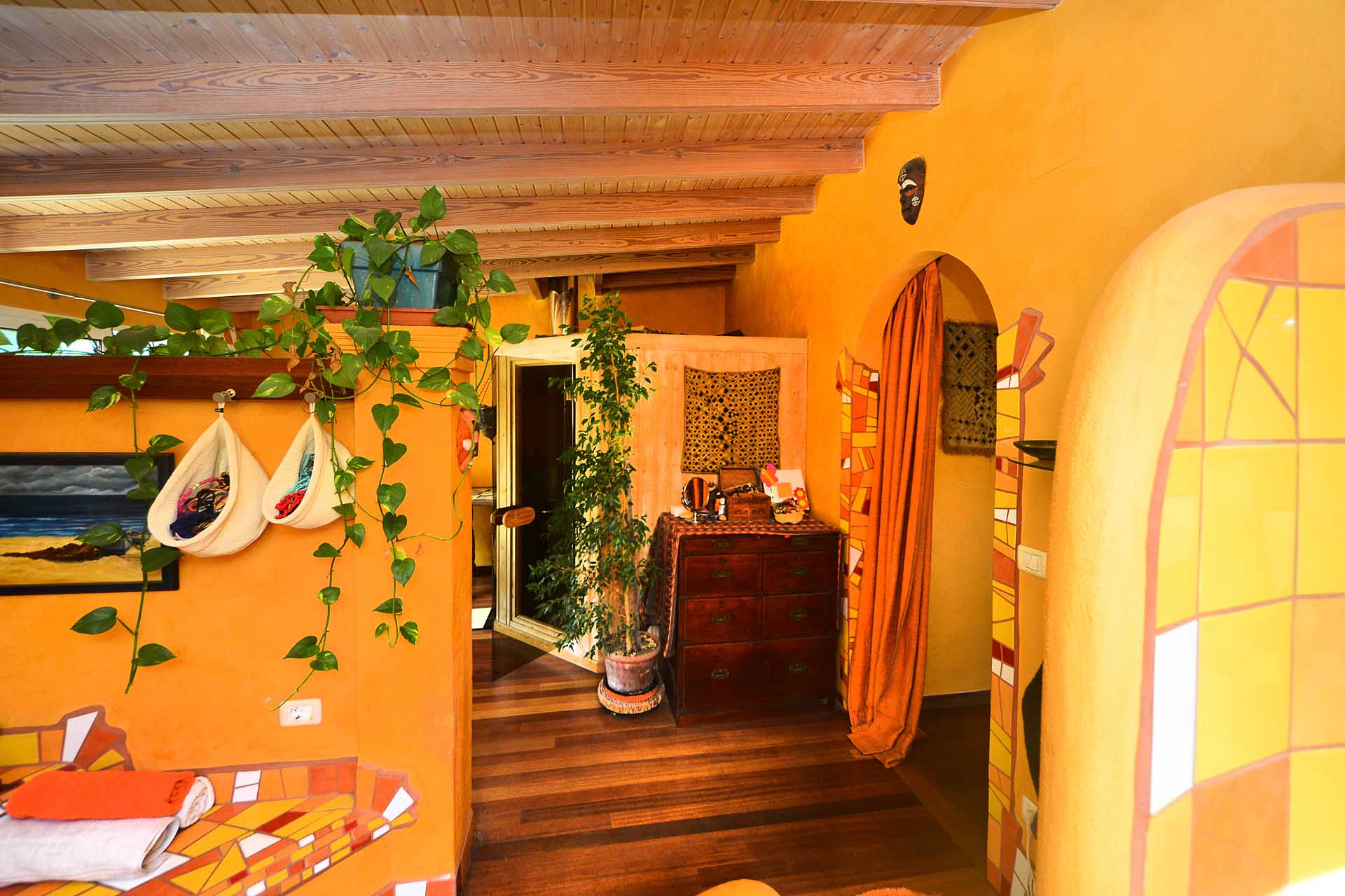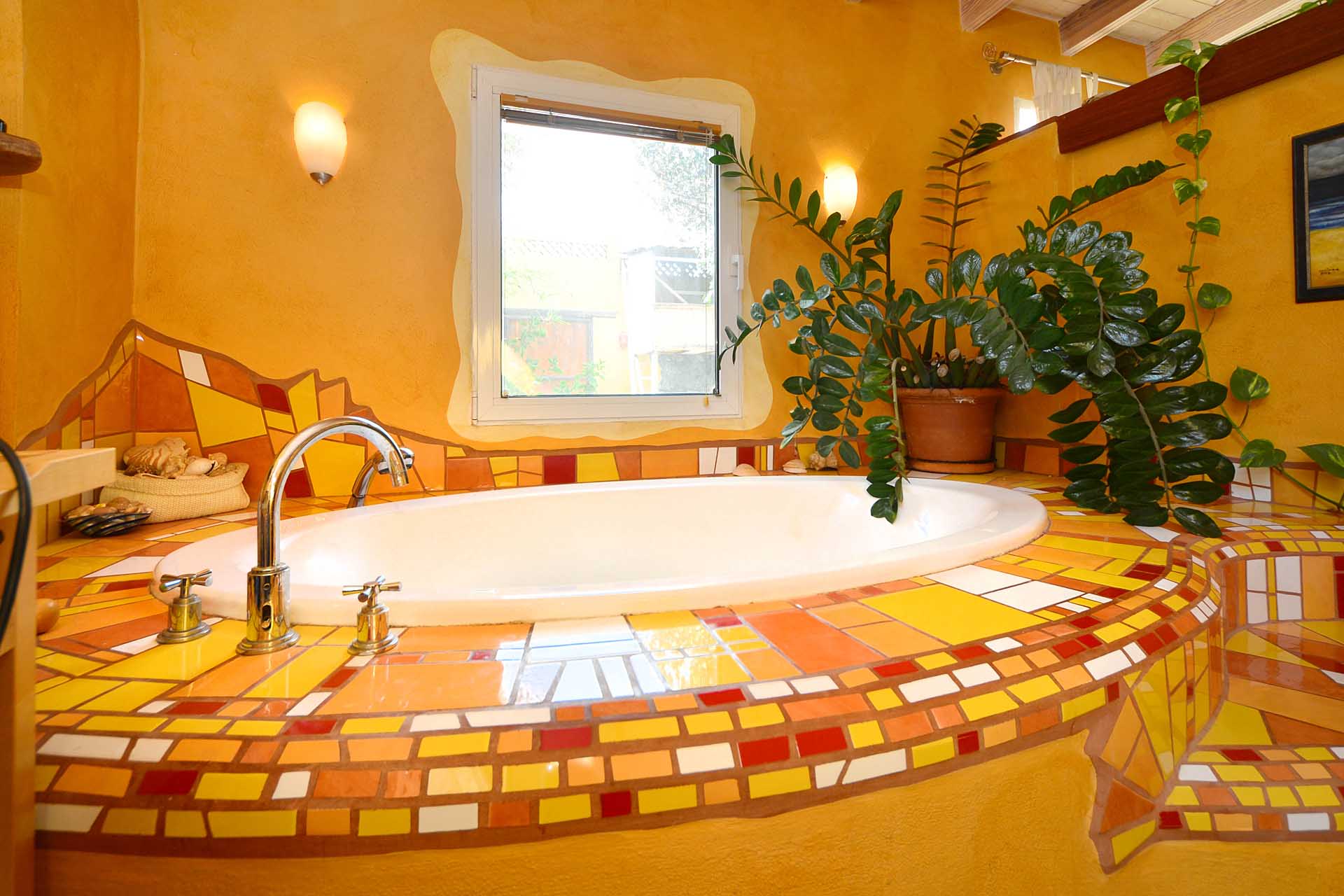 Sie betreten es über eine große, überdachte Terrasse und einen hellen Eingangsbereich, der zu einer Seite als Esszimmer und zur anderen Seite als kleines Büro genutzt wird. An das Esszimmer schließt die gut ausgestattete Küche, die zu einer Seite das große, halbrunde und mit vielen Panoramafenstern versehene Wohnzimmer mit gemütlichem Glastüren-Kamin und zu anderen Seite den Schlaf- und SPA-Bereich erschließt, an. Es folgt das kleinere Schlaf- oder Jugendzimmer mit Hochbett und ein kleines Bad, sowie das Hauptschlafzimmer, das an den teilweise mit Mosaiken sehr schön gestalteten SPA-Bereich anschließt, der mit großer Badewanne, rund gestalteter Dusche und einem kleinen Fitness Bereich mit Sauna gesundheitsbewußten Menschen viel Freude bereiten wird. Vom SPA-Bereich gelangen Sie in einen mit Natursteinplatten belegten Innenhof, der vollständig vor neugierigen Blicken geschützt ist.