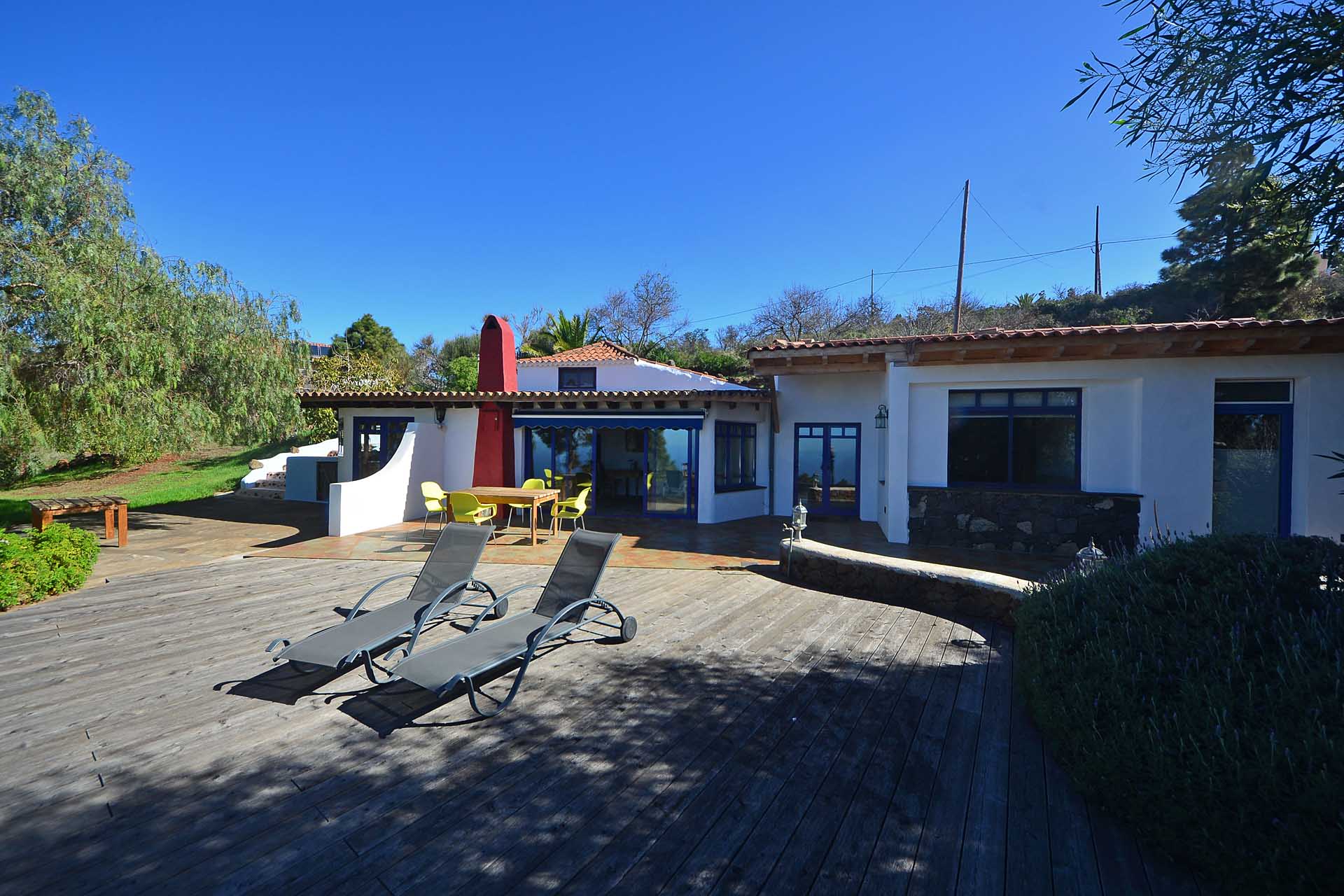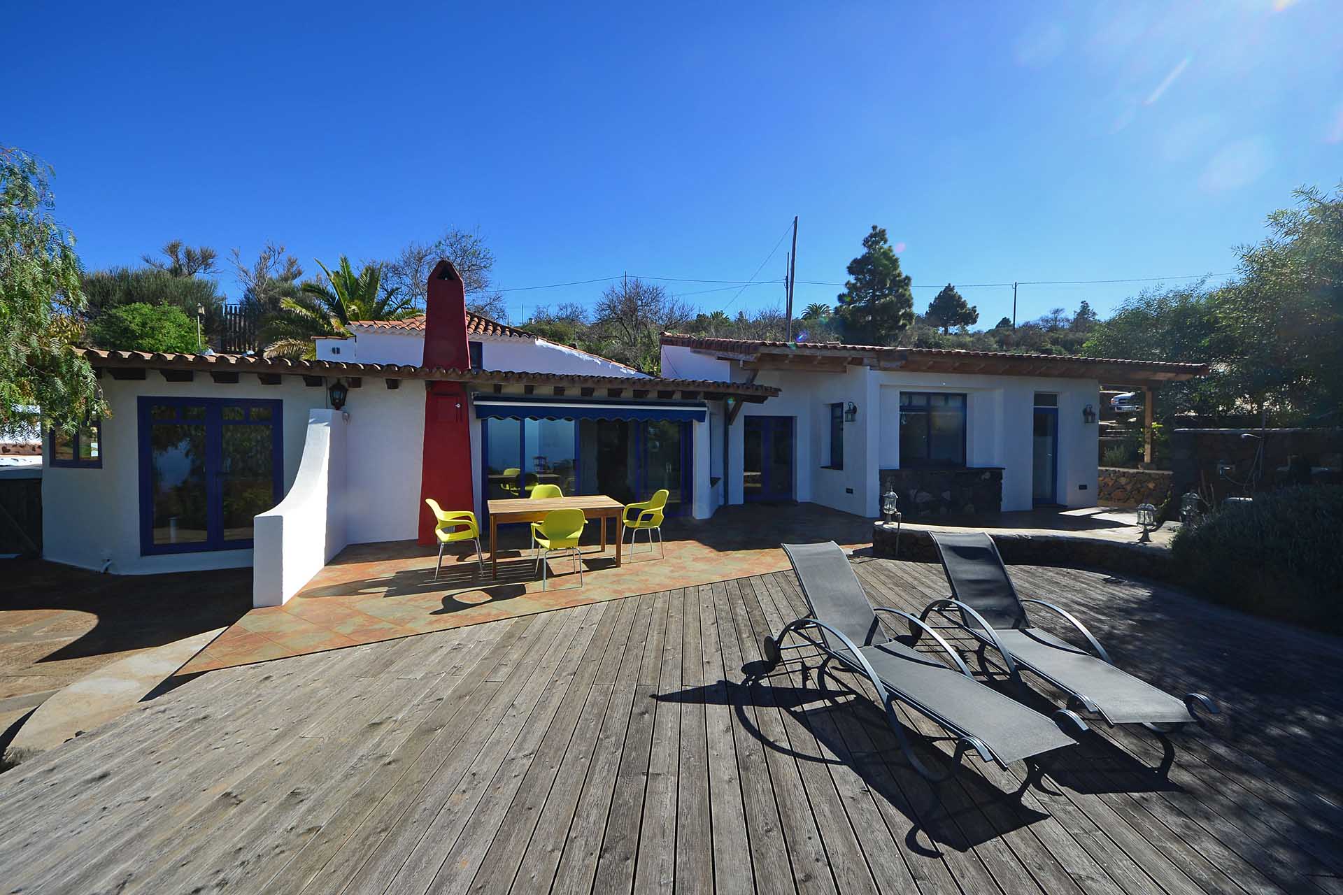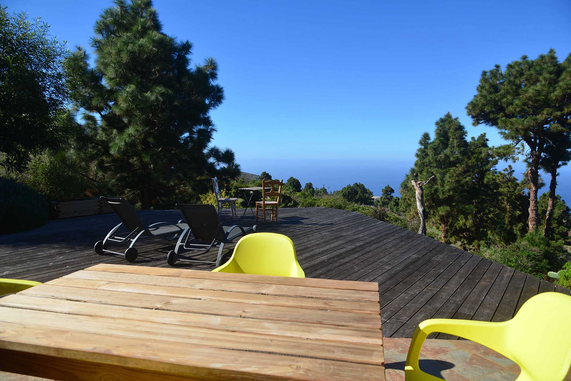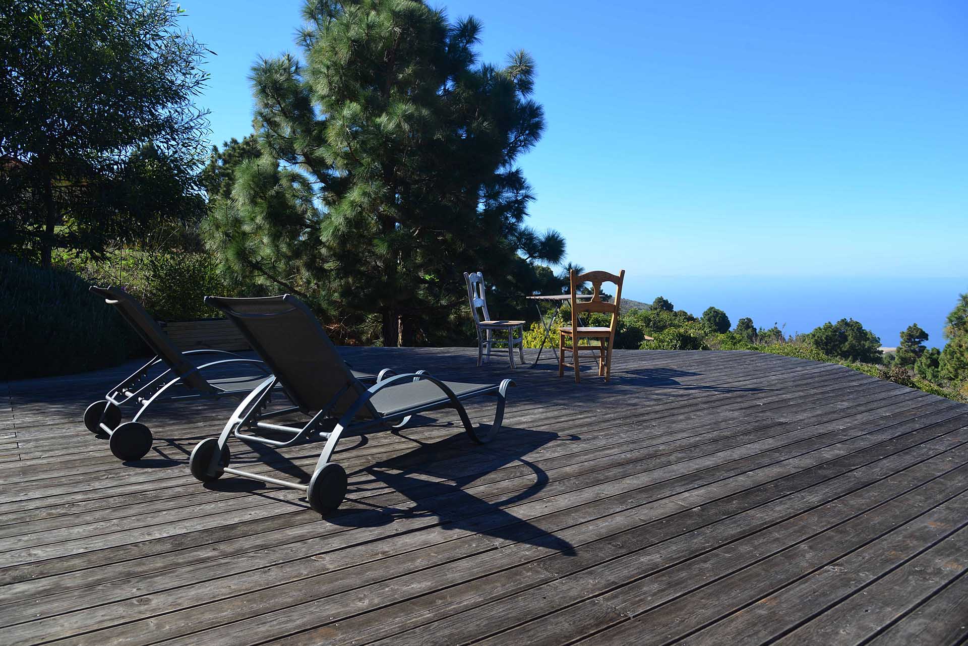 Eine sehr großzügiges Holzdeck vor dem Wohnbereich bietet Platz für Liegen und Tische und einen fantastischen Ausblick auf den Atlantik und den „Mato“ (Hausberg von Puntagorda).