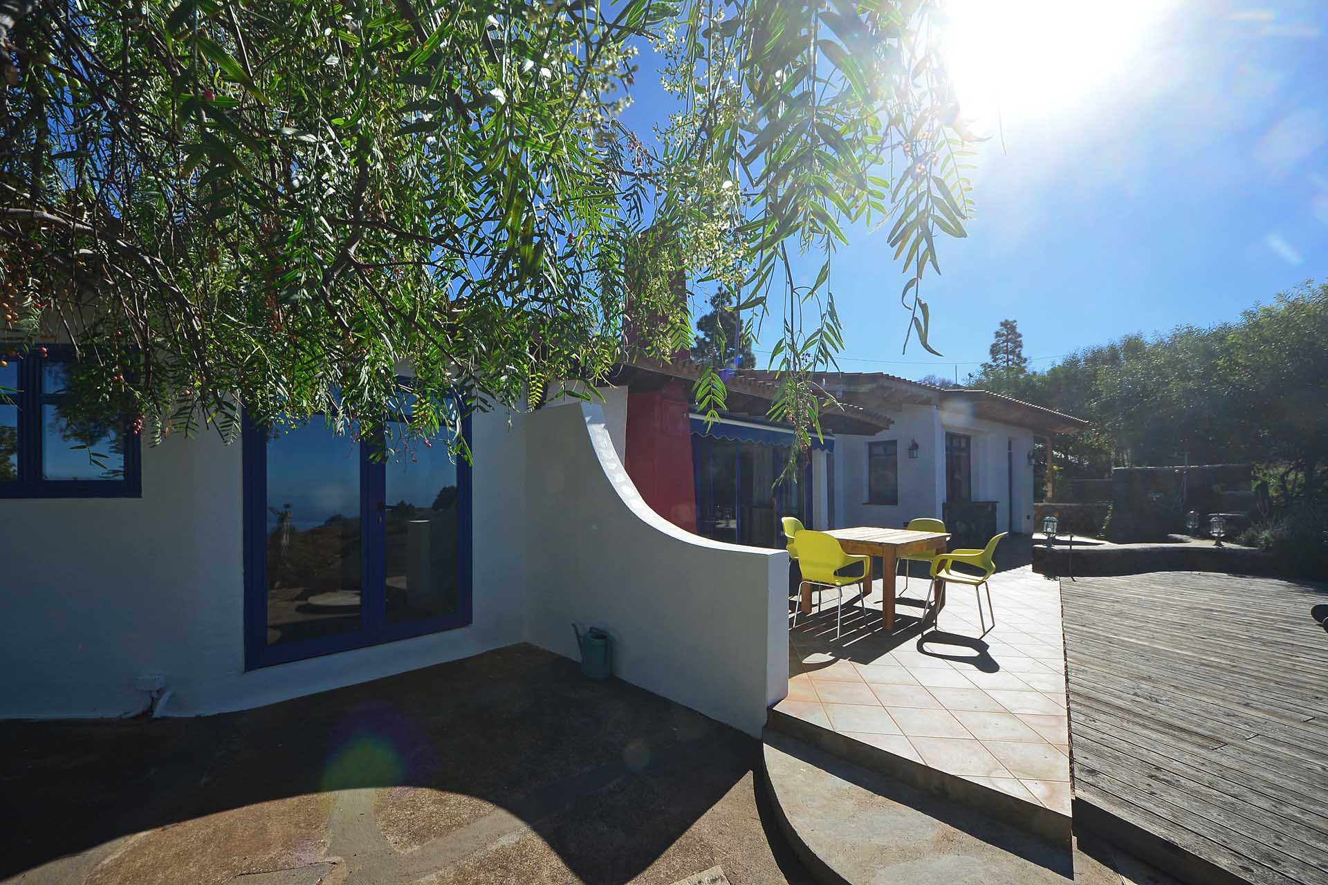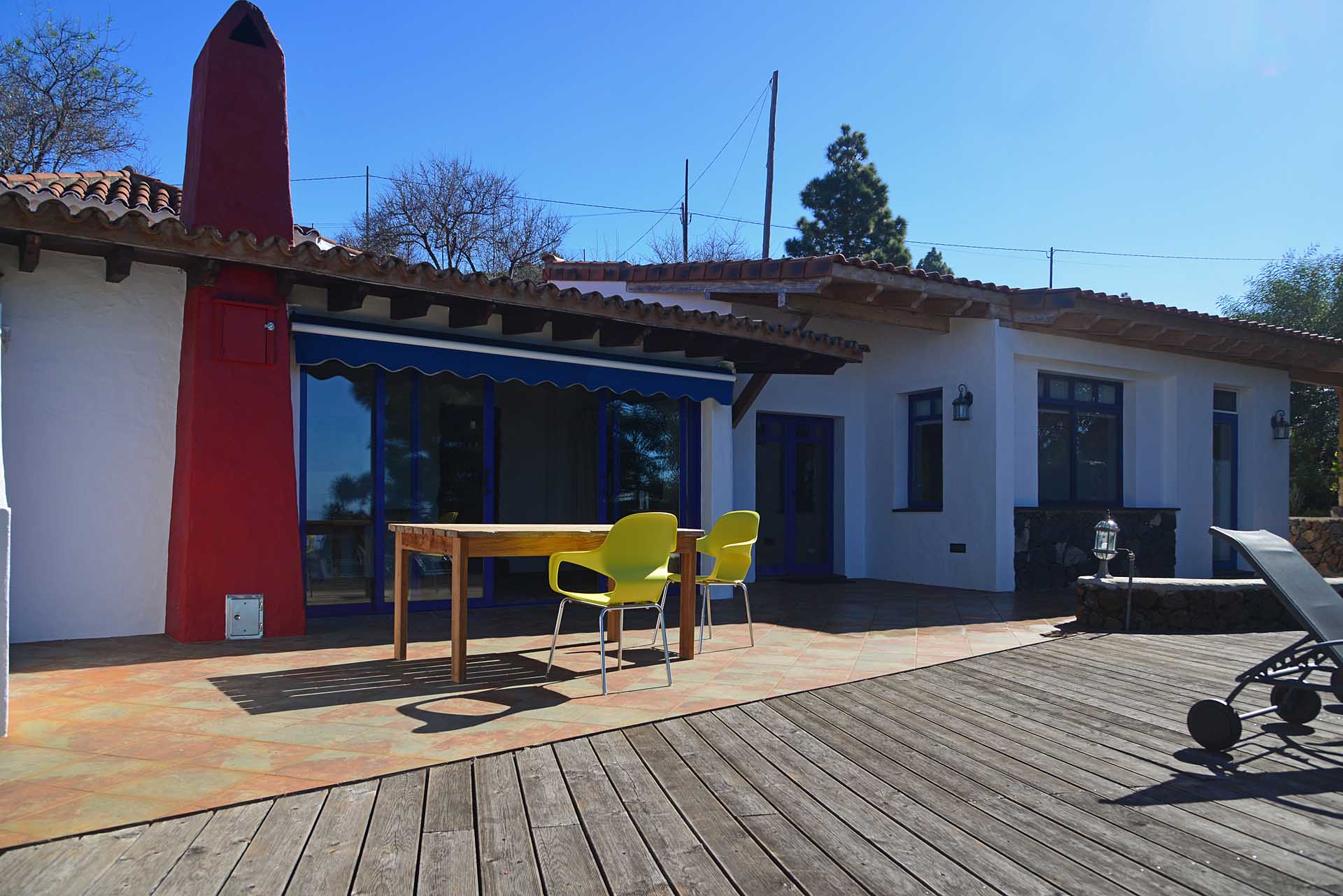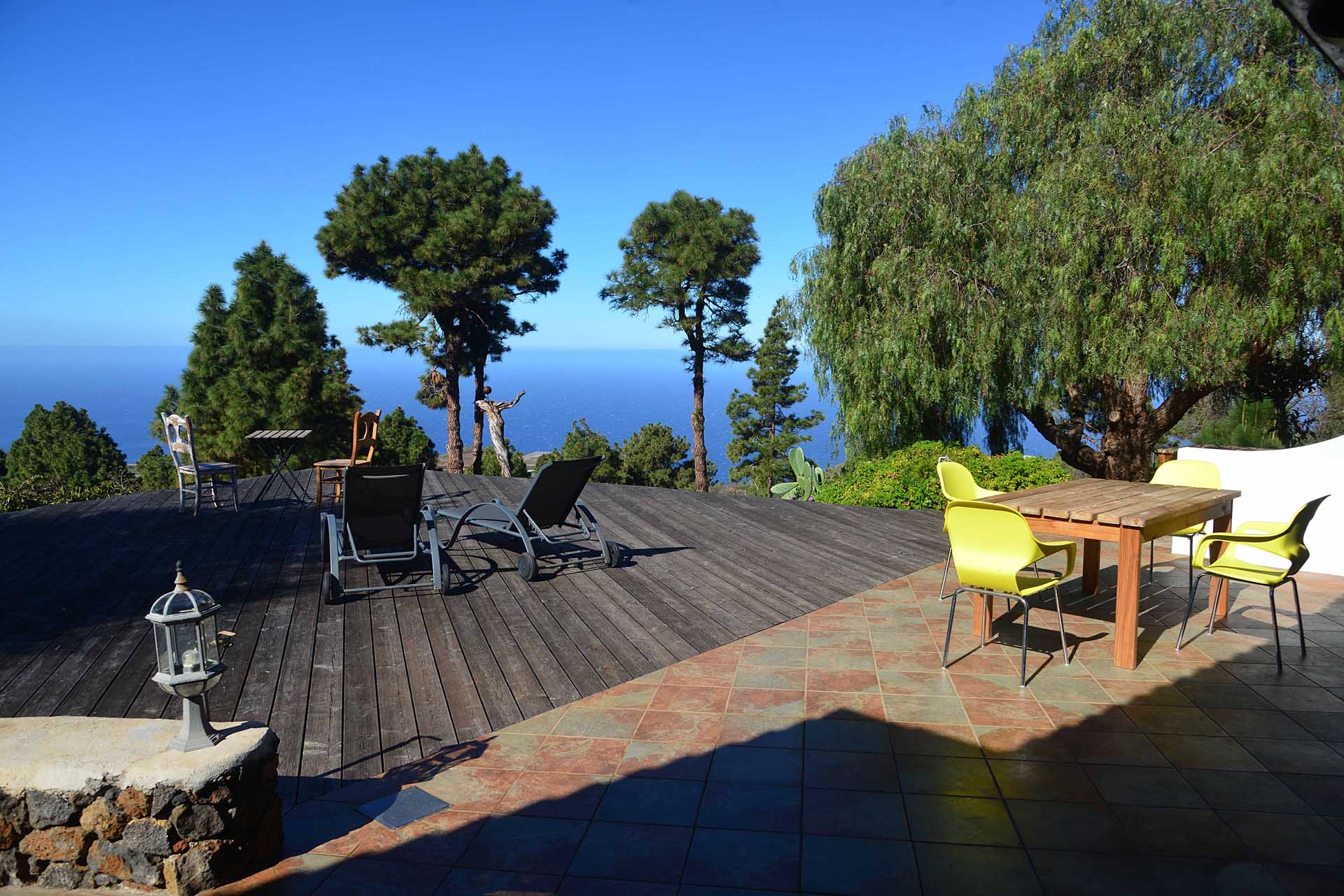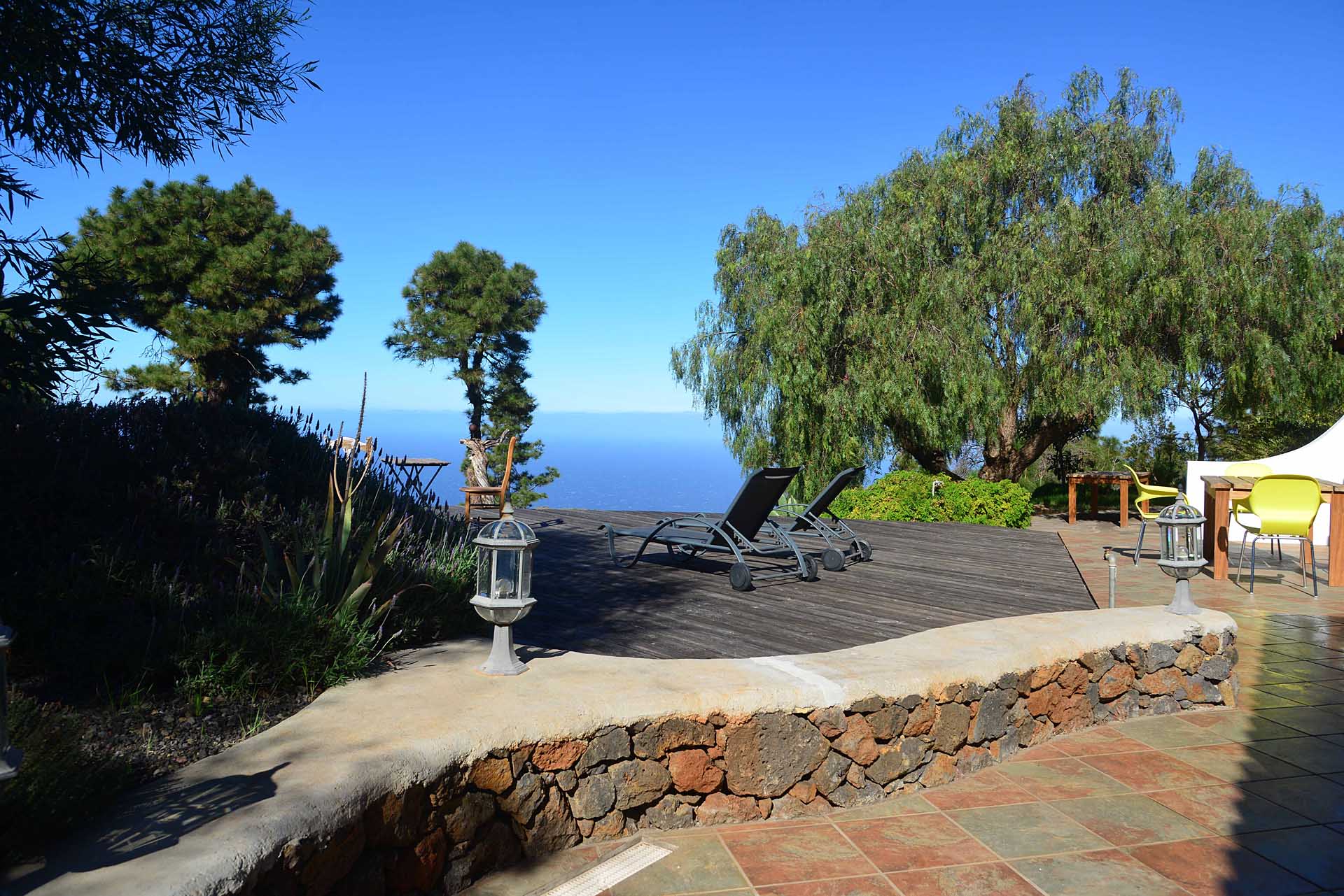 Eine sehr großzügiges Holzdeck vor dem Wohnbereich bietet Platz für Liegen und Tische und einen fantastischen Ausblick auf den Atlantik und den „Mato“ (Hausberg von Puntagorda).