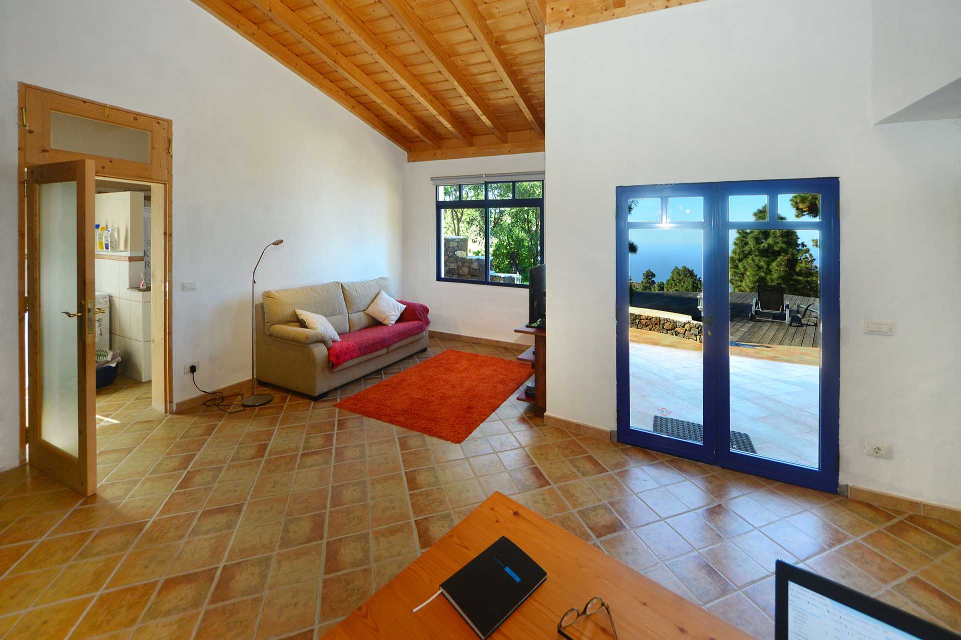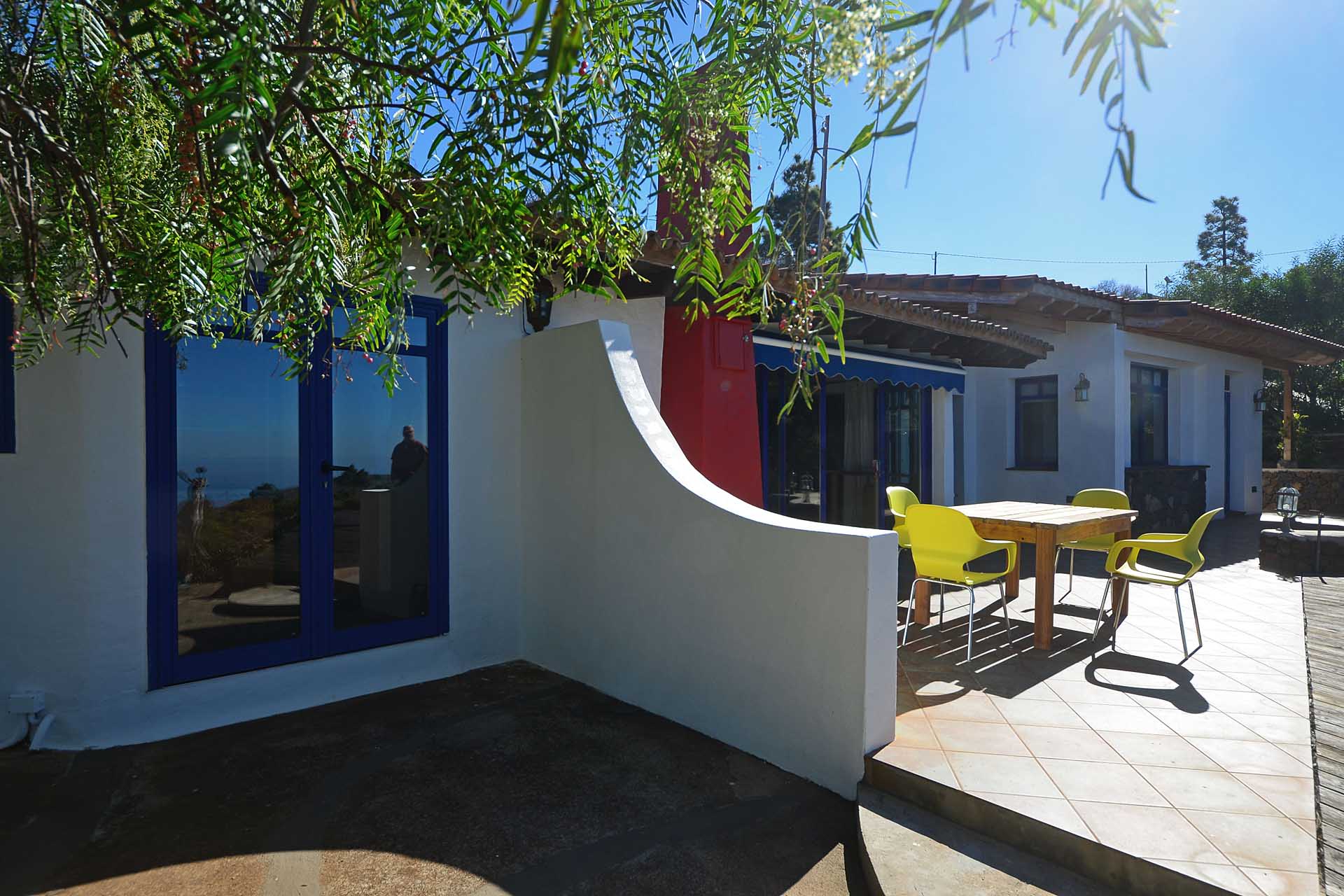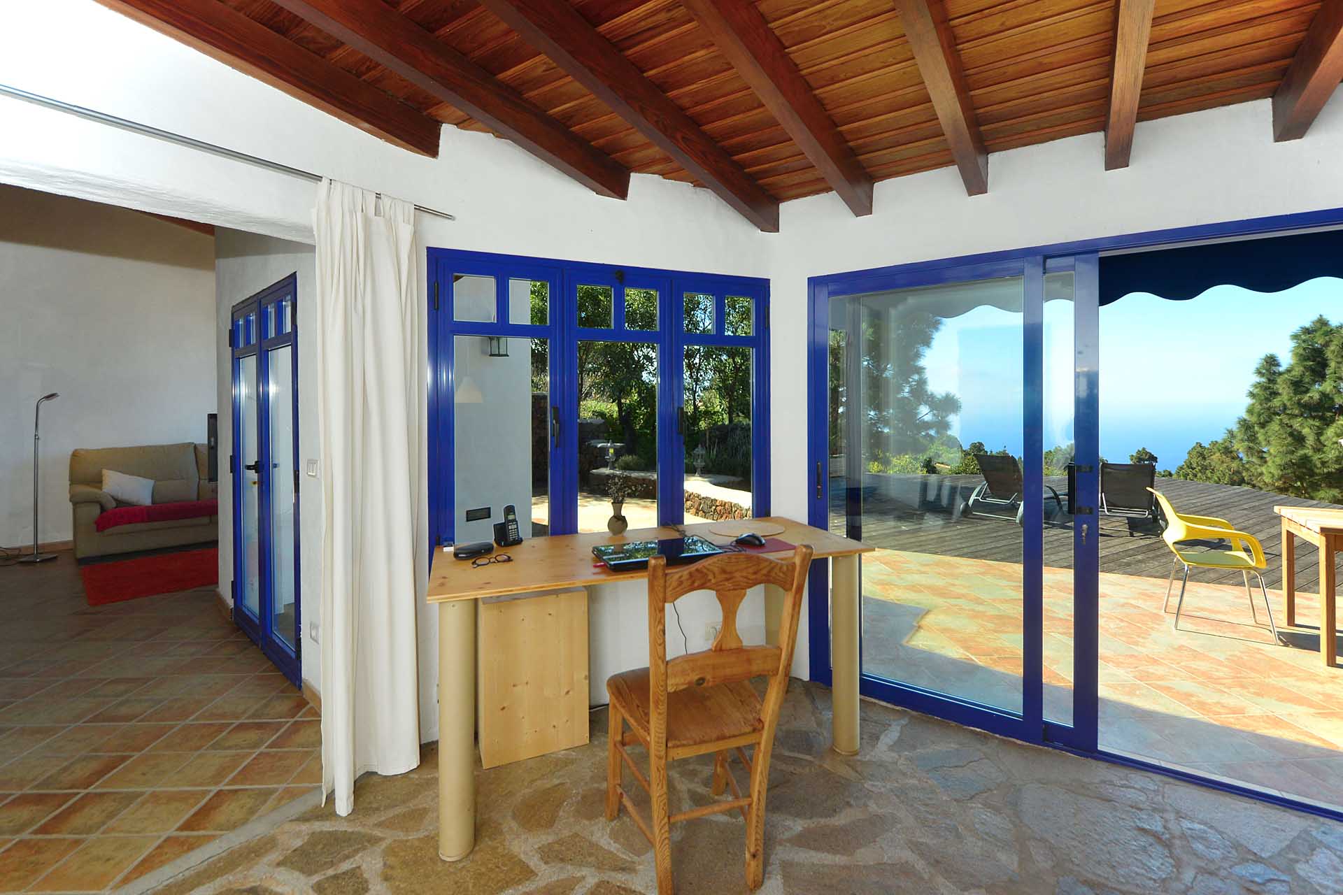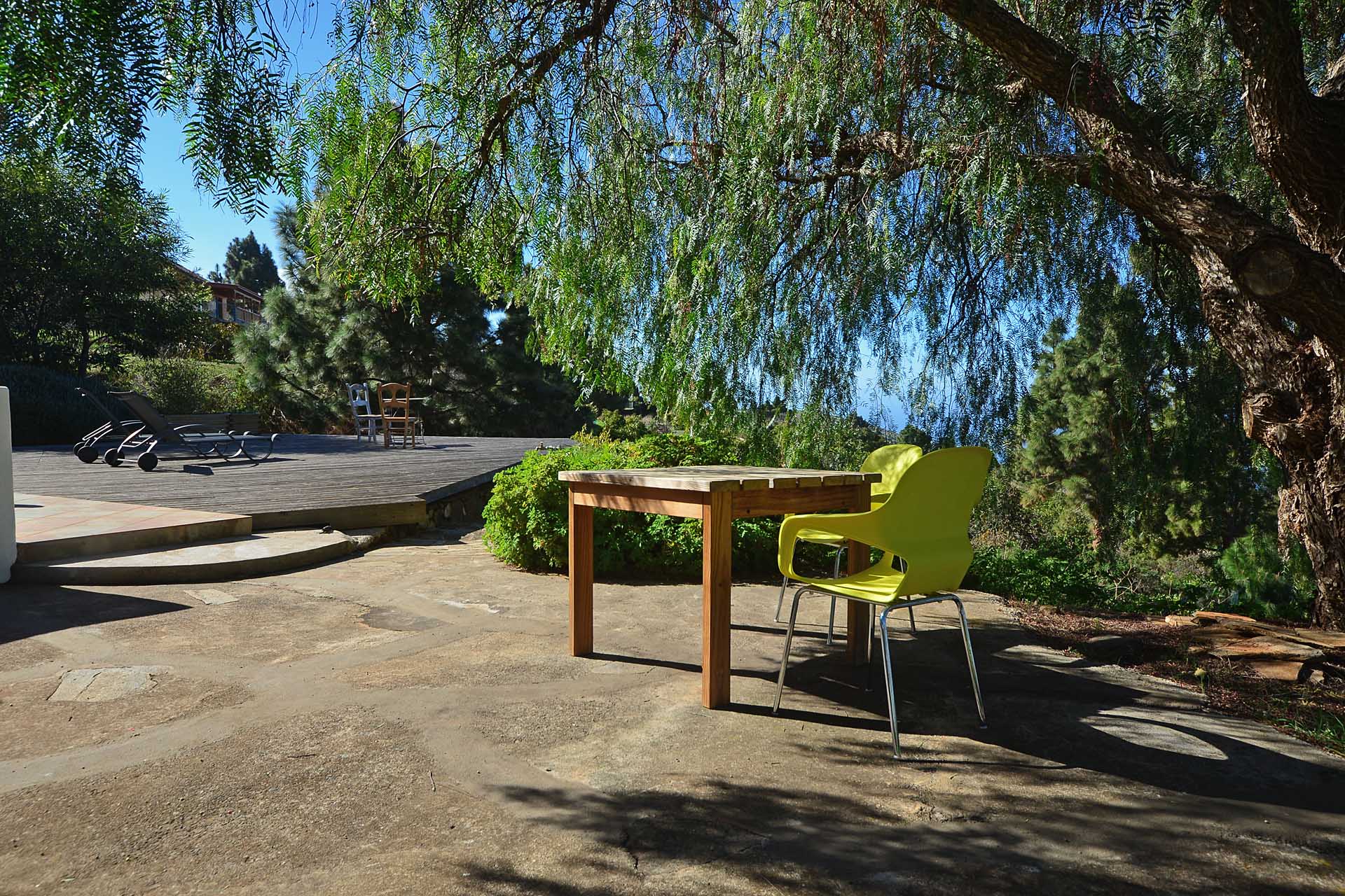 Eine sehr großzügiges Holzdeck vor dem Wohnbereich bietet Platz für Liegen und Tische und einen fantastischen Ausblick auf den Atlantik und den „Mato“ (Hausberg von Puntagorda).