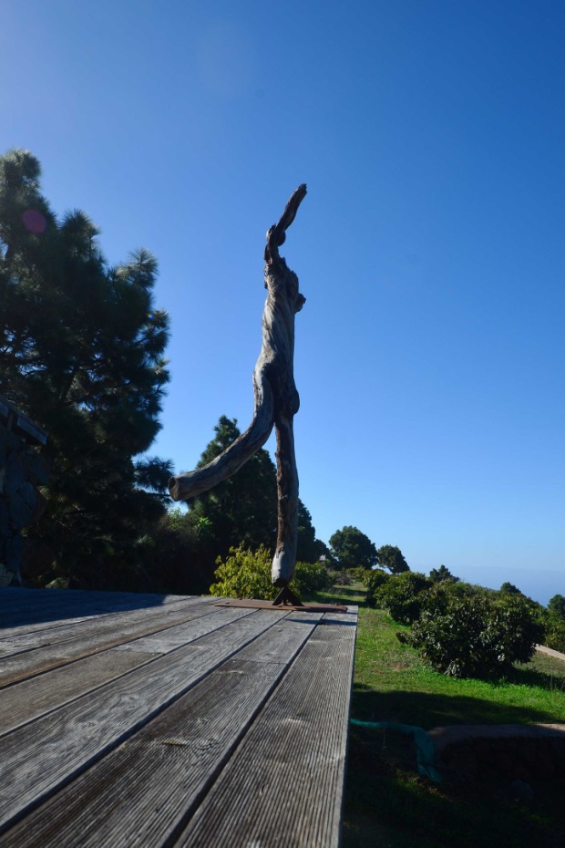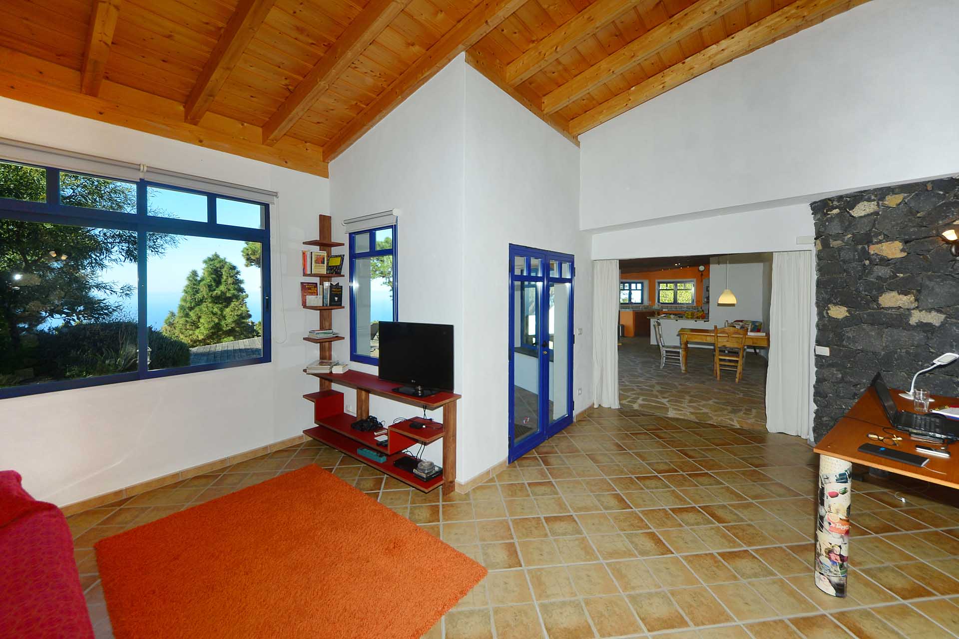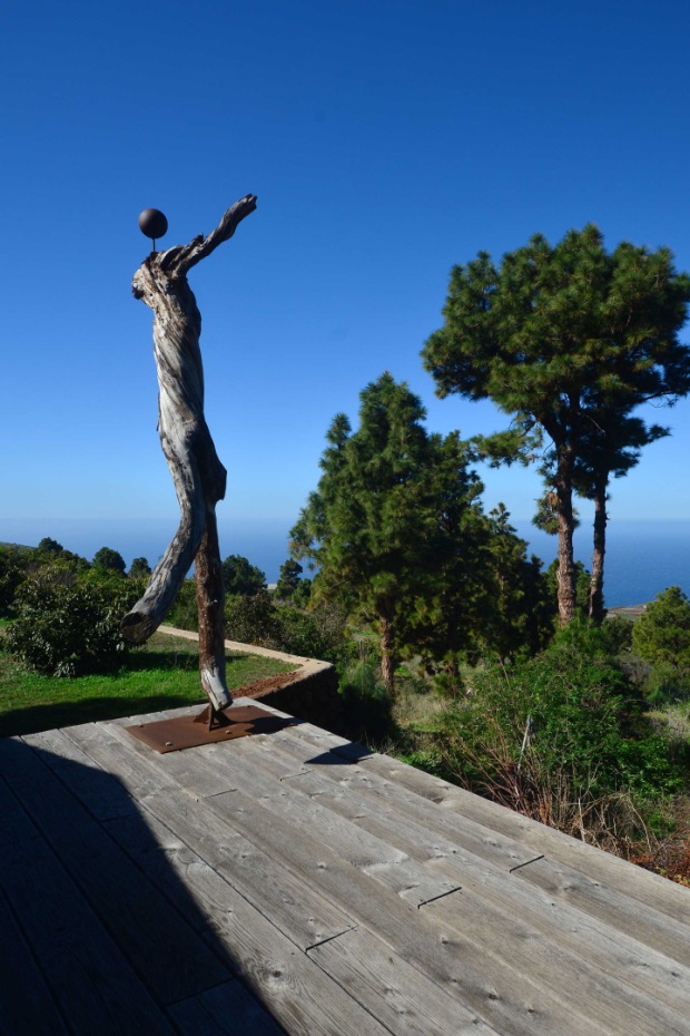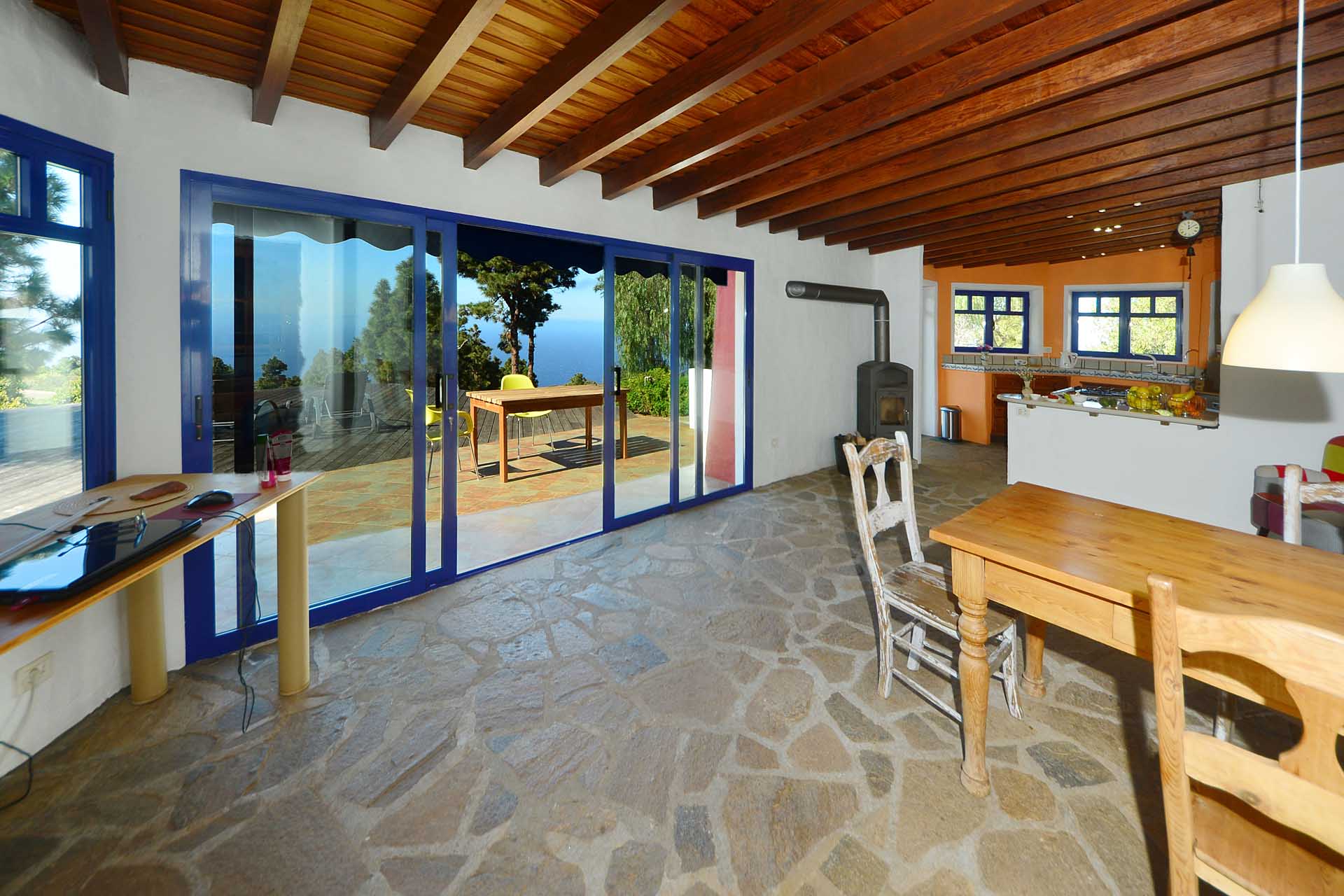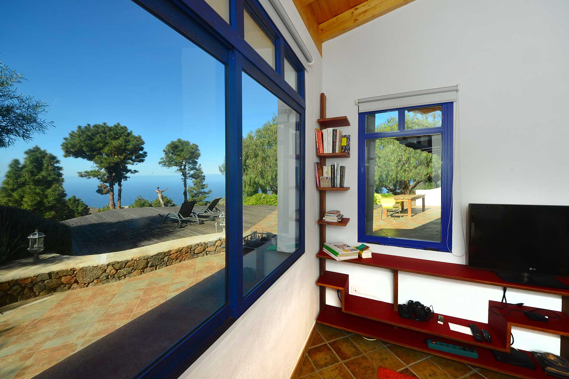 Eine sehr großzügiges Holzdeck vor dem Wohnbereich bietet Platz für Liegen und Tische und einen fantastischen Ausblick auf den Atlantik und den „Mato“ (Hausberg von Puntagorda).