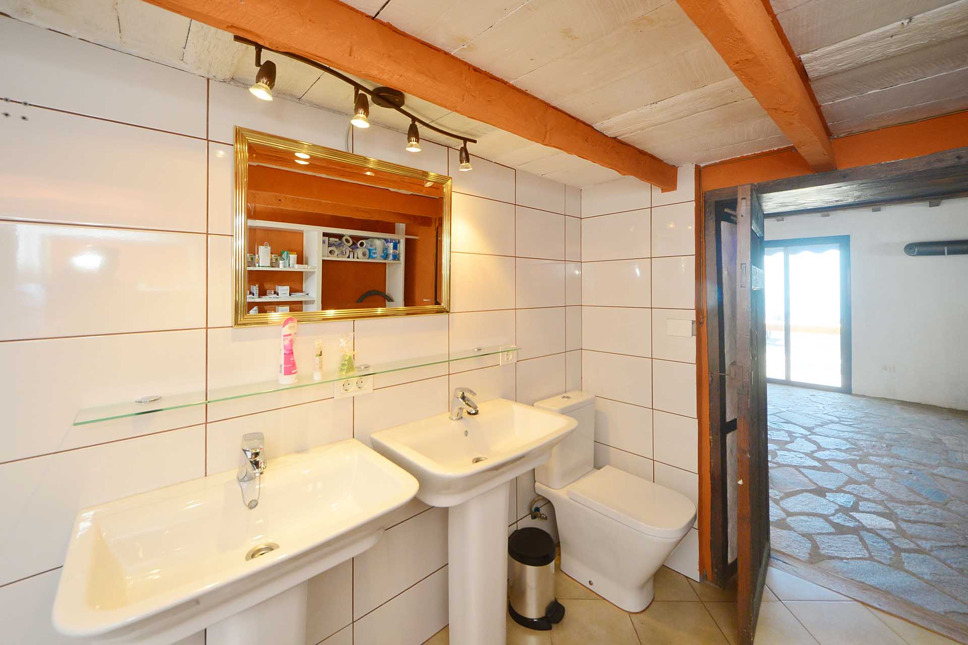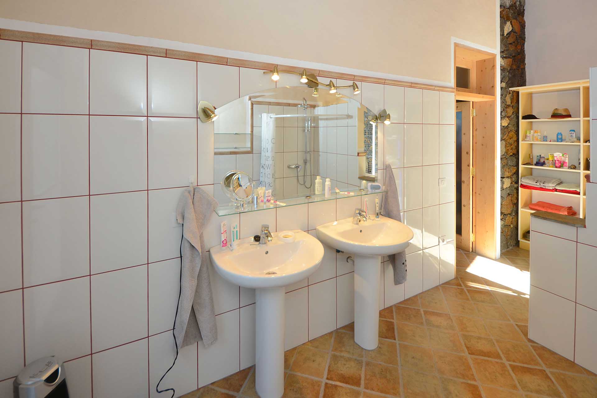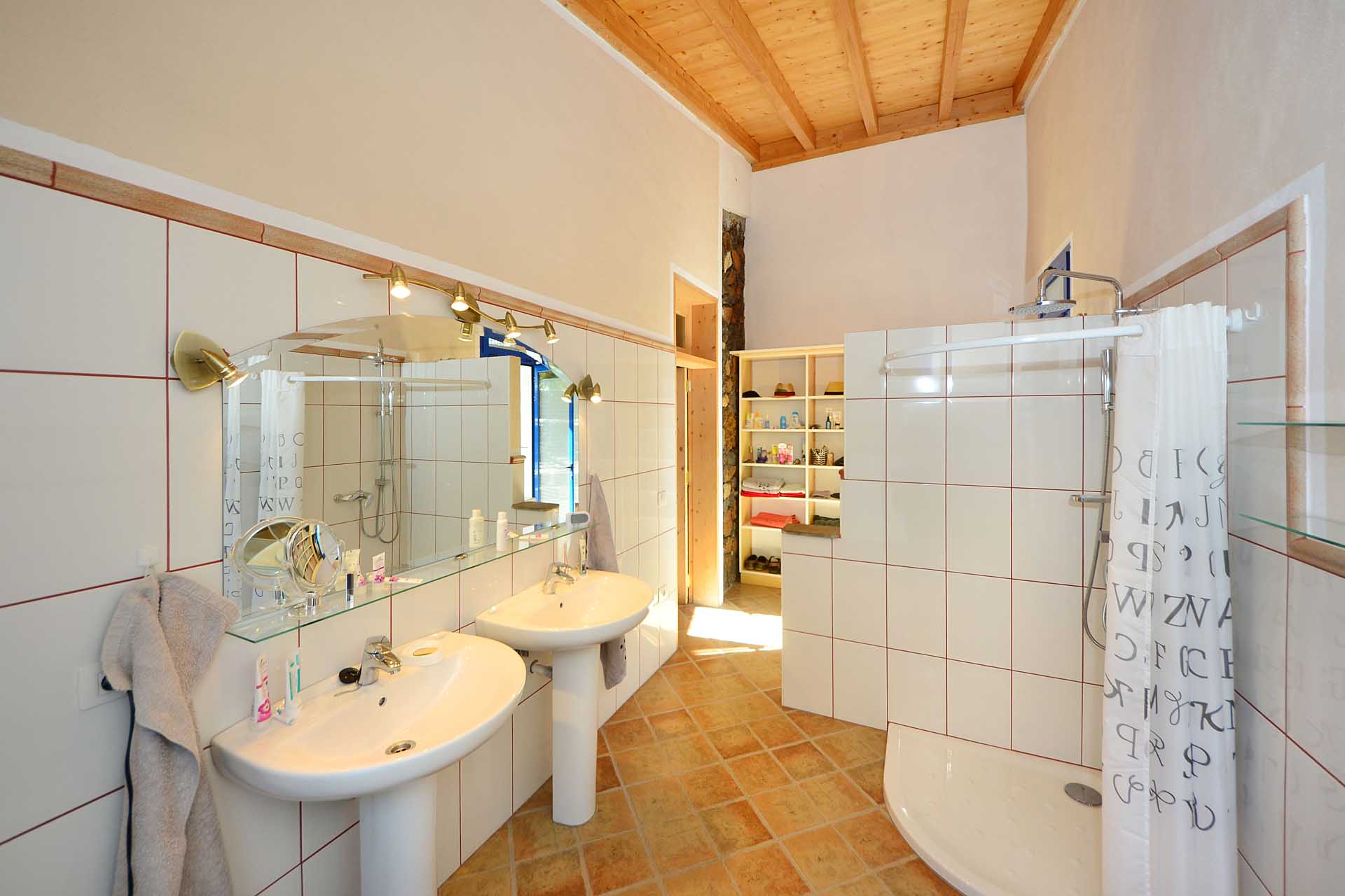 Zwei Schlafzimmer auf unterschiedlichen Ebenen (von denen eines derzeit als Ankleide genutzt wird) wurden in dem authentisch renovierten Altbau, der das Herz der ehemaligen Mandelfinca bildete, untergebracht. Durch die Flächenqualifizierung als „ländliches Siedlungsgebiet“ darf die bestehende Bausubstanz bis zu einer Gesamtfläche von 219 m² erweitert werden.