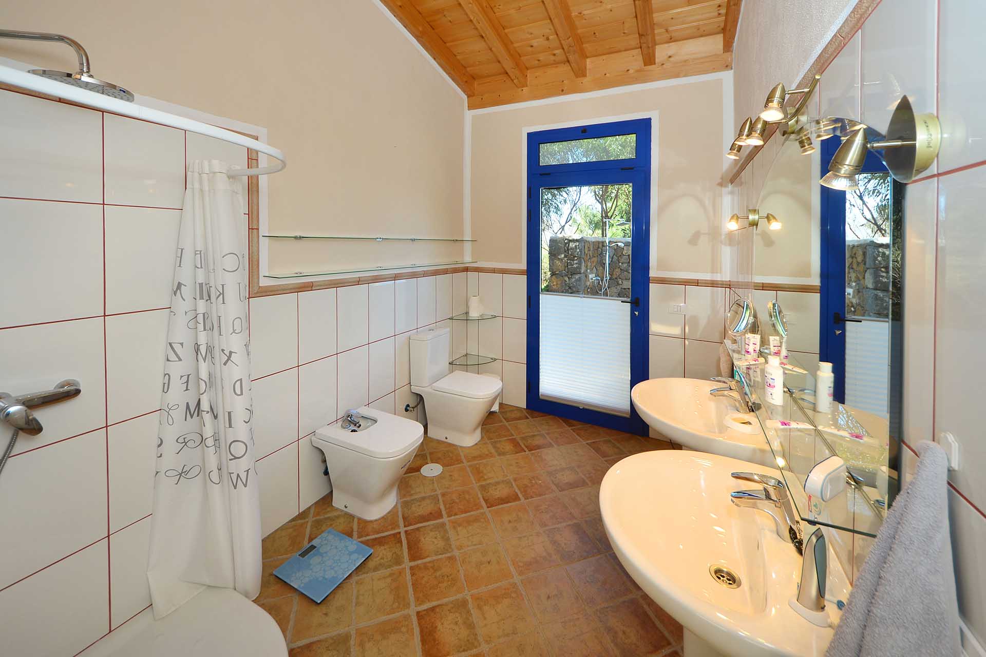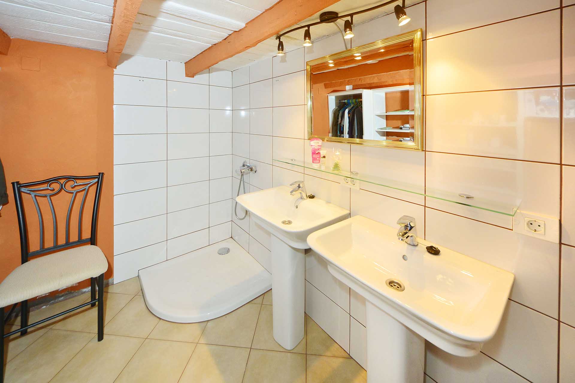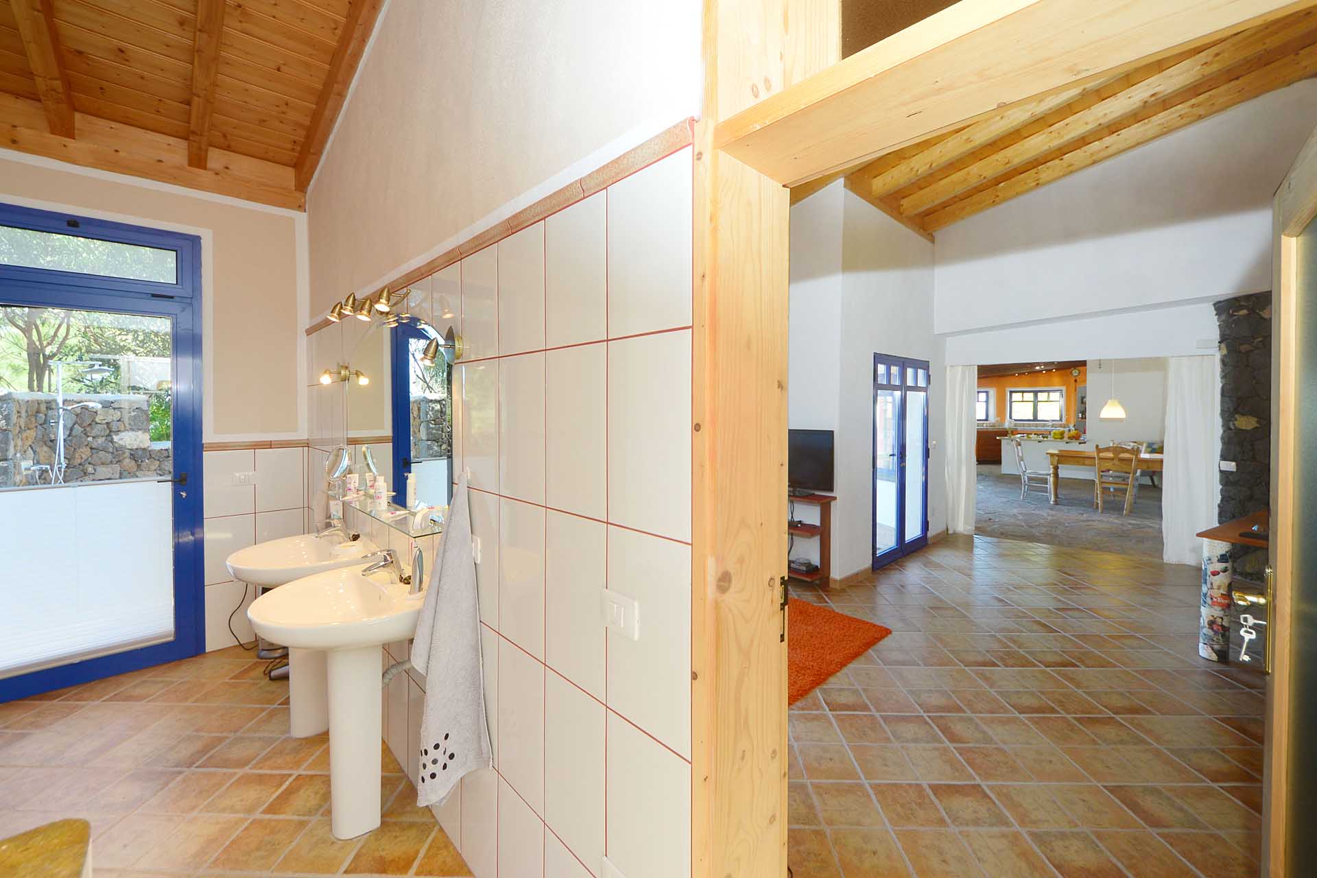Zwei Schlafzimmer auf unterschiedlichen Ebenen (von denen eines derzeit als Ankleide genutzt wird) wurden in dem authentisch renovierten Altbau, der das Herz der ehemaligen Mandelfinca bildete, untergebracht. Durch die Flächenqualifizierung als „ländliches Siedlungsgebiet“ darf die bestehende Bausubstanz bis zu einer Gesamtfläche von 219 m² erweitert werden.