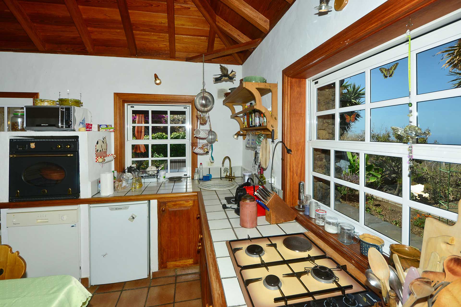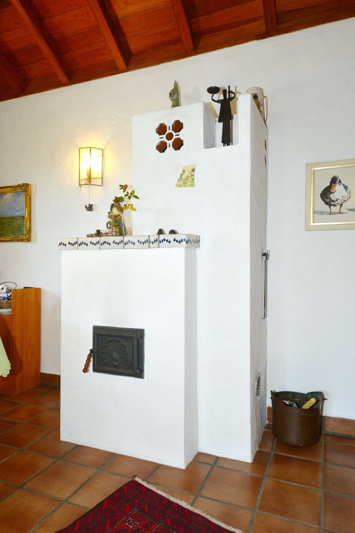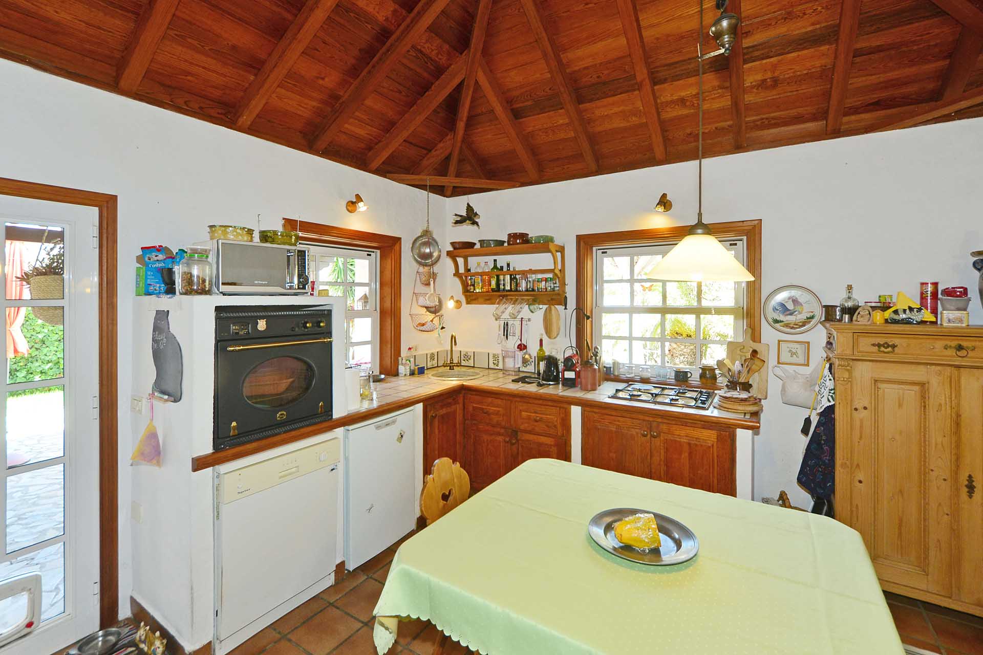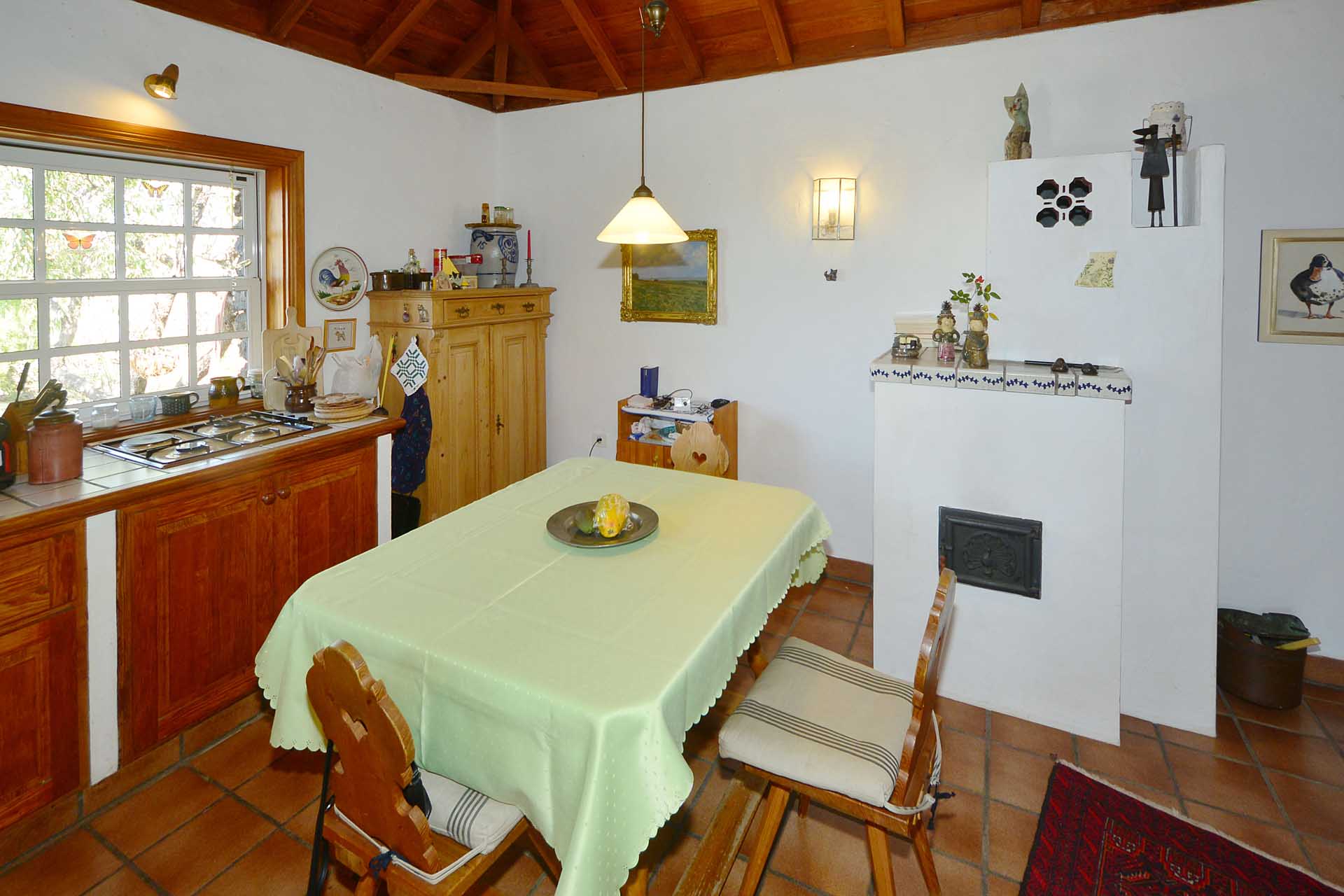 Sie betreten das Haus über eine überdachte Terrasse und gelangen, wie hier üblich, in den Kochbereich der großen Wohnküche. So ist der Weg mit der Kaffeetasse oder dem Mittagessen auf die herrlich schattige oder sonnige Terrasse (je nachdem, wonach Ihnen gerade ist) besonders kurz. Die Wohnküche strahlt kanarische Gemütlichkeit aus und sie wurde für die wenigen Tage, an denen man vielleicht eine Heizung braucht mit einem Grundofen eines deutschen Ofenbauers ausgestattet. Dieser braucht nur ein Mal am Tag mit etwas Holz beschickt zu werden und heizt das gesamte Haus.