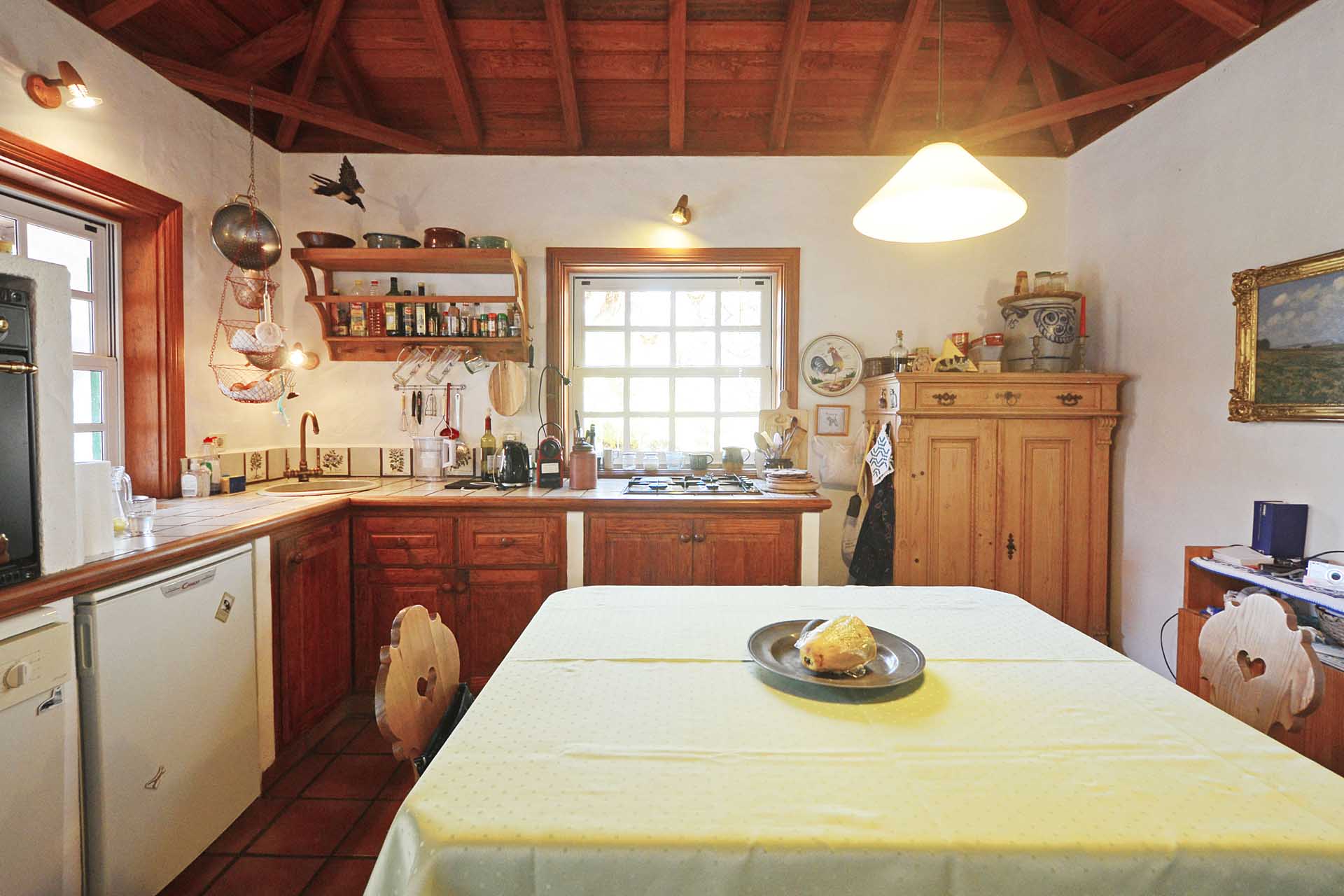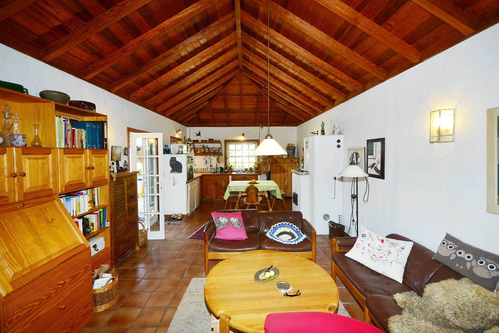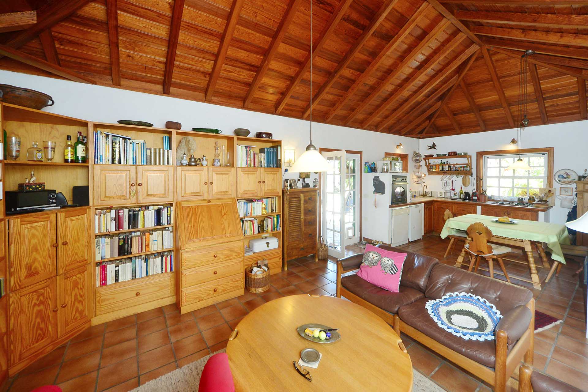 Sie betreten das Haus über eine überdachte Terrasse und gelangen, wie hier üblich, in den Kochbereich der großen Wohnküche. So ist der Weg mit der Kaffeetasse oder dem Mittagessen auf die herrlich schattige oder sonnige Terrasse (je nachdem, wonach Ihnen gerade ist) besonders kurz. Die Wohnküche strahlt kanarische Gemütlichkeit aus und sie wurde für die wenigen Tage, an denen man vielleicht eine Heizung braucht mit einem Grundofen eines deutschen Ofenbauers ausgestattet. Dieser braucht nur ein Mal am Tag mit etwas Holz beschickt zu werden und heizt das gesamte Haus.