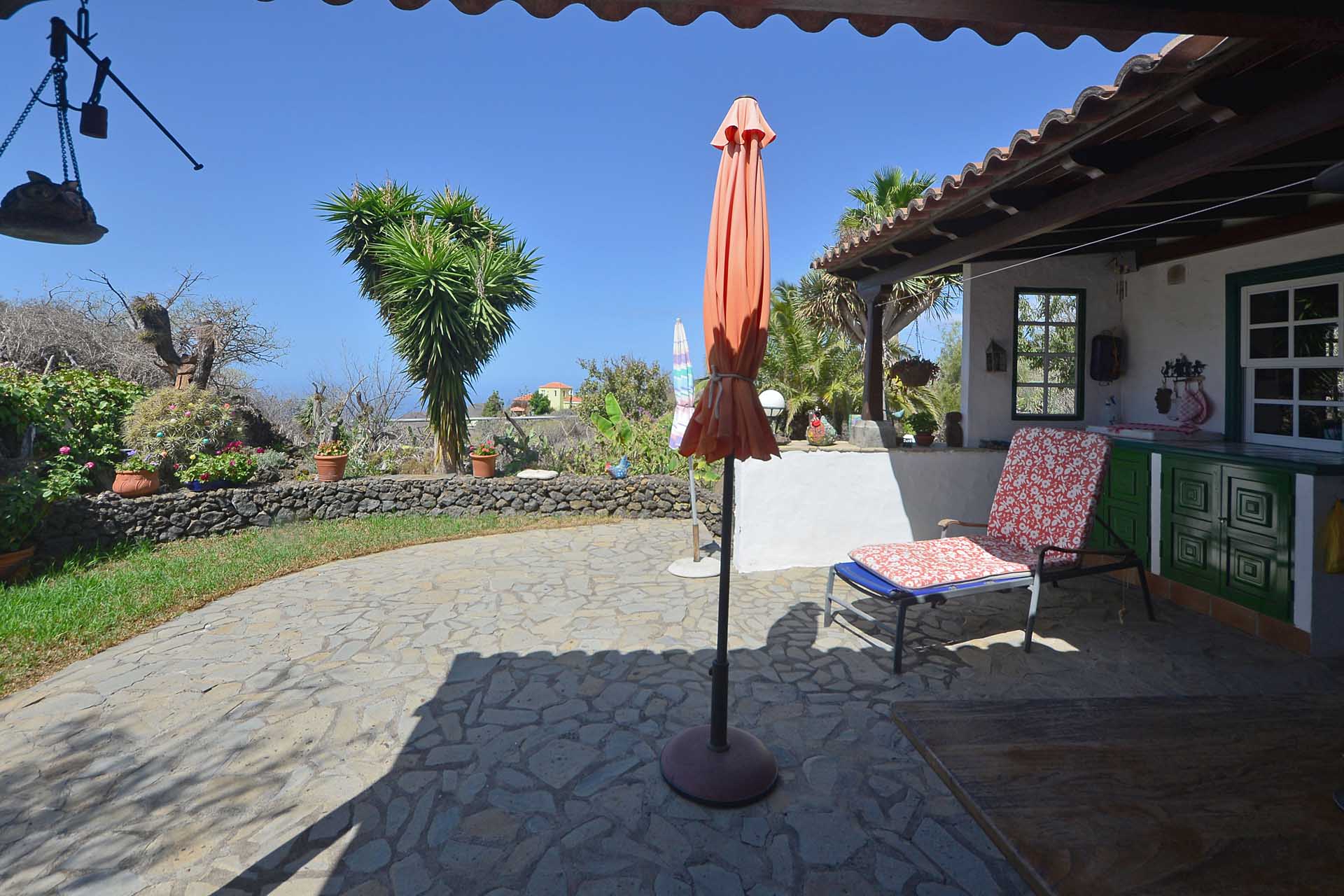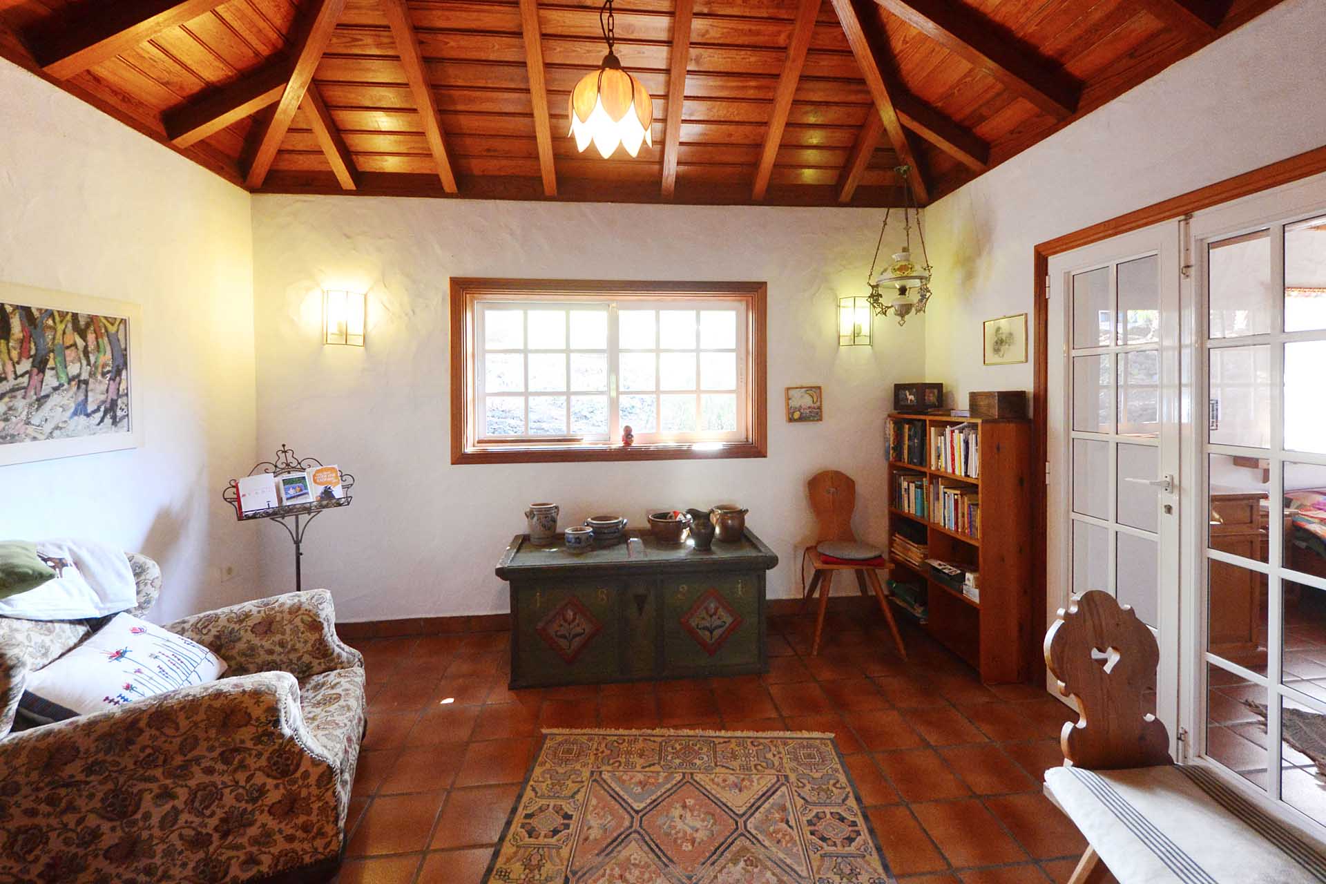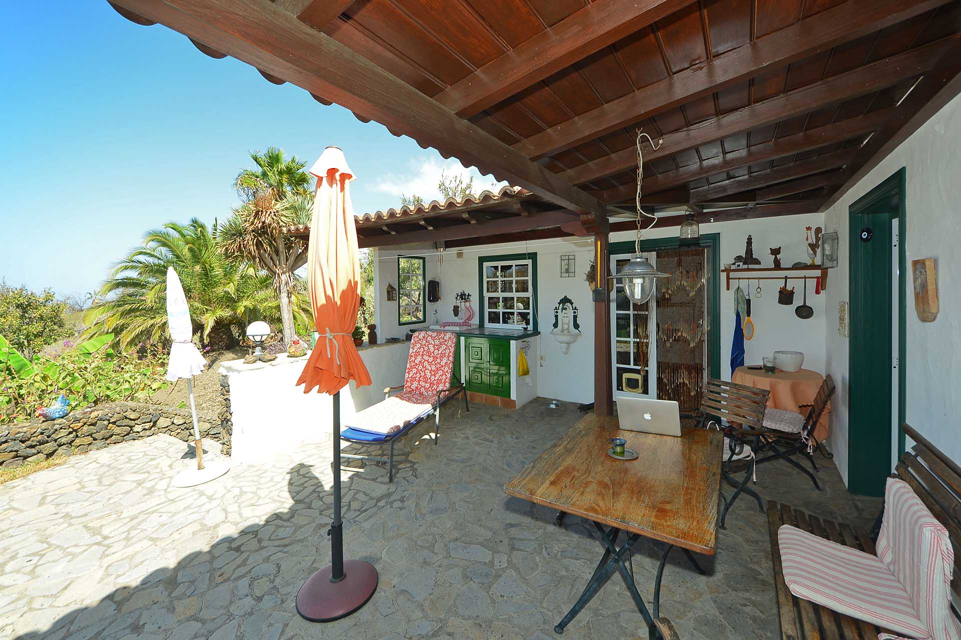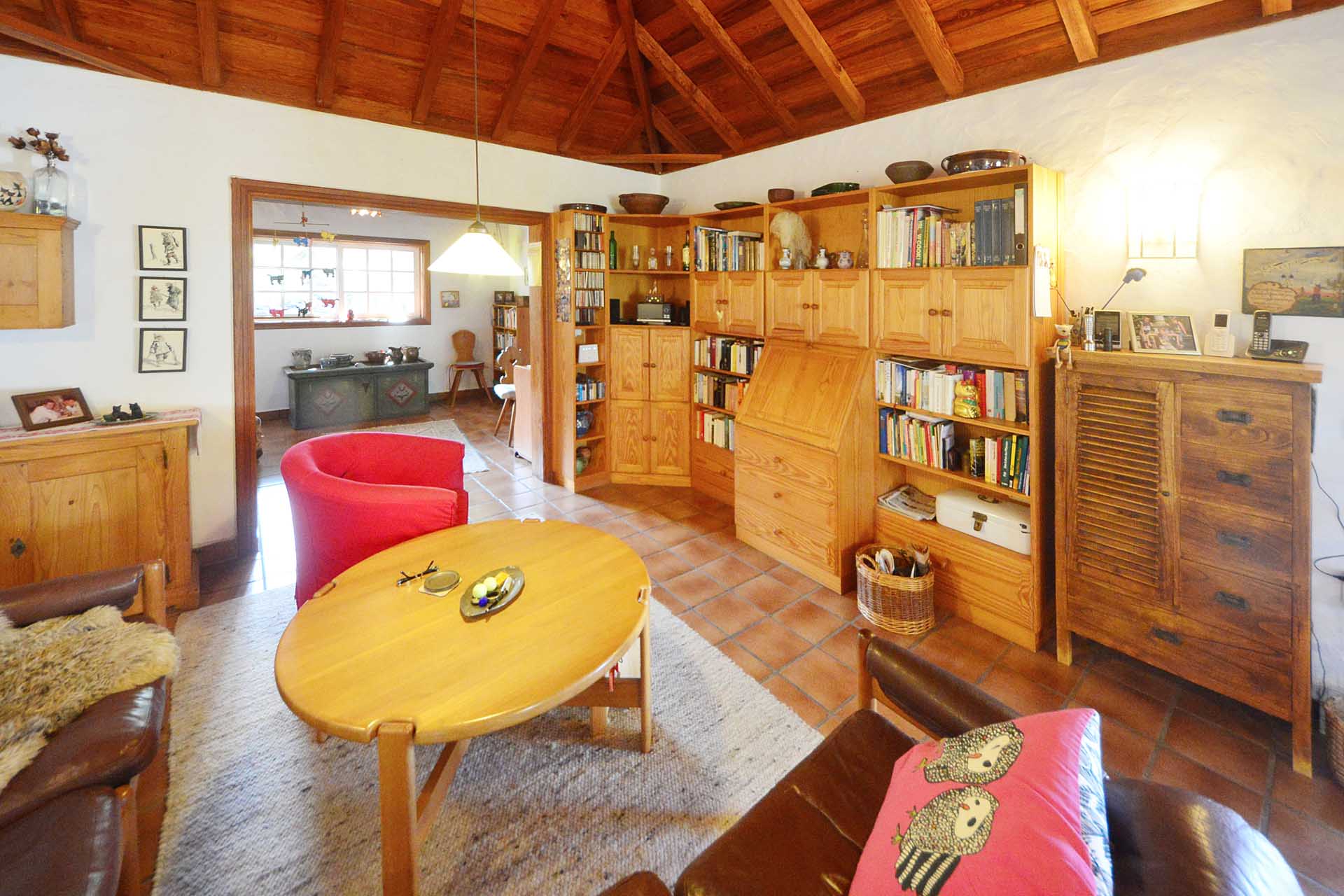 Sie betreten das Haus über eine überdachte Terrasse und gelangen, wie hier üblich, in den Kochbereich der großen Wohnküche. So ist der Weg mit der Kaffeetasse oder dem Mittagessen auf die herrlich schattige oder sonnige Terrasse (je nachdem, wonach Ihnen gerade ist) besonders kurz. Die Wohnküche strahlt kanarische Gemütlichkeit aus und sie wurde für die wenigen Tage, an denen man vielleicht eine Heizung braucht mit einem Grundofen eines deutschen Ofenbauers ausgestattet. Dieser braucht nur ein Mal am Tag mit etwas Holz beschickt zu werden und heizt das gesamte Haus.