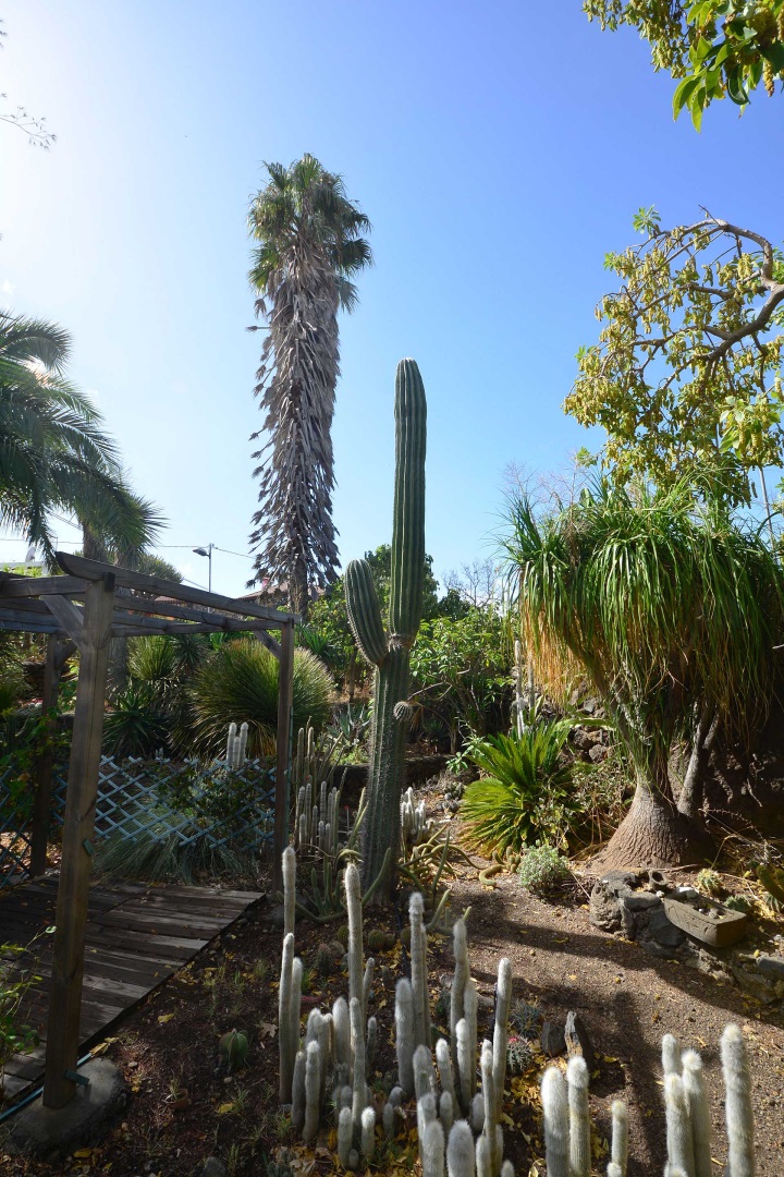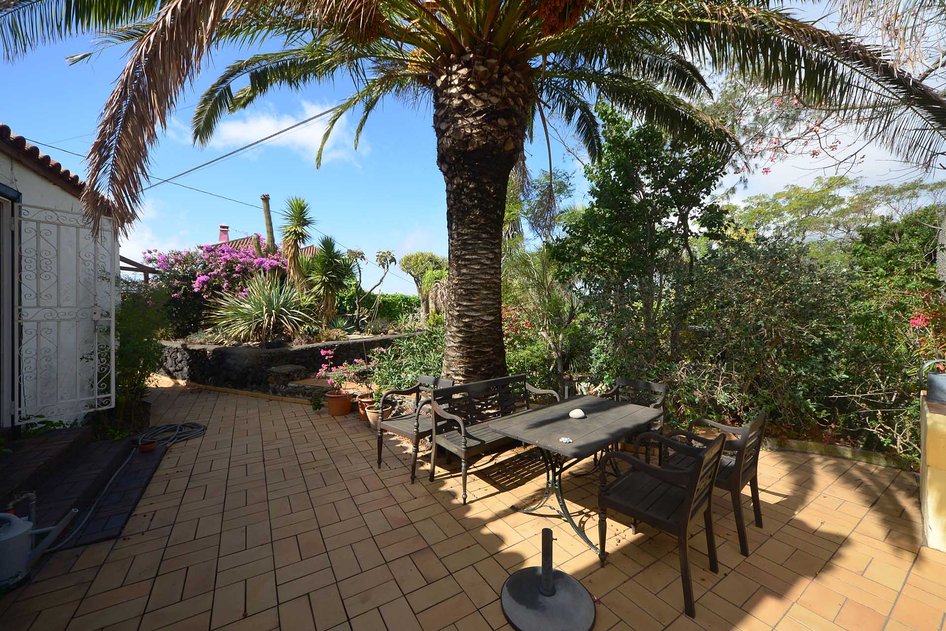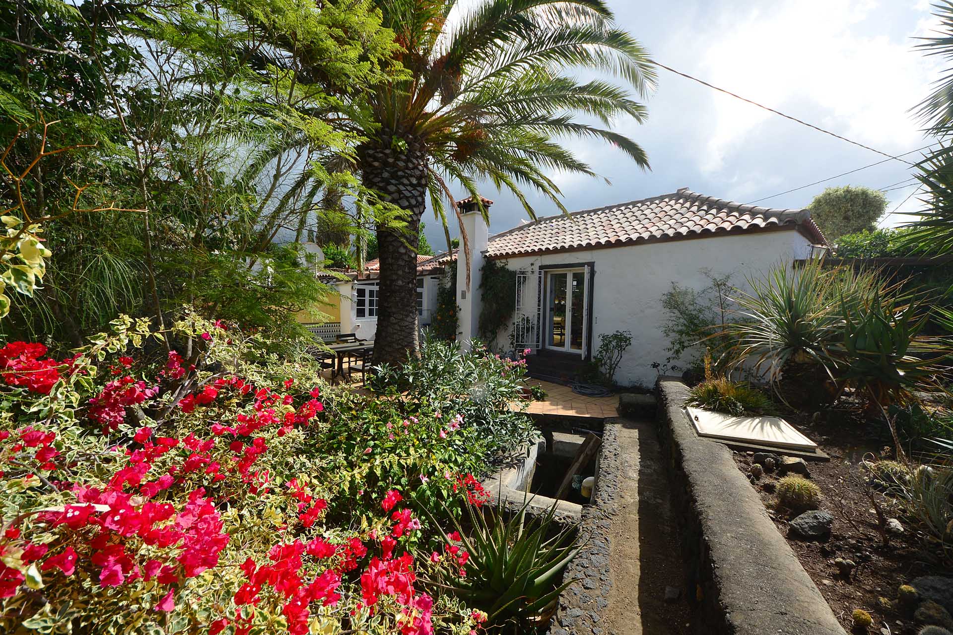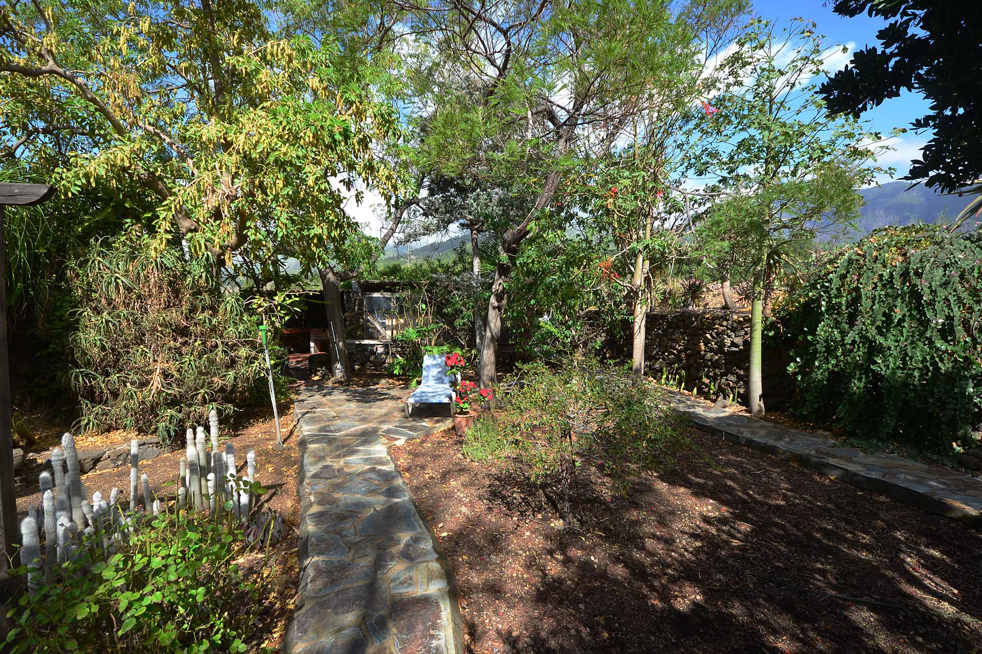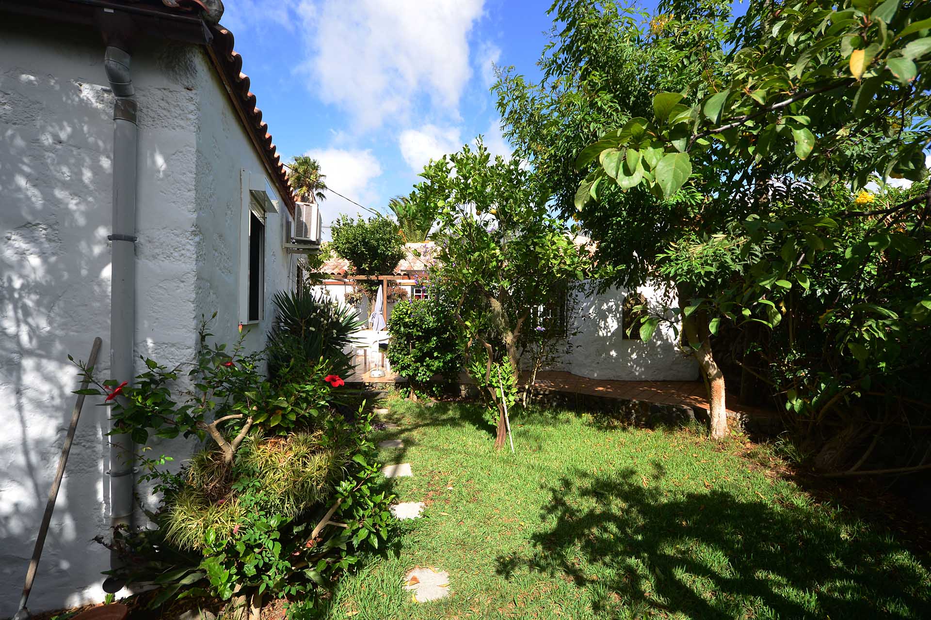 Der sehr liebevoll angelegte und gepflegte Garten besticht durch seine Vielfalt an Zierbäumen, Palmen und teils weit über mannshohe Kakteen. In ihm befinden sich auch die kulturell auf La Palma unverzichtbare Barbacoa (Außenküche), eine Bodega (Weinkeller aus Natursteinen mit gewölbedecke gemauert - nicht nur zum Keltern, sondern auch zum gemeinsamen, stilechten Genießen) und eine Gästetoilette, sowie drei Gewächshäuser (in denen seinerzeit die stattlichen Kakteen vorgezogen wurden), sowie eine Garage. Ebenso finden sich drei Wassertanks, die über eine Wasseraktie im Eigentum gespeist werden. Die Wasseraktie schüttet 250 g/min, was für die Gartenbewässerung ausreichend ist und ist im Kaufpreis inbegriffen.