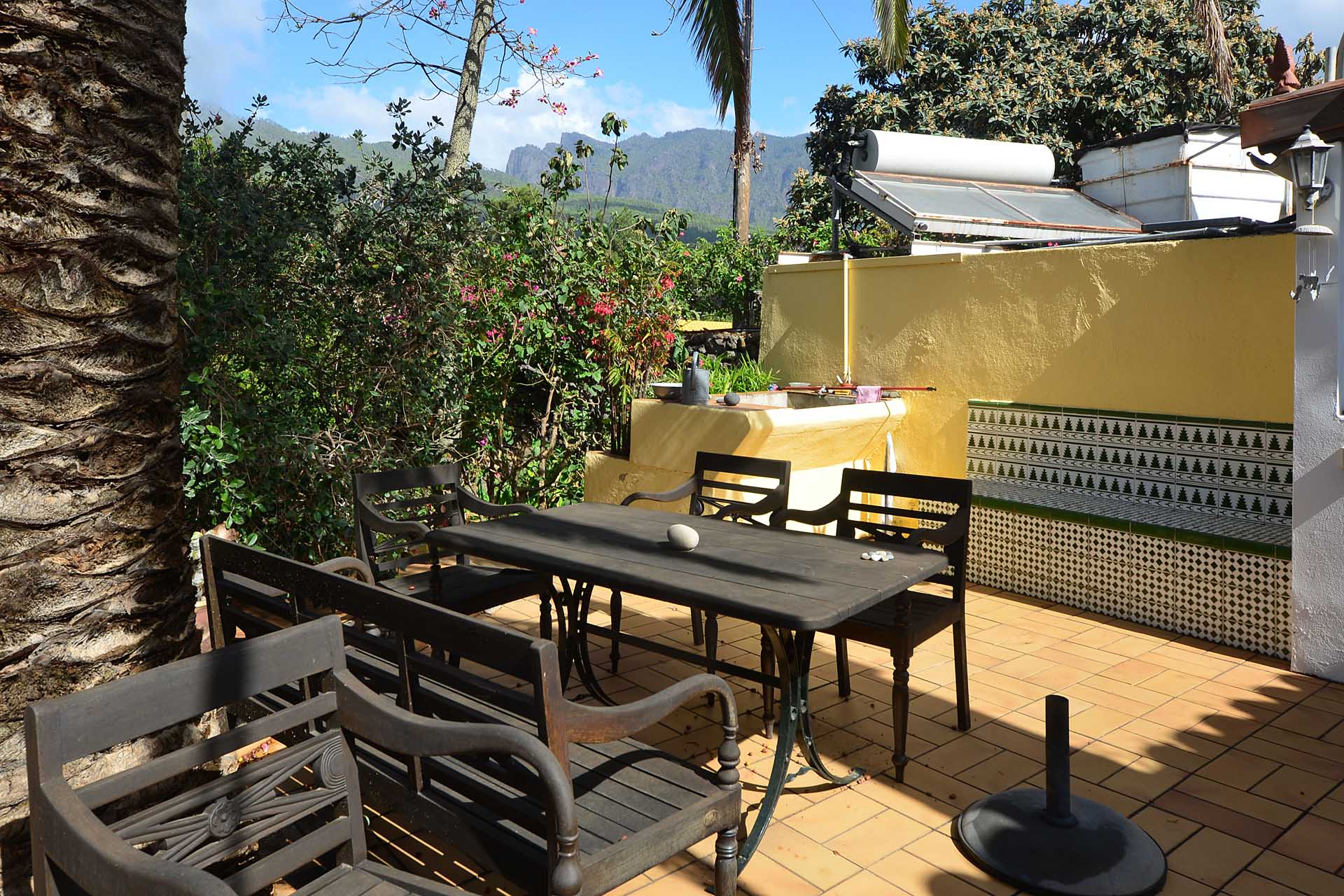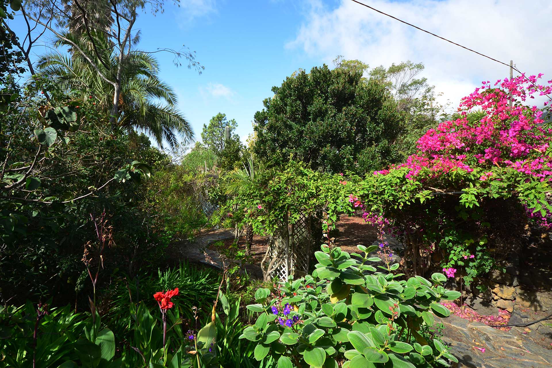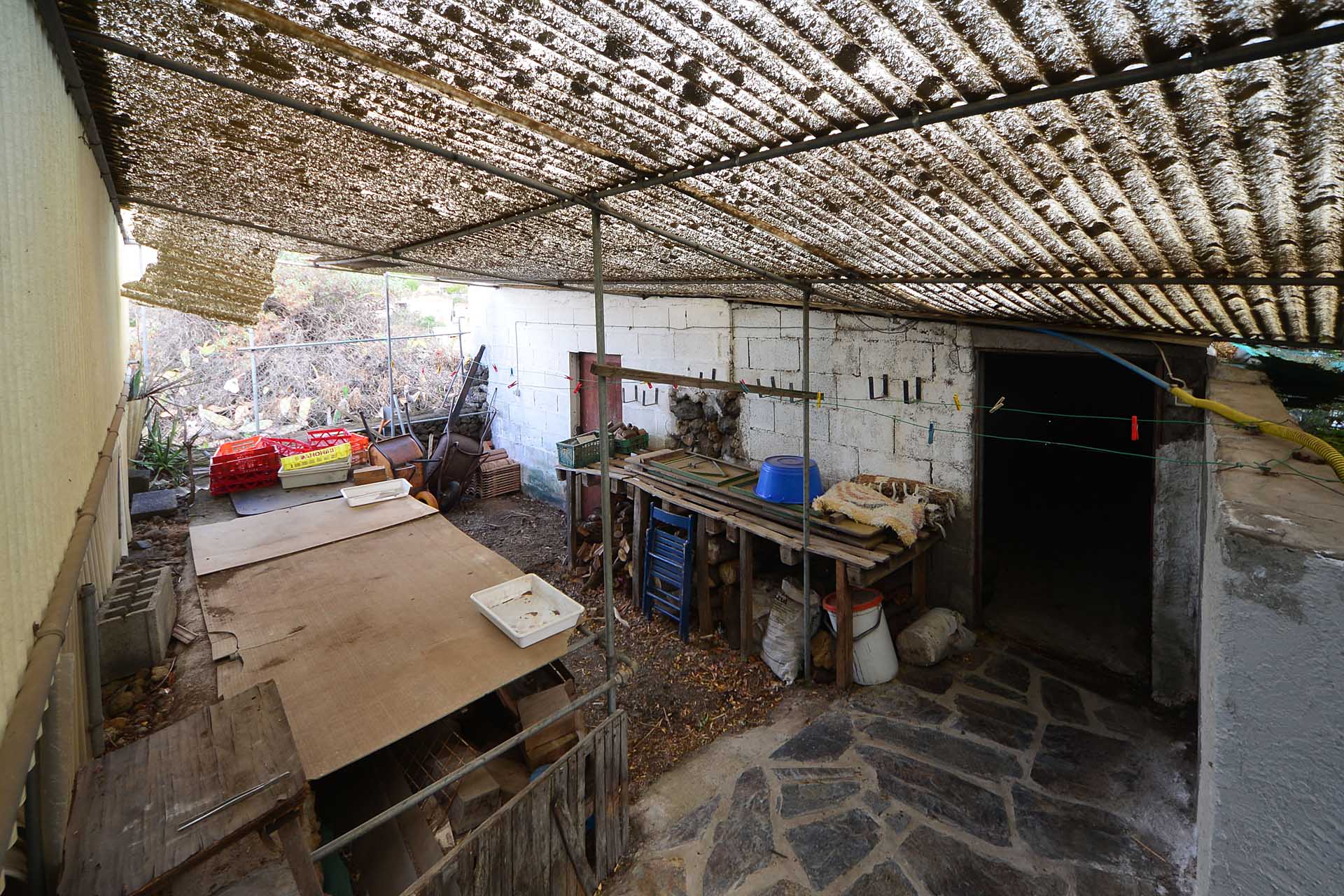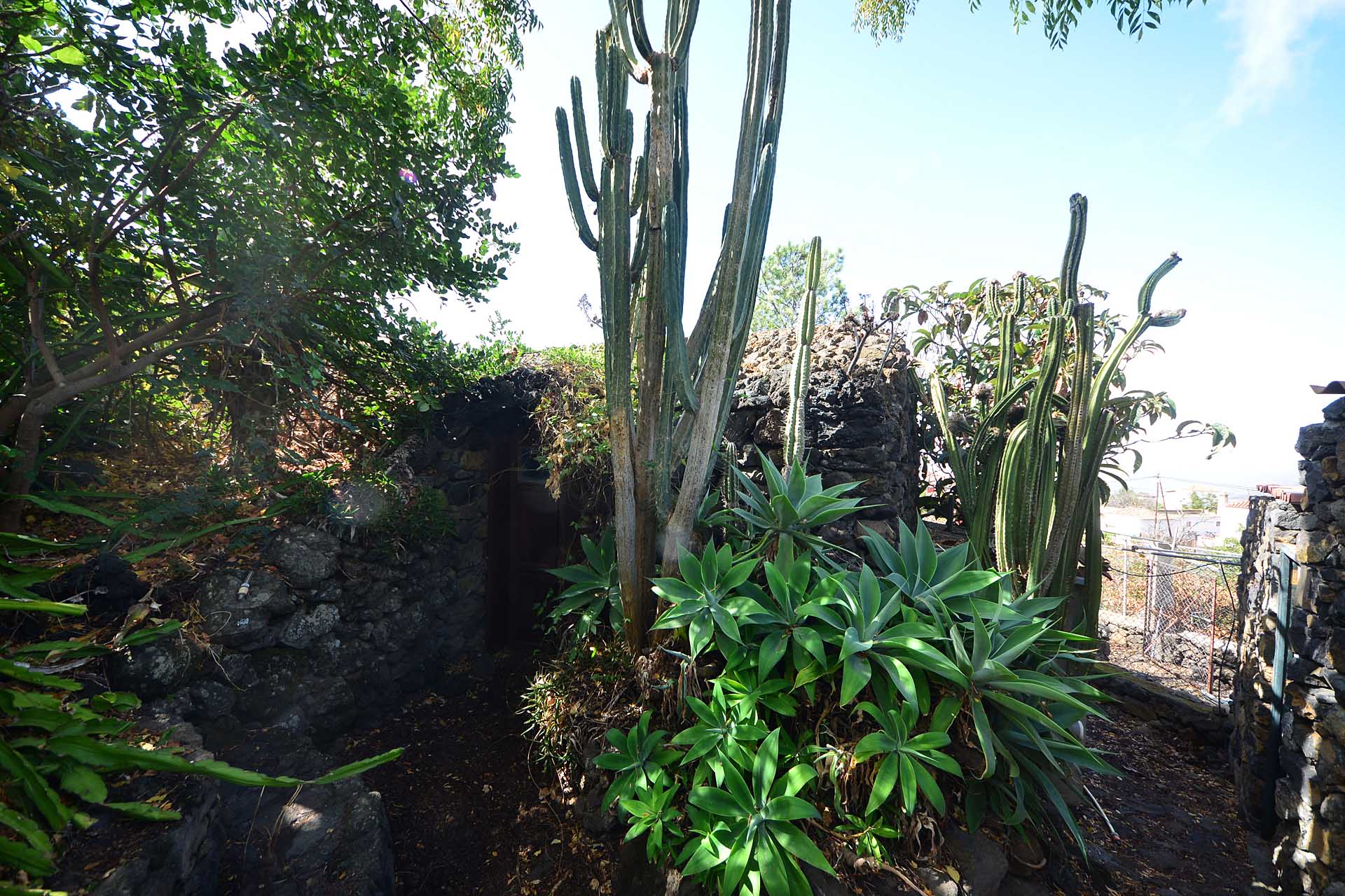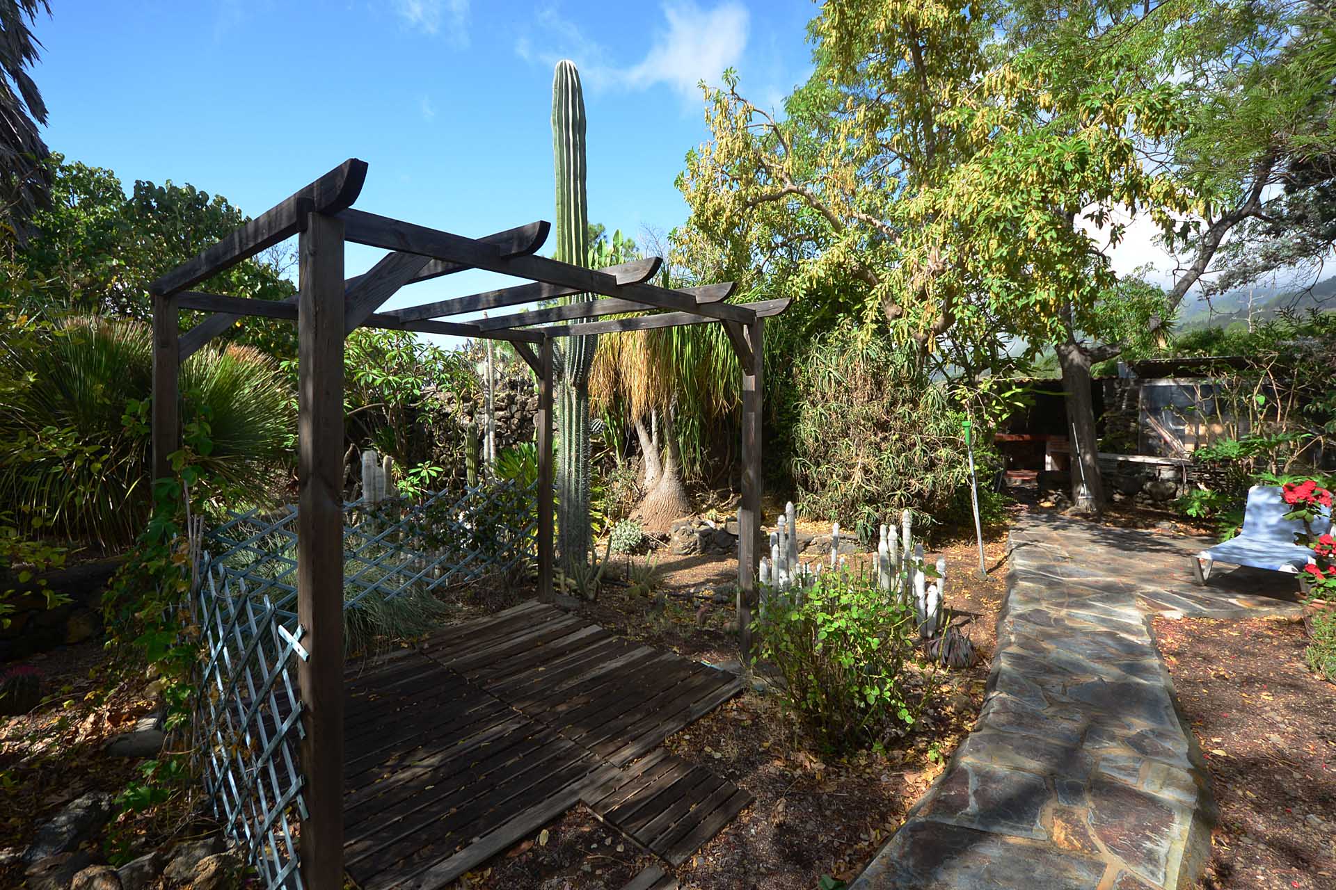 Der sehr liebevoll angelegte und gepflegte Garten besticht durch seine Vielfalt an Zierbäumen, Palmen und teils weit über mannshohe Kakteen. In ihm befinden sich auch die kulturell auf La Palma unverzichtbare Barbacoa (Außenküche), eine Bodega (Weinkeller aus Natursteinen mit gewölbedecke gemauert - nicht nur zum Keltern, sondern auch zum gemeinsamen, stilechten Genießen) und eine Gästetoilette, sowie drei Gewächshäuser (in denen seinerzeit die stattlichen Kakteen vorgezogen wurden), sowie eine Garage. Ebenso finden sich drei Wassertanks, die über eine Wasseraktie im Eigentum gespeist werden. Die Wasseraktie schüttet 250 g/min, was für die Gartenbewässerung ausreichend ist und ist im Kaufpreis inbegriffen.