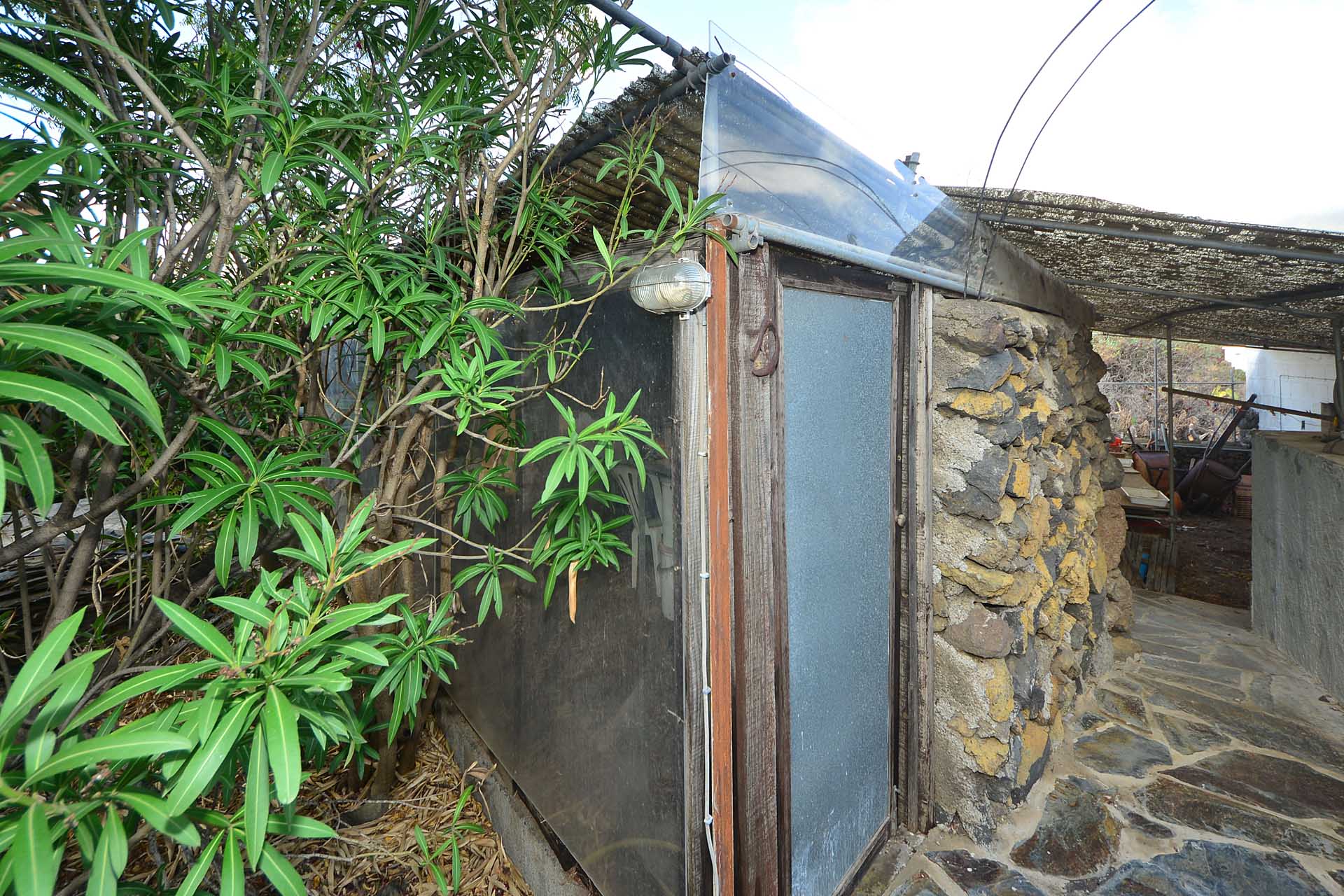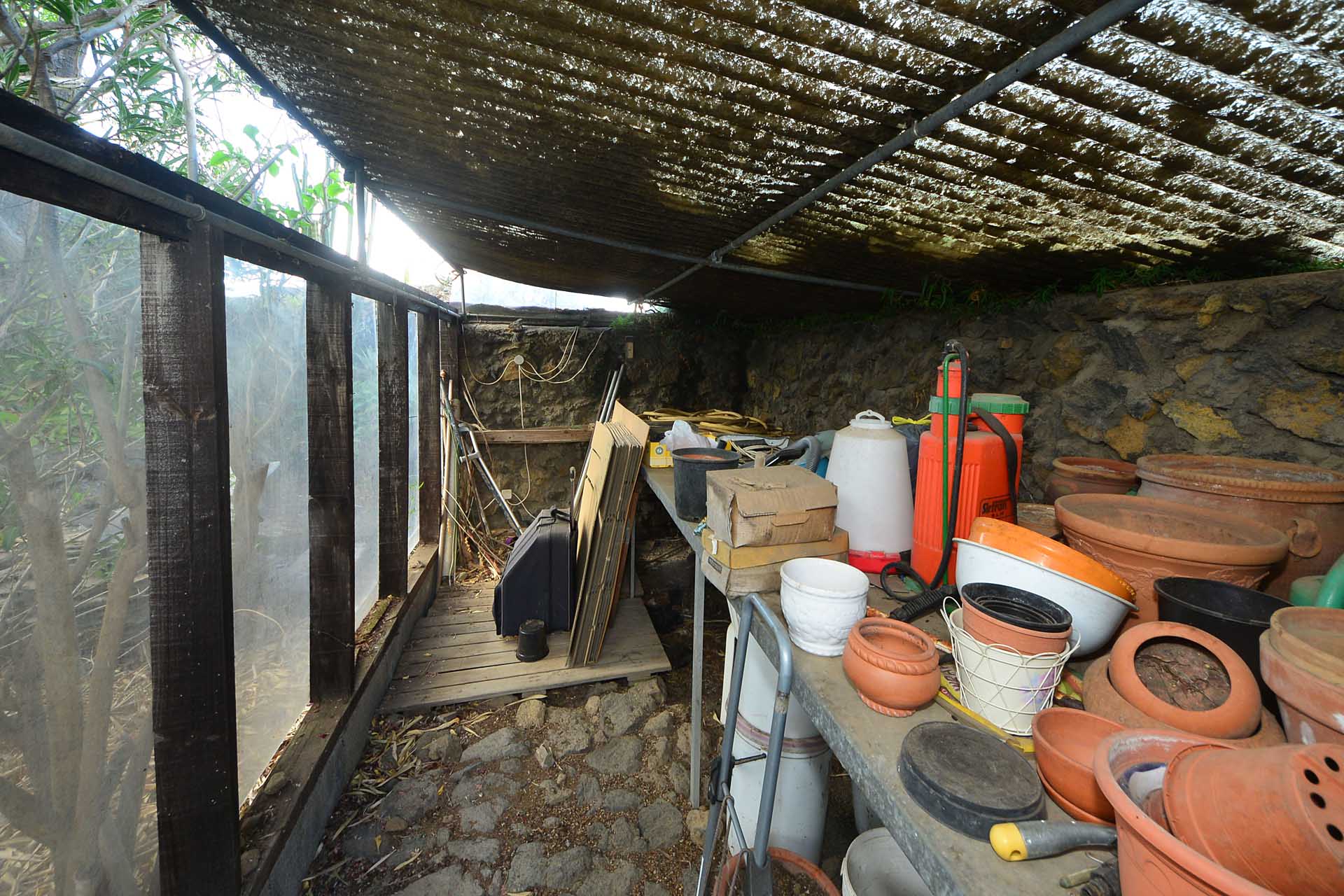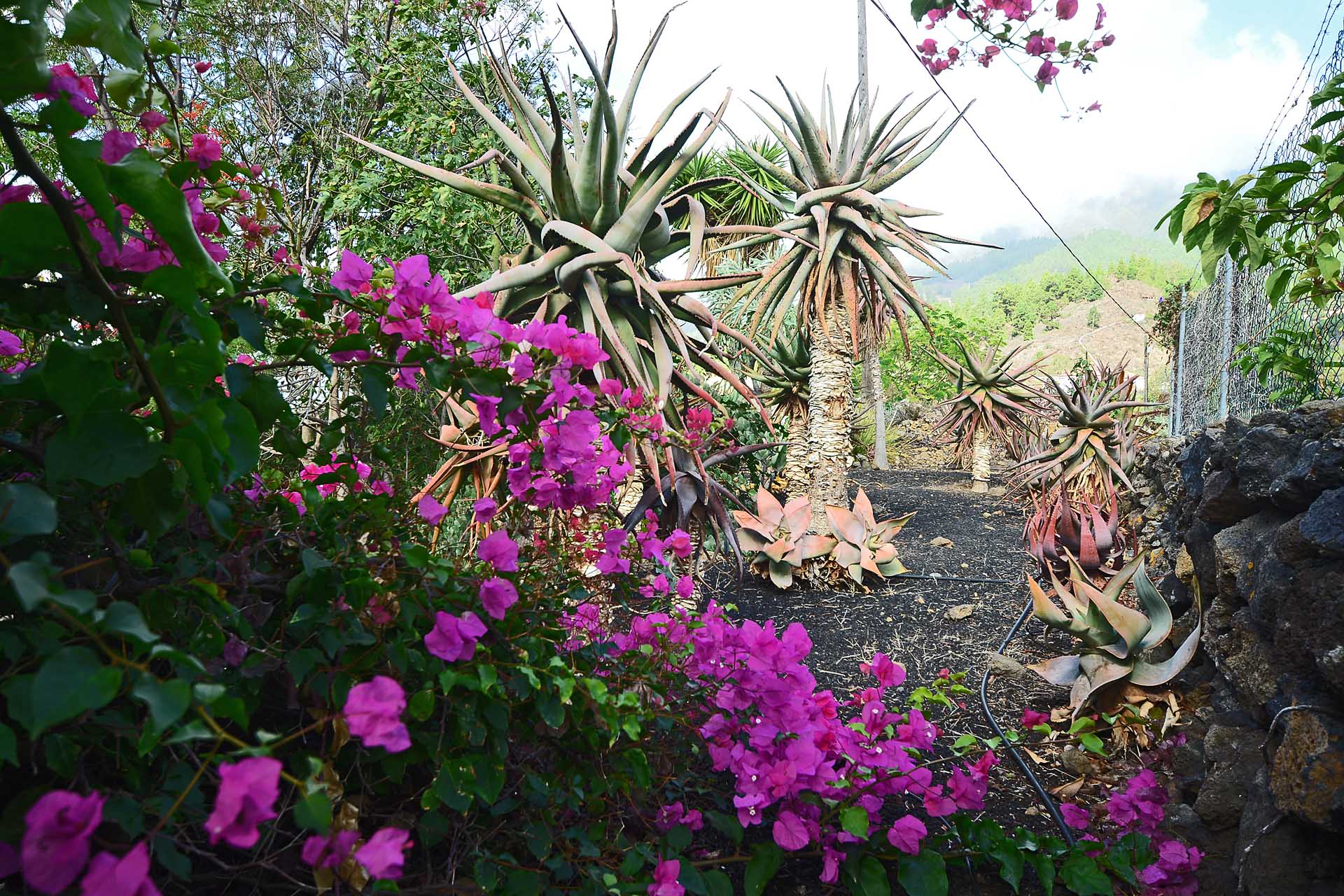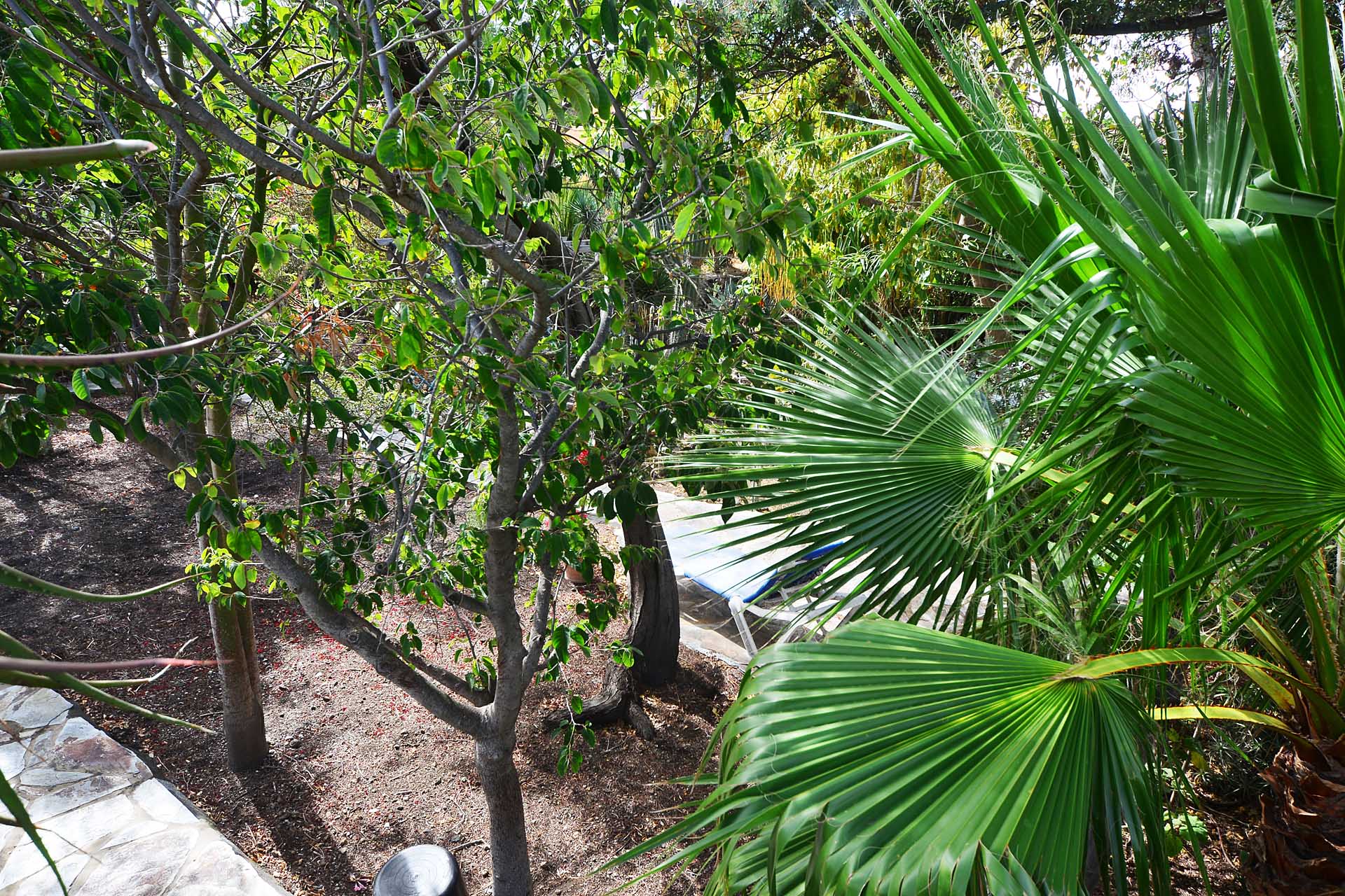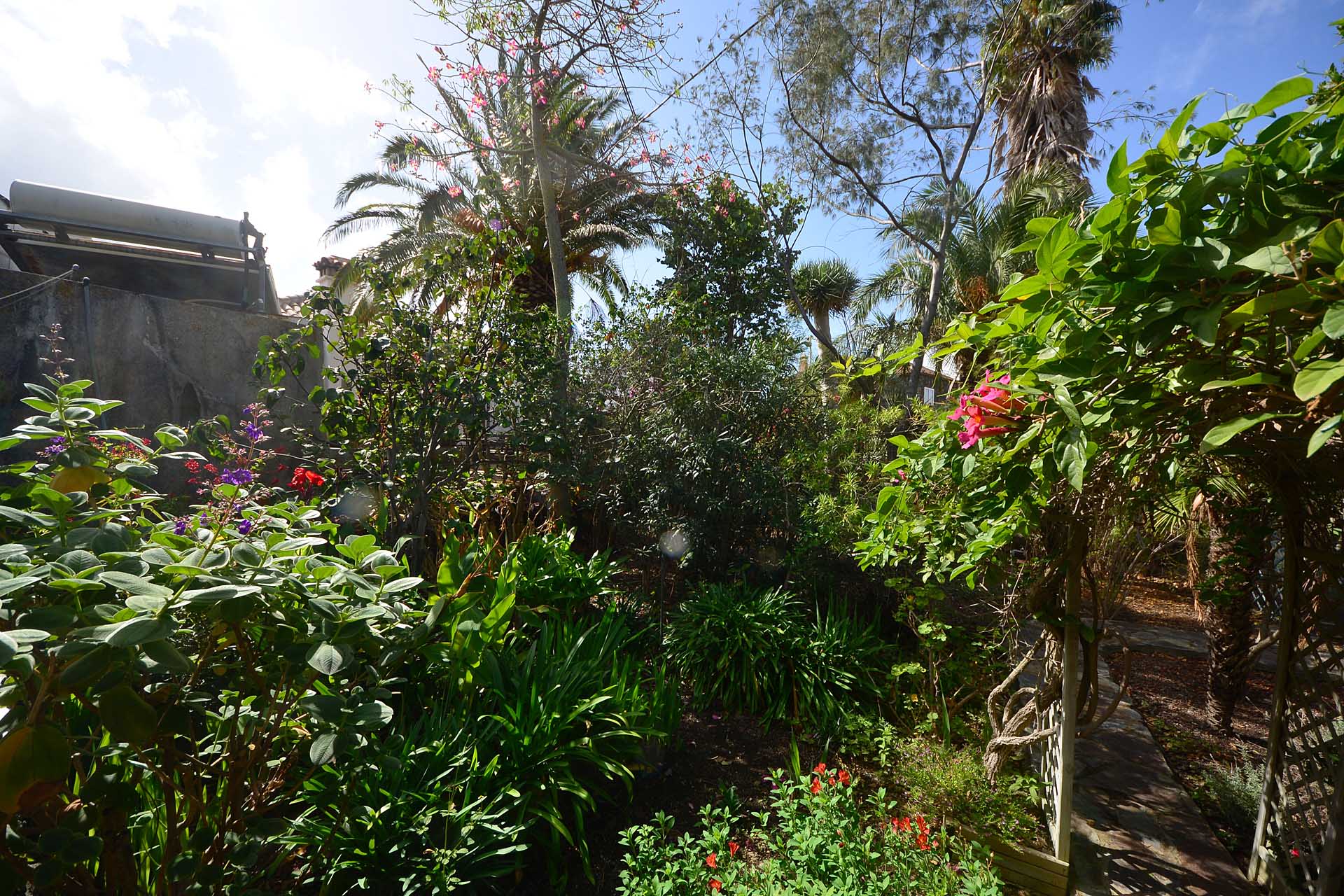 Der sehr liebevoll angelegte und gepflegte Garten besticht durch seine Vielfalt an Zierbäumen, Palmen und teils weit über mannshohe Kakteen. In ihm befinden sich auch die kulturell auf La Palma unverzichtbare Barbacoa (Außenküche), eine Bodega (Weinkeller aus Natursteinen mit gewölbedecke gemauert - nicht nur zum Keltern, sondern auch zum gemeinsamen, stilechten Genießen) und eine Gästetoilette, sowie drei Gewächshäuser (in denen seinerzeit die stattlichen Kakteen vorgezogen wurden), sowie eine Garage. Ebenso finden sich drei Wassertanks, die über eine Wasseraktie im Eigentum gespeist werden. Die Wasseraktie schüttet 250 g/min, was für die Gartenbewässerung ausreichend ist und ist im Kaufpreis inbegriffen.