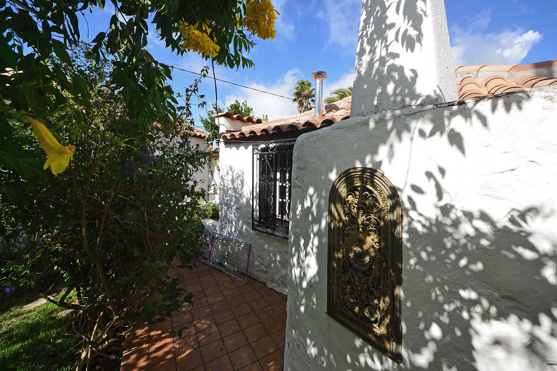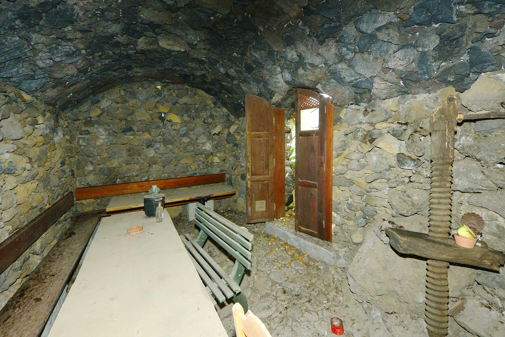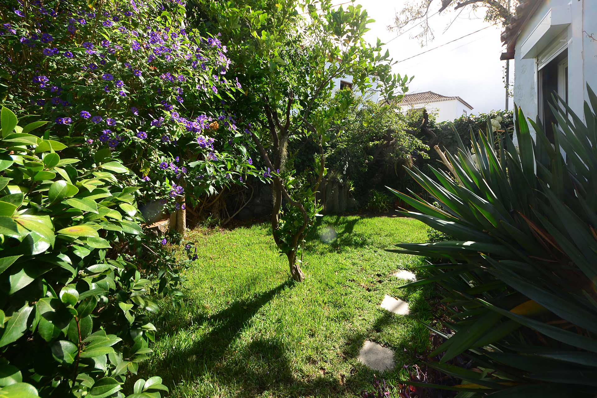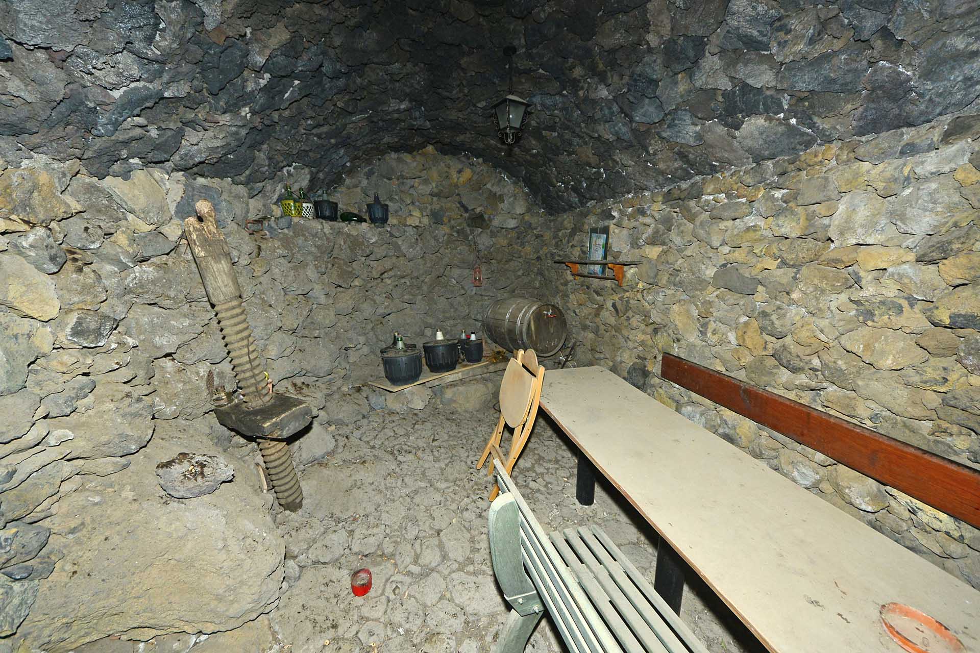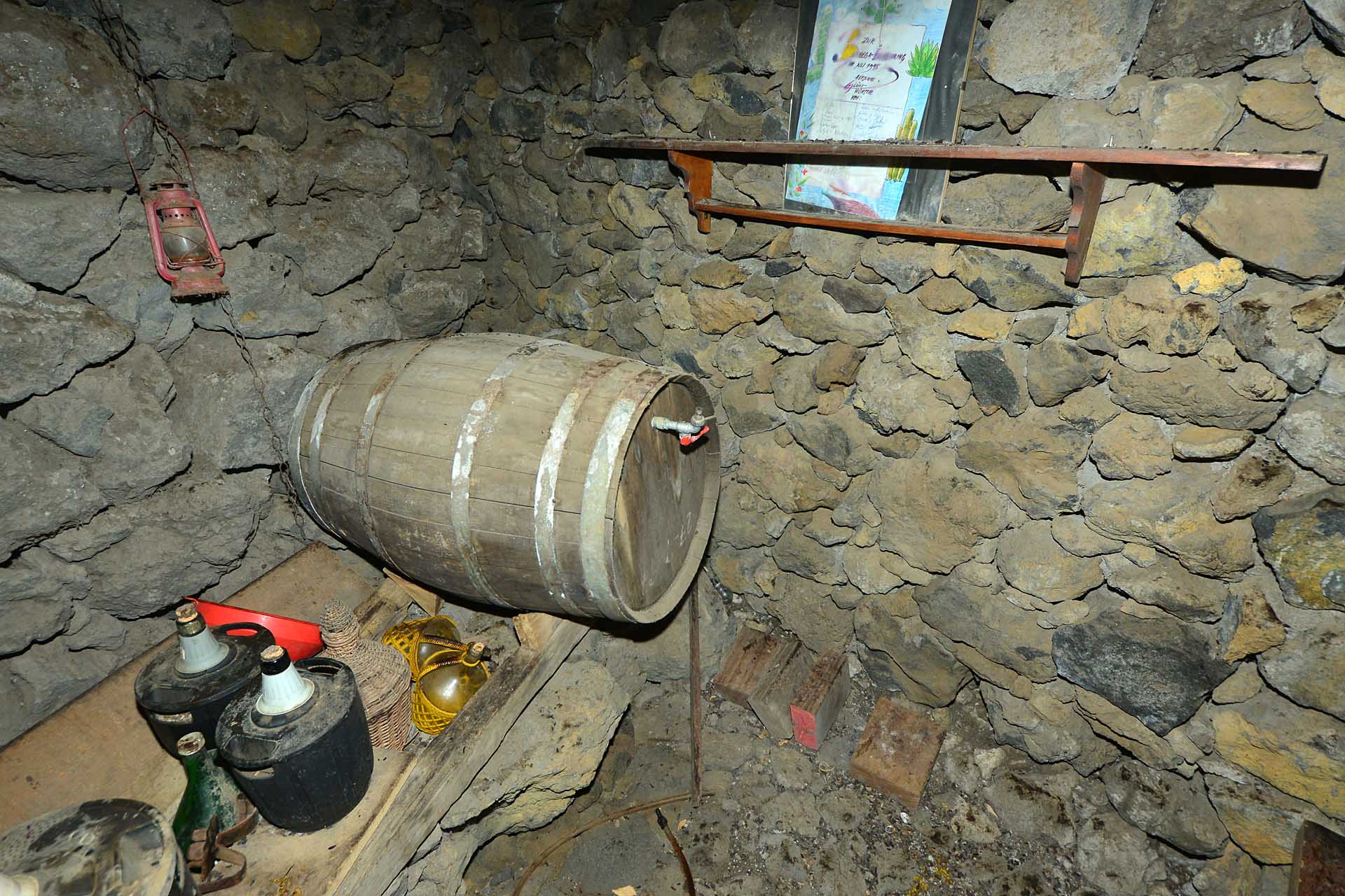 Der sehr liebevoll angelegte und gepflegte Garten besticht durch seine Vielfalt an Zierbäumen, Palmen und teils weit über mannshohe Kakteen. In ihm befinden sich auch die kulturell auf La Palma unverzichtbare Barbacoa (Außenküche), eine Bodega (Weinkeller aus Natursteinen mit gewölbedecke gemauert - nicht nur zum Keltern, sondern auch zum gemeinsamen, stilechten Genießen) und eine Gästetoilette, sowie drei Gewächshäuser (in denen seinerzeit die stattlichen Kakteen vorgezogen wurden), sowie eine Garage. Ebenso finden sich drei Wassertanks, die über eine Wasseraktie im Eigentum gespeist werden. Die Wasseraktie schüttet 250 g/min, was für die Gartenbewässerung ausreichend ist und ist im Kaufpreis inbegriffen.