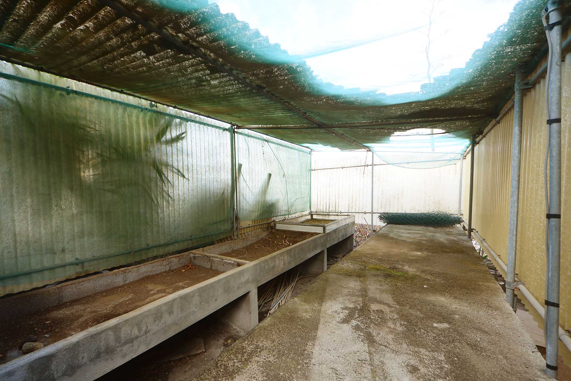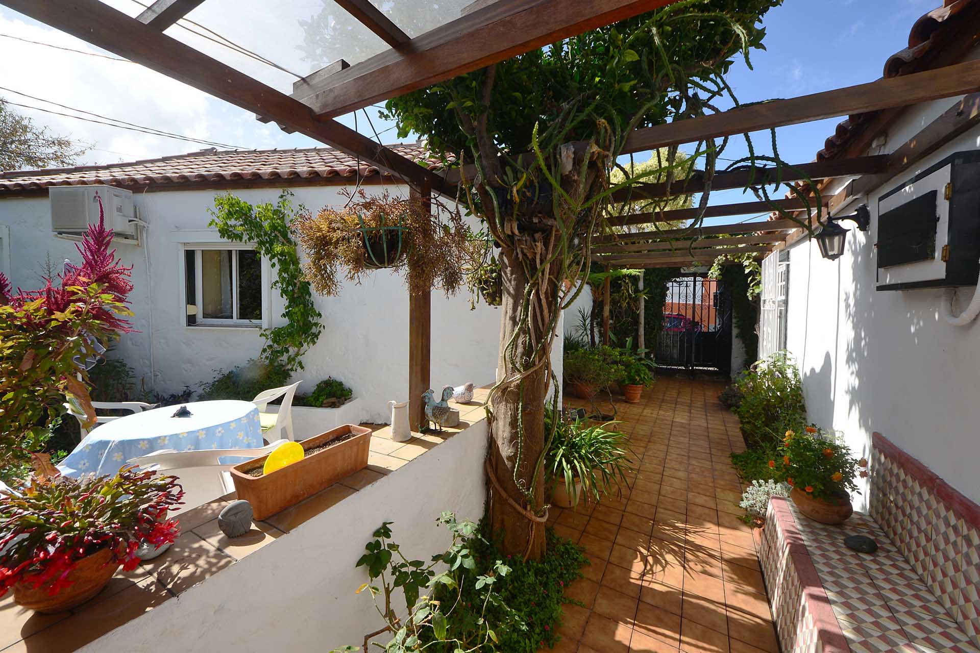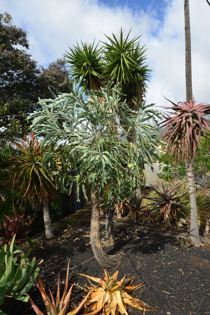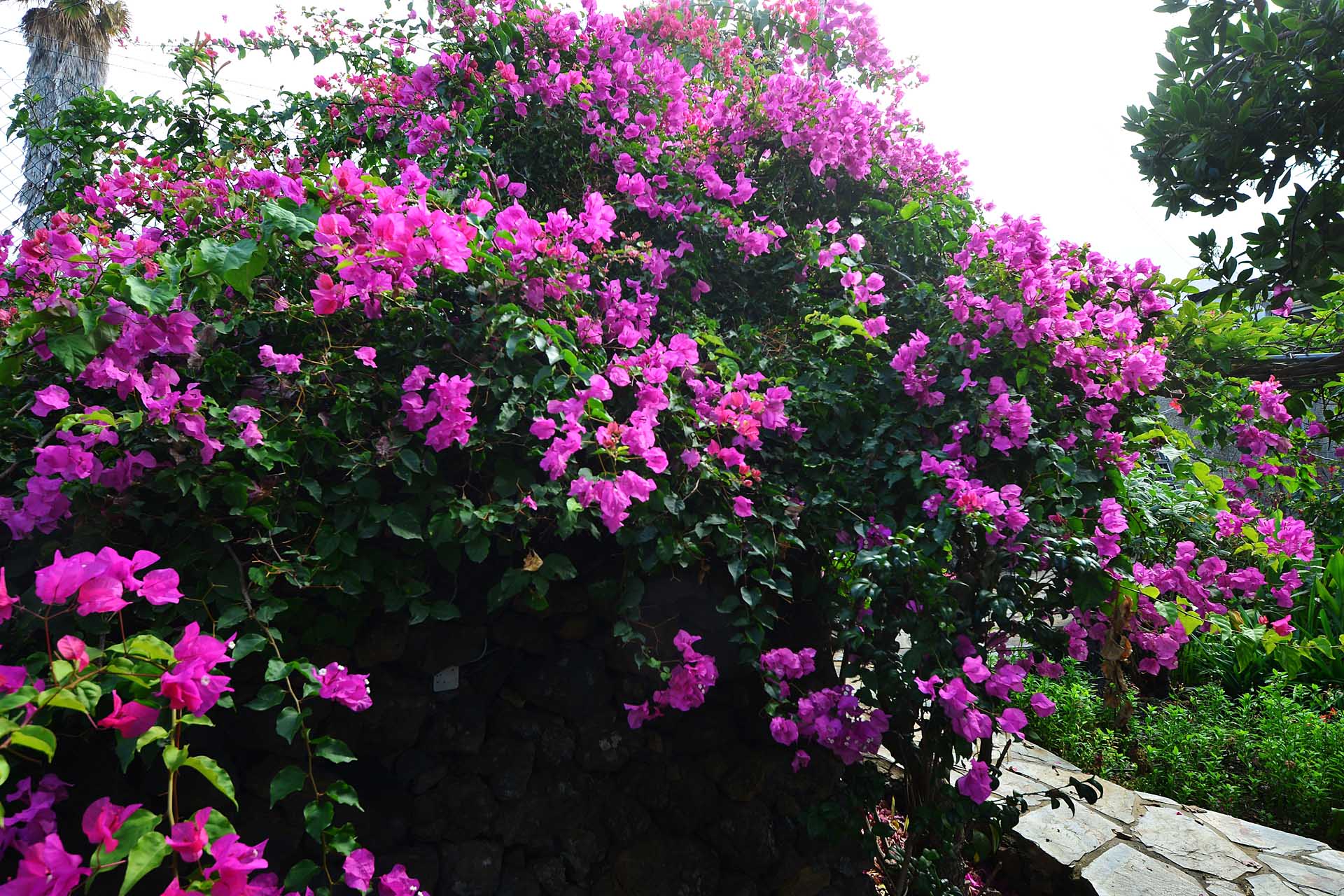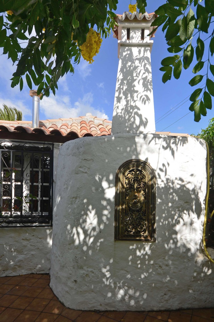 Der sehr liebevoll angelegte und gepflegte Garten besticht durch seine Vielfalt an Zierbäumen, Palmen und teils weit über mannshohe Kakteen. In ihm befinden sich auch die kulturell auf La Palma unverzichtbare Barbacoa (Außenküche), eine Bodega (Weinkeller aus Natursteinen mit gewölbedecke gemauert - nicht nur zum Keltern, sondern auch zum gemeinsamen, stilechten Genießen) und eine Gästetoilette, sowie drei Gewächshäuser (in denen seinerzeit die stattlichen Kakteen vorgezogen wurden), sowie eine Garage. Ebenso finden sich drei Wassertanks, die über eine Wasseraktie im Eigentum gespeist werden. Die Wasseraktie schüttet 250 g/min, was für die Gartenbewässerung ausreichend ist und ist im Kaufpreis inbegriffen.
