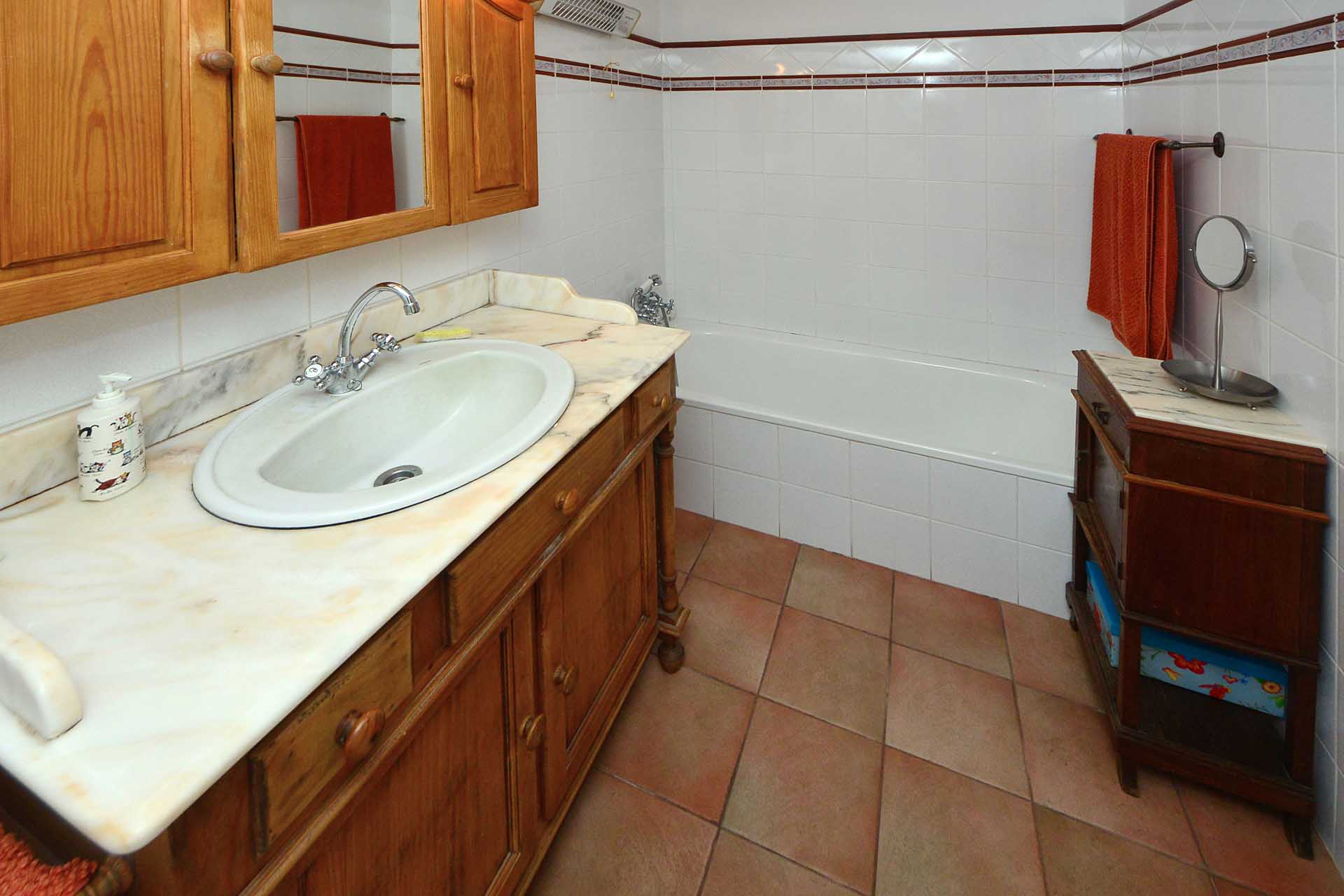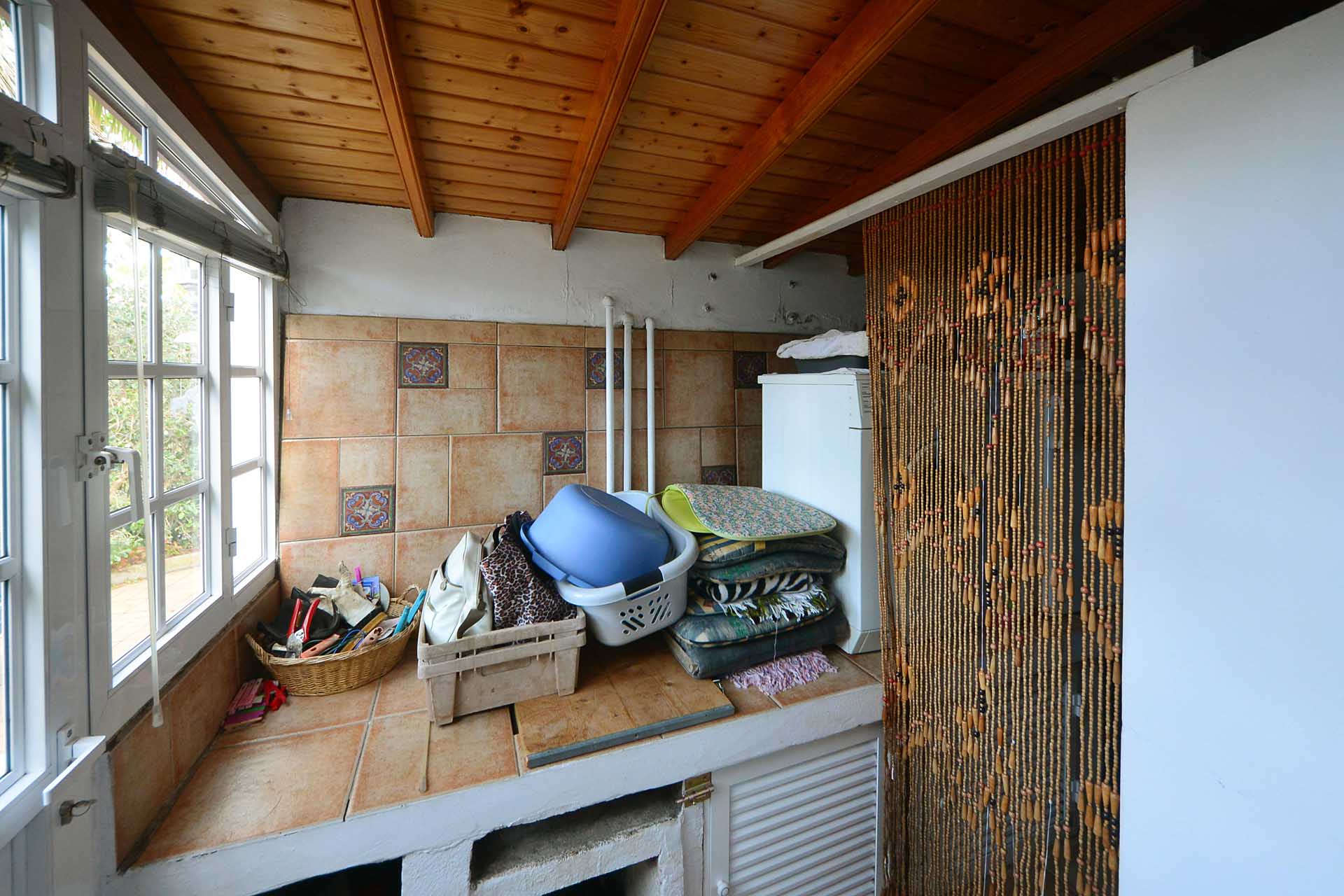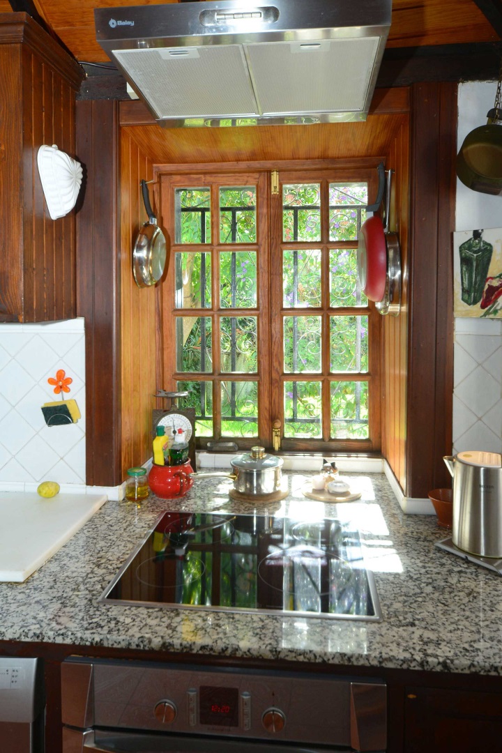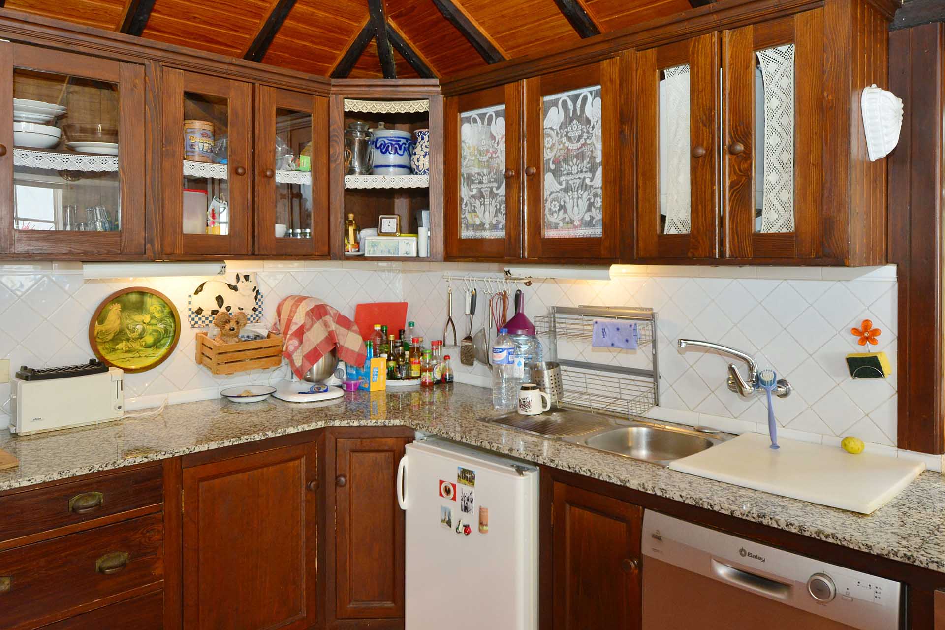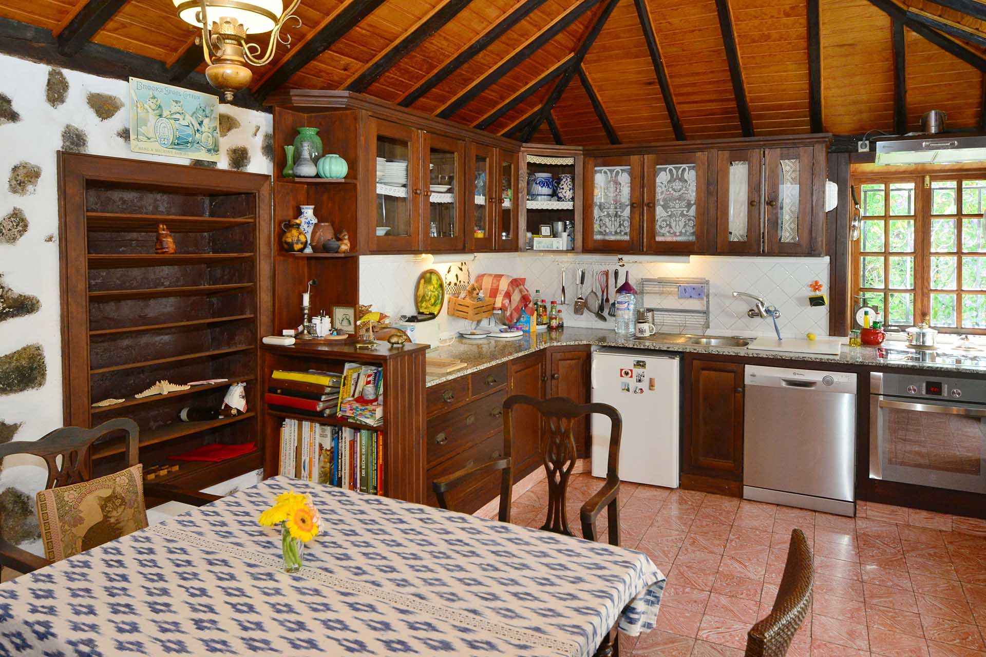 Beide Häuser treffen sich an einem kleinen Innenhof mit teilüberdachter Terrasse ,das Haupthaus (108,5 m² Grundfläche) betreten Sie durch die Küche, damit der Weg mit der Kaffee-Mug in die Sonne möglichst kurz ist. Die von einem Tischler gefertigte Einbauküche ist aus heimischem, sehr hochwertigem Teaholz gefertigt. Der rustikal gemütliche Raum bietet nicht nur reichlich Platz auch für ausgefeilte Menüs, sondern auch für vier Personen zum Essen – wenn dies einmal nicht draußen stattfinden soll. Die Küche erschließt auch einen kleinen Flur mit Einbauschränken von dem Sie in das sehr schön eingerichtete Badezimmer und den Hauswirtschaftsraum mit Lagermöglichkeiten gelangen sowie das große Wohnzimmer.