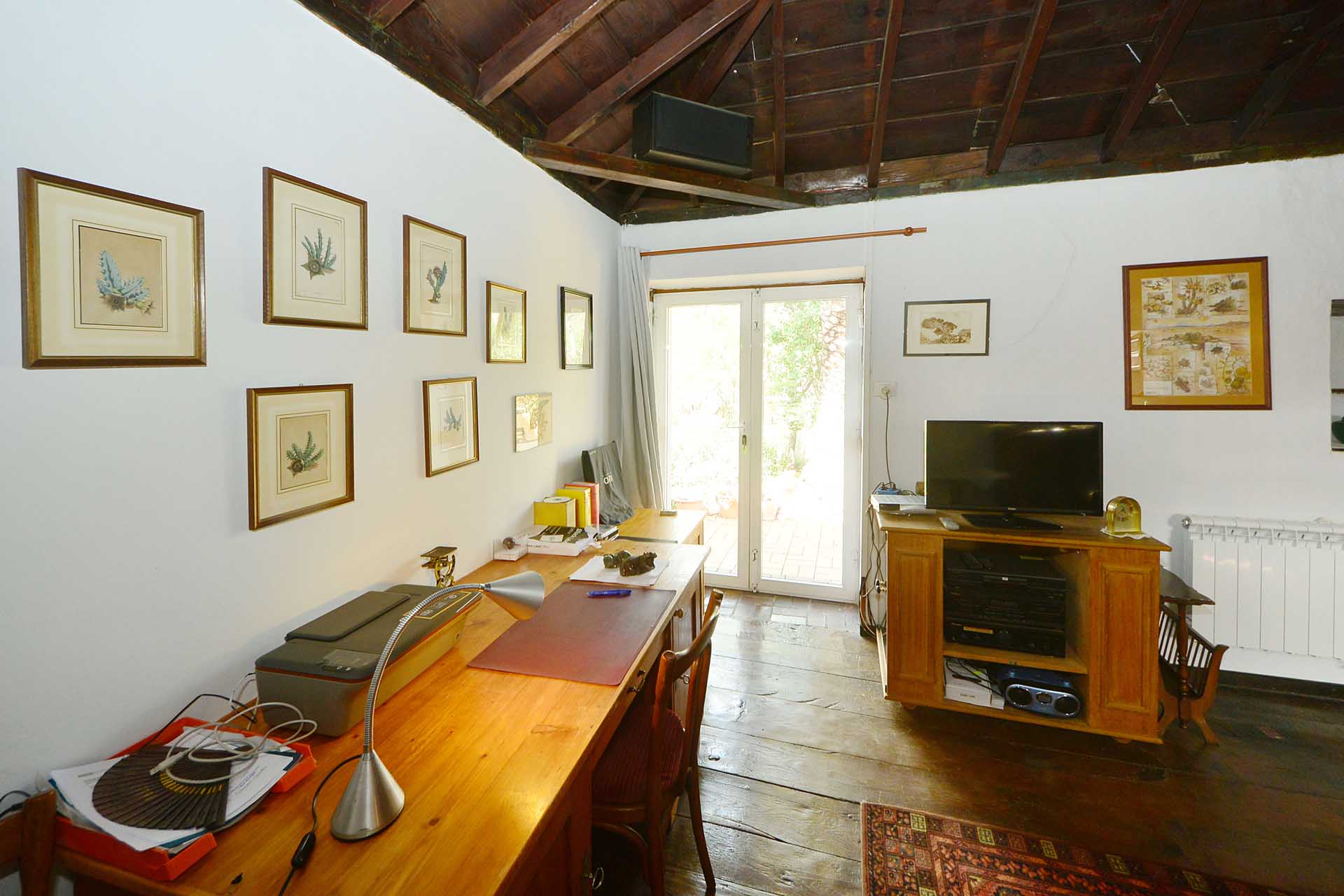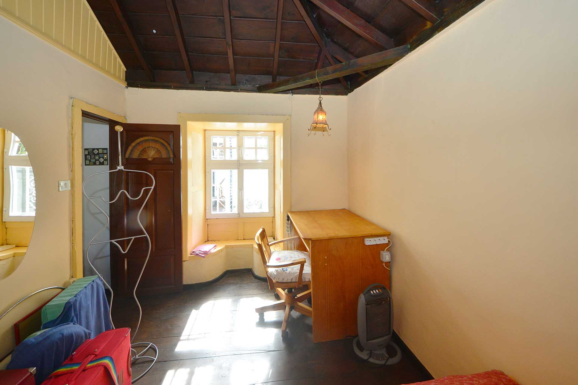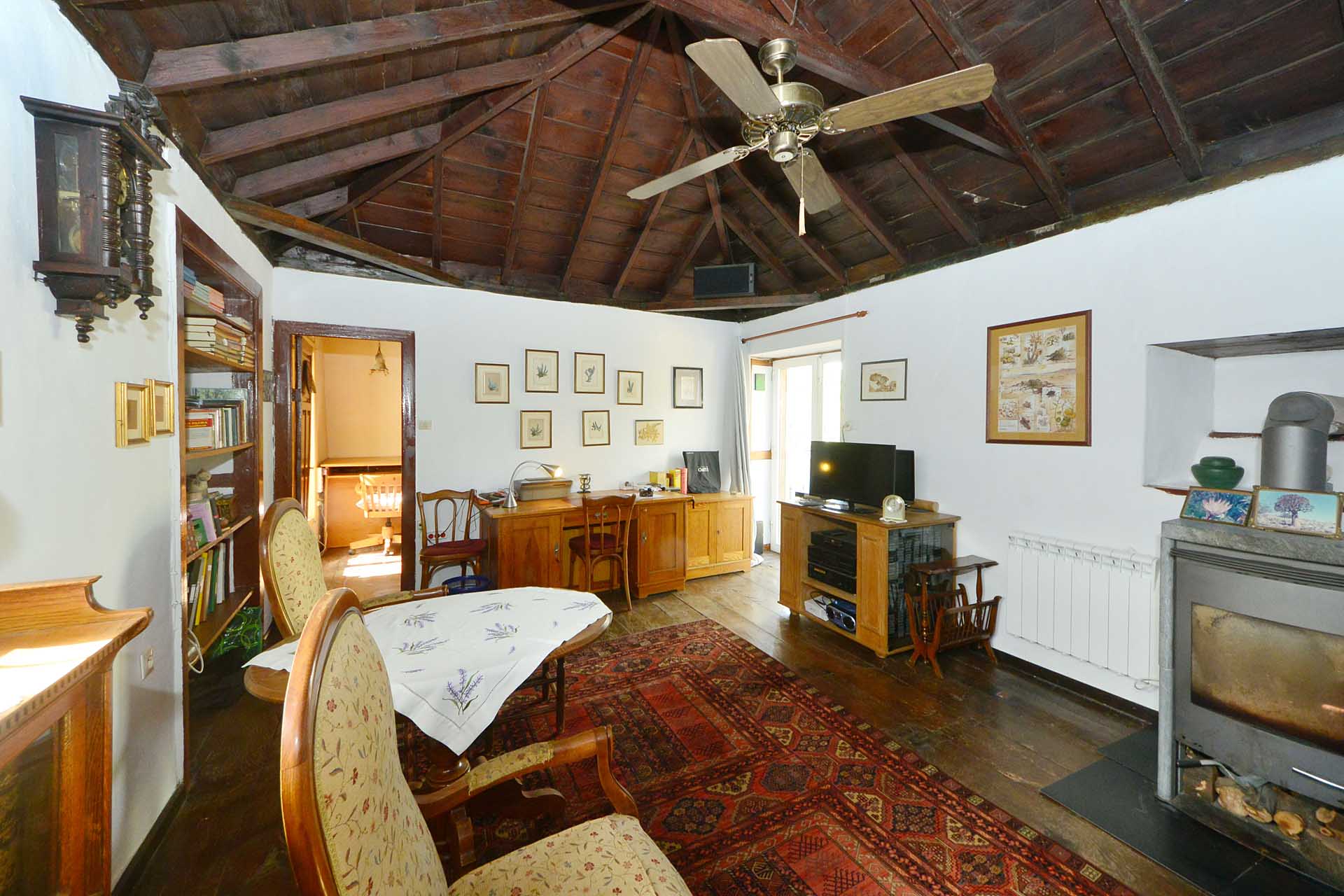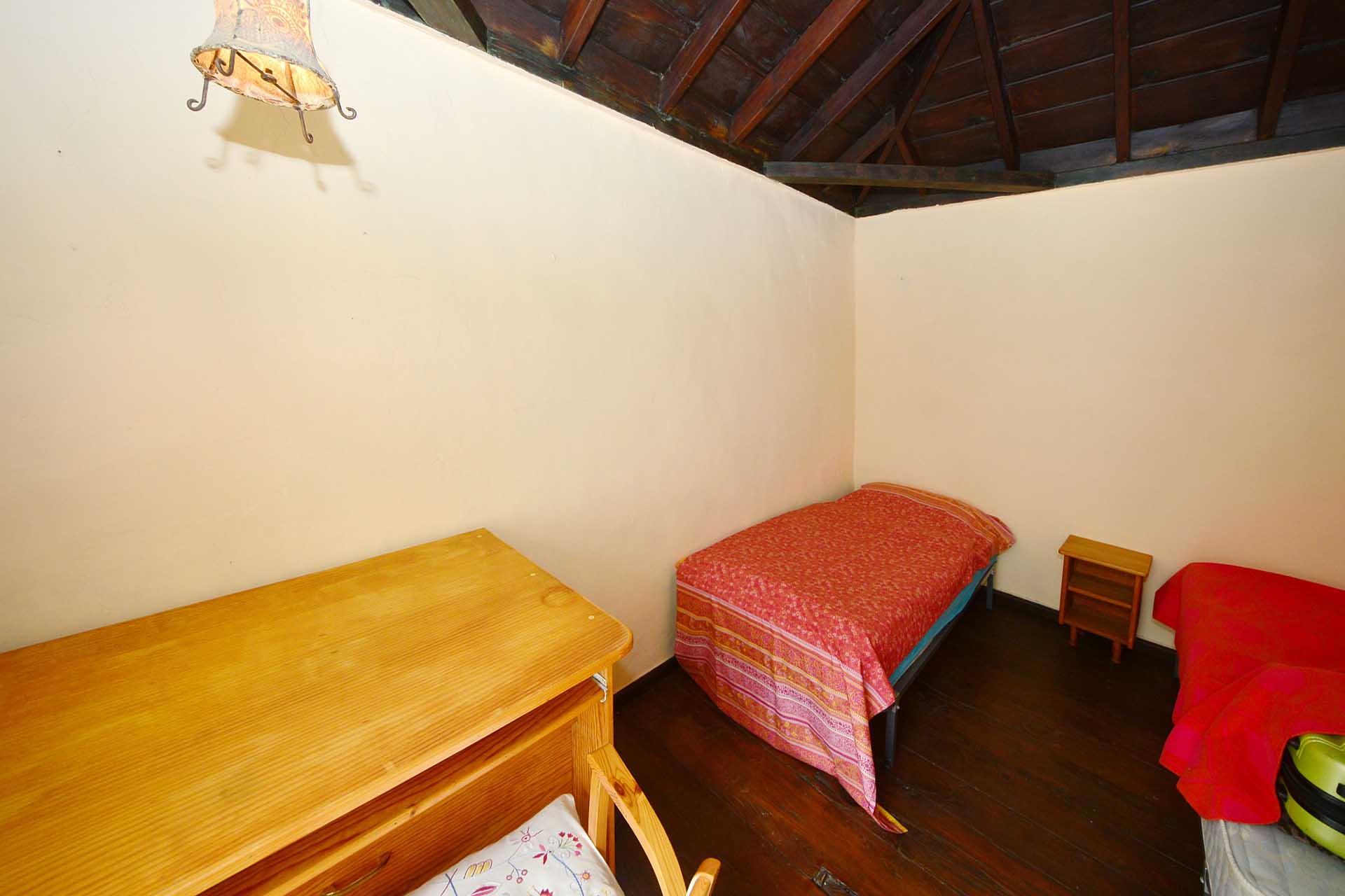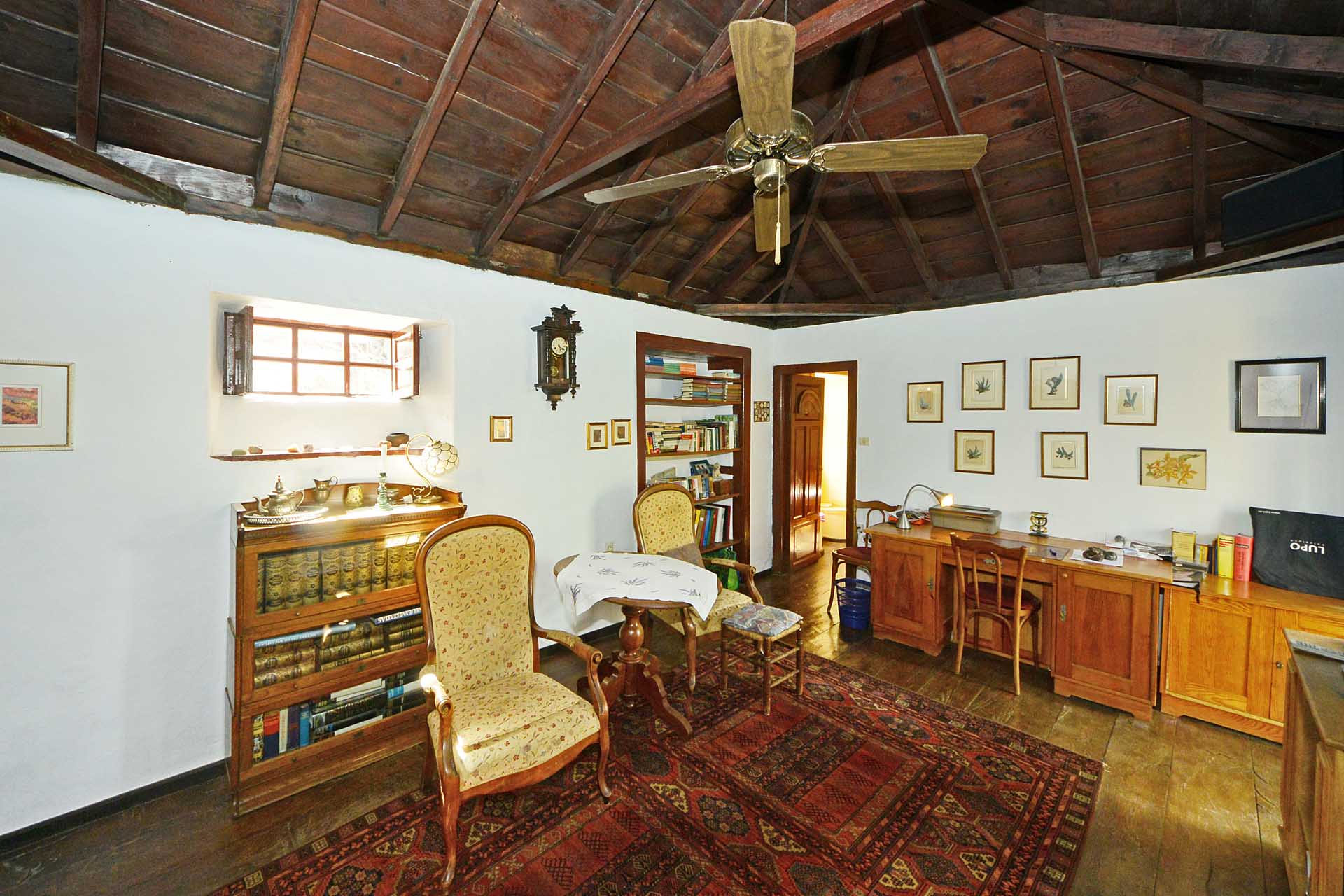 Dieses hat noch seinen originalen, rund 200 Jahre alten Dachstuhl aus Teaholz und auch den Original Fußboden aus breiten Dielen des gleichen Holzes. Er wird alternativ mit einem sehr schönen, aus Deutschland importierten Kaminofen mit Specksteinverkleidung oder einem elektrischen Heizkörper beheizt und hat einen Ausgang auf die zweite Terrasse sowie eine Türe zum Schlafzimmer.