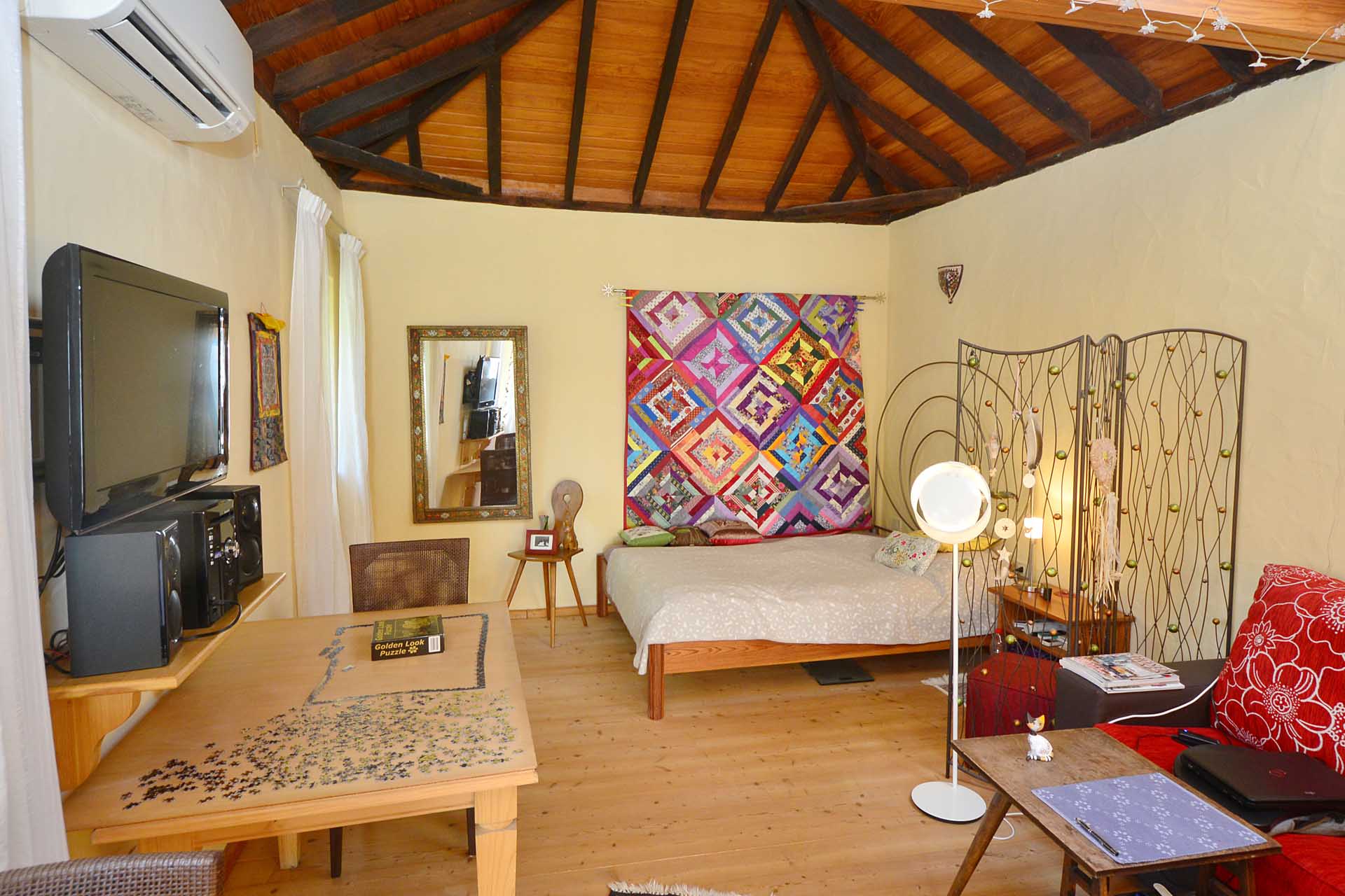 Das Gästehaus beherbergt ein großzügiges Studio (die Installationen für den Einbau einer Küche liegen bereits) und ein Badezimmer mit Massagedusche. Das ebenfalls erneuerte Dach und der Fußboden aus Massivholzdielen sorgen für kanarische Gemütlichkeit, einen Wärmepumpen-Klimaanlage für immer angenehme Temperaturen bei geringem Energieverbrauch.