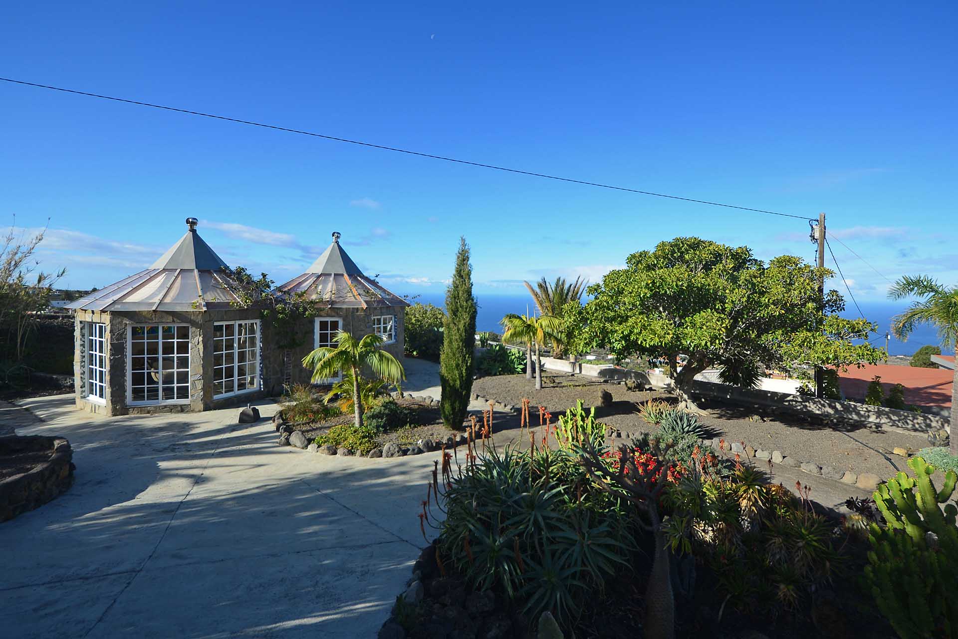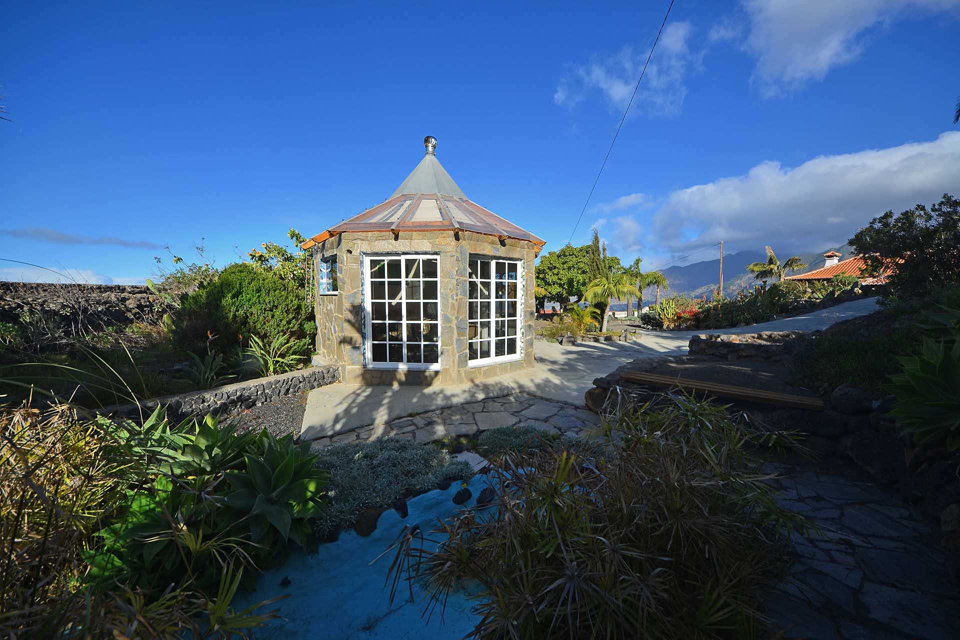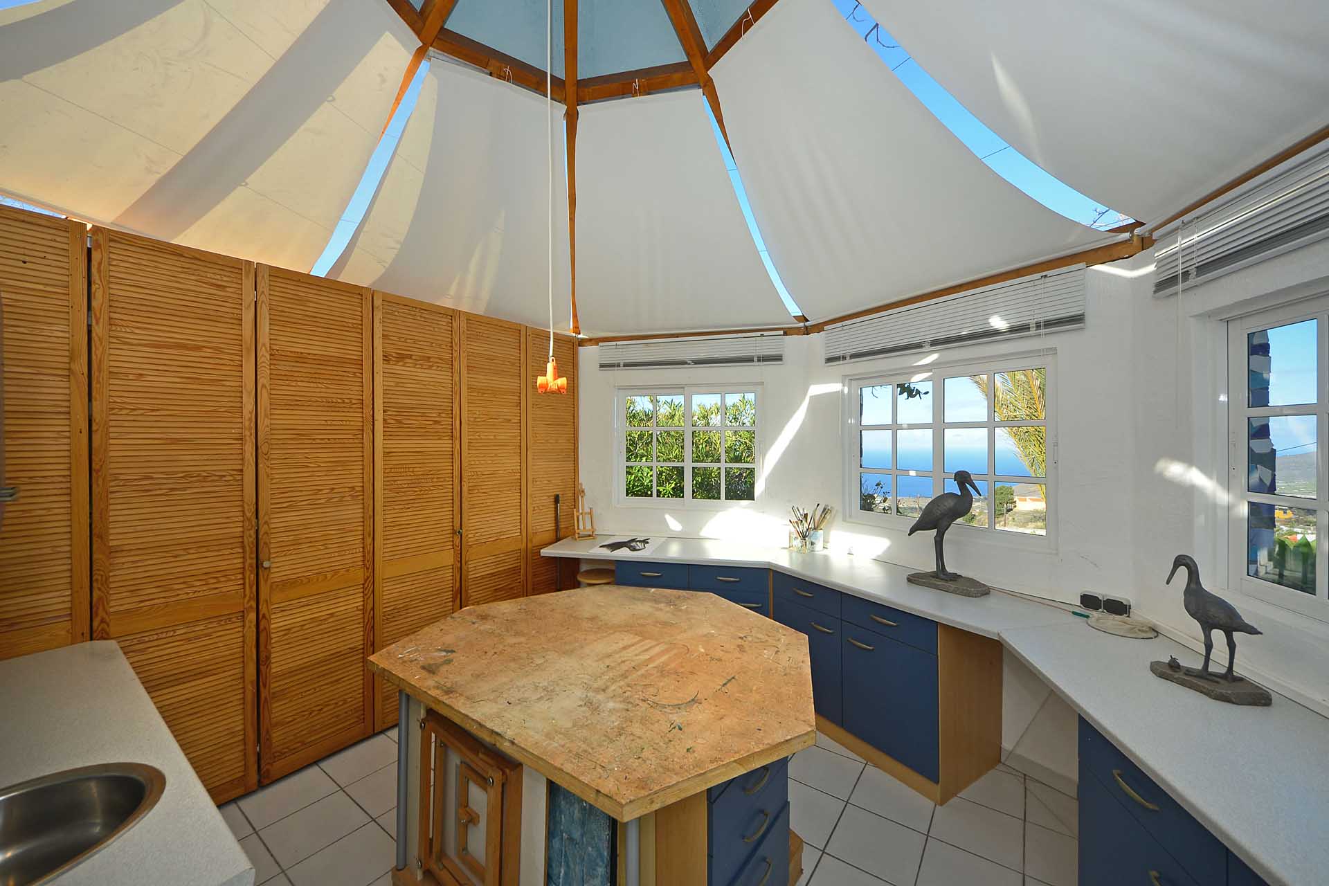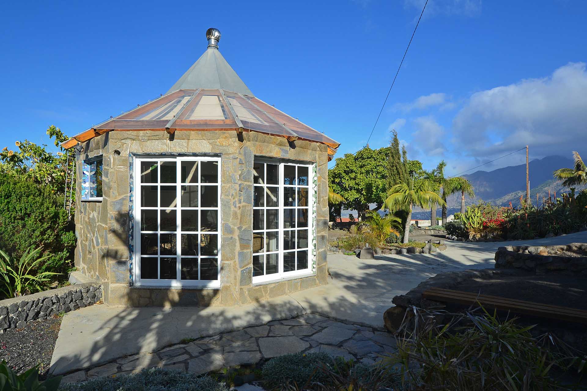 Durch einen pflegeleicht mit Palmen und Zierpflanzen sowie Sukkulenten und Kakteen angelegten Garten erreichen Sie auf gut befestigten Wegen das Ateliergebäude, das aus zwei sechseckigen Baukörpern, die mit einem Gäste-WC verbunden sind, besteht und mit zwei pyramidenförmigen Dächern aus Plexiglas bedacht wurde. Kletterseile erlauben Rankpflanzen, dieses zu beschatten und so zwei unvergleichliche Zimmer zu schaffen, in denen Sie direkt „im grünen“ wohnen oder arbeiten. Wer keine künstlerischen Arbeiten ausführen möchte, kann dieses interessante Gebäude gut als separates Gästehaus nutzen.