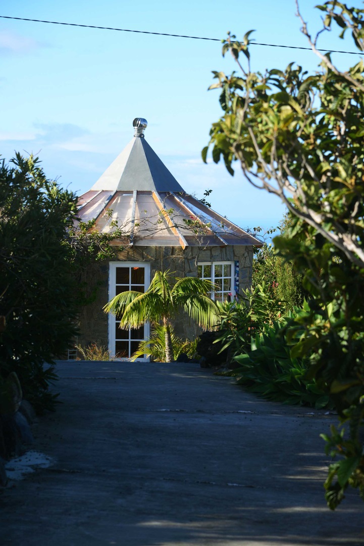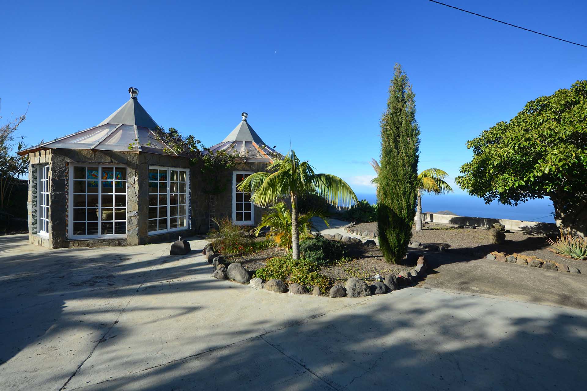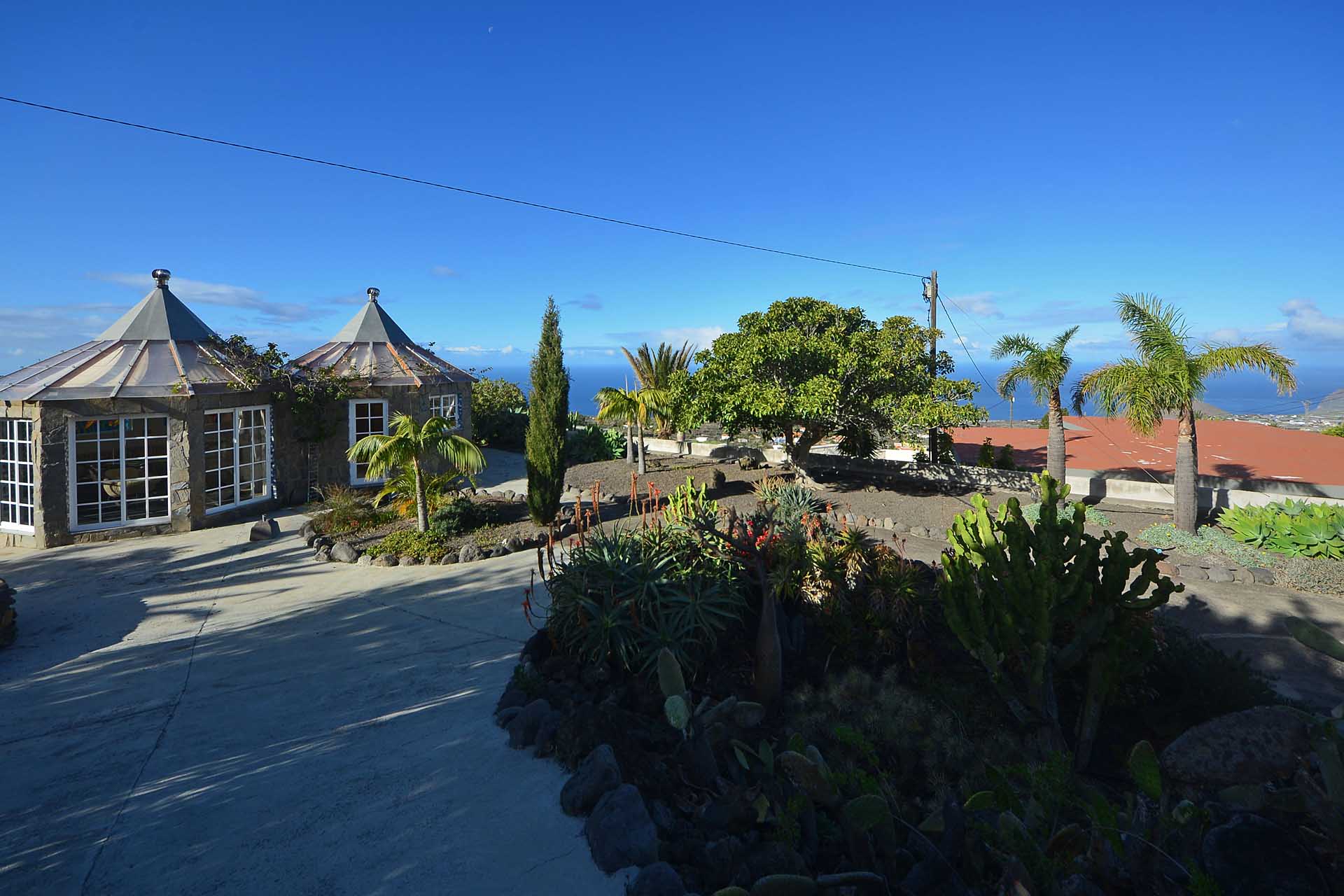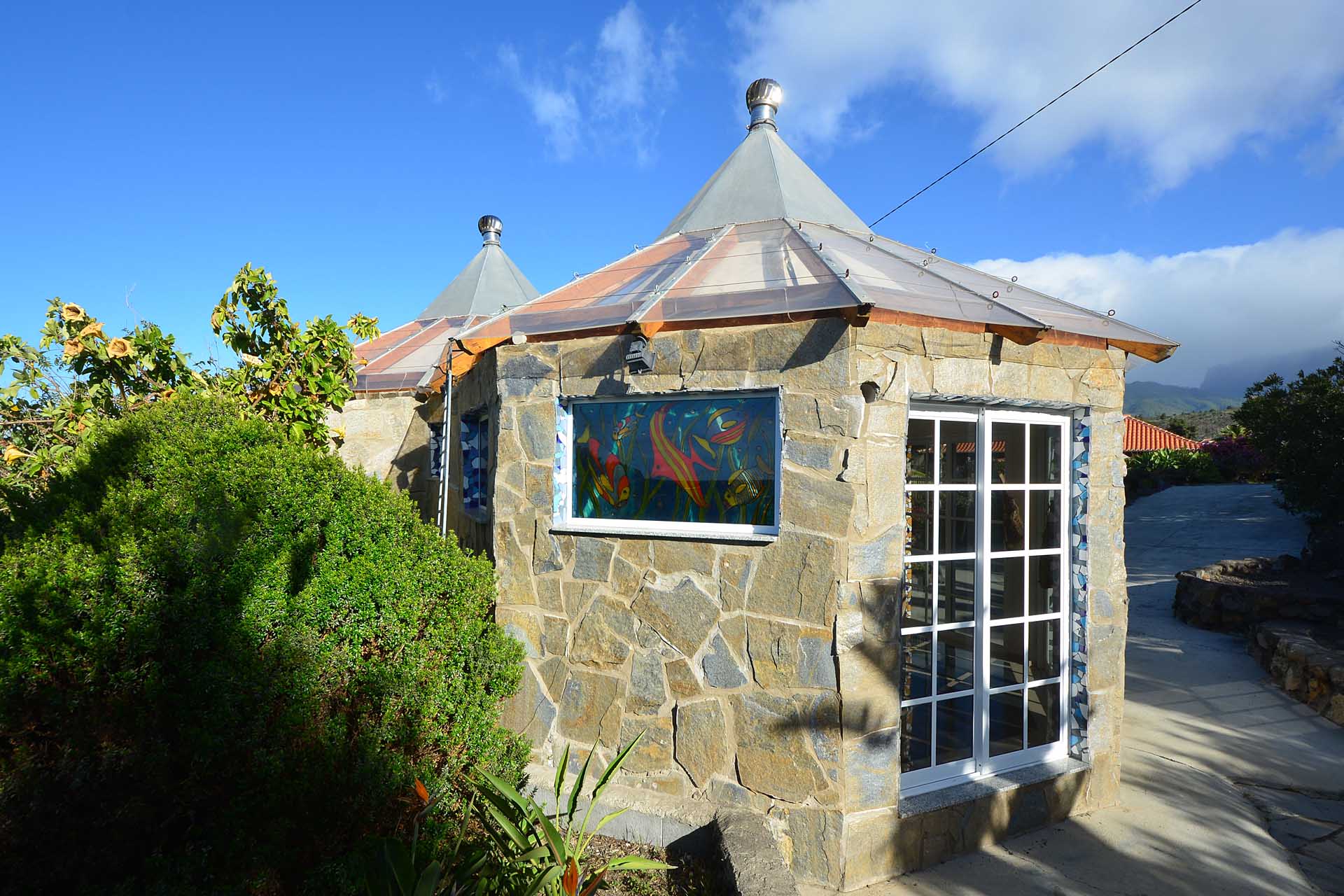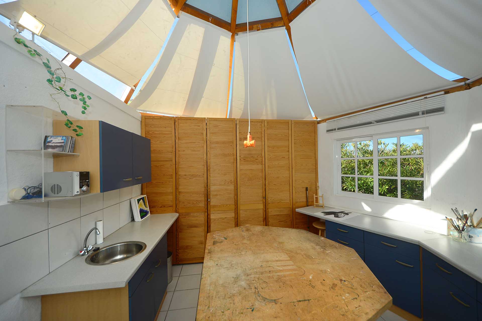 Durch einen pflegeleicht mit Palmen und Zierpflanzen sowie Sukkulenten und Kakteen angelegten Garten erreichen Sie auf gut befestigten Wegen das Ateliergebäude, das aus zwei sechseckigen Baukörpern, die mit einem Gäste-WC verbunden sind, besteht und mit zwei pyramidenförmigen Dächern aus Plexiglas bedacht wurde. Kletterseile erlauben Rankpflanzen, dieses zu beschatten und so zwei unvergleichliche Zimmer zu schaffen, in denen Sie direkt „im grünen“ wohnen oder arbeiten. Wer keine künstlerischen Arbeiten ausführen möchte, kann dieses interessante Gebäude gut als separates Gästehaus nutzen.