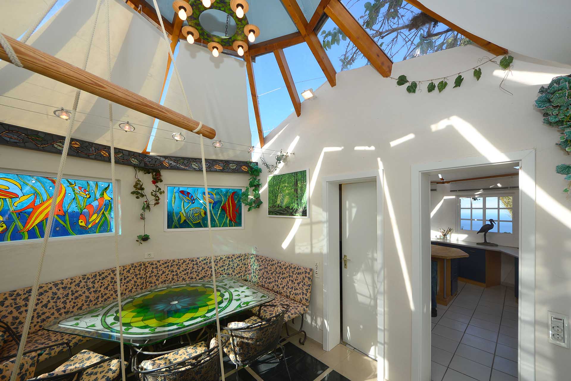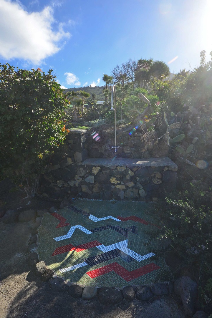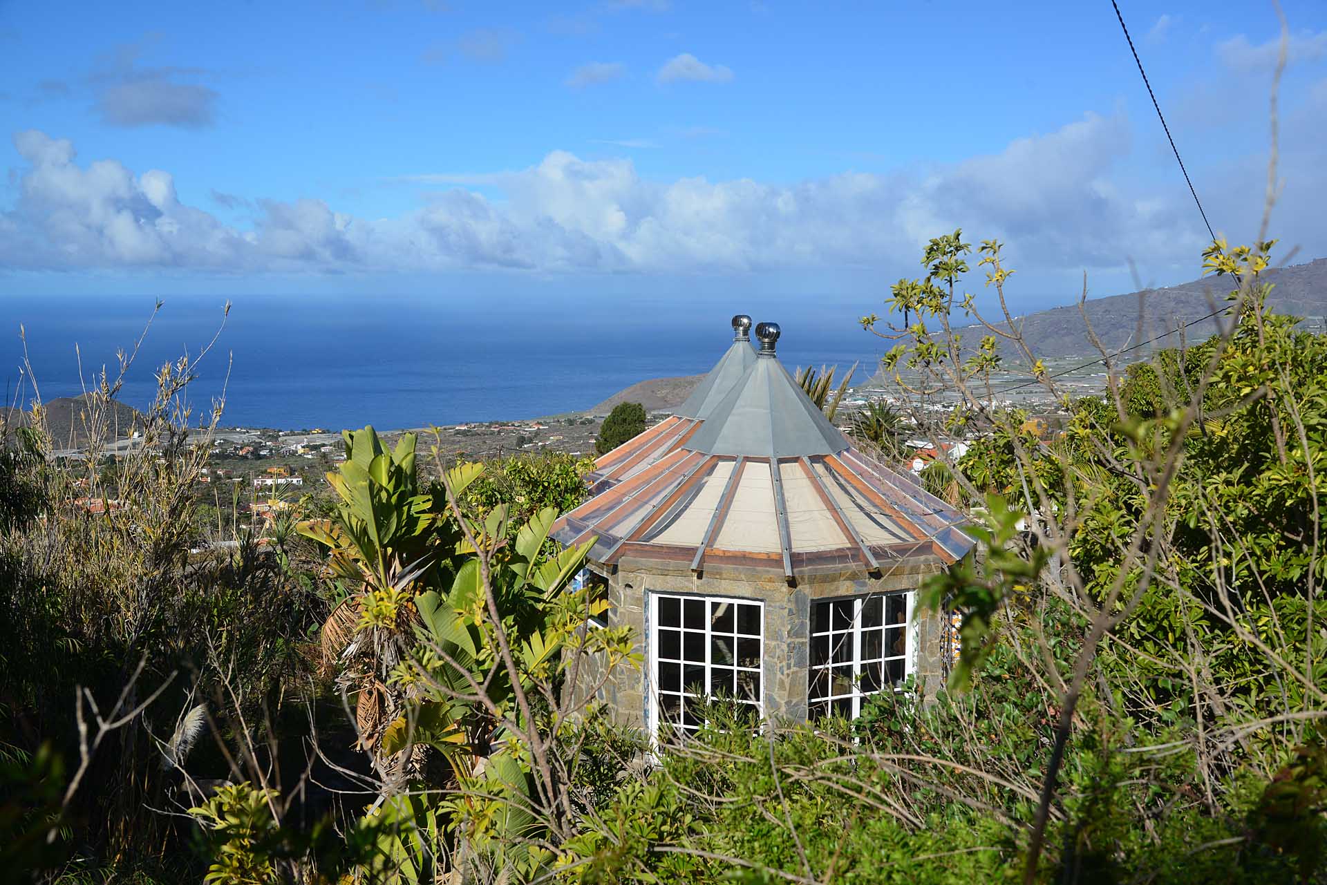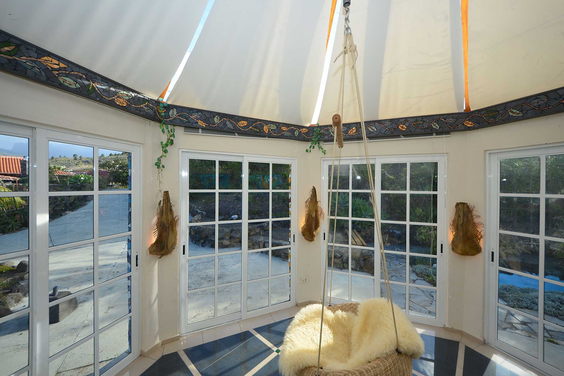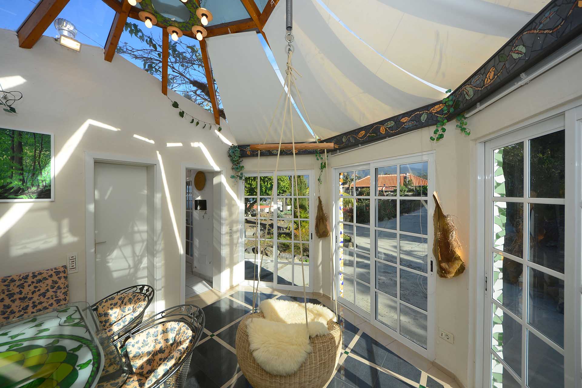 Durch einen pflegeleicht mit Palmen und Zierpflanzen sowie Sukkulenten und Kakteen angelegten Garten erreichen Sie auf gut befestigten Wegen das Ateliergebäude, das aus zwei sechseckigen Baukörpern, die mit einem Gäste-WC verbunden sind, besteht und mit zwei pyramidenförmigen Dächern aus Plexiglas bedacht wurde. Kletterseile erlauben Rankpflanzen, dieses zu beschatten und so zwei unvergleichliche Zimmer zu schaffen, in denen Sie direkt „im grünen“ wohnen oder arbeiten. Wer keine künstlerischen Arbeiten ausführen möchte, kann dieses interessante Gebäude gut als separates Gästehaus nutzen.
