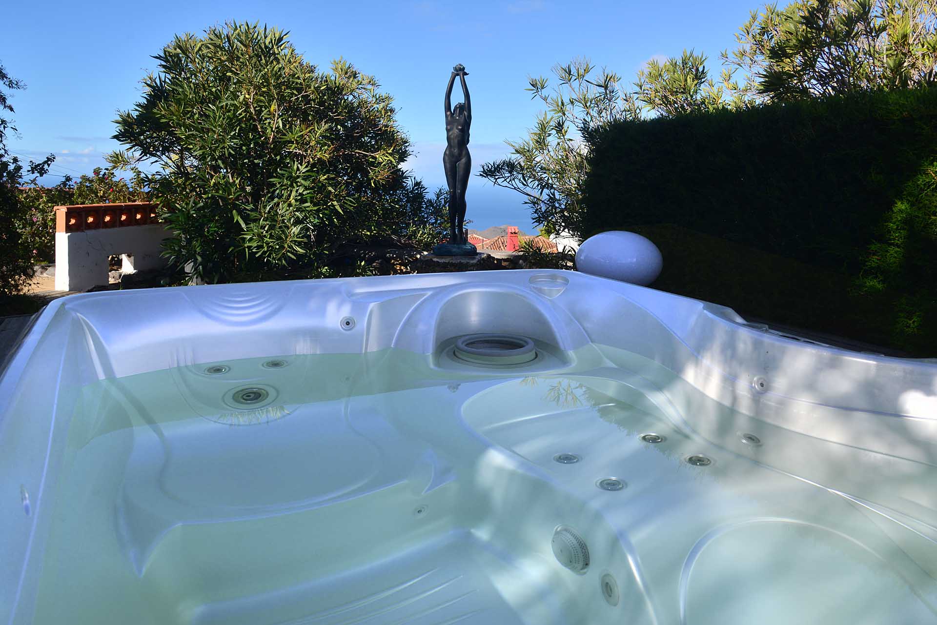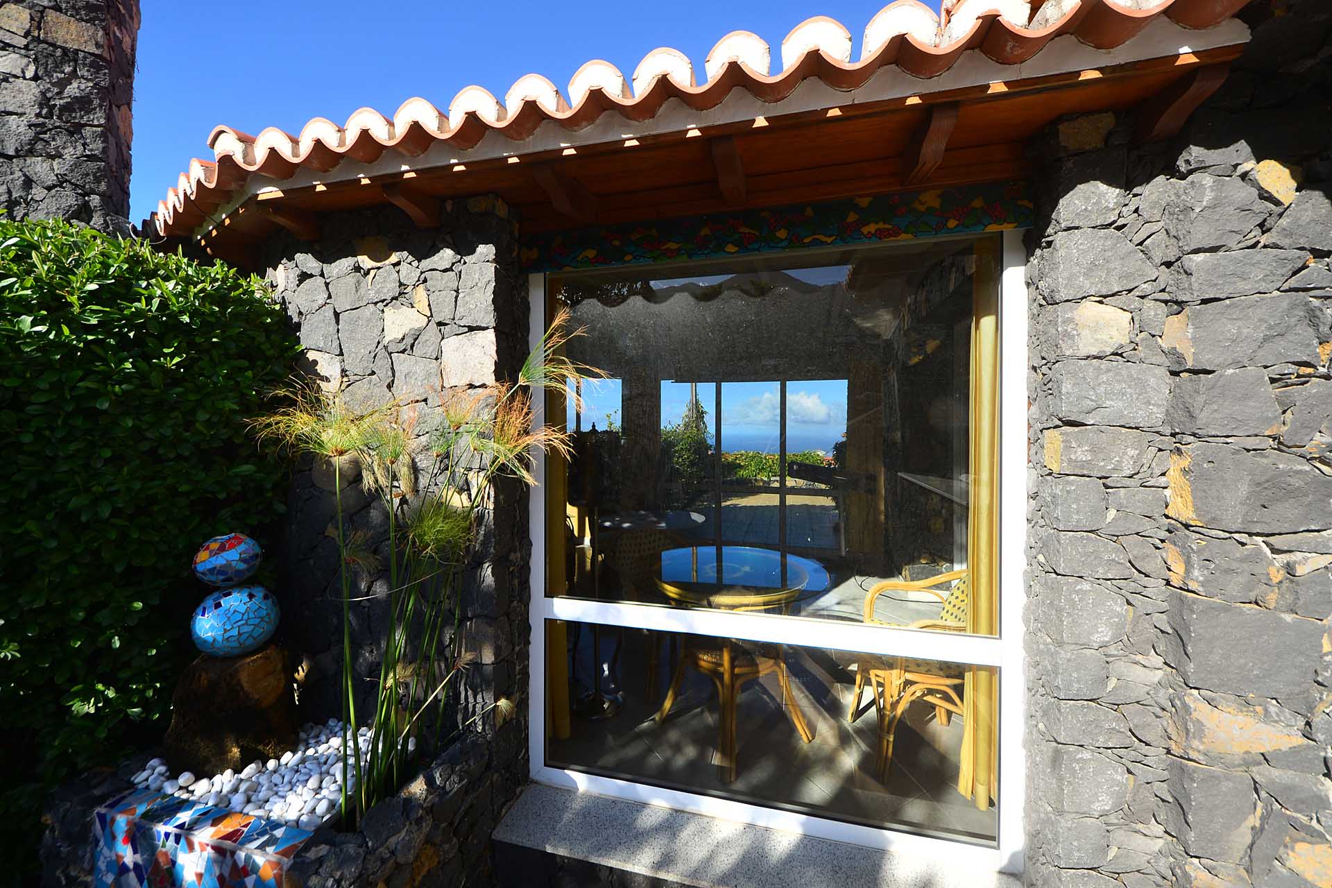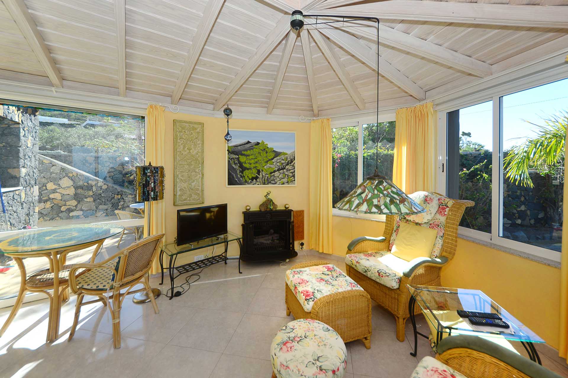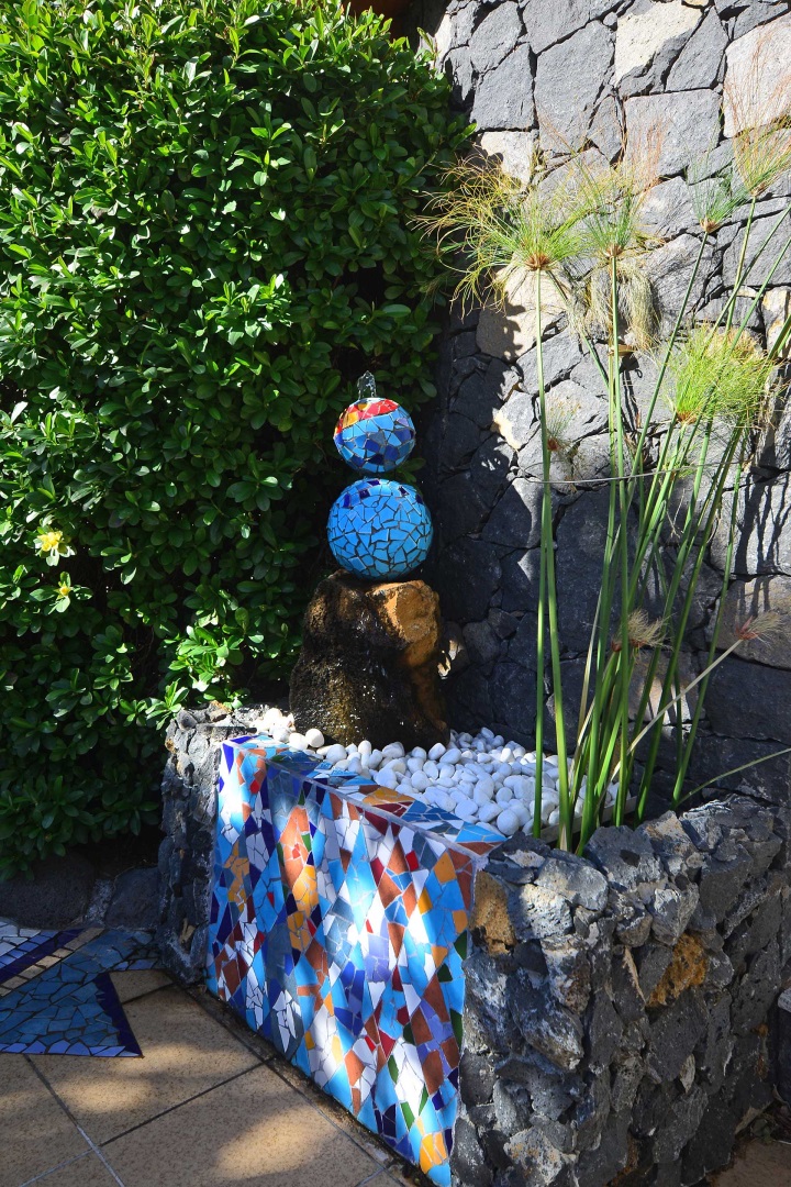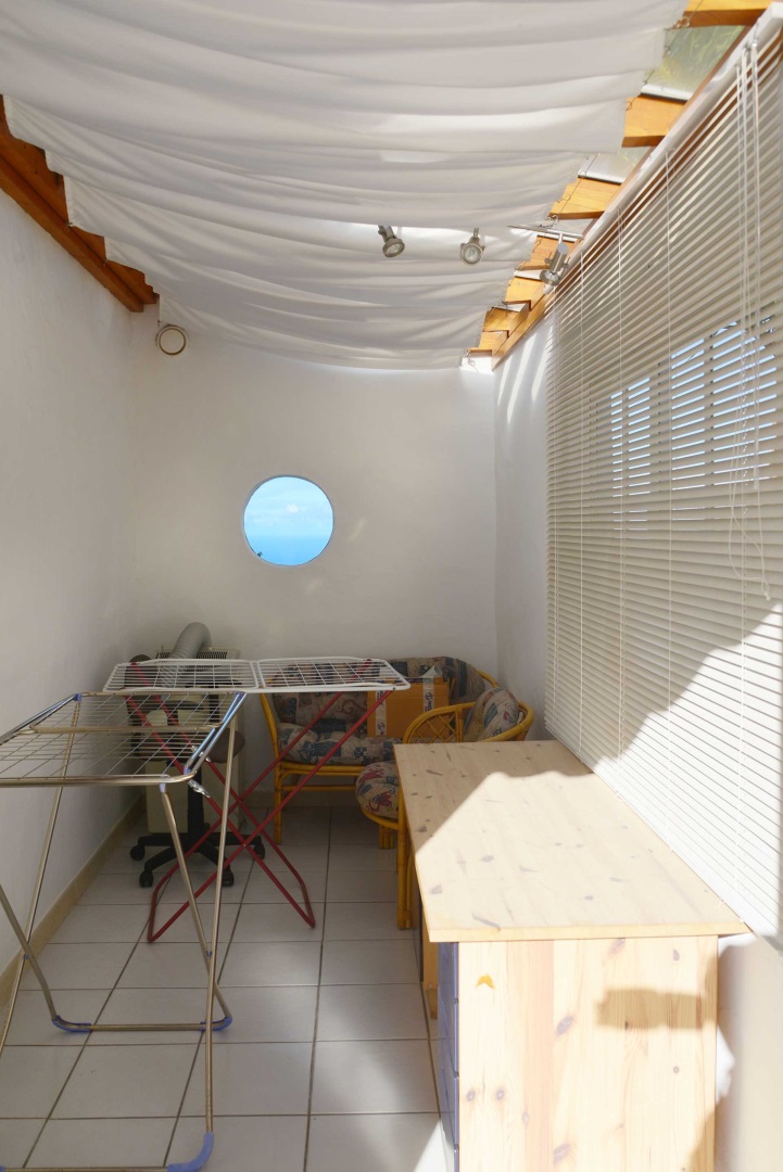 Durch einen pflegeleicht mit Palmen und Zierpflanzen sowie Sukkulenten und Kakteen angelegten Garten erreichen Sie auf gut befestigten Wegen das Ateliergebäude, das aus zwei sechseckigen Baukörpern, die mit einem Gäste-WC verbunden sind, besteht und mit zwei pyramidenförmigen Dächern aus Plexiglas bedacht wurde. Kletterseile erlauben Rankpflanzen, dieses zu beschatten und so zwei unvergleichliche Zimmer zu schaffen, in denen Sie direkt „im grünen“ wohnen oder arbeiten. Wer keine künstlerischen Arbeiten ausführen möchte, kann dieses interessante Gebäude gut als separates Gästehaus nutzen.