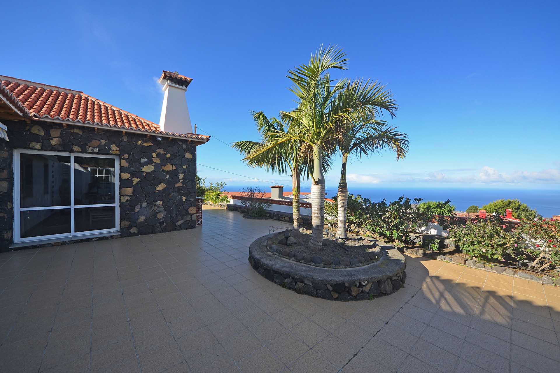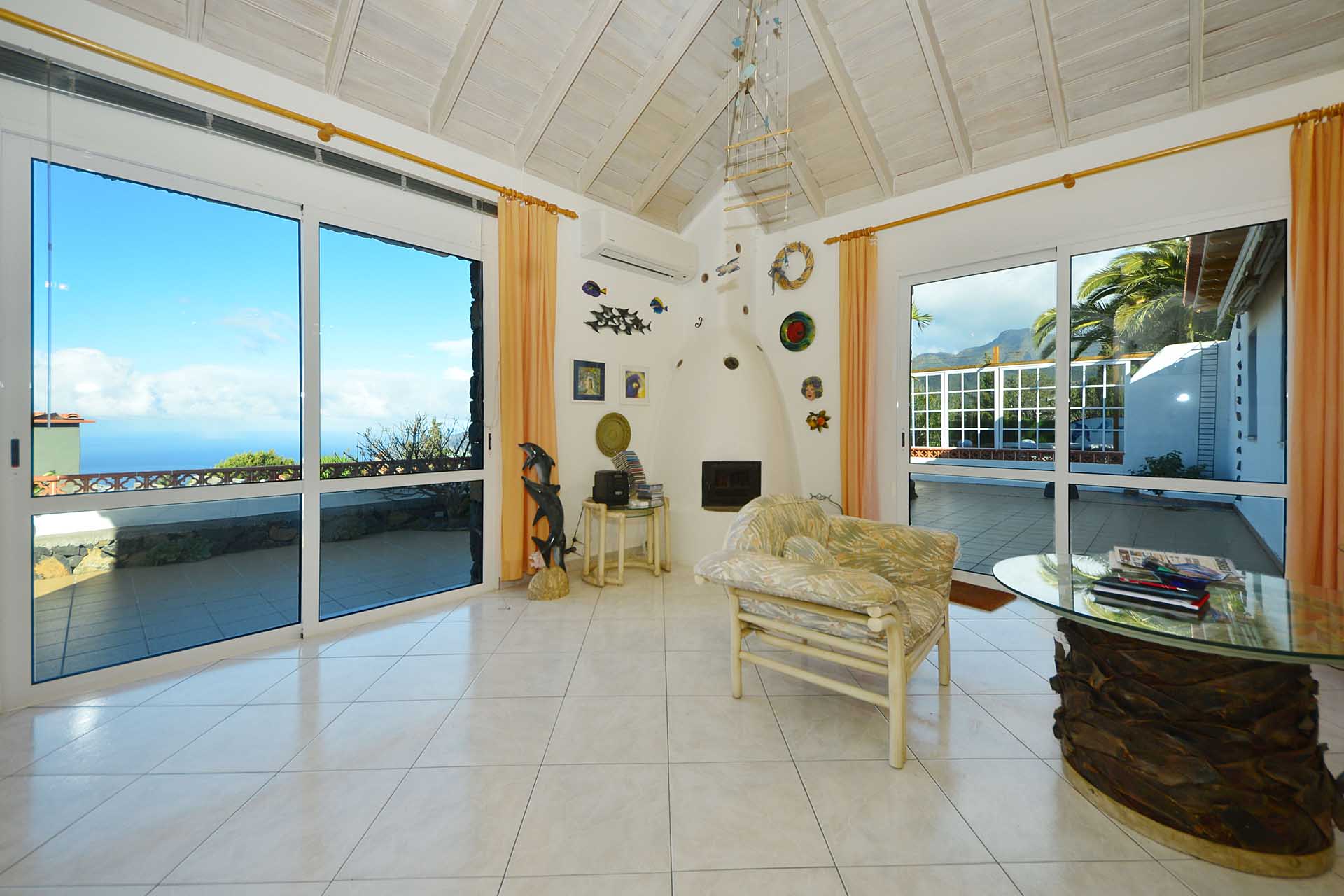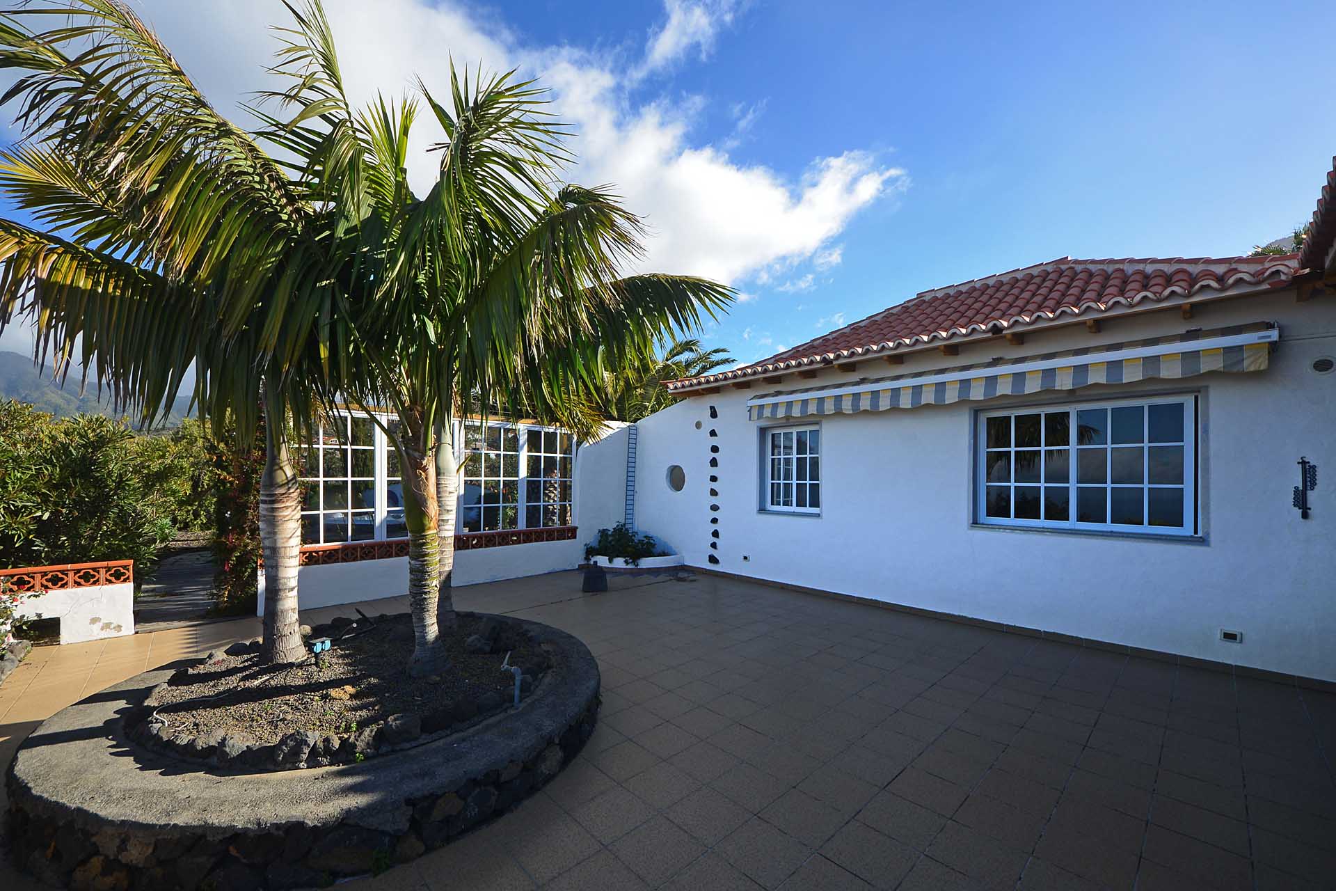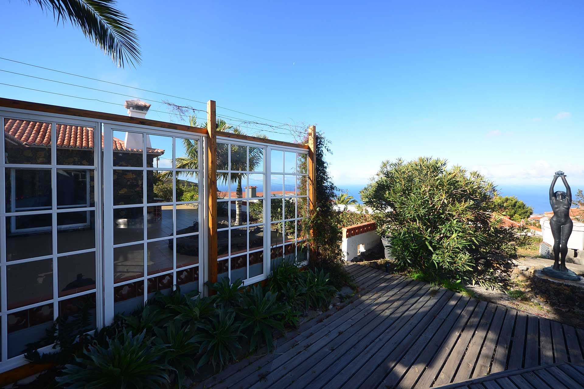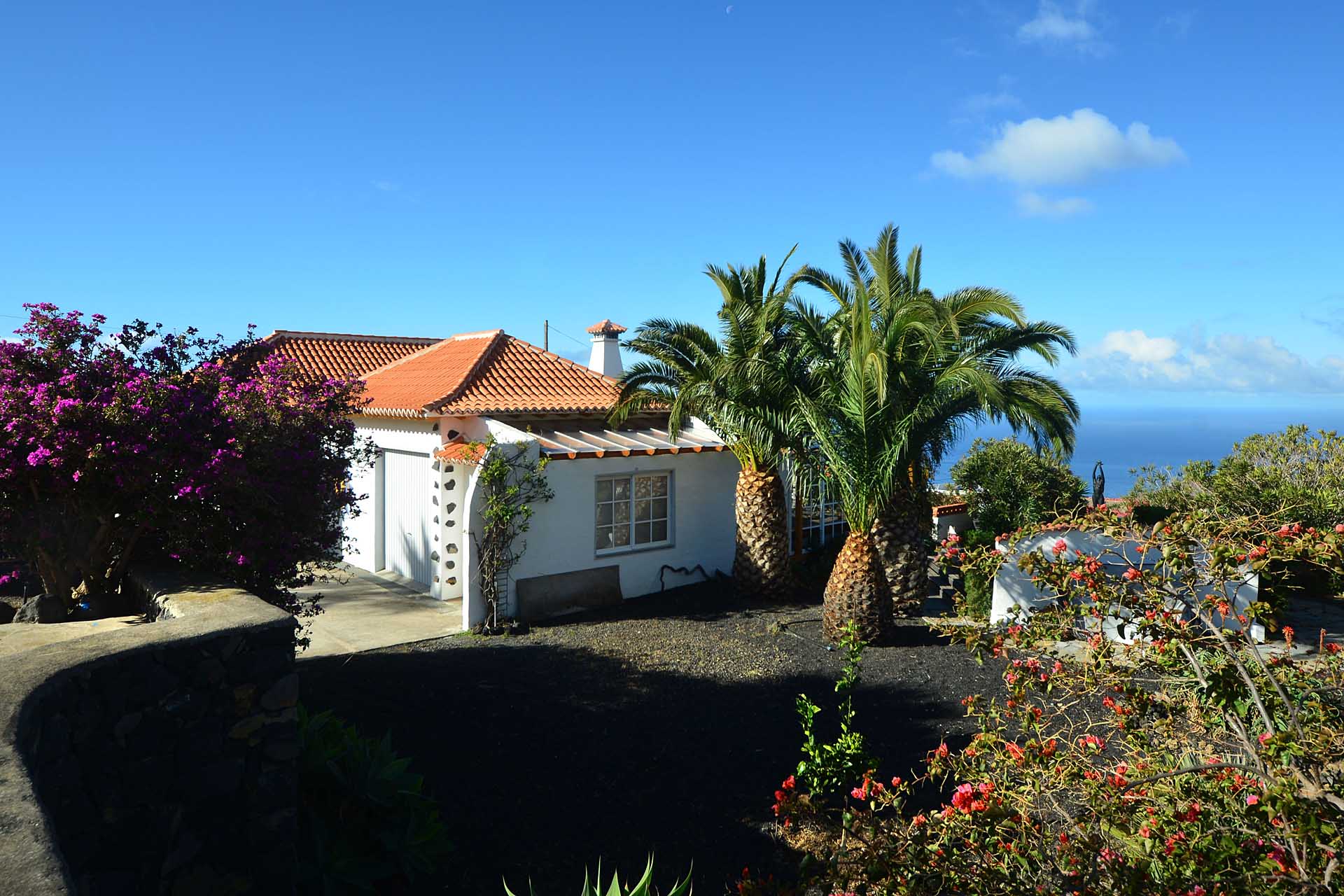 Sie betreten das Grundstück über eine imposante Palmenallee und erreichen zunächst das Haupthaus mit integrierter die Garage. Das barrierefrei gebaute Haupthaus (ca. 140 m² Grundfläche) besticht durch ein (für hiesige Verhältnisse) außerordentlich großes Wohnzimmer mit herrlichem Atlantikblick durch große, bodentiefe Fenster/Terrassentüren und einen geräumigen Alkoven, der familiären Gästen als weiteres Schlafzimmer dienen kann.