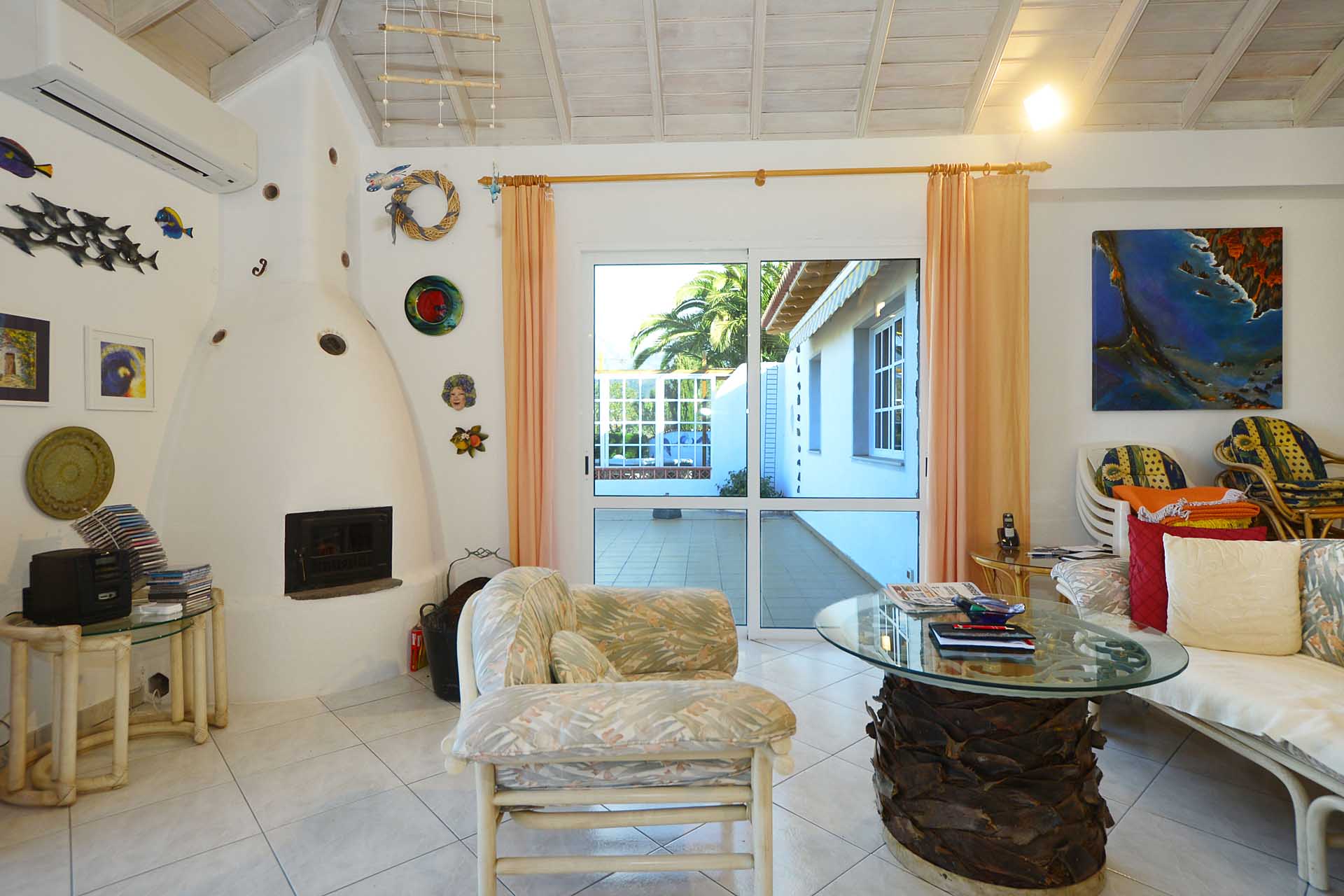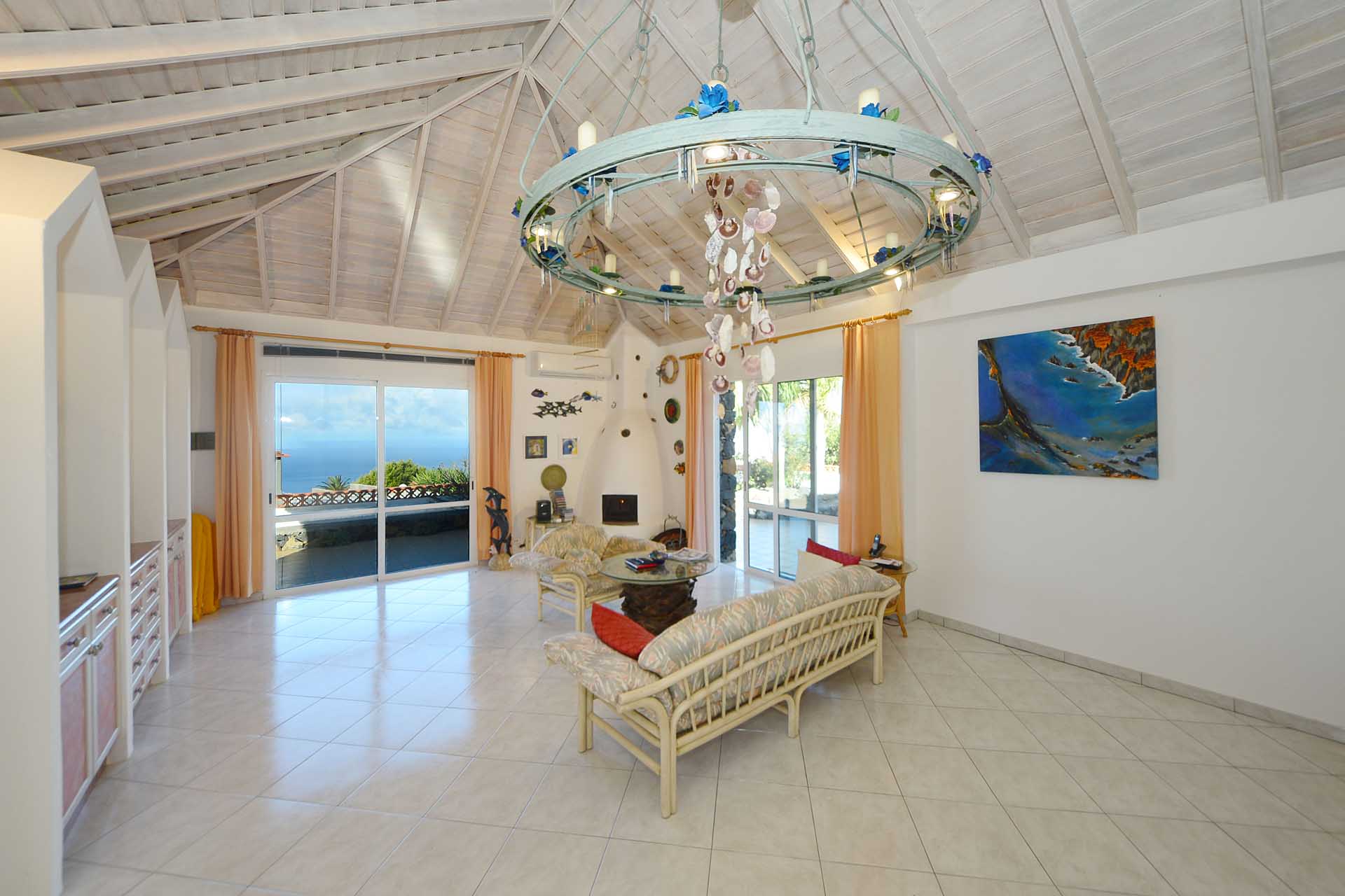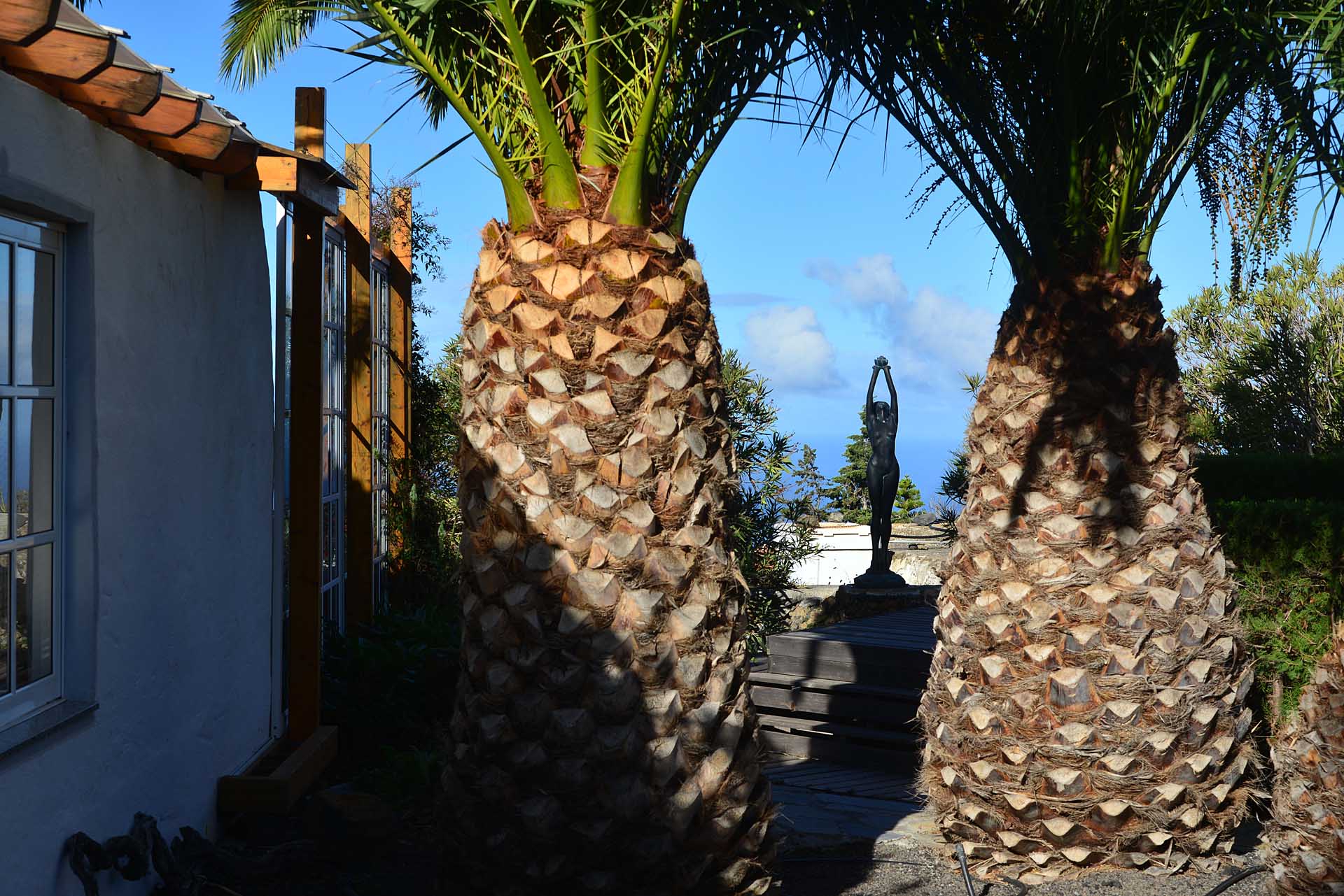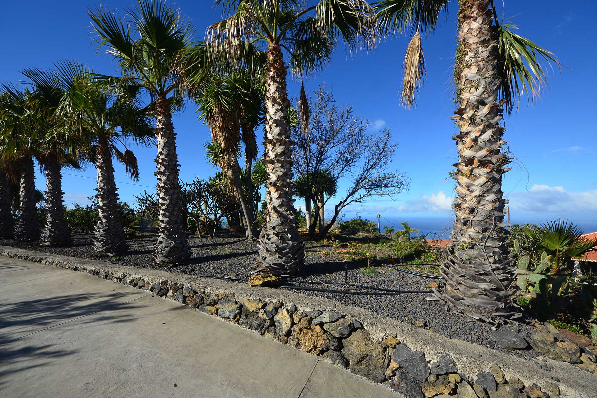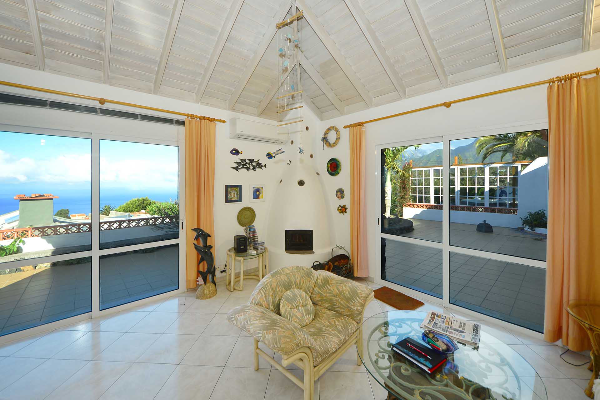Sie betreten das Grundstück über eine imposante Palmenallee und erreichen zunächst das Haupthaus mit integrierter die Garage. Das barrierefrei gebaute Haupthaus (ca. 140 m² Grundfläche) besticht durch ein (für hiesige Verhältnisse) außerordentlich großes Wohnzimmer mit herrlichem Atlantikblick durch große, bodentiefe Fenster/Terrassentüren und einen geräumigen Alkoven, der familiären Gästen als weiteres Schlafzimmer dienen kann.