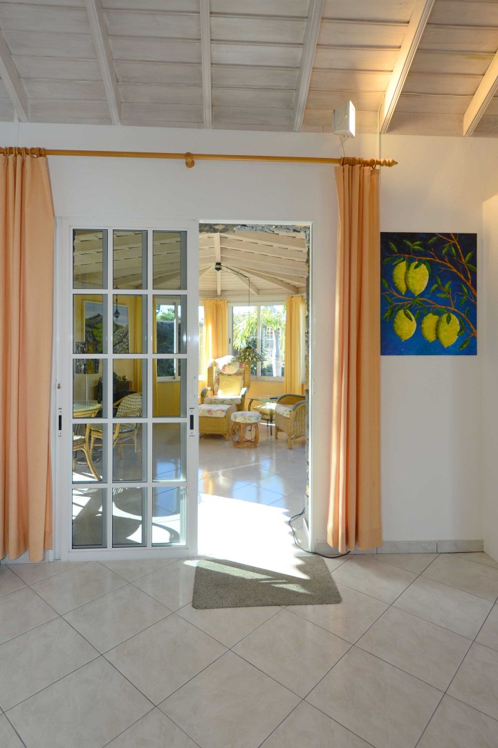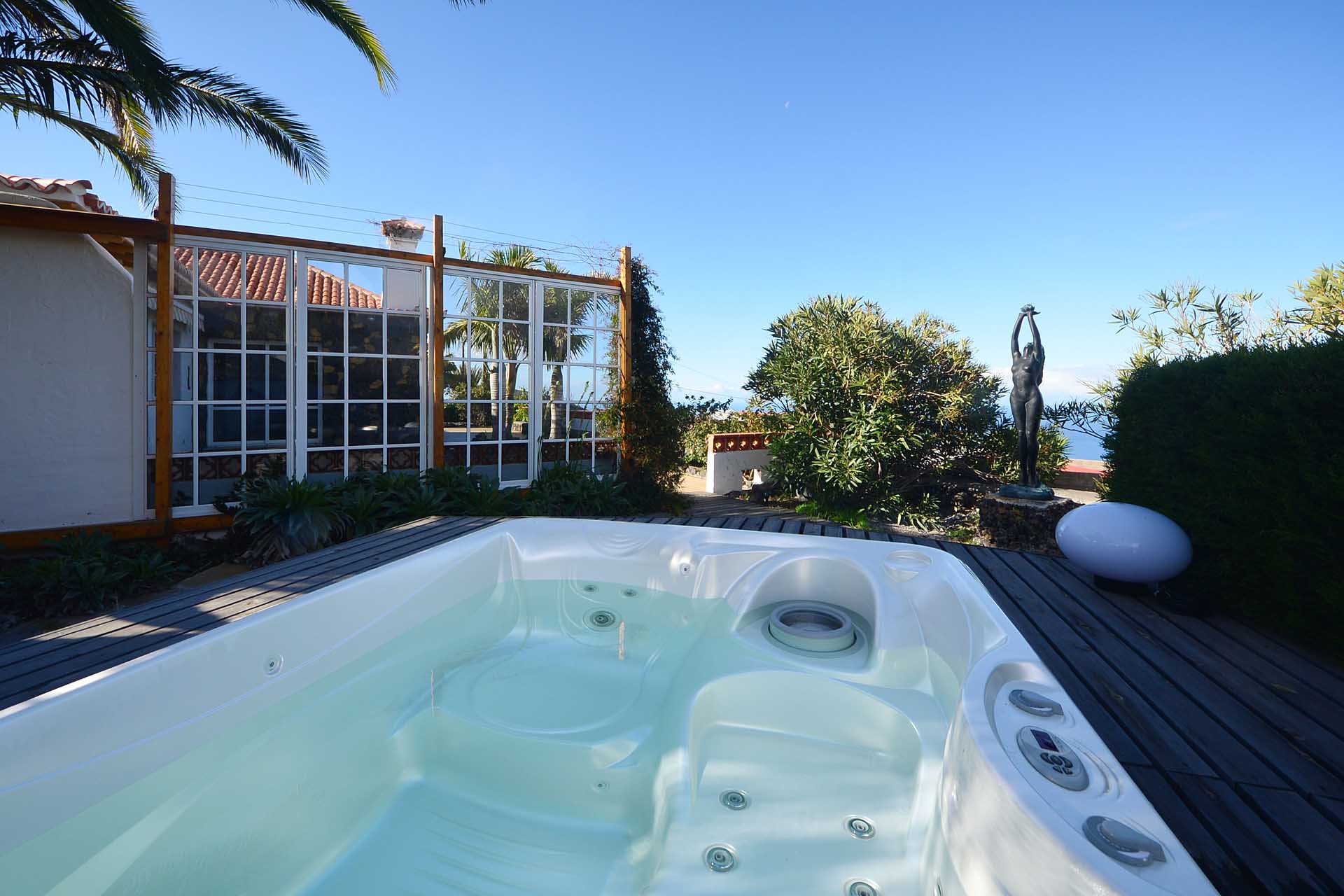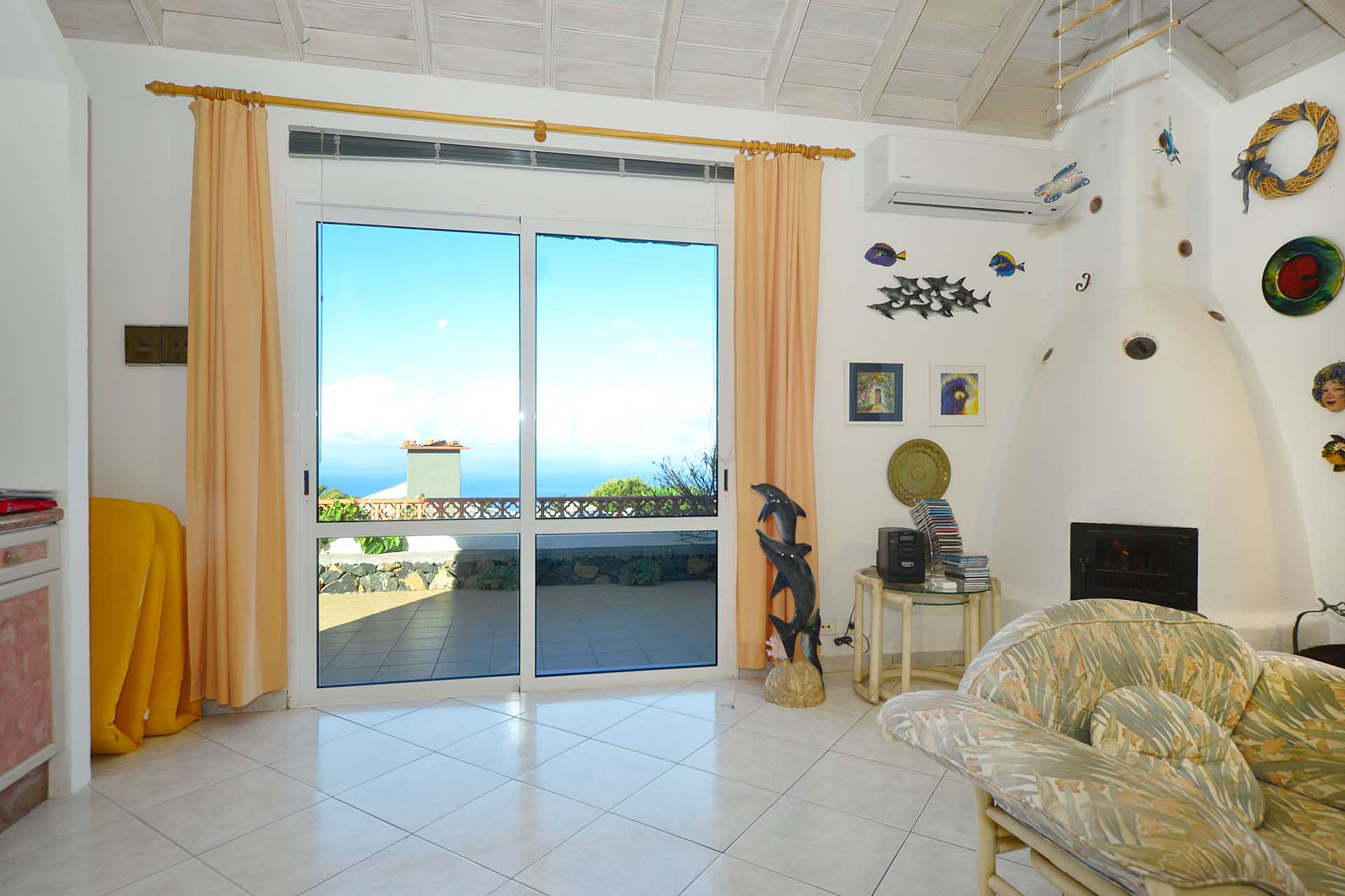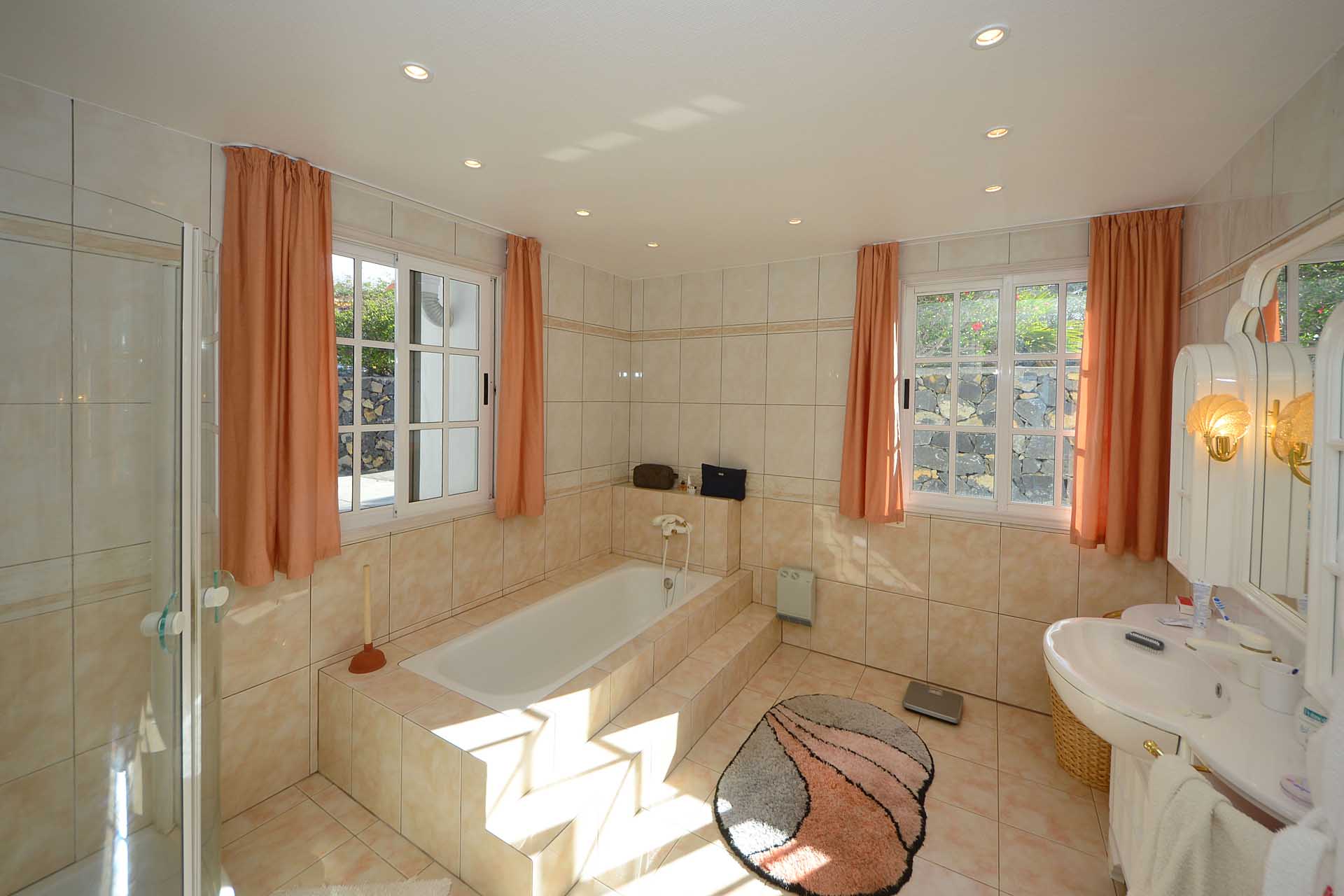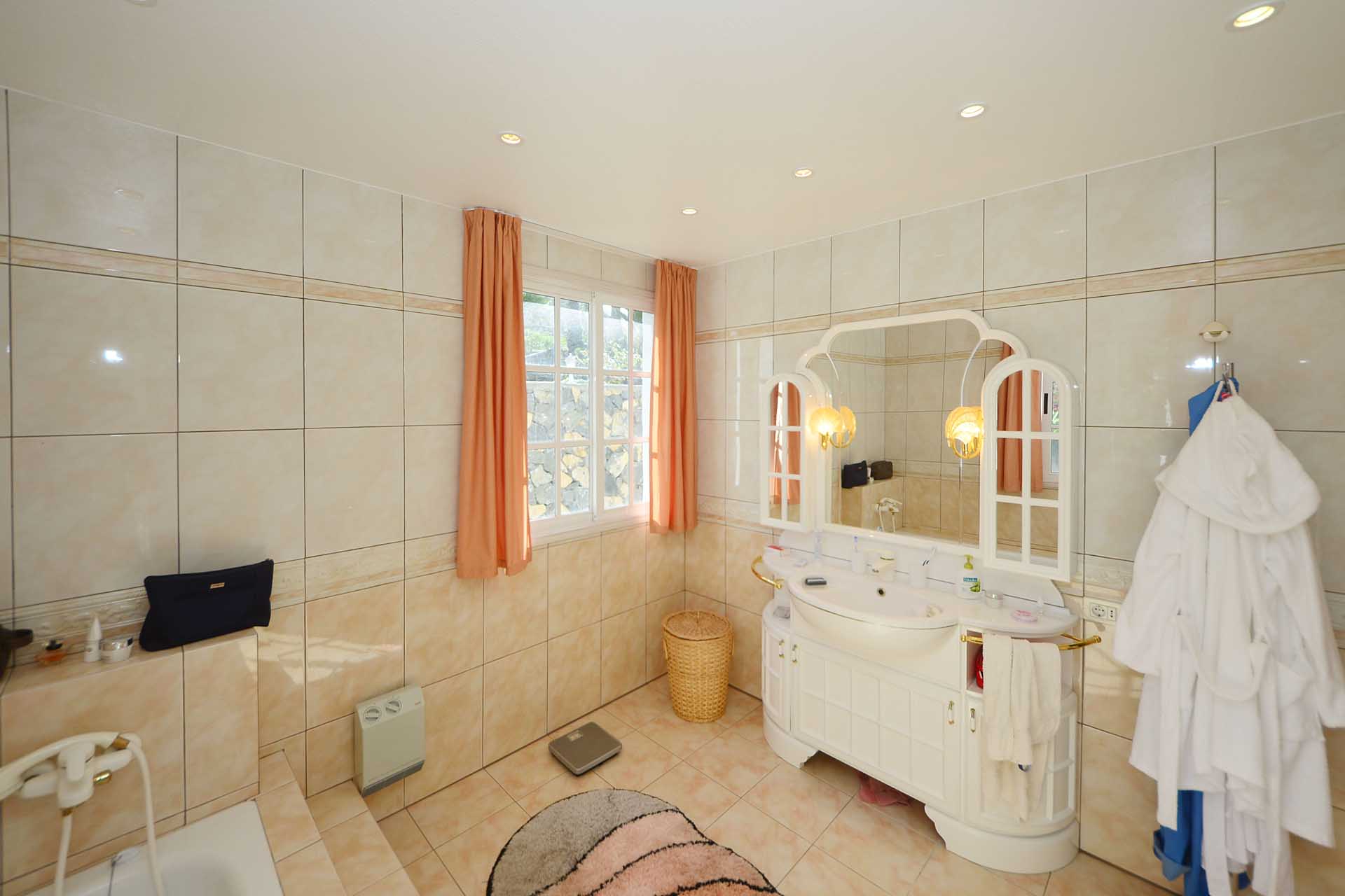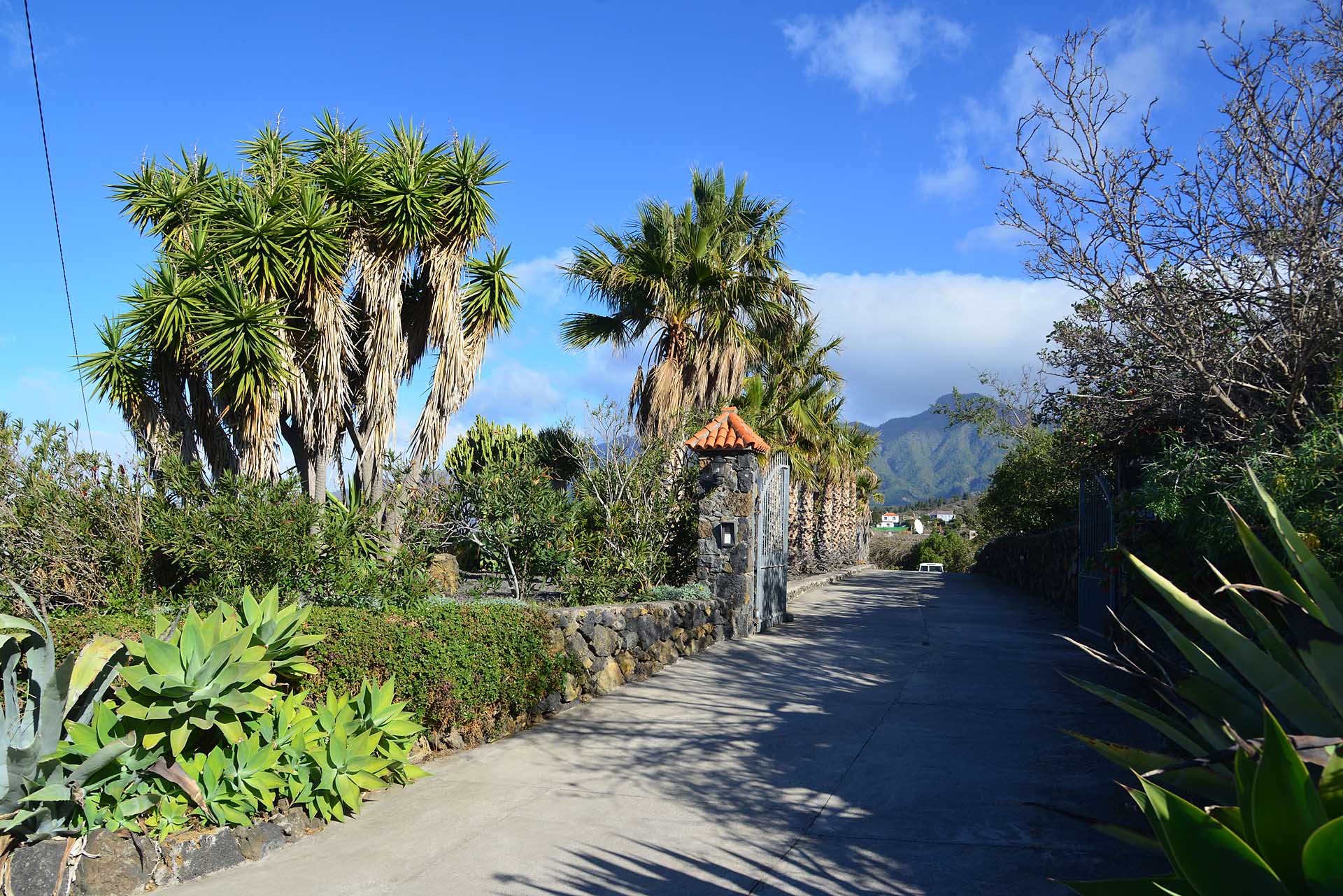 Sie betreten das Grundstück über eine imposante Palmenallee und erreichen zunächst das Haupthaus mit integrierter die Garage. Das barrierefrei gebaute Haupthaus (ca. 140 m² Grundfläche) besticht durch ein (für hiesige Verhältnisse) außerordentlich großes Wohnzimmer mit herrlichem Atlantikblick durch große, bodentiefe Fenster/Terrassentüren und einen geräumigen Alkoven, der familiären Gästen als weiteres Schlafzimmer dienen kann.