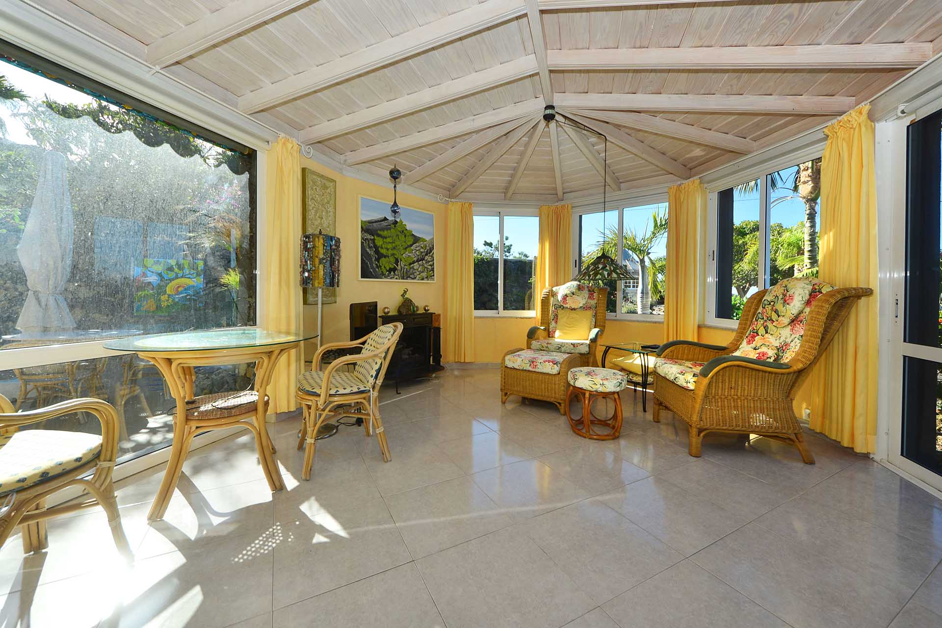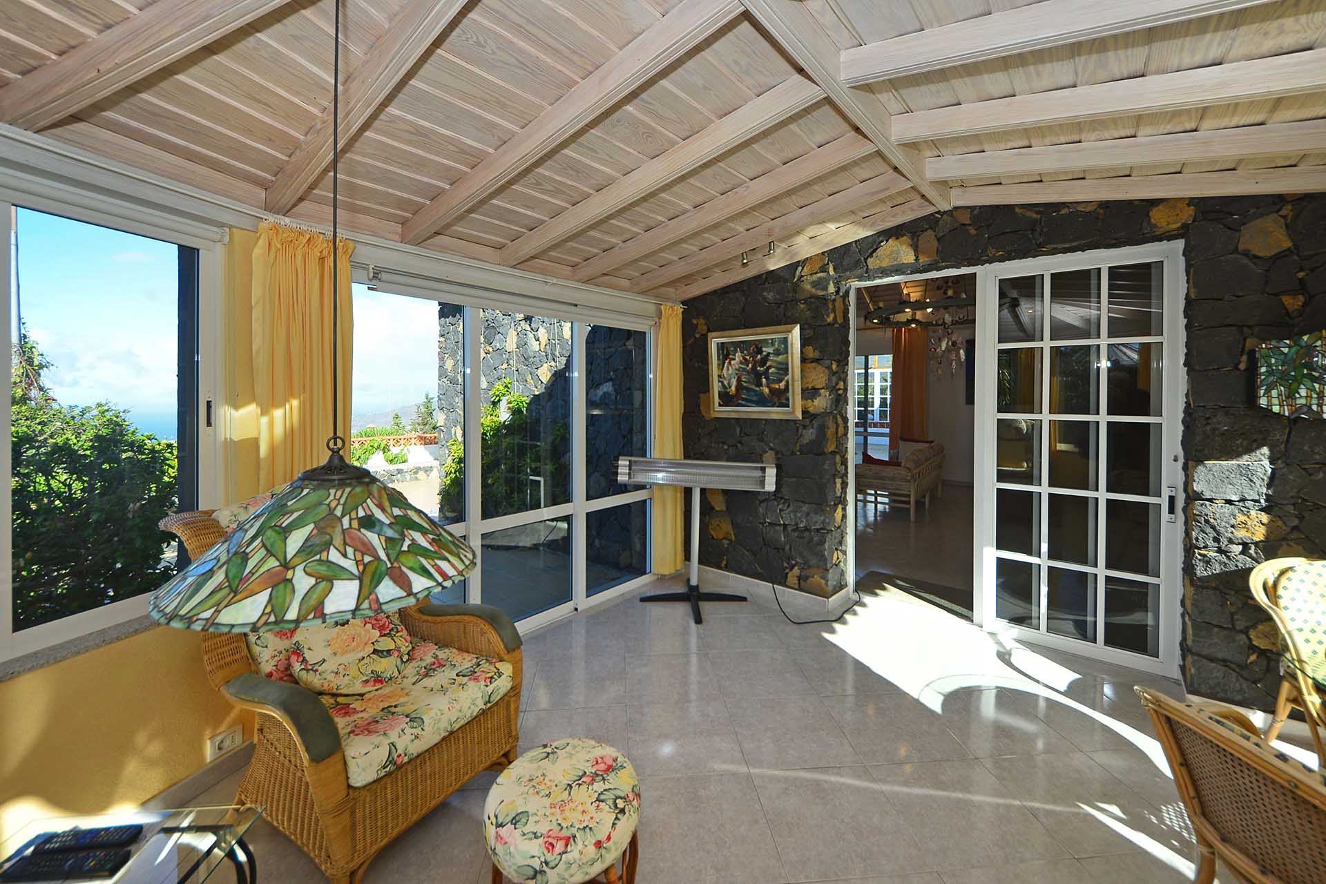 Der angrenzende Wintergarten ist der ideale Rückzugsort, wenn Sie ein Buch lesen möchten, oder den Morgenkaffe bei den ersten Sonnenstrahlen genießen möchten – oder den Sundowner beim Sonnenuntergang, denn er verfügt über große Fenster nach Osten wie Westen.