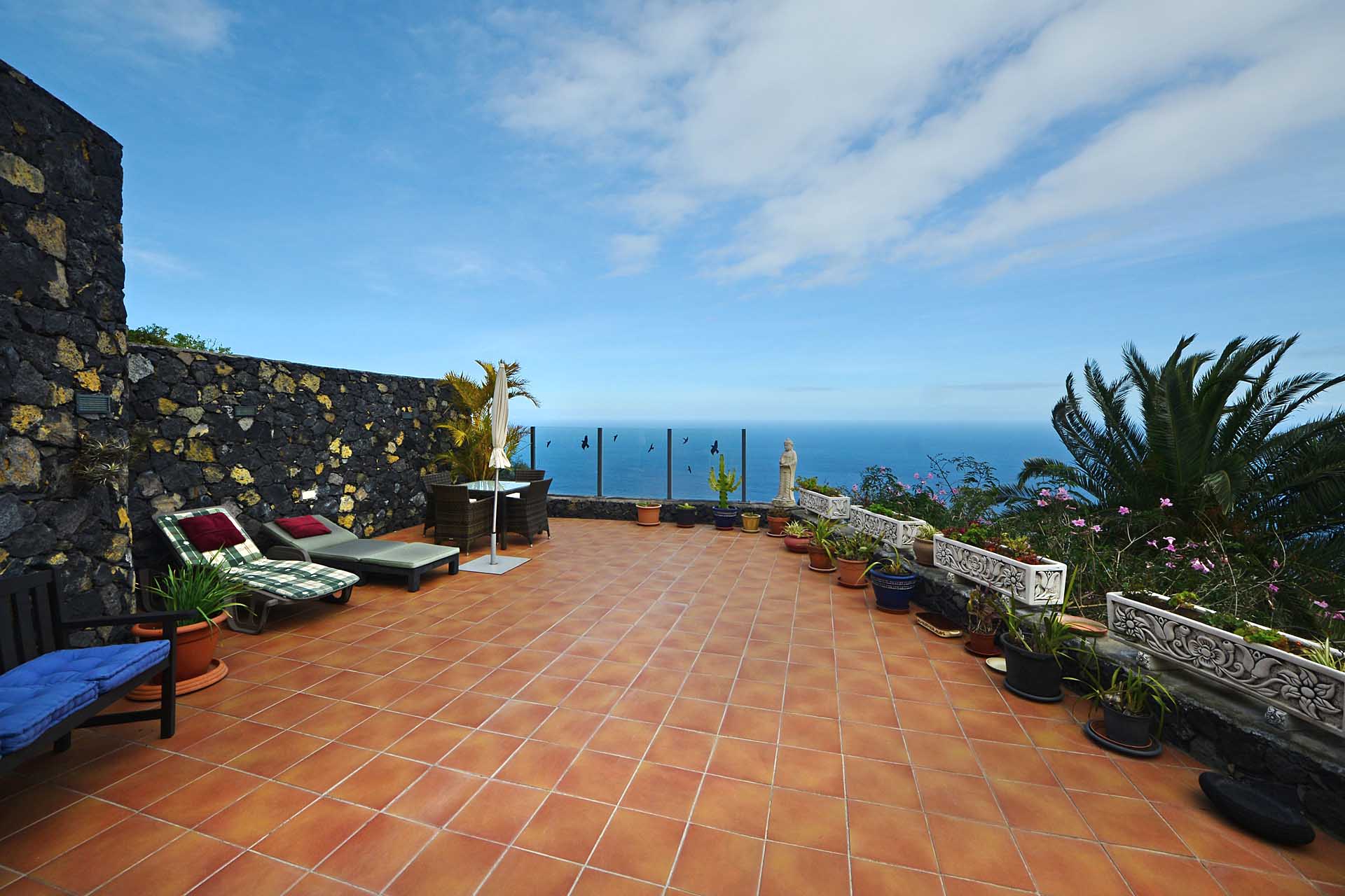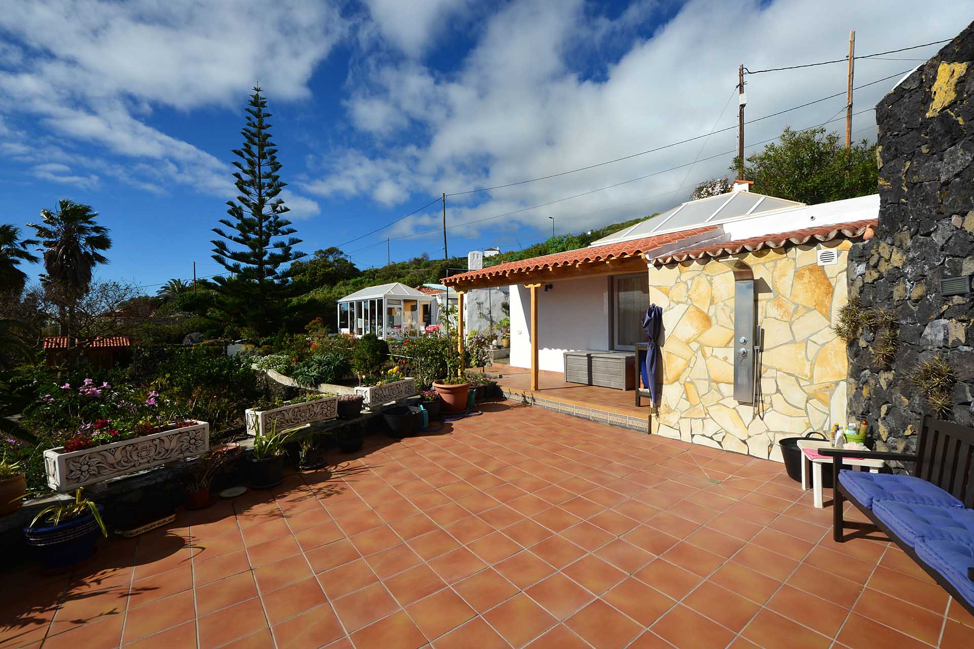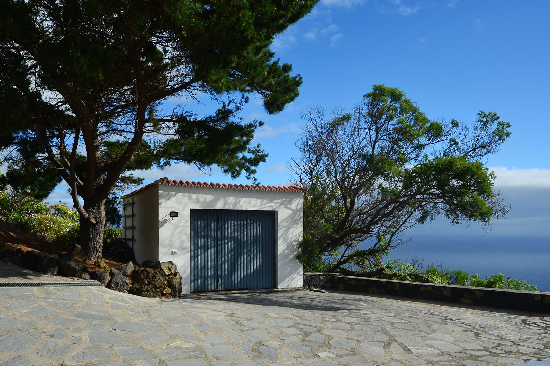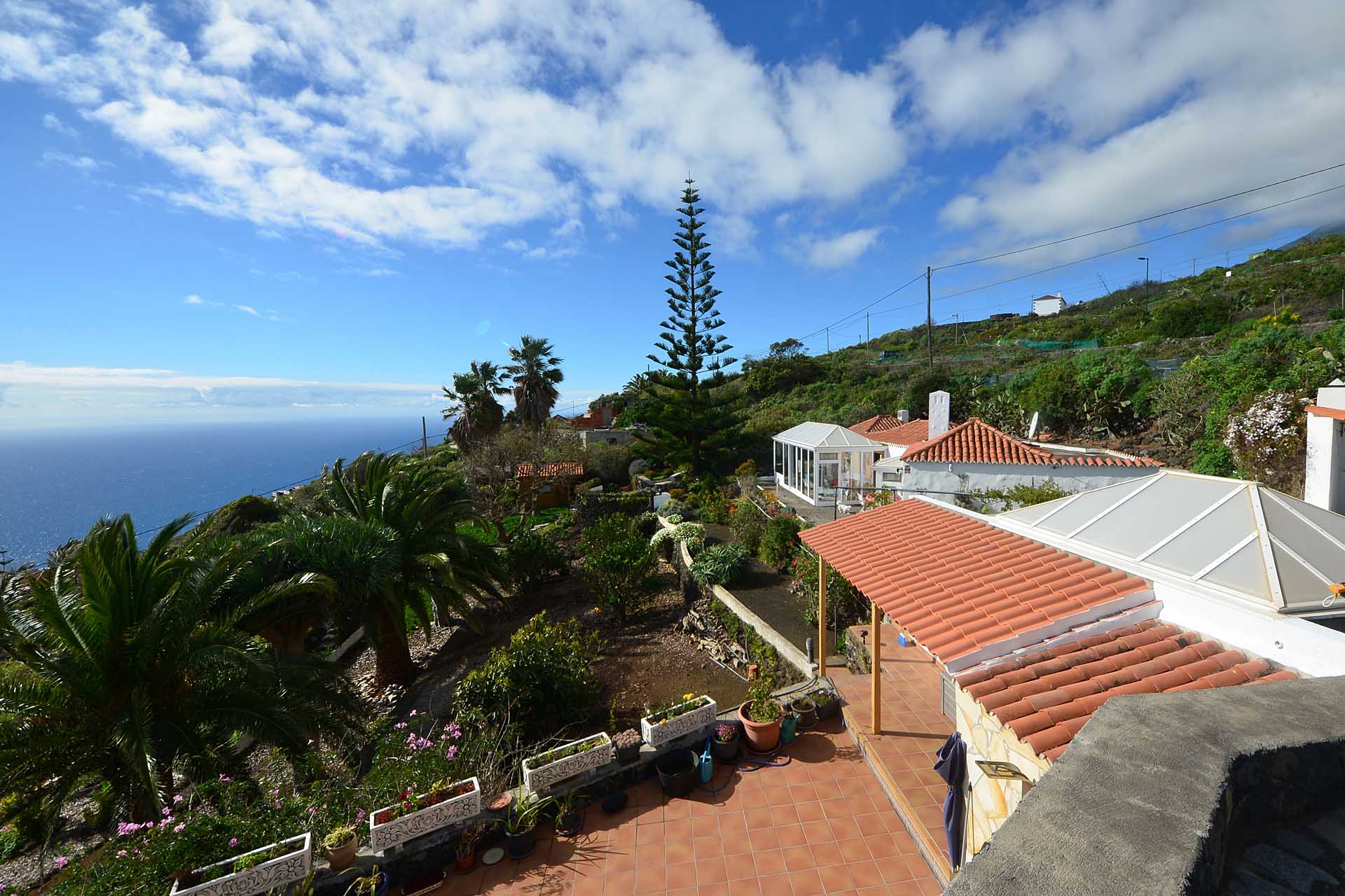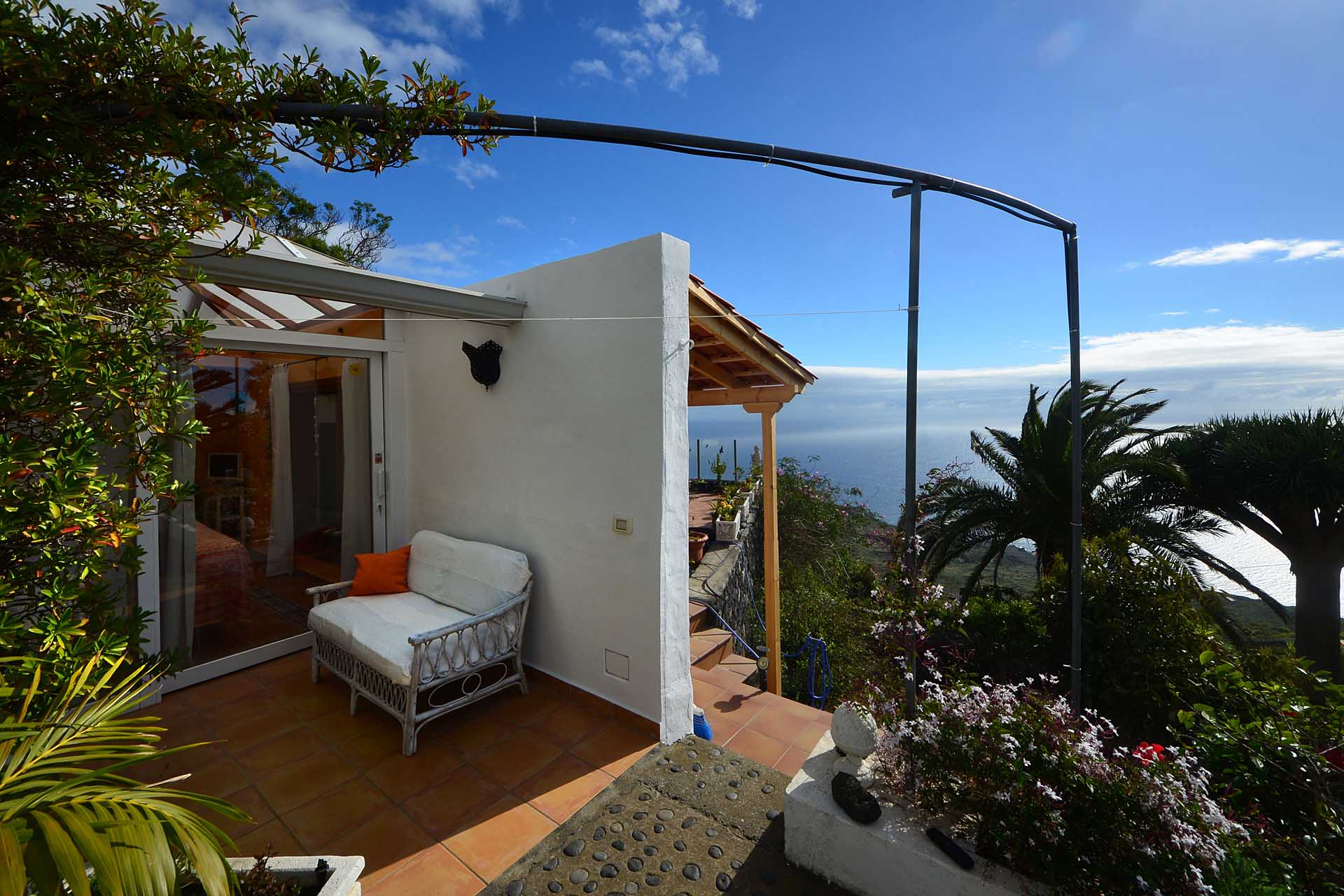 Auf gleicher Ebene wurde ein kleines Gästehaus errichtet, dessen gemütliches Schlafzimmer mit einem Licht- und Sonnendurchlässigen Dachstuhl versehen wurde. Ein Gäste-WC, das auch die Waschmaschine aufnimmt wurde über eine neu überdachte Terrasse angebunden. Davor befindet sich eine sehr große, nicht einsehbare Sonnenterrasse mit herrlichem Blick auf den Atlantik und die drei Nachbarinseln Tenerife, La Gomera und El Hierro.
