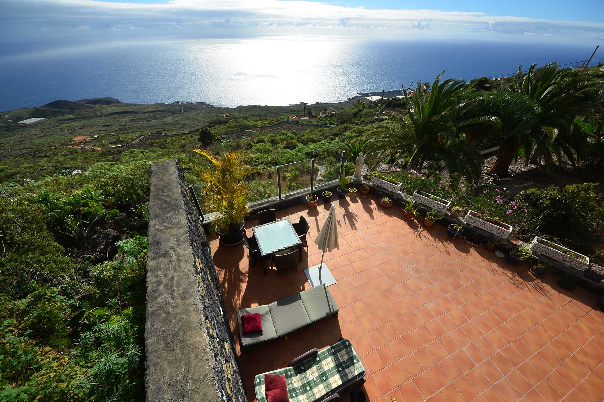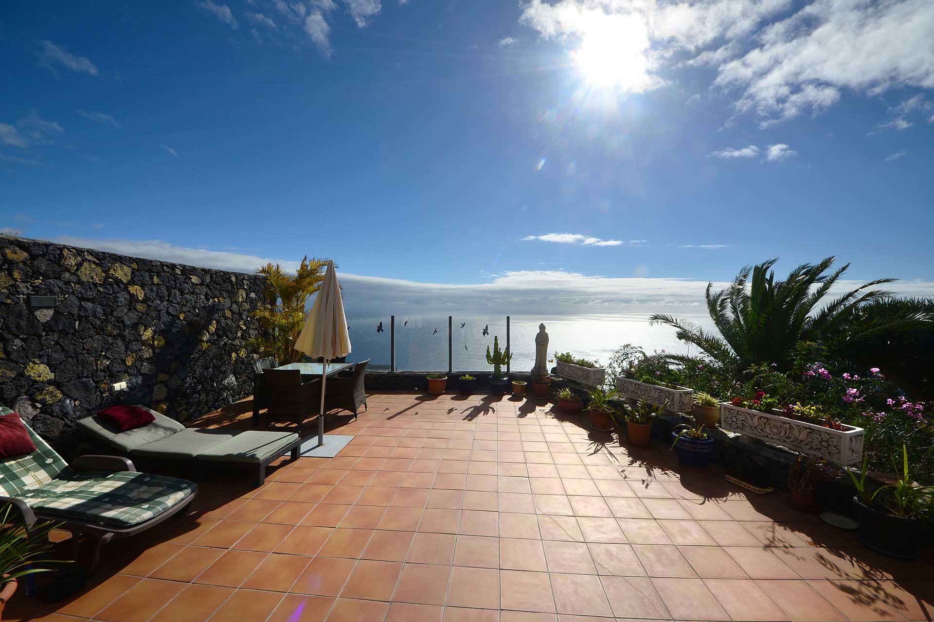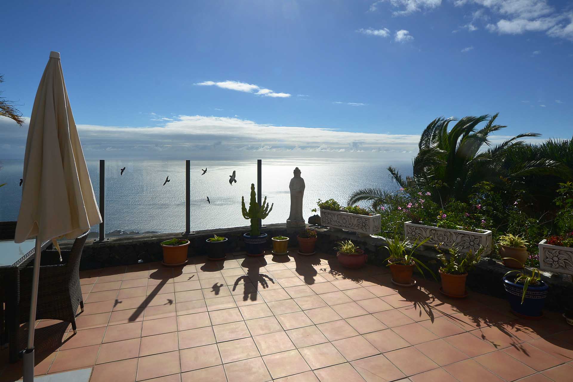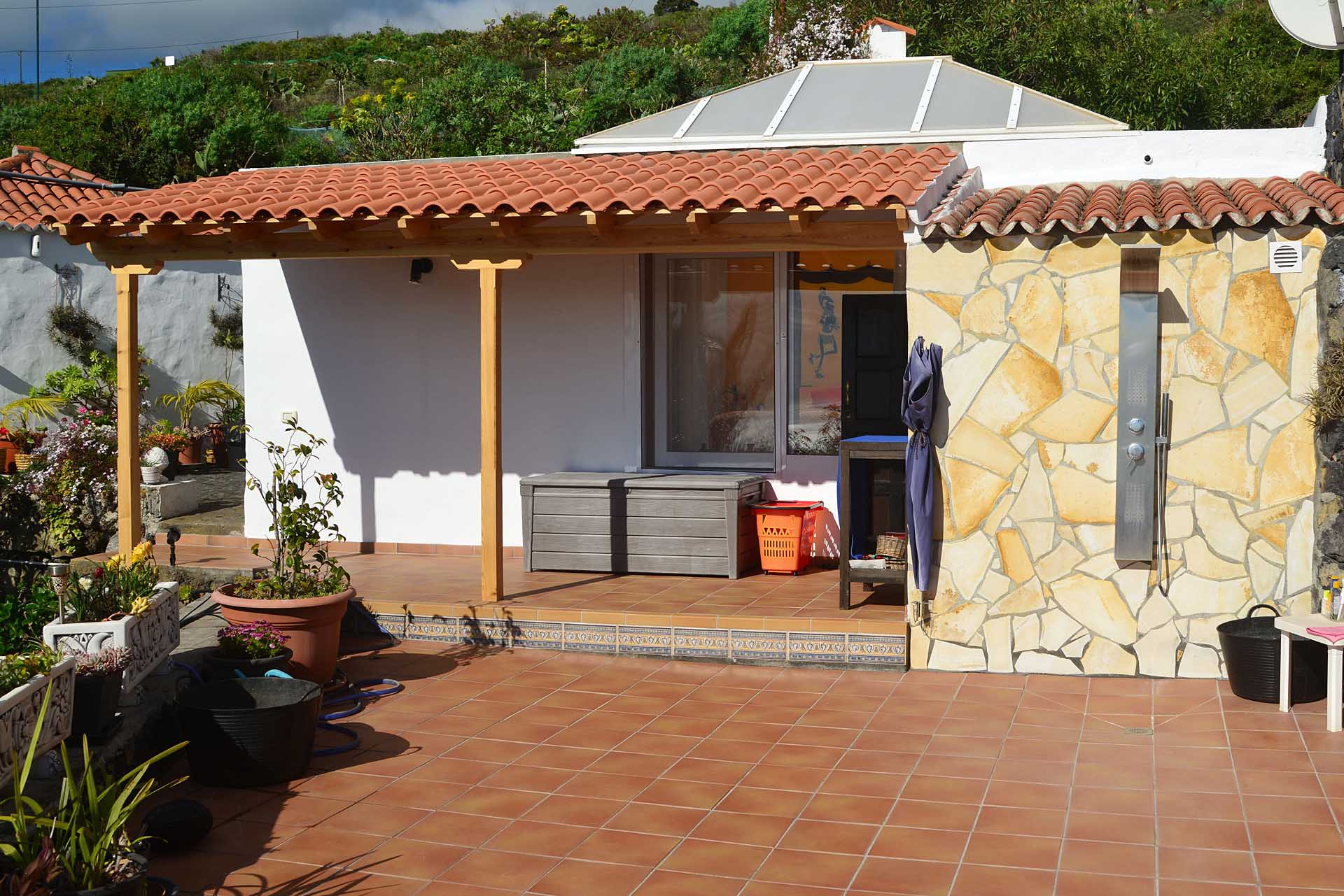 Auf gleicher Ebene wurde ein kleines Gästehaus errichtet, dessen gemütliches Schlafzimmer mit einem Licht- und Sonnendurchlässigen Dachstuhl versehen wurde. Ein Gäste-WC, das auch die Waschmaschine aufnimmt wurde über eine neu überdachte Terrasse angebunden. Davor befindet sich eine sehr große, nicht einsehbare Sonnenterrasse mit herrlichem Blick auf den Atlantik und die drei Nachbarinseln Tenerife, La Gomera und El Hierro.