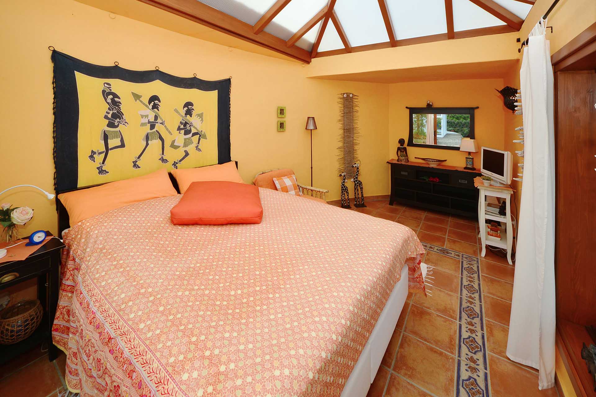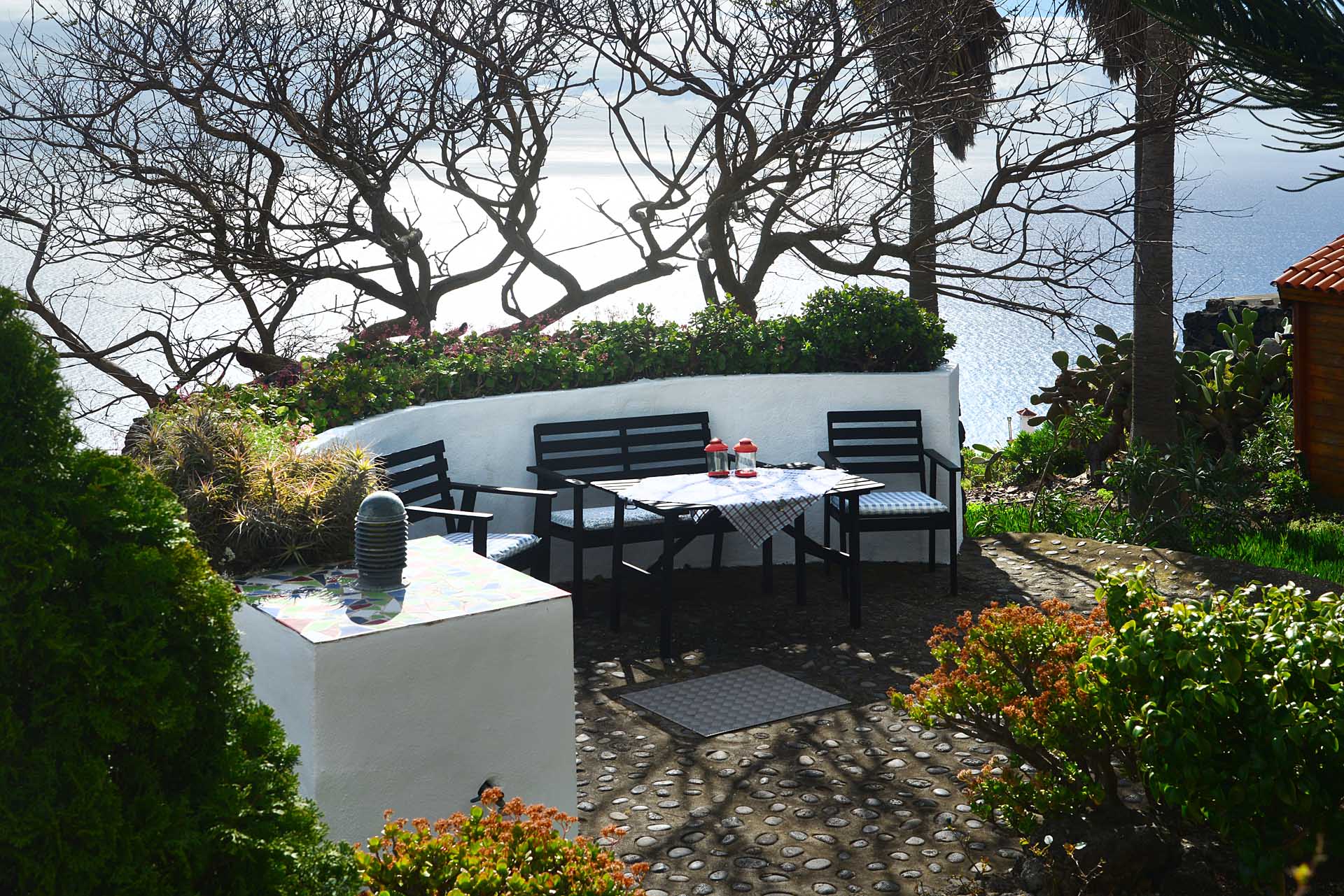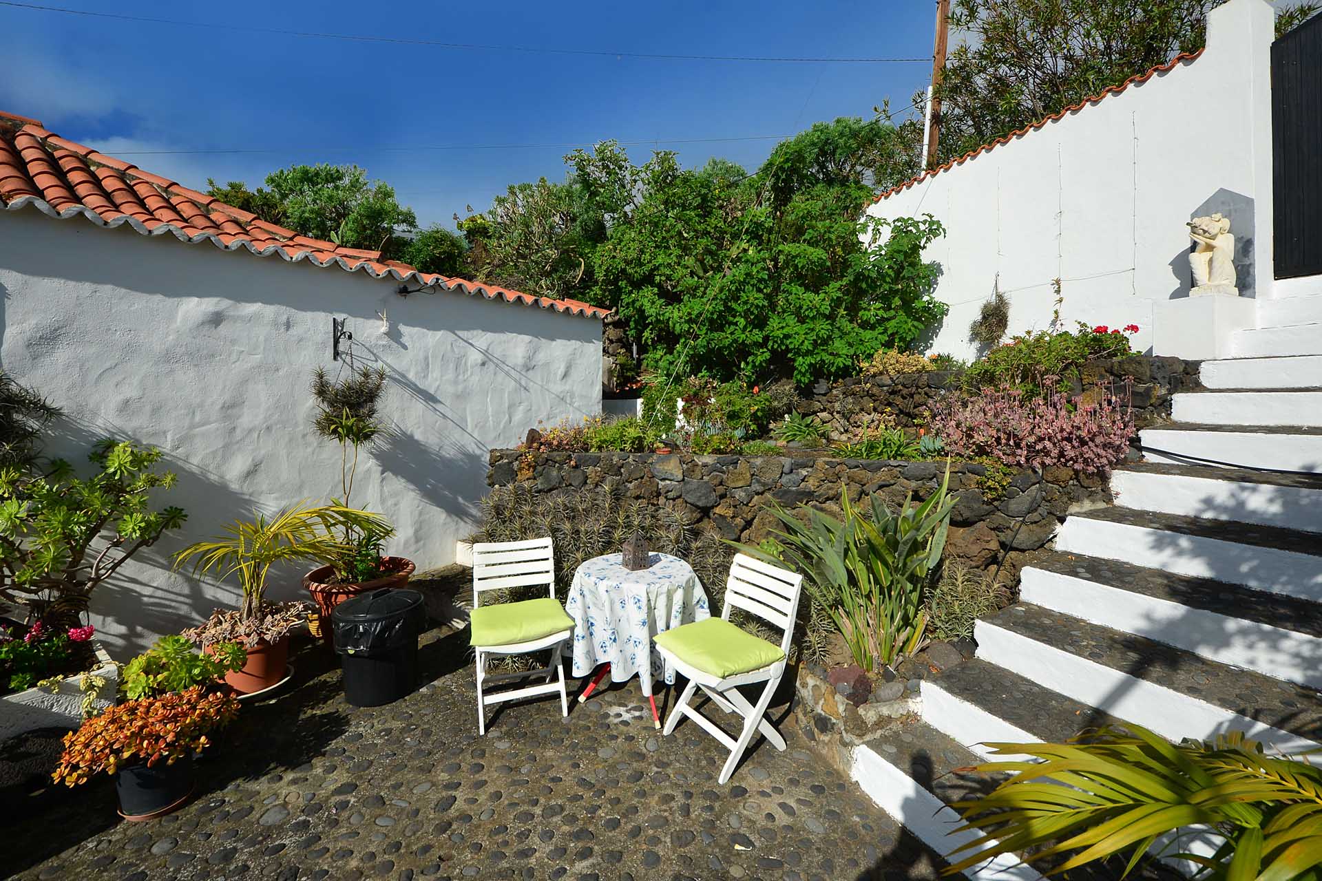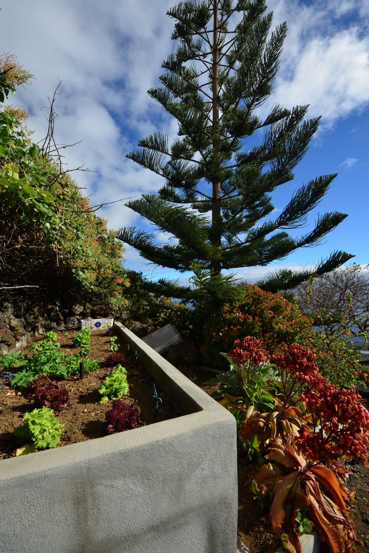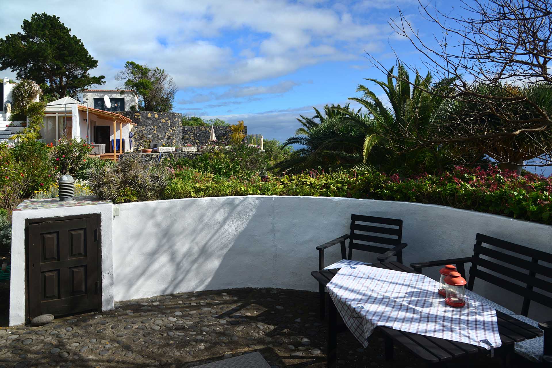 Auf gleicher Ebene wurde ein kleines Gästehaus errichtet, dessen gemütliches Schlafzimmer mit einem Licht- und Sonnendurchlässigen Dachstuhl versehen wurde. Ein Gäste-WC, das auch die Waschmaschine aufnimmt wurde über eine neu überdachte Terrasse angebunden. Davor befindet sich eine sehr große, nicht einsehbare Sonnenterrasse mit herrlichem Blick auf den Atlantik und die drei Nachbarinseln Tenerife, La Gomera und El Hierro.