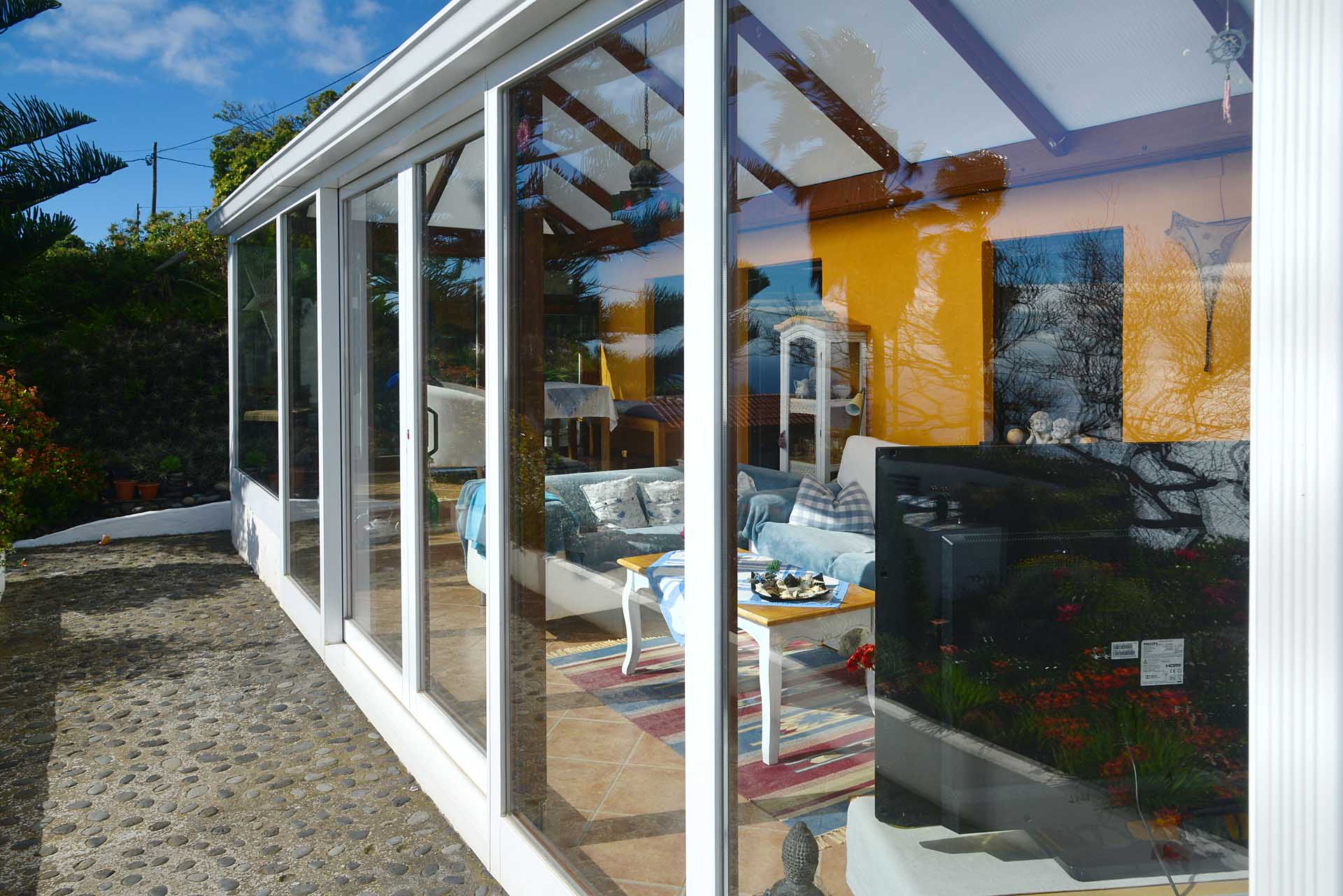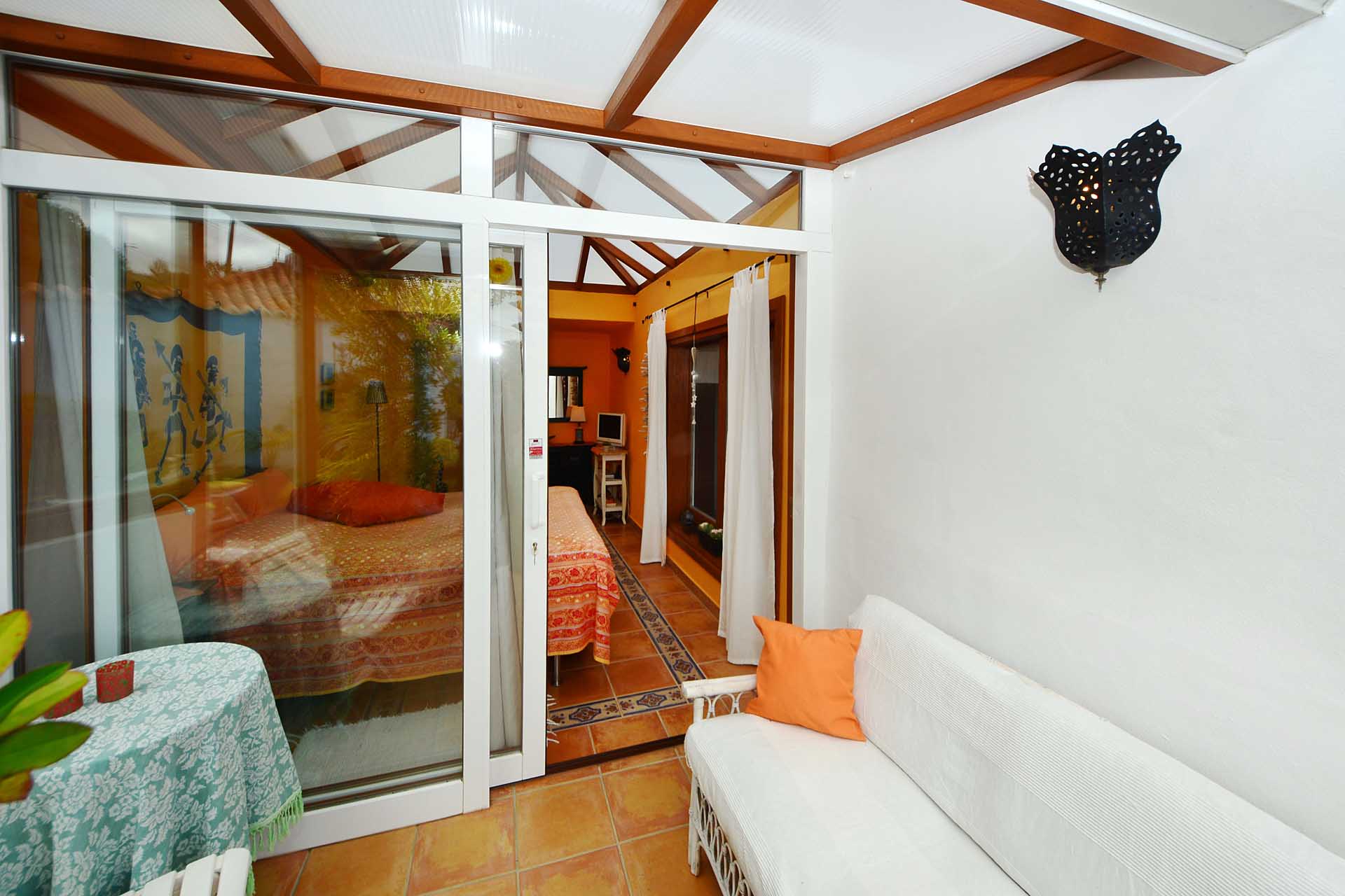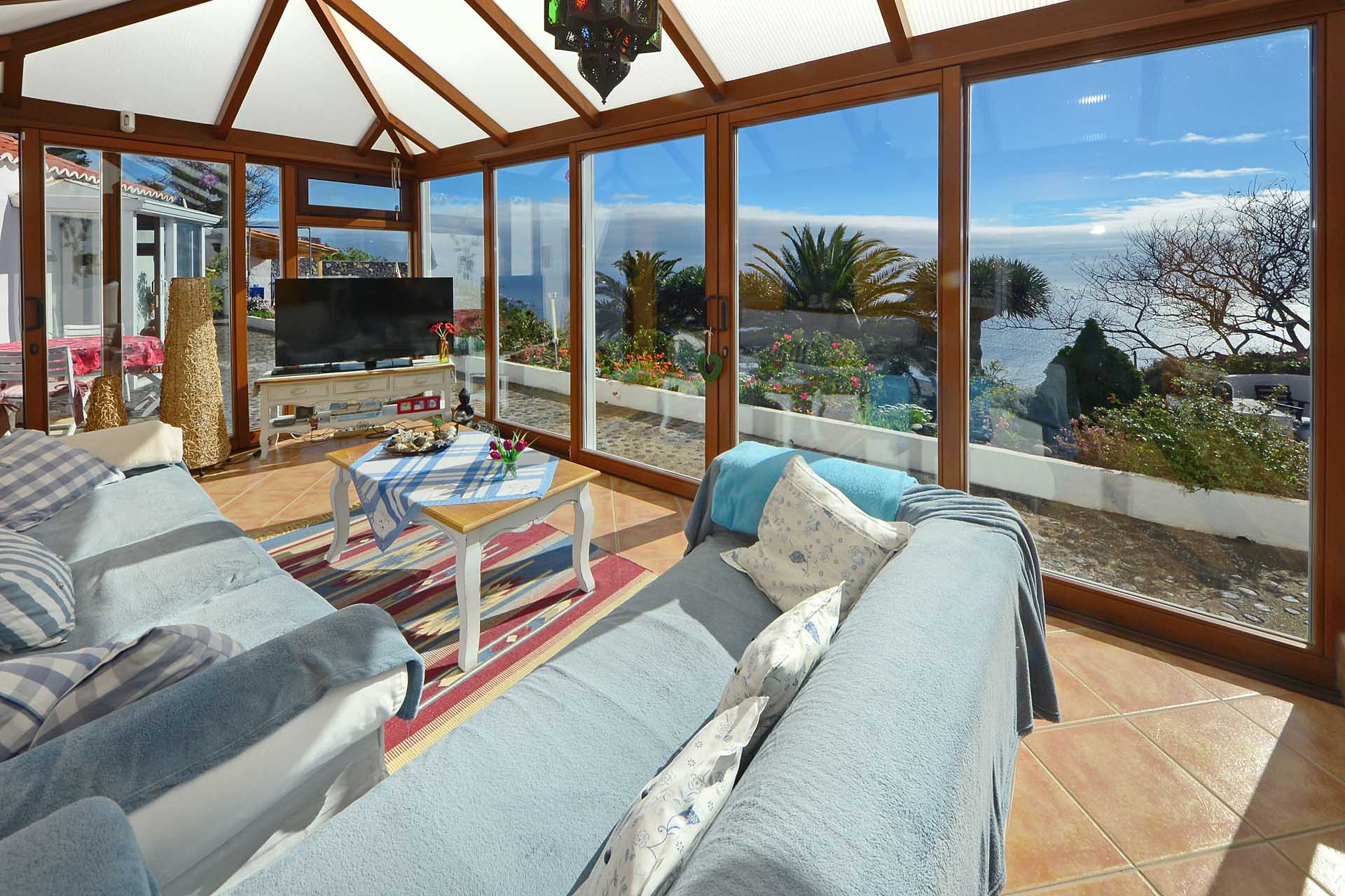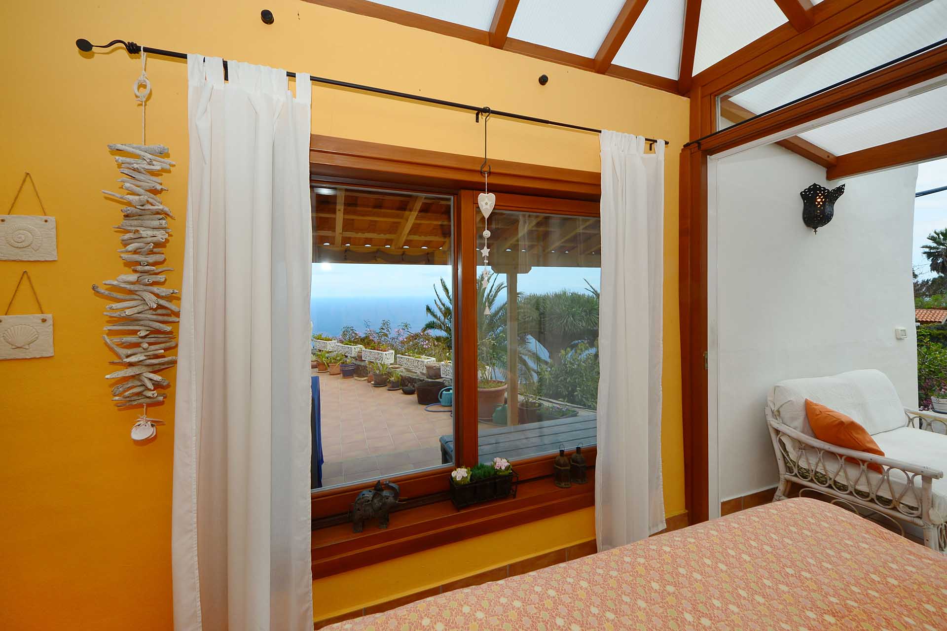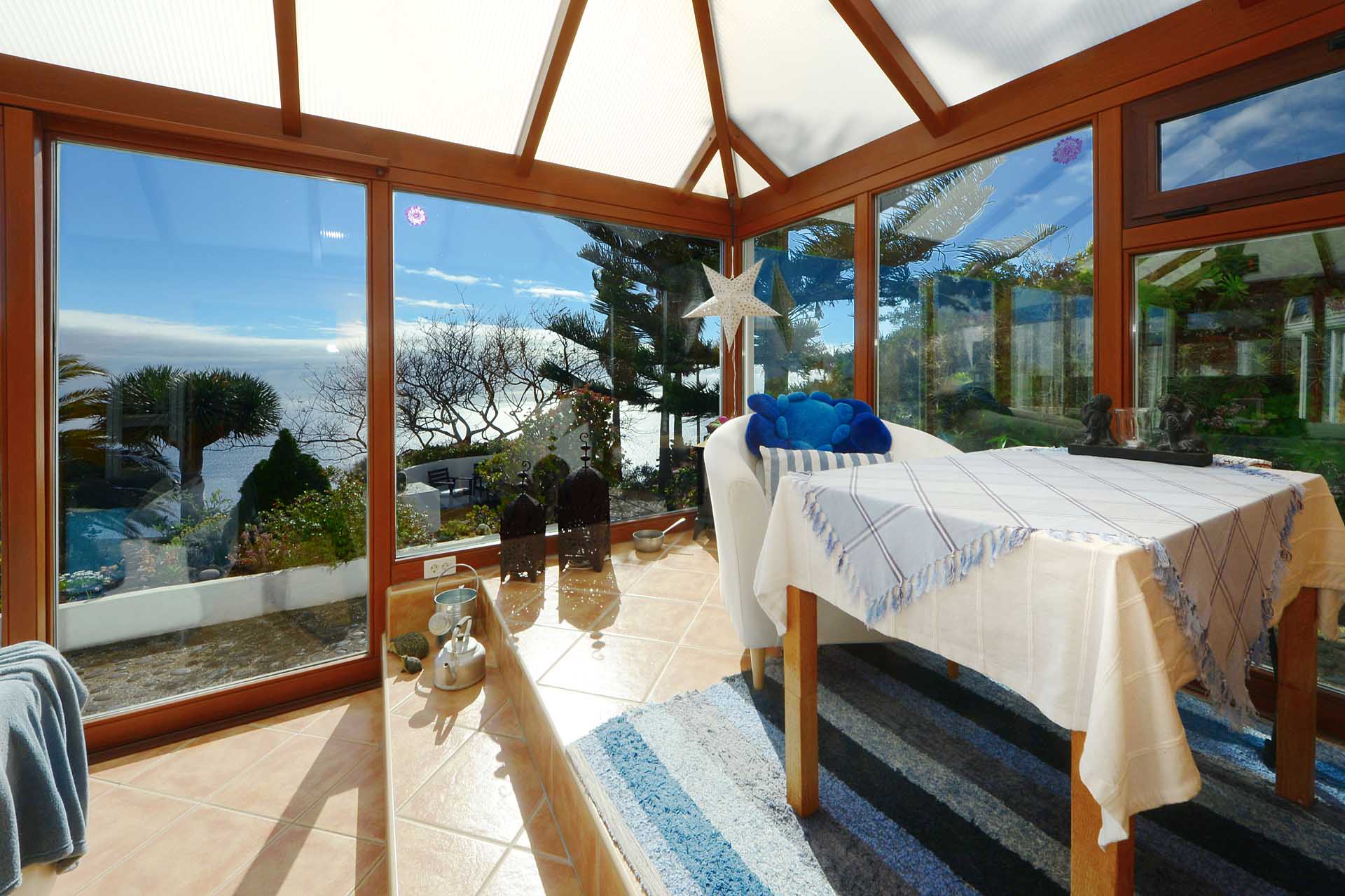 Das Haupthaus betreten Sie durch den sehr großen Wintergarten, der das Hauptwohn- und Esszimmer bildet und durch seinen fantastischen Meerblick besticht. Ein Raum mit rundum Wohlfühlatmosphäre. Da er an den altkanarischen Bau aus 60 cm starken Natursteinwänden angesetzt wurde, beheizt er diesen ganzjährig, so dass eine andere Heizung fast vollständig überflüssig wurde. An den wenigen komplett bewölkten und kalten Tagen steht ein Kamin mit Türe zur Verfügung. Neben dem Wintergarten beherbergt das Haupthaus noch ein klassisches Wohnzimmer, eine Küche, ein Schlafzimmer und ein Badezimmer. Das Schlafzimmer wurde mit einem Erker in Wintergartenbauweise ergänzt, so dass auch dieses durch die Sonne geheizt wird. Alle Räume sind innerhalb des Hauses miteinander verbunden.