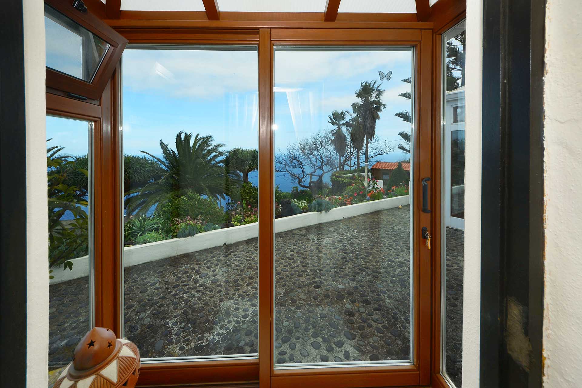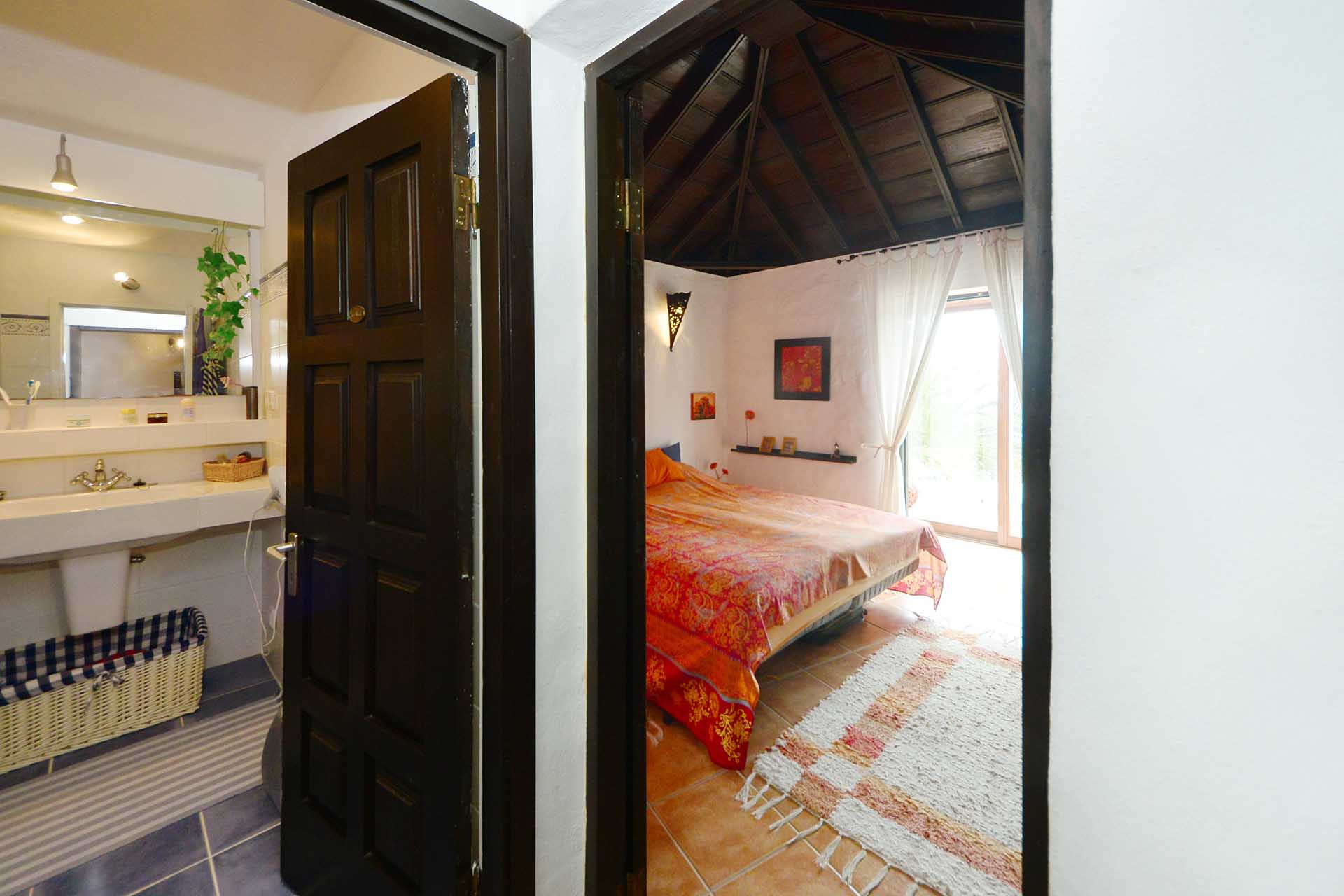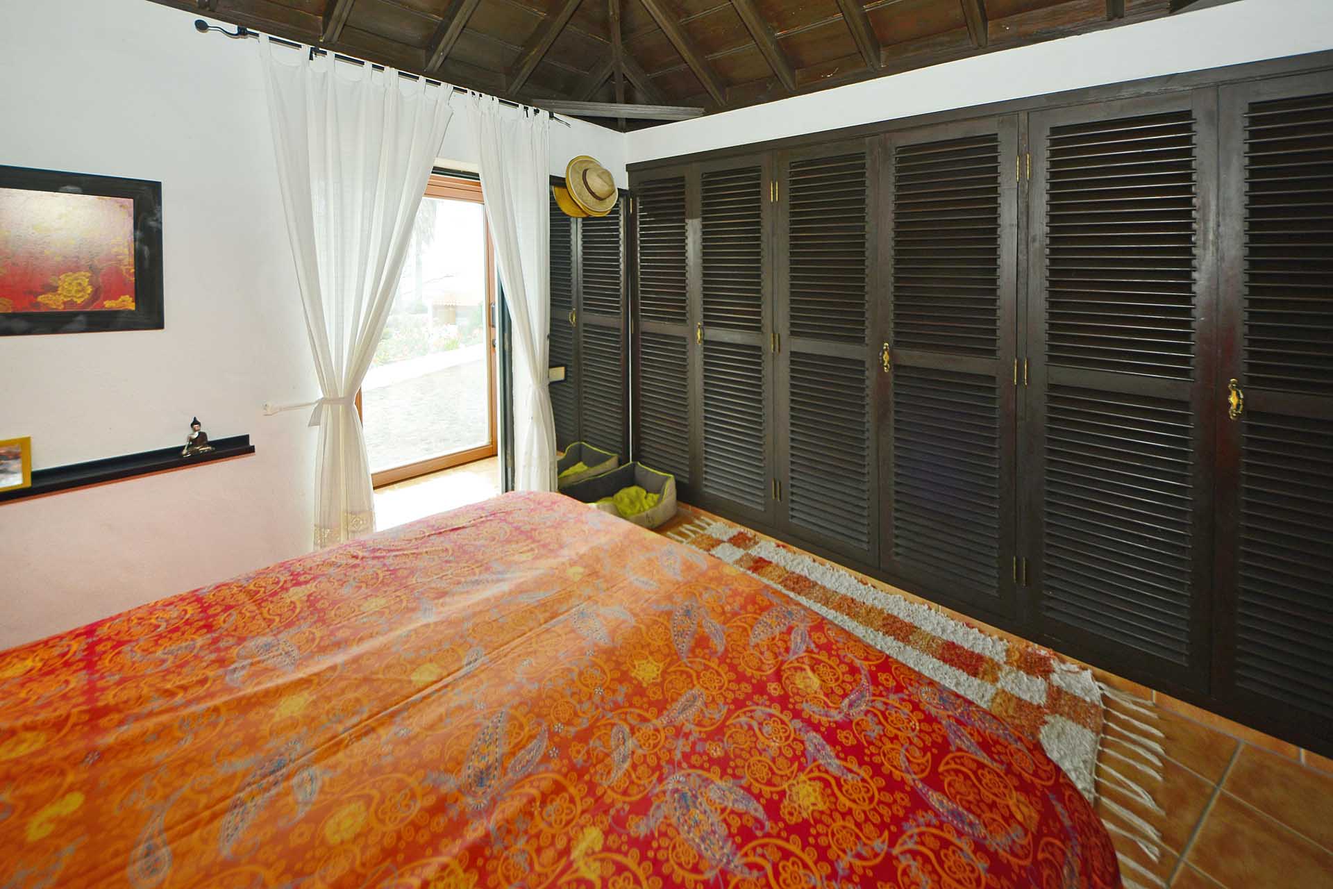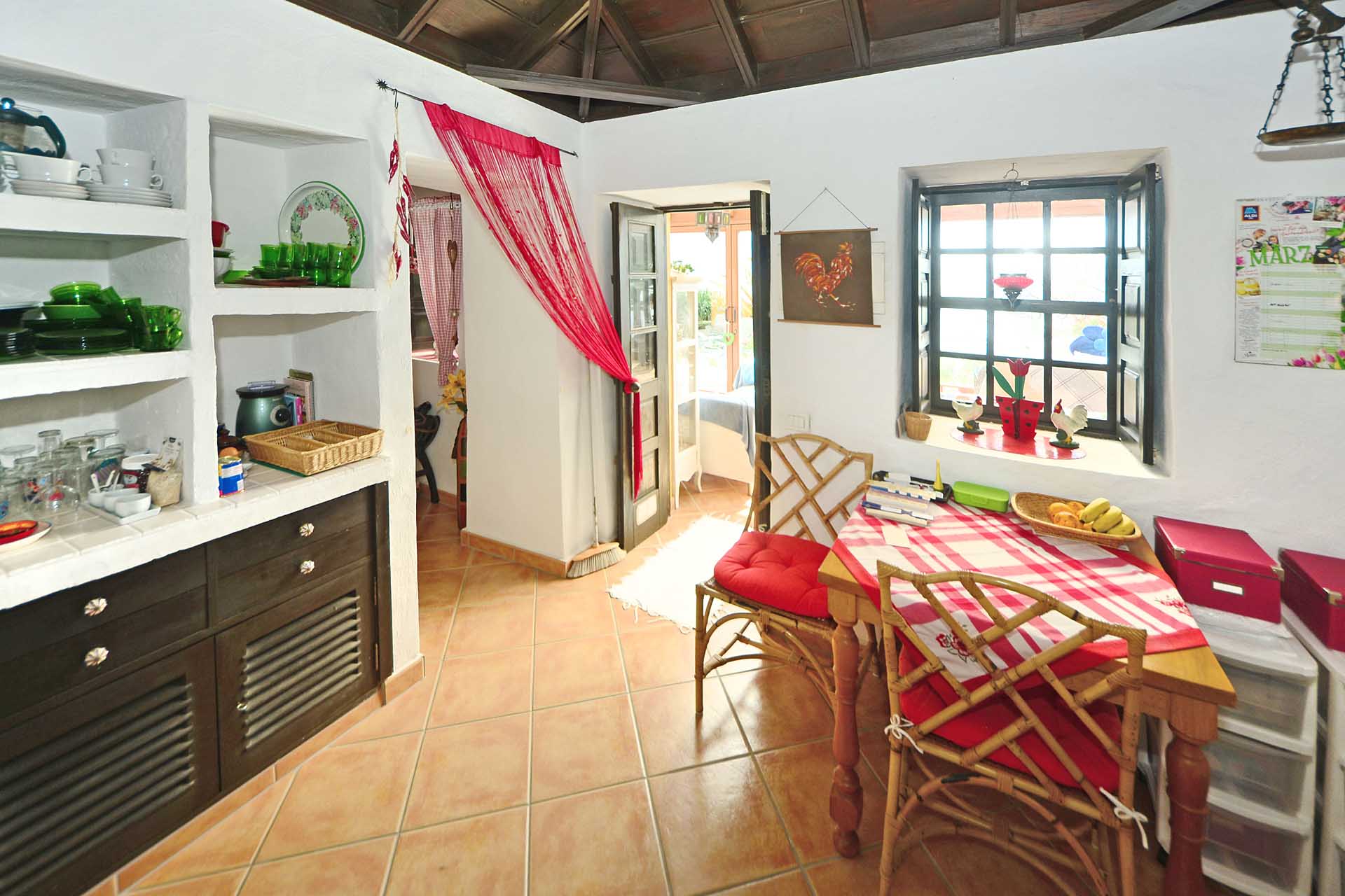 Das Haupthaus betreten Sie durch den sehr großen Wintergarten, der das Hauptwohn- und Esszimmer bildet und durch seinen fantastischen Meerblick besticht. Ein Raum mit rundum Wohlfühlatmosphäre. Da er an den altkanarischen Bau aus 60 cm starken Natursteinwänden angesetzt wurde, beheizt er diesen ganzjährig, so dass eine andere Heizung fast vollständig überflüssig wurde. An den wenigen komplett bewölkten und kalten Tagen steht ein Kamin mit Türe zur Verfügung. Neben dem Wintergarten beherbergt das Haupthaus noch ein klassisches Wohnzimmer, eine Küche, ein Schlafzimmer und ein Badezimmer. Das Schlafzimmer wurde mit einem Erker in Wintergartenbauweise ergänzt, so dass auch dieses durch die Sonne geheizt wird. Alle Räume sind innerhalb des Hauses miteinander verbunden.