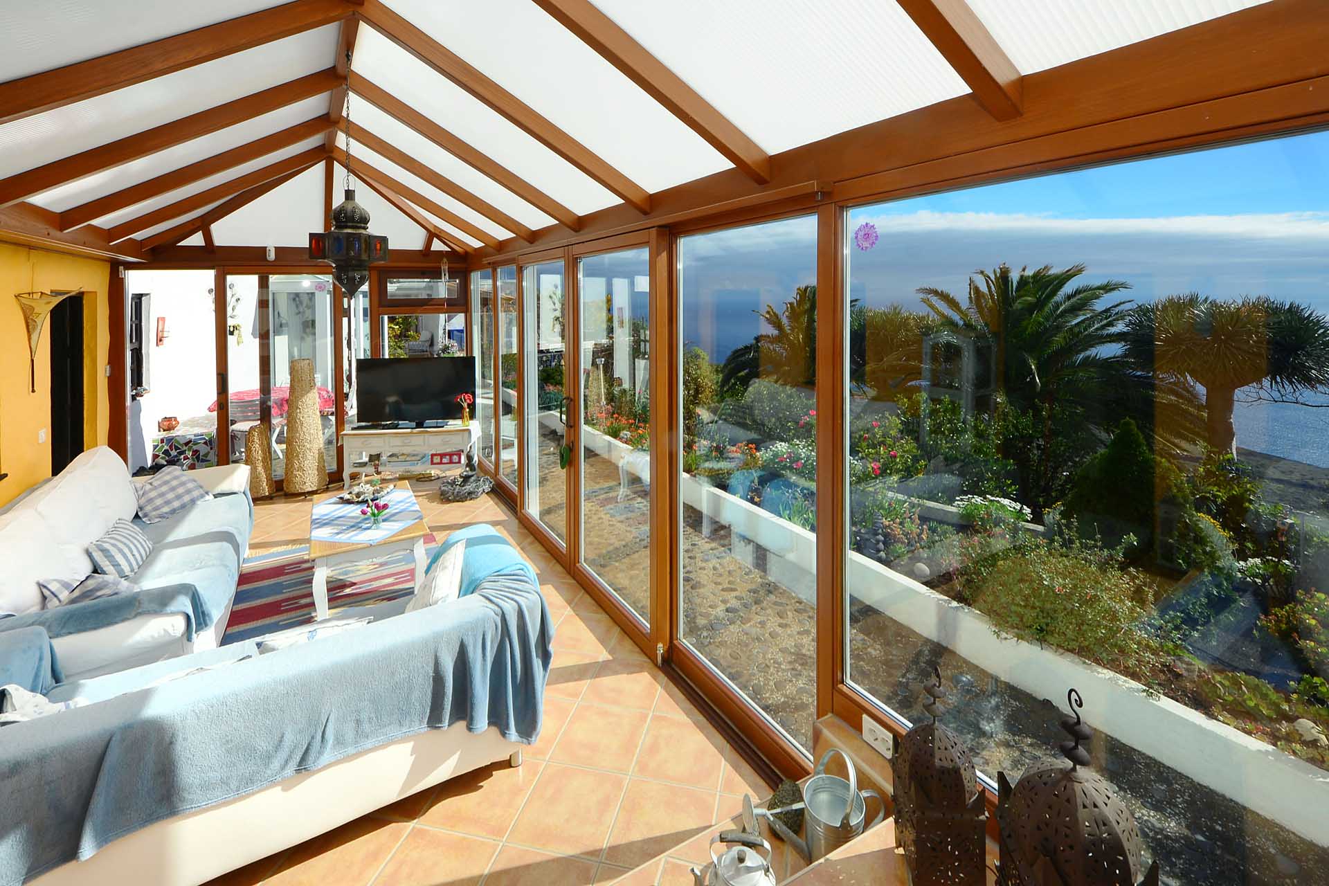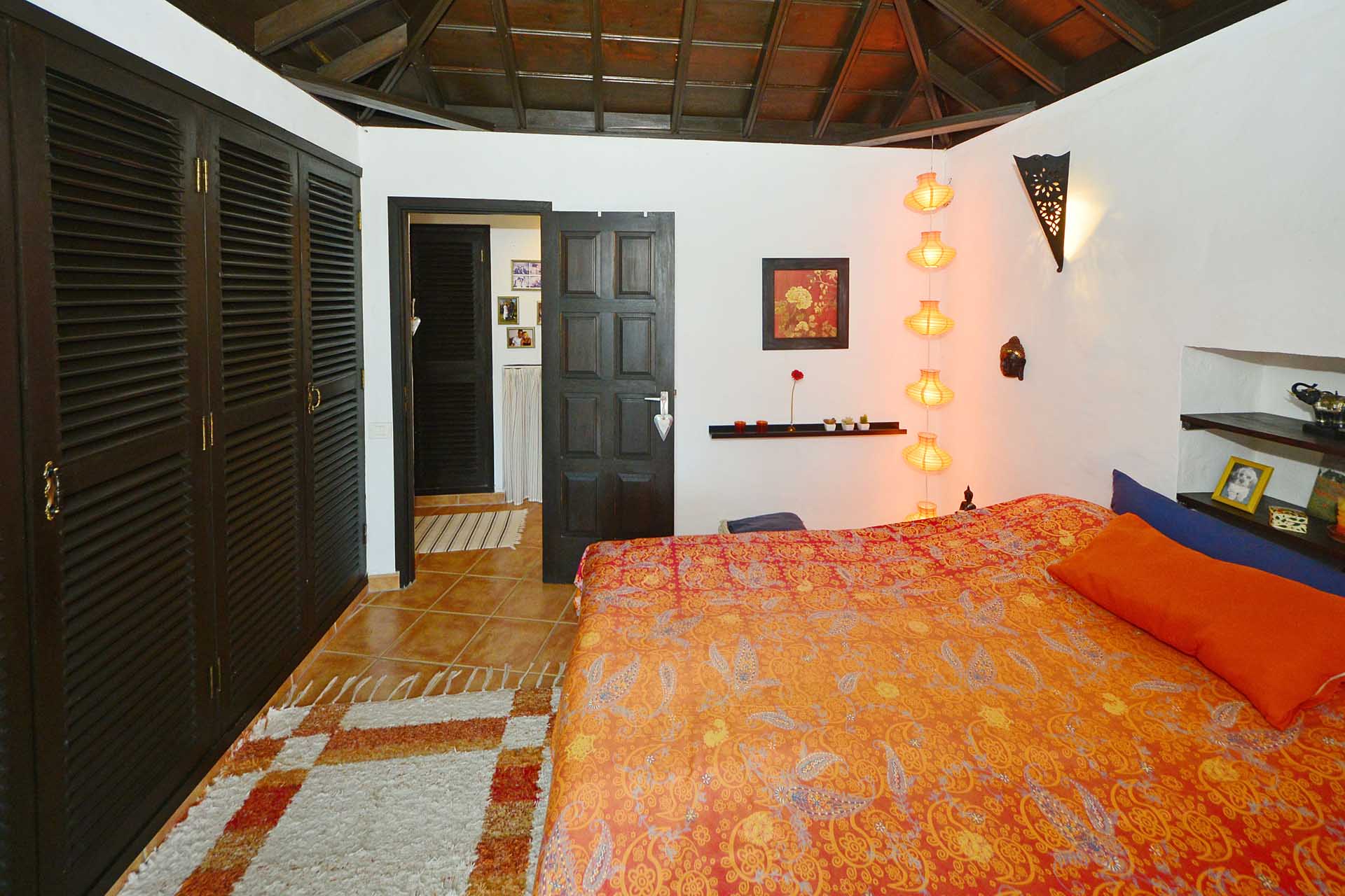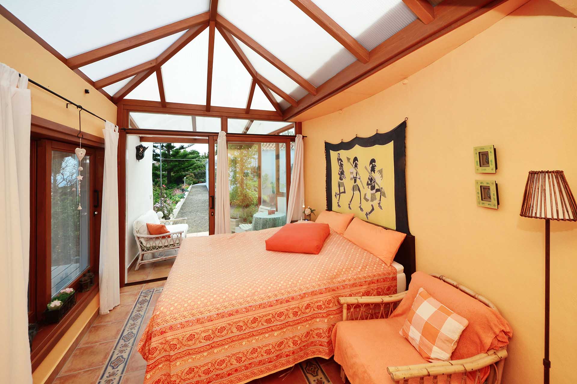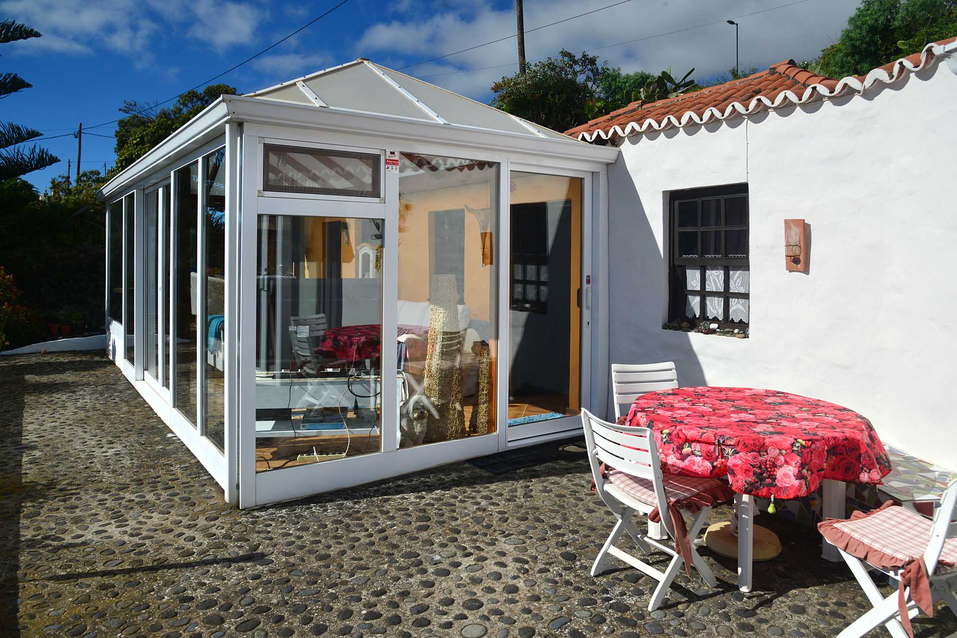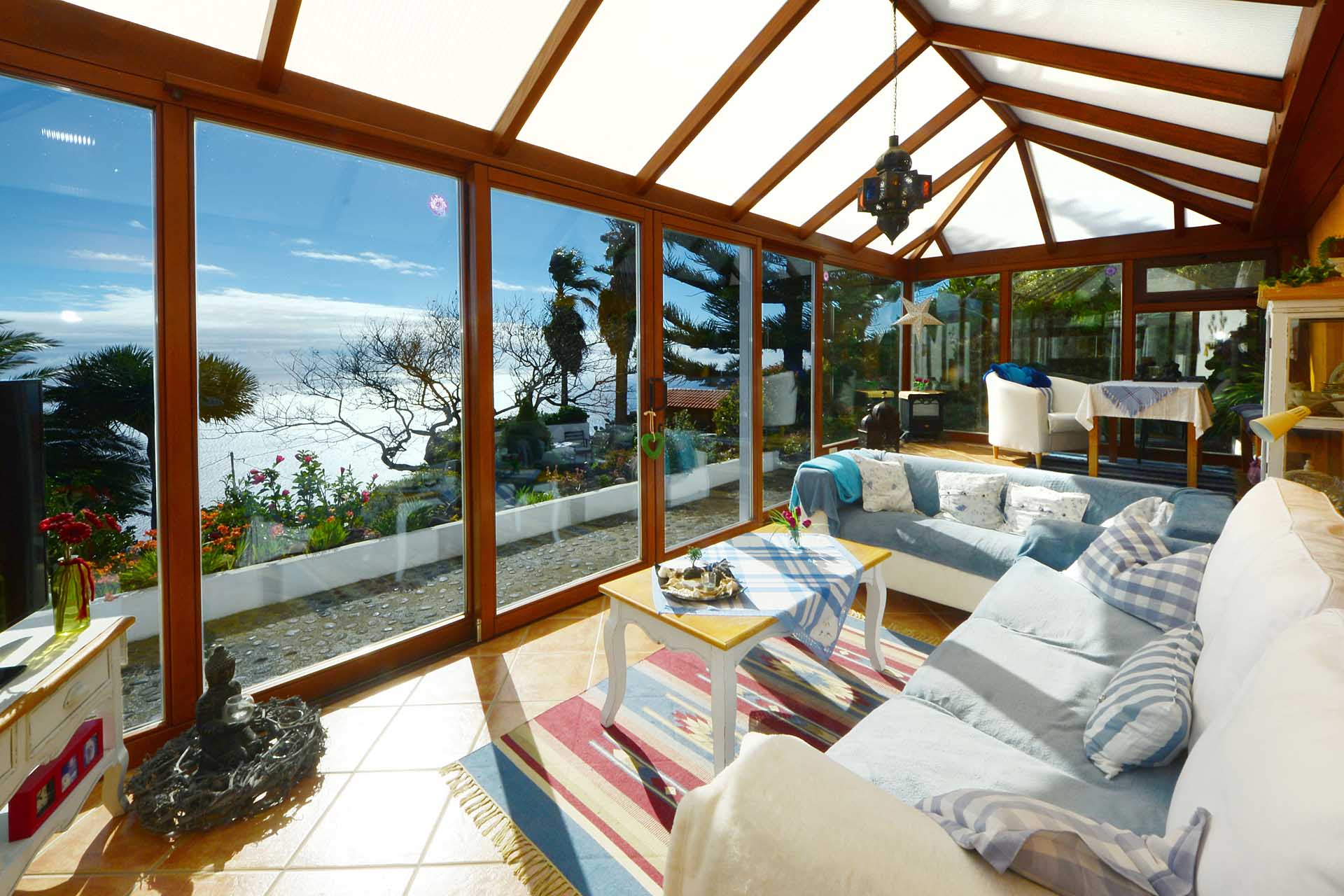 Das Haupthaus betreten Sie durch den sehr großen Wintergarten, der das Hauptwohn- und Esszimmer bildet und durch seinen fantastischen Meerblick besticht. Ein Raum mit rundum Wohlfühlatmosphäre. Da er an den altkanarischen Bau aus 60 cm starken Natursteinwänden angesetzt wurde, beheizt er diesen ganzjährig, so dass eine andere Heizung fast vollständig überflüssig wurde. An den wenigen komplett bewölkten und kalten Tagen steht ein Kamin mit Türe zur Verfügung. Neben dem Wintergarten beherbergt das Haupthaus noch ein klassisches Wohnzimmer, eine Küche, ein Schlafzimmer und ein Badezimmer. Das Schlafzimmer wurde mit einem Erker in Wintergartenbauweise ergänzt, so dass auch dieses durch die Sonne geheizt wird. Alle Räume sind innerhalb des Hauses miteinander verbunden.