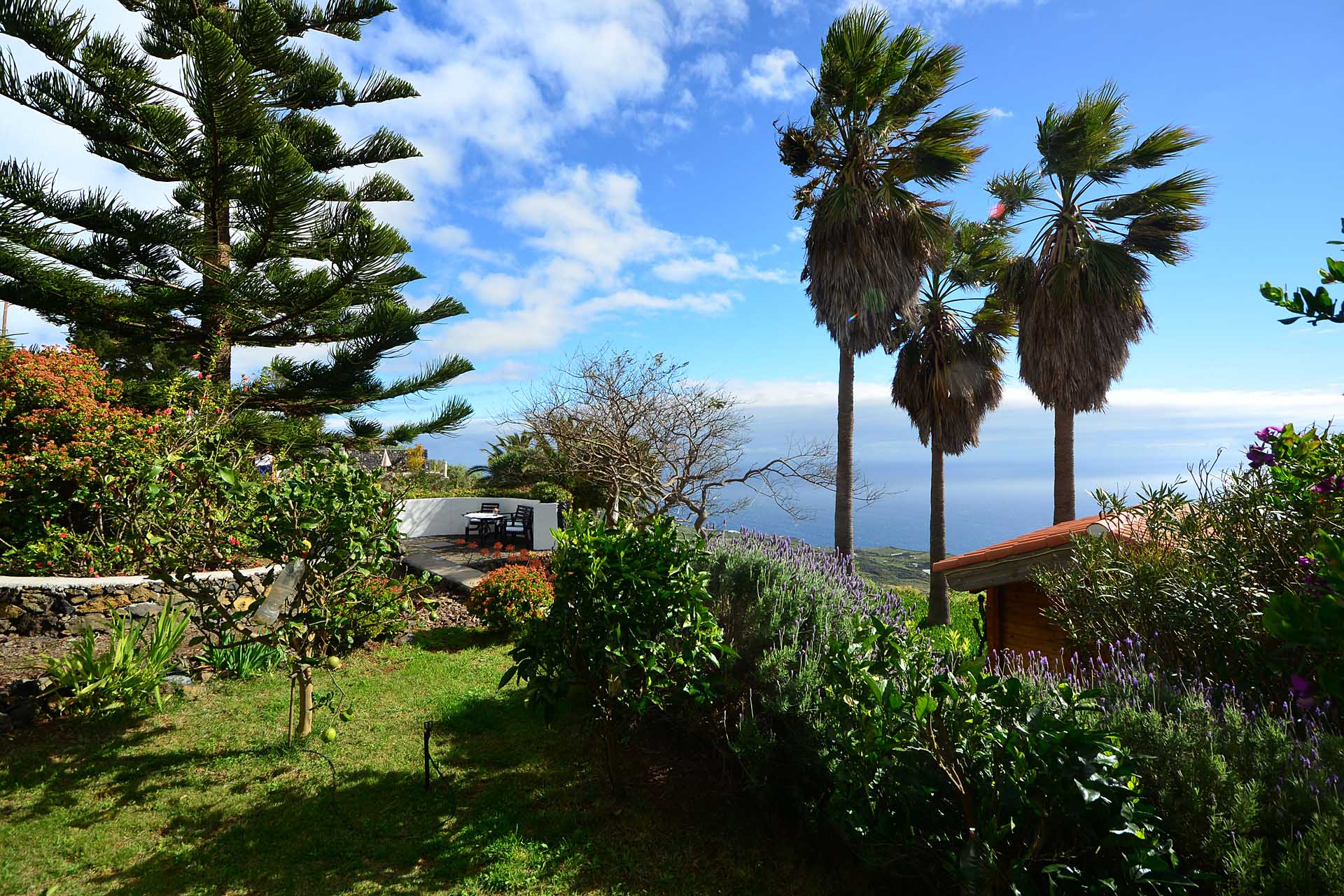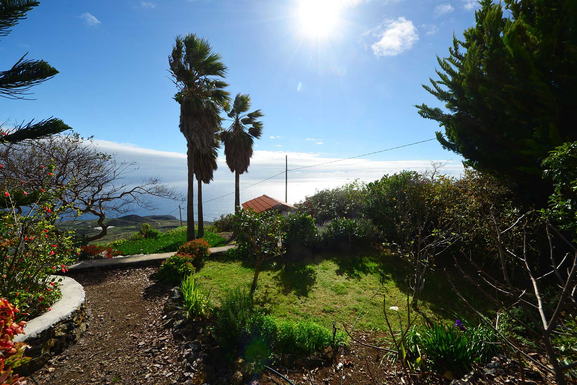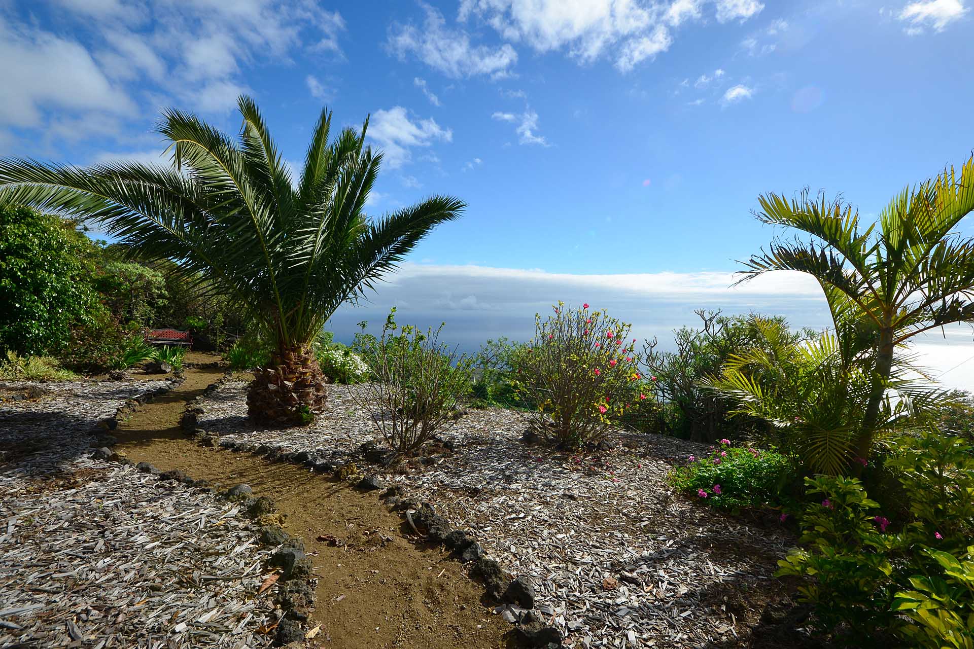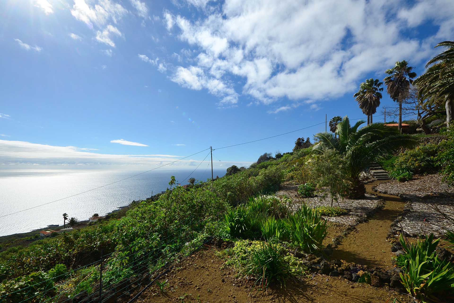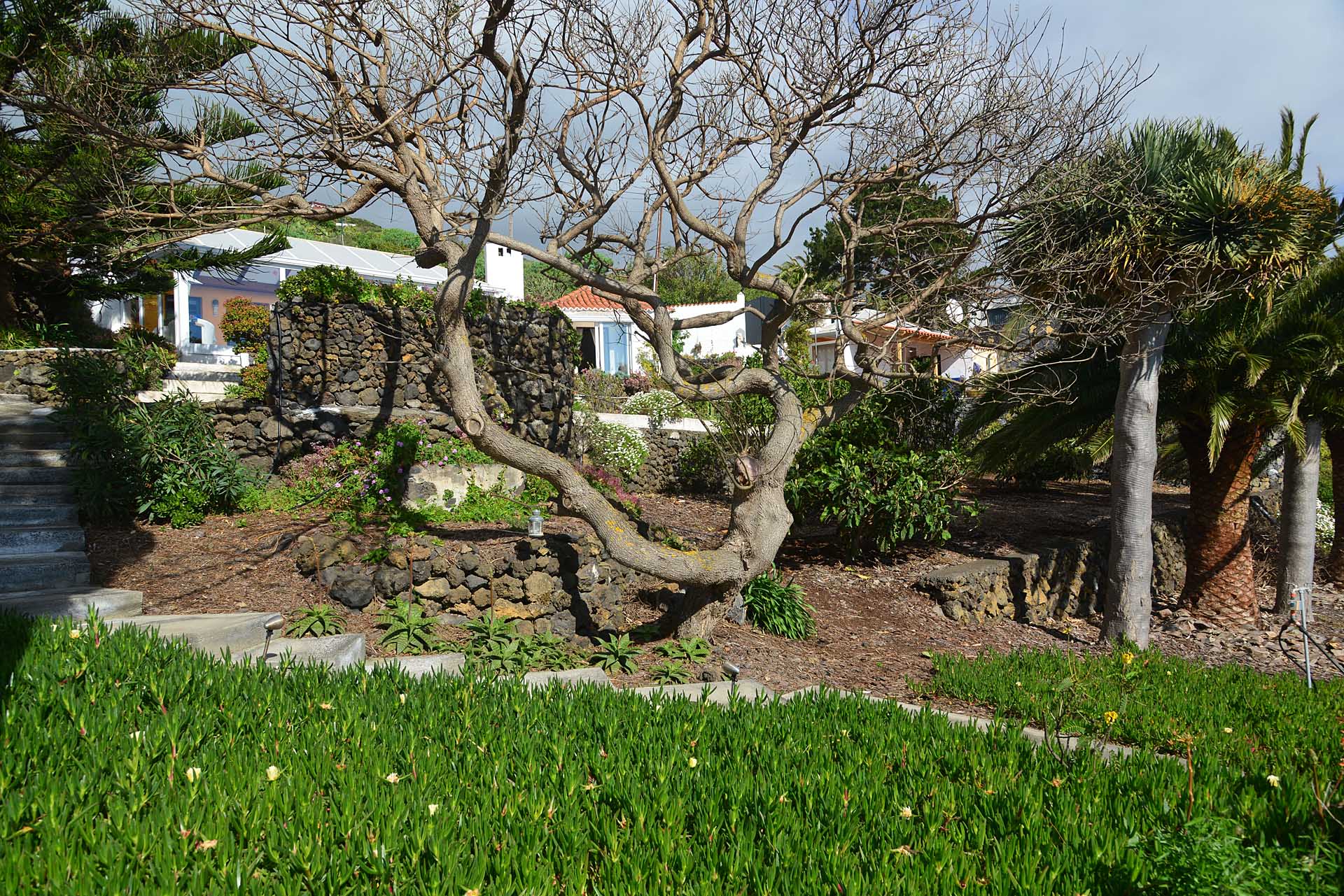 Der große Garten wurde pflegeleicht angelegt und mit großen Palmen und anderen Zierbäumen bepflanzt. Die Gartenwege wurden gut begehbar befestigt und mit weiteren Terrassen versehen.