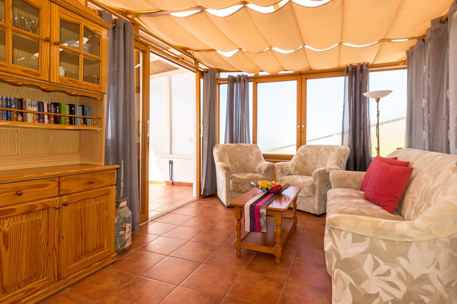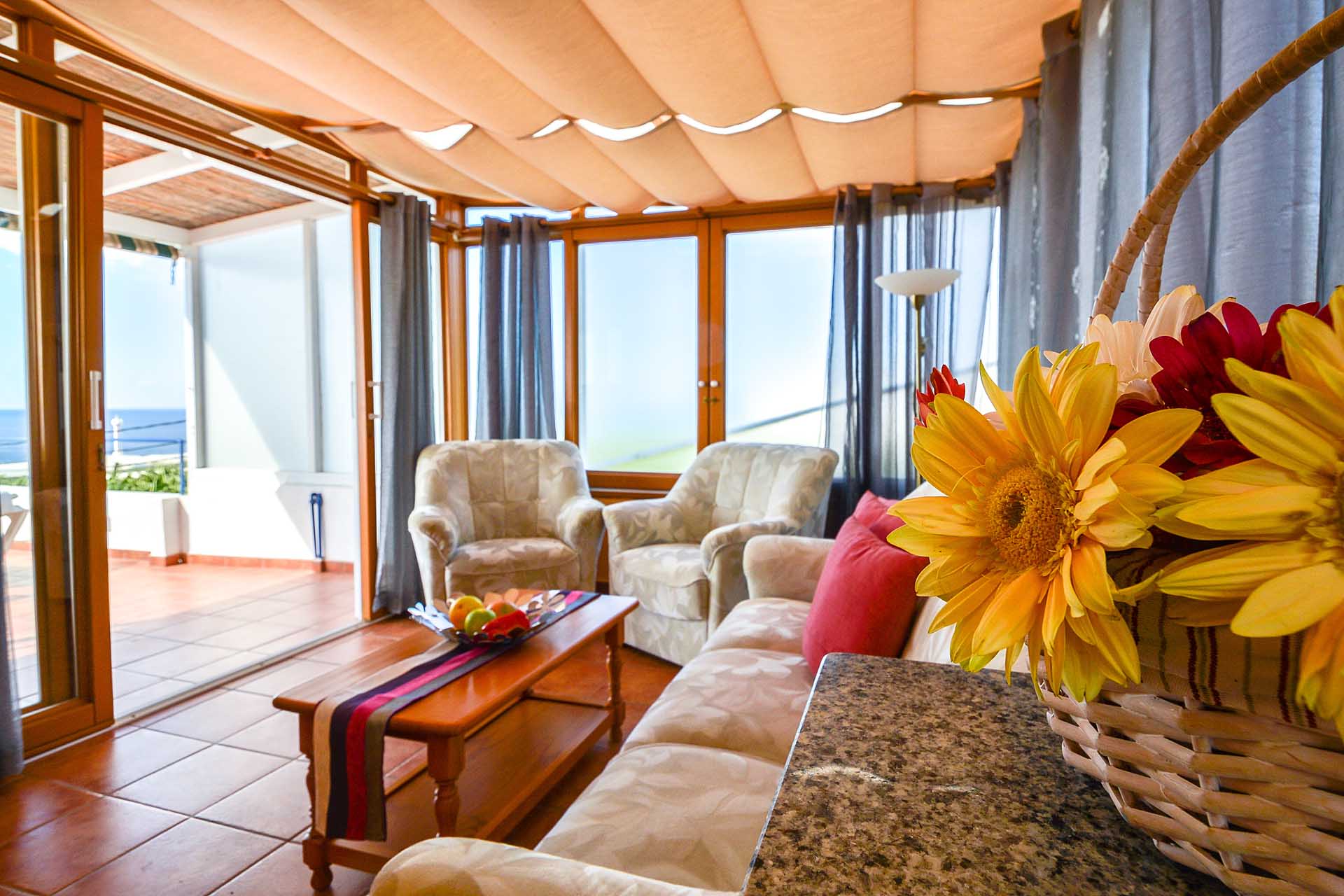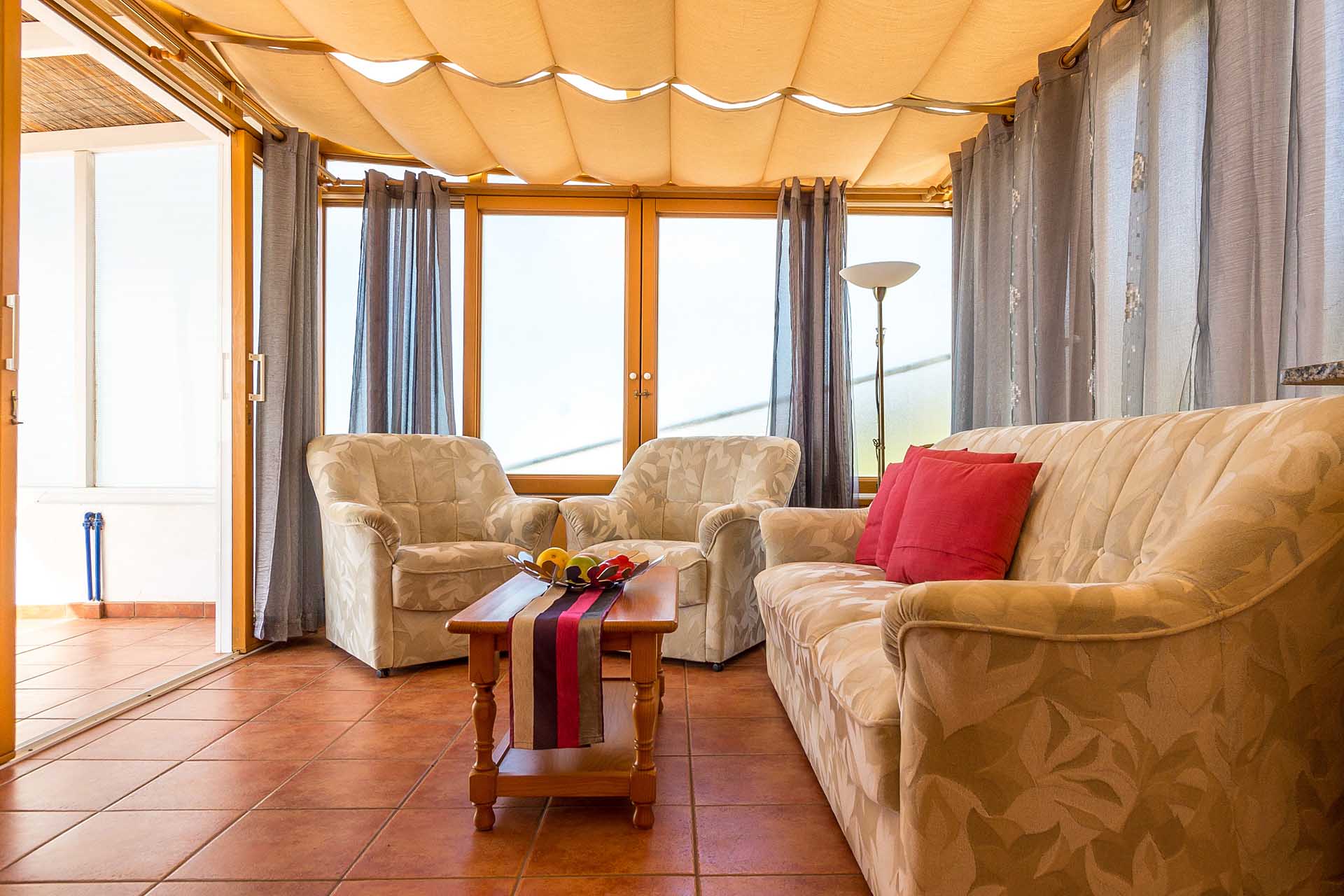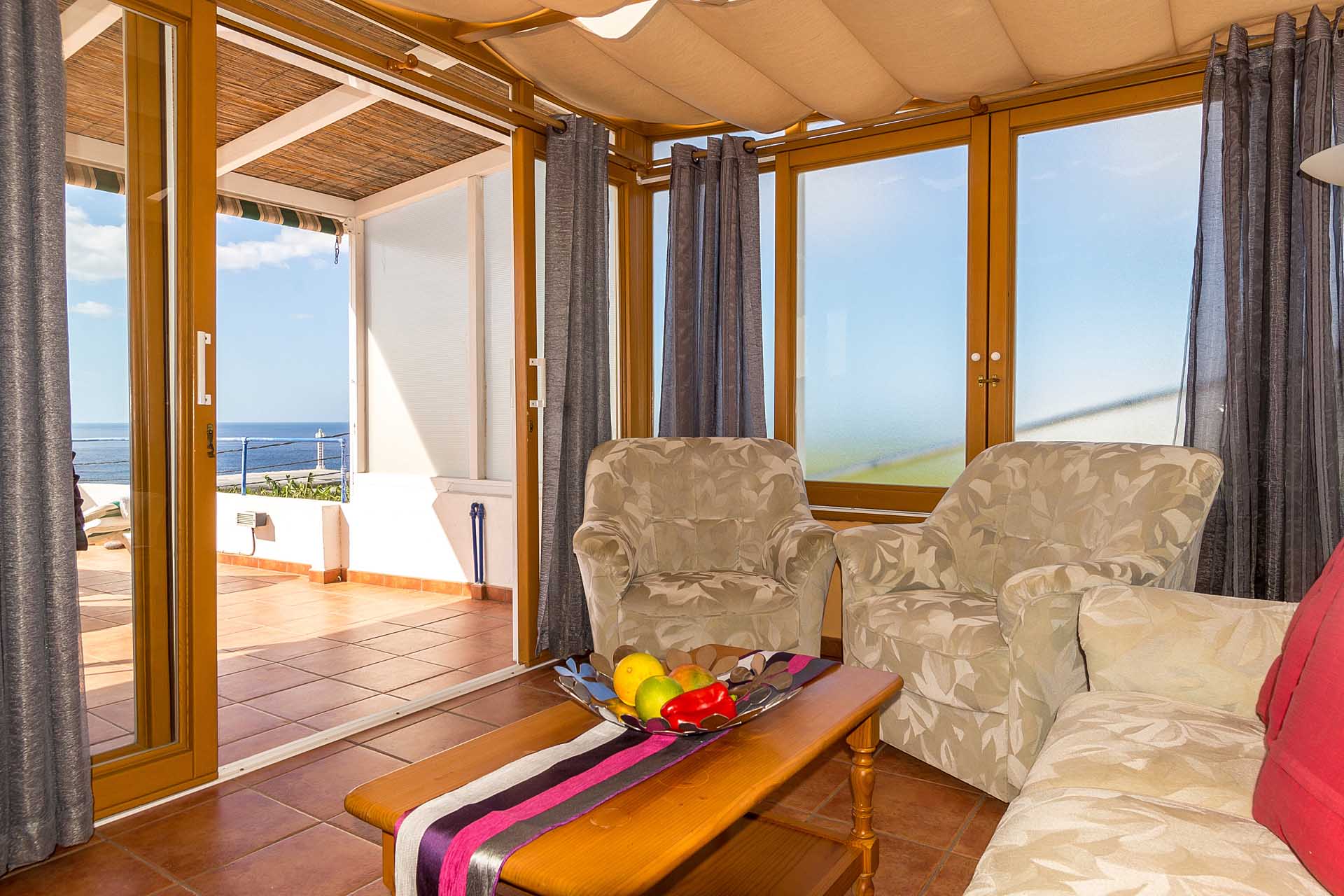 Sie ist im 1. OG aufgeteilt in ein Wohnzimmer mit Essplatz, eine Küche, zwei Schlafzimmer, ein Tageslichtbad und eine überdachte Terrasse sowie im 2. OG in einen Wintergarten (oder 2. Wohnzimmer) mit Zugang zur großen, teilweise überdachten Dachterrasse mit fantastischem Meerblick. Sie wurde bisher ausschließlich als Ferienwohnung genutzt, kann aber auch dauerhaft bewohnt werden.