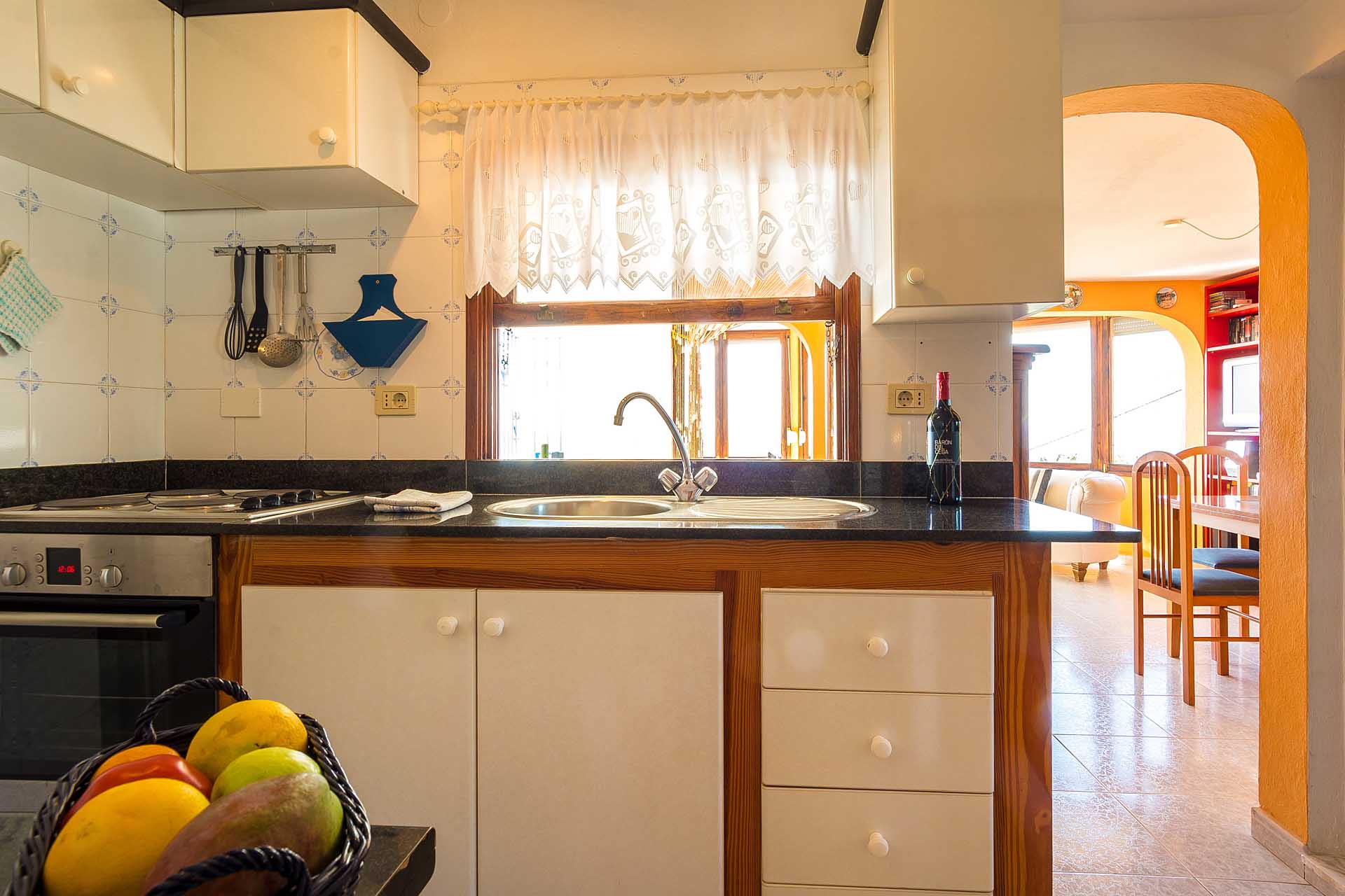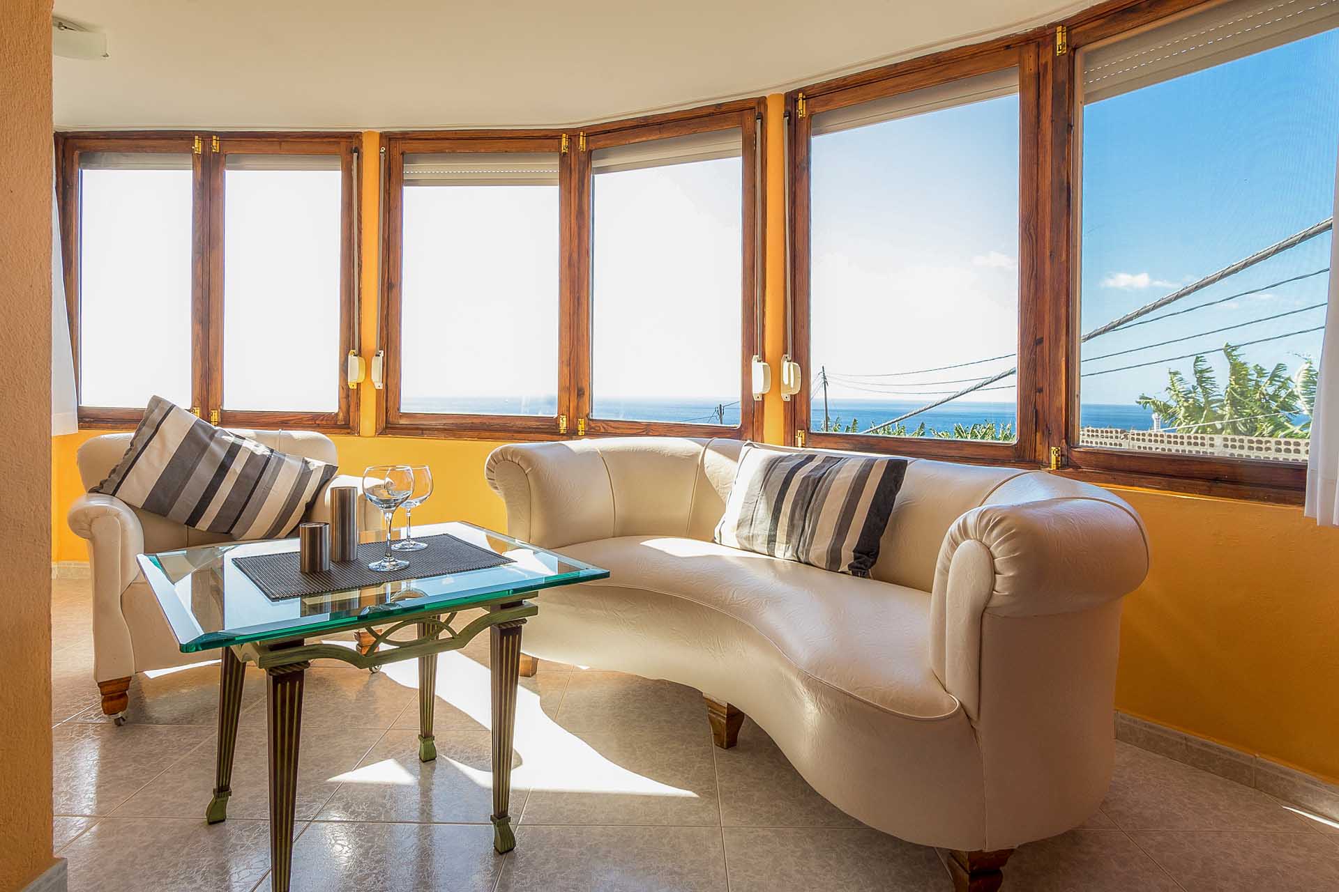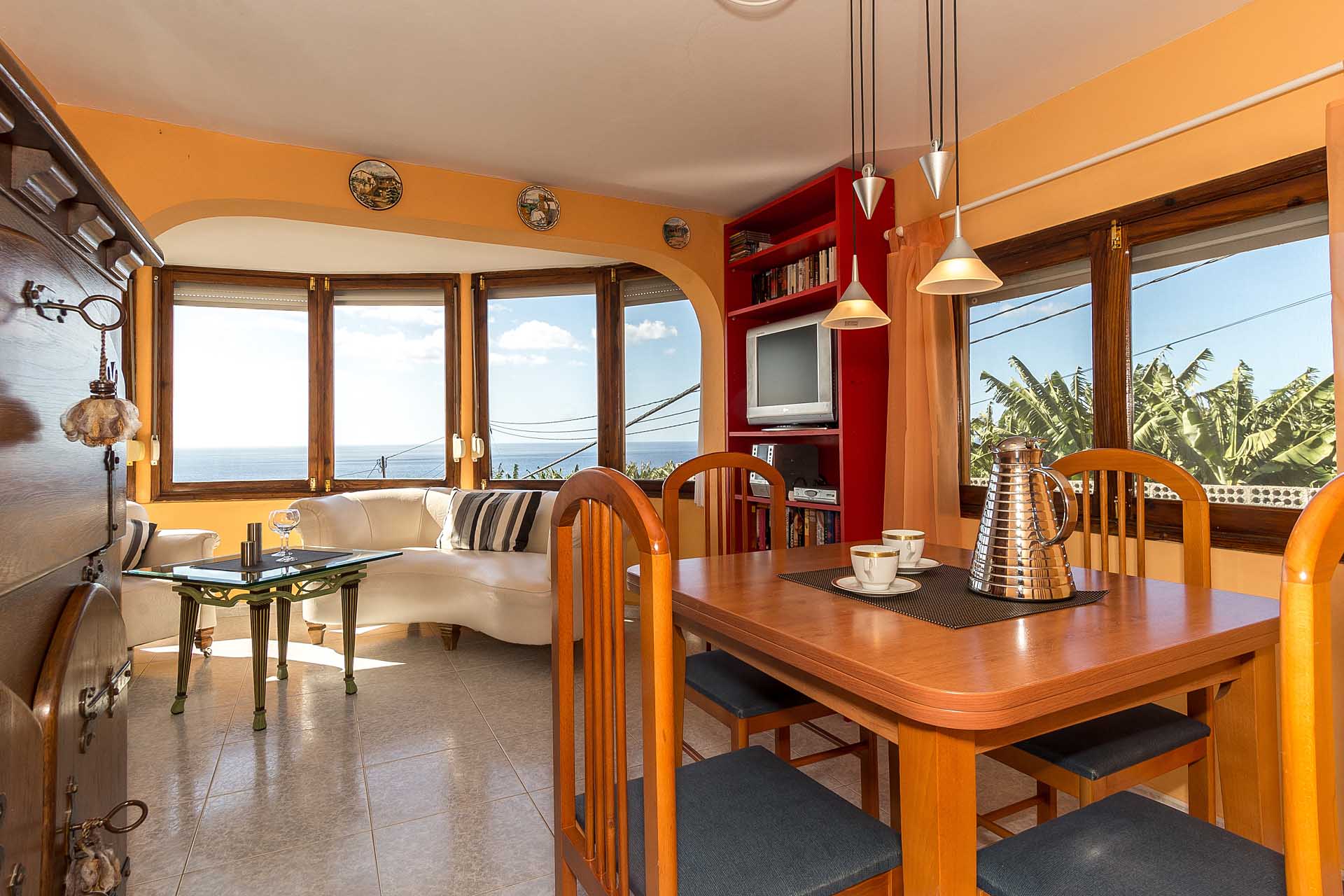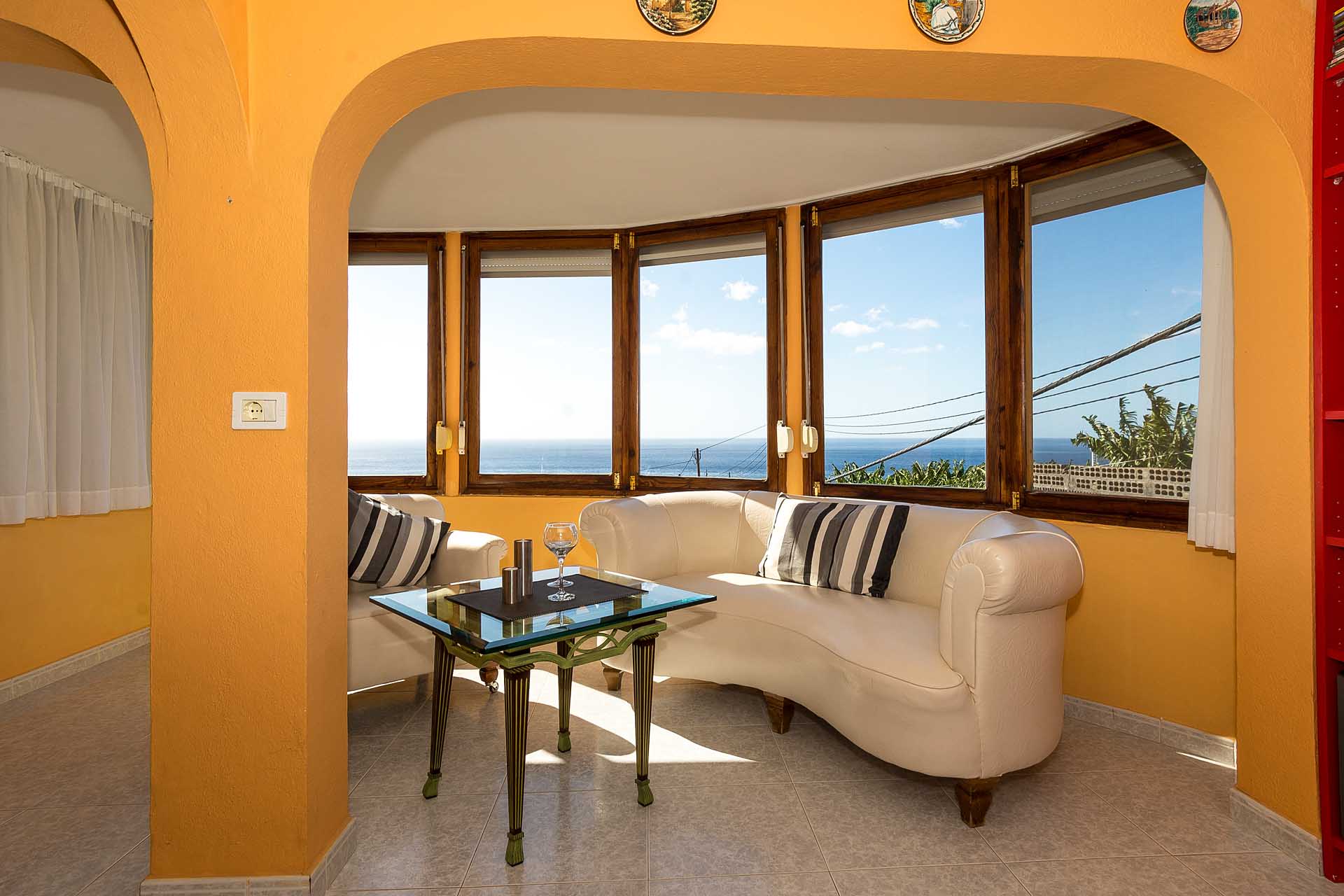 Sie ist im 1. OG aufgeteilt in ein Wohnzimmer mit Essplatz, eine Küche, zwei Schlafzimmer, ein Tageslichtbad und eine überdachte Terrasse sowie im 2. OG in einen Wintergarten (oder 2. Wohnzimmer) mit Zugang zur großen, teilweise überdachten Dachterrasse mit fantastischem Meerblick. Sie wurde bisher ausschließlich als Ferienwohnung genutzt, kann aber auch dauerhaft bewohnt werden.